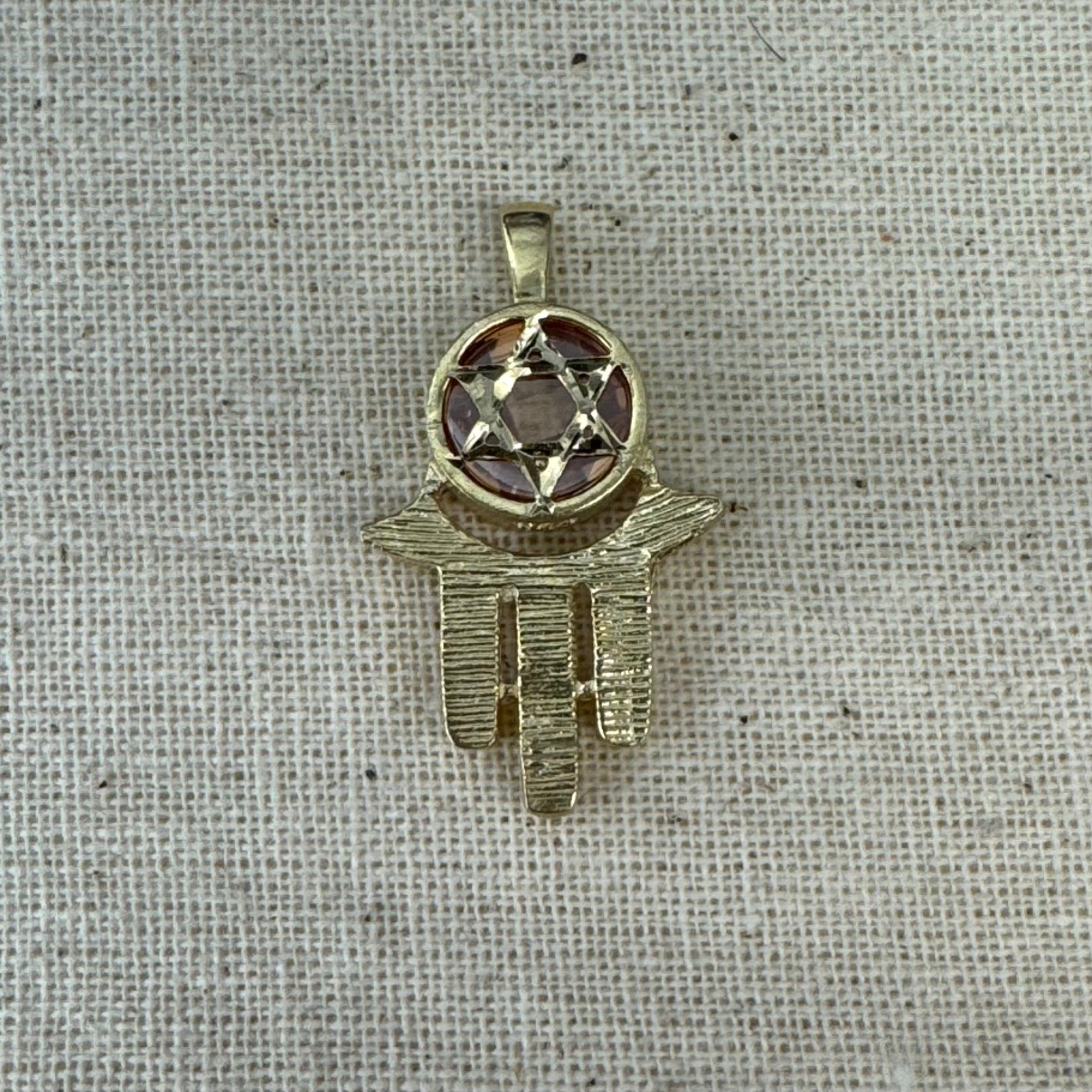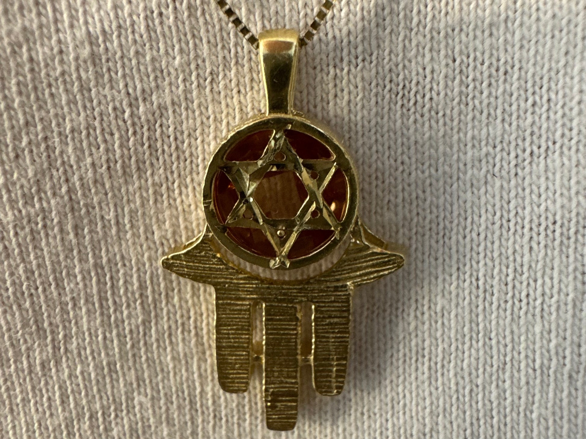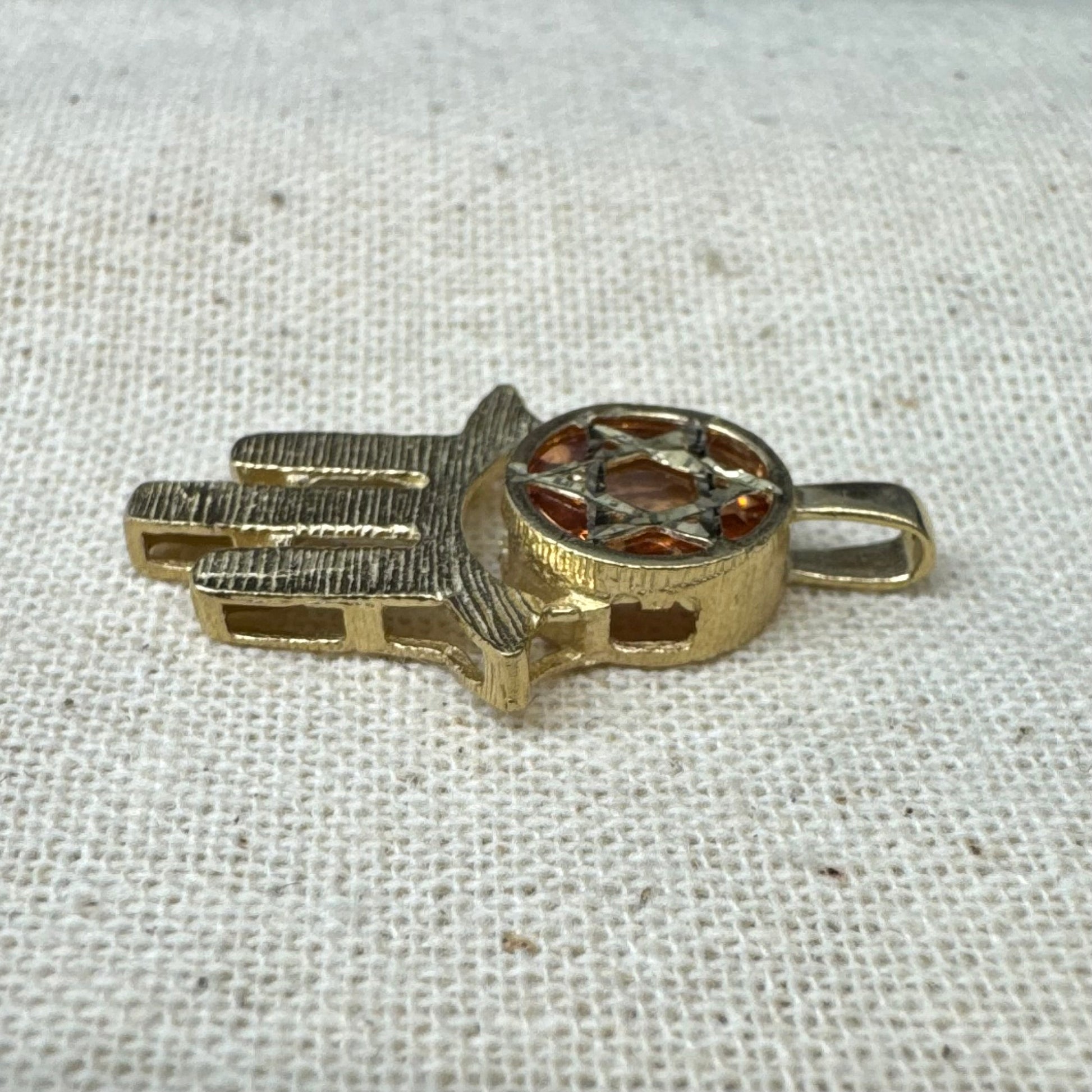 14K gold Hamsa pendant, featuring a deep orange gemstone framed by a Star of David.