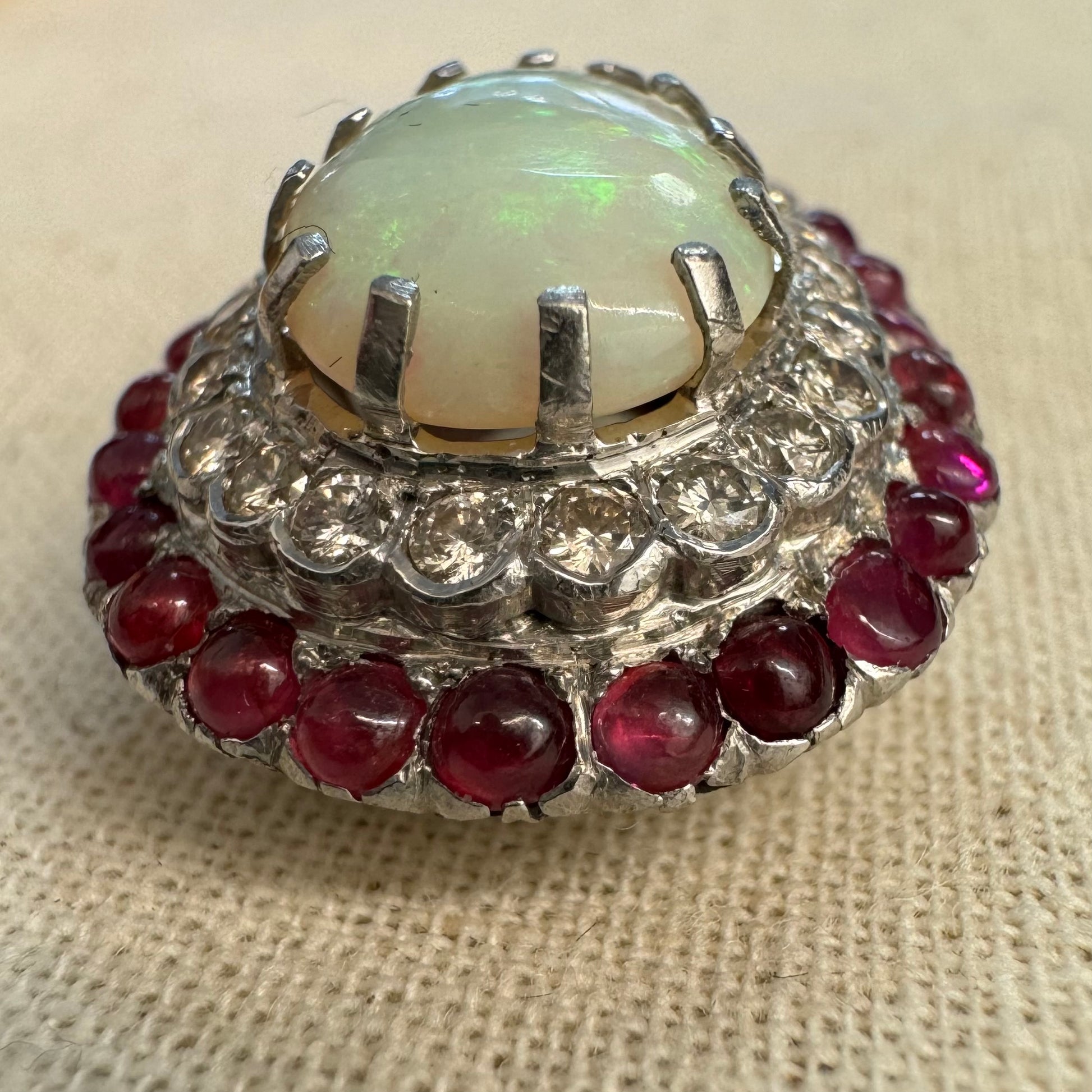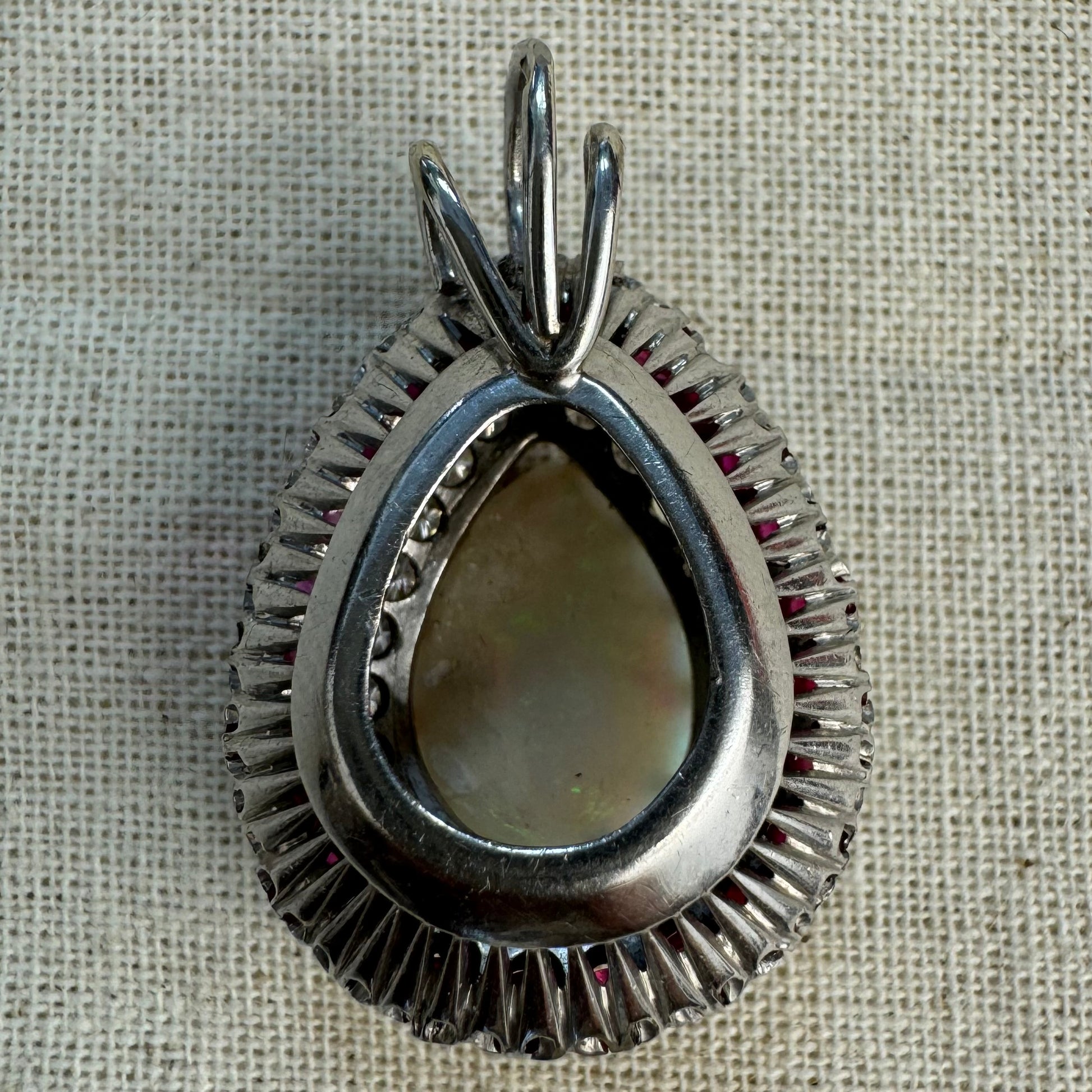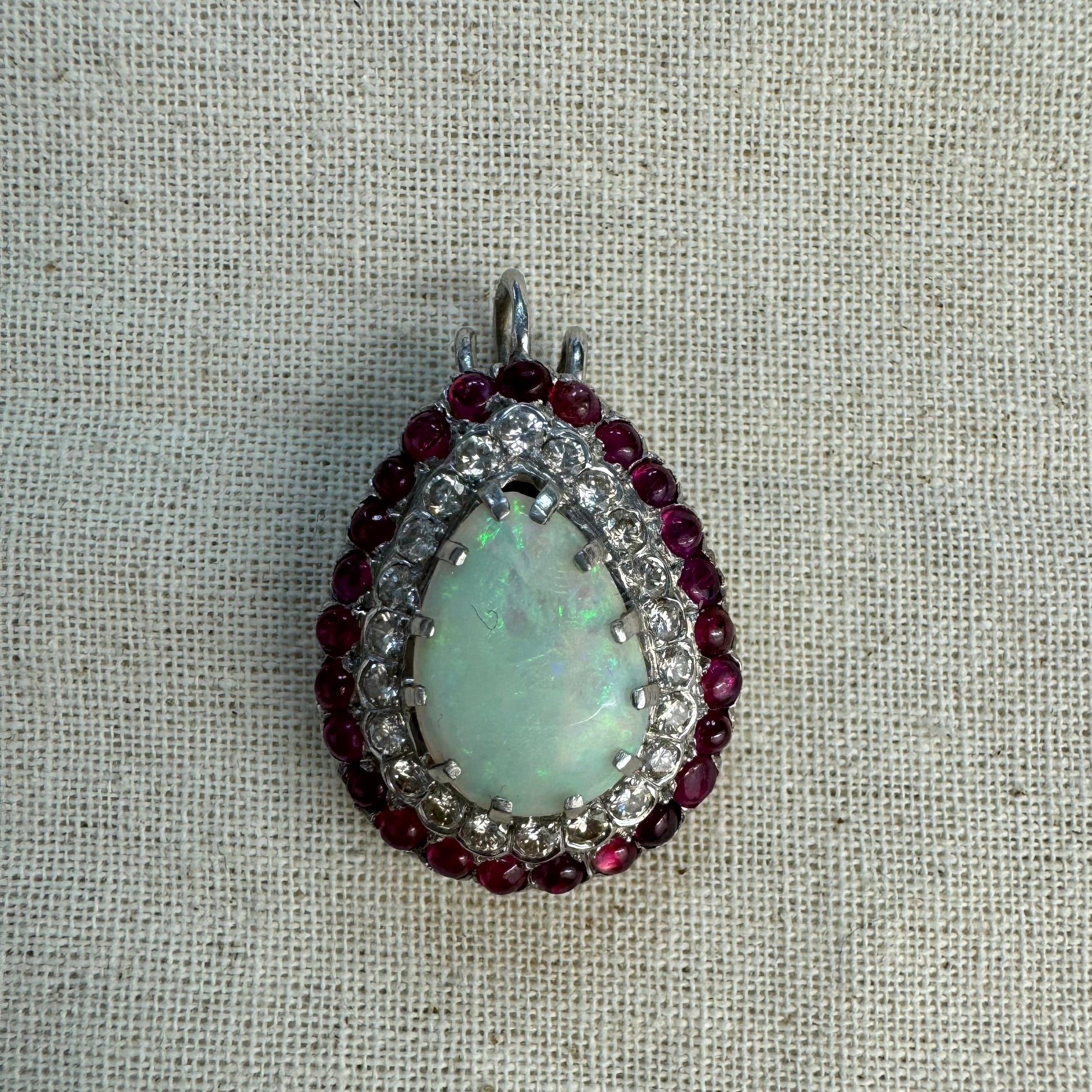 14K white gold pendant set with Opal, Diamonds & Ruby