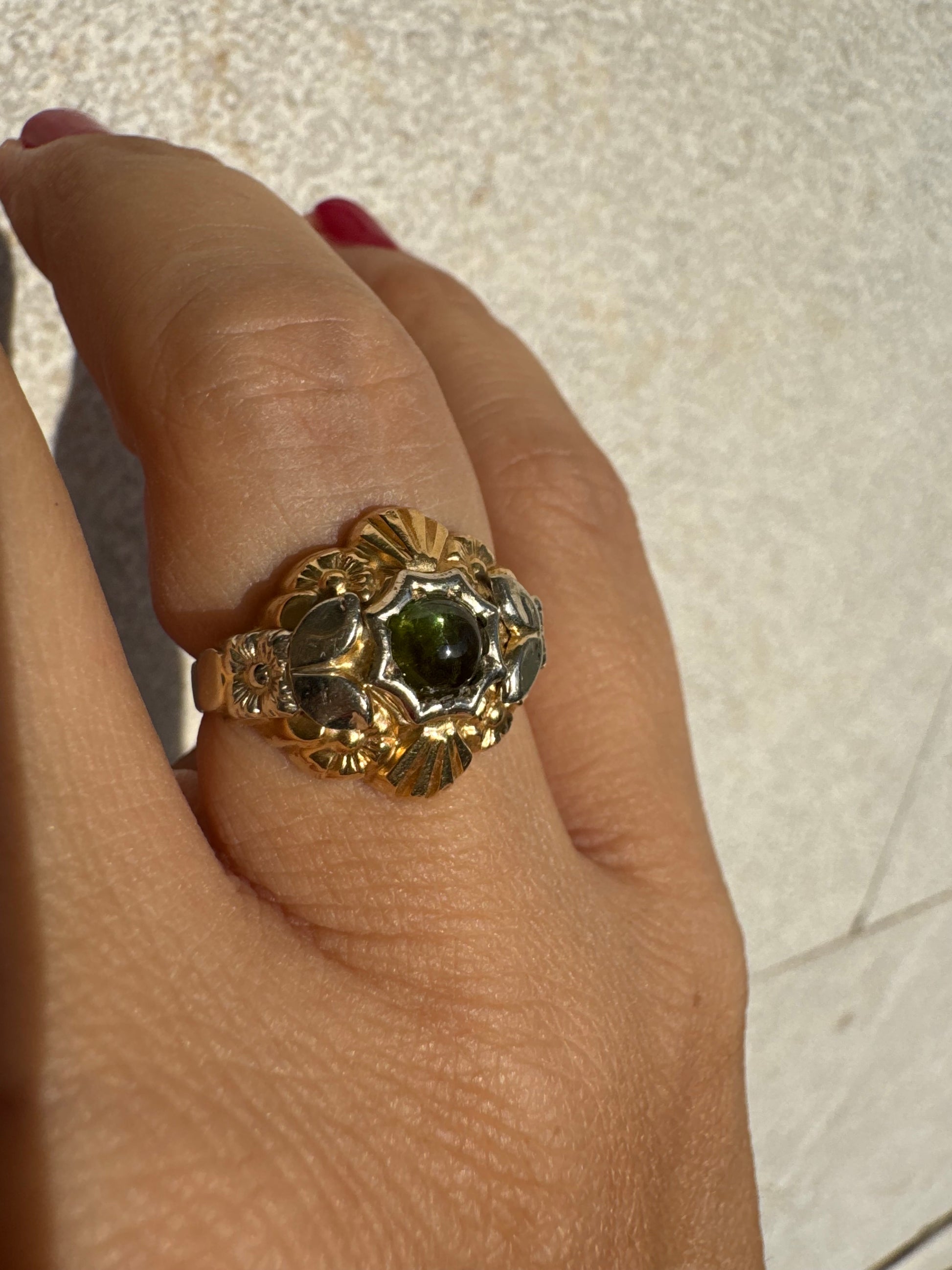 טבעת זהב בשני גוונים 18 קראט בעיצוב ייחודי, משובצת אבן טורמלין ירוק בגוון עמוק ועשיר.