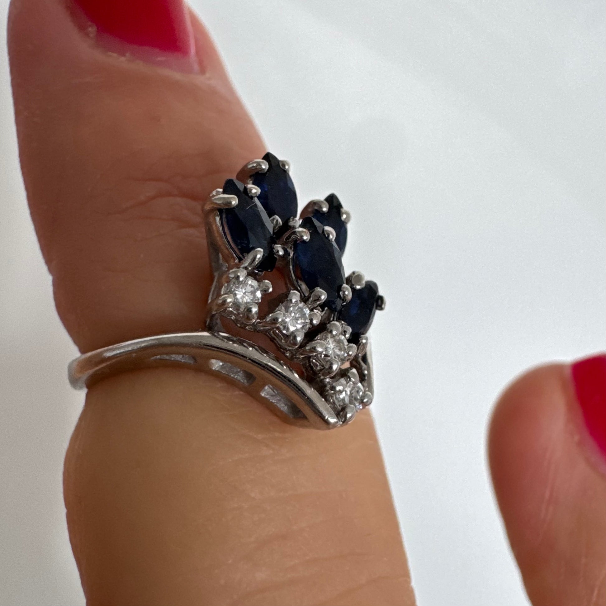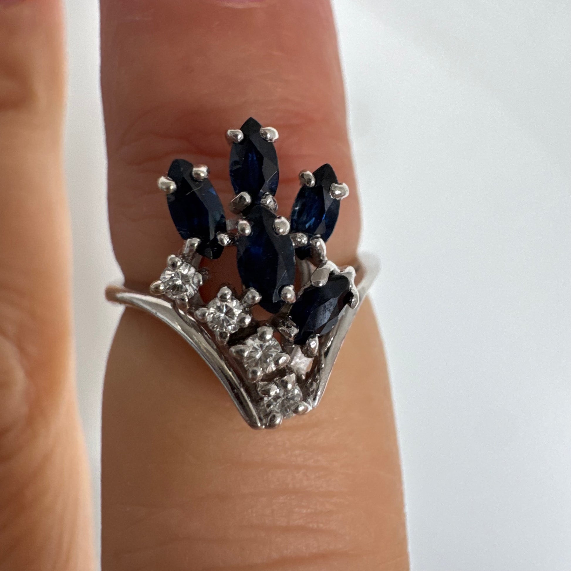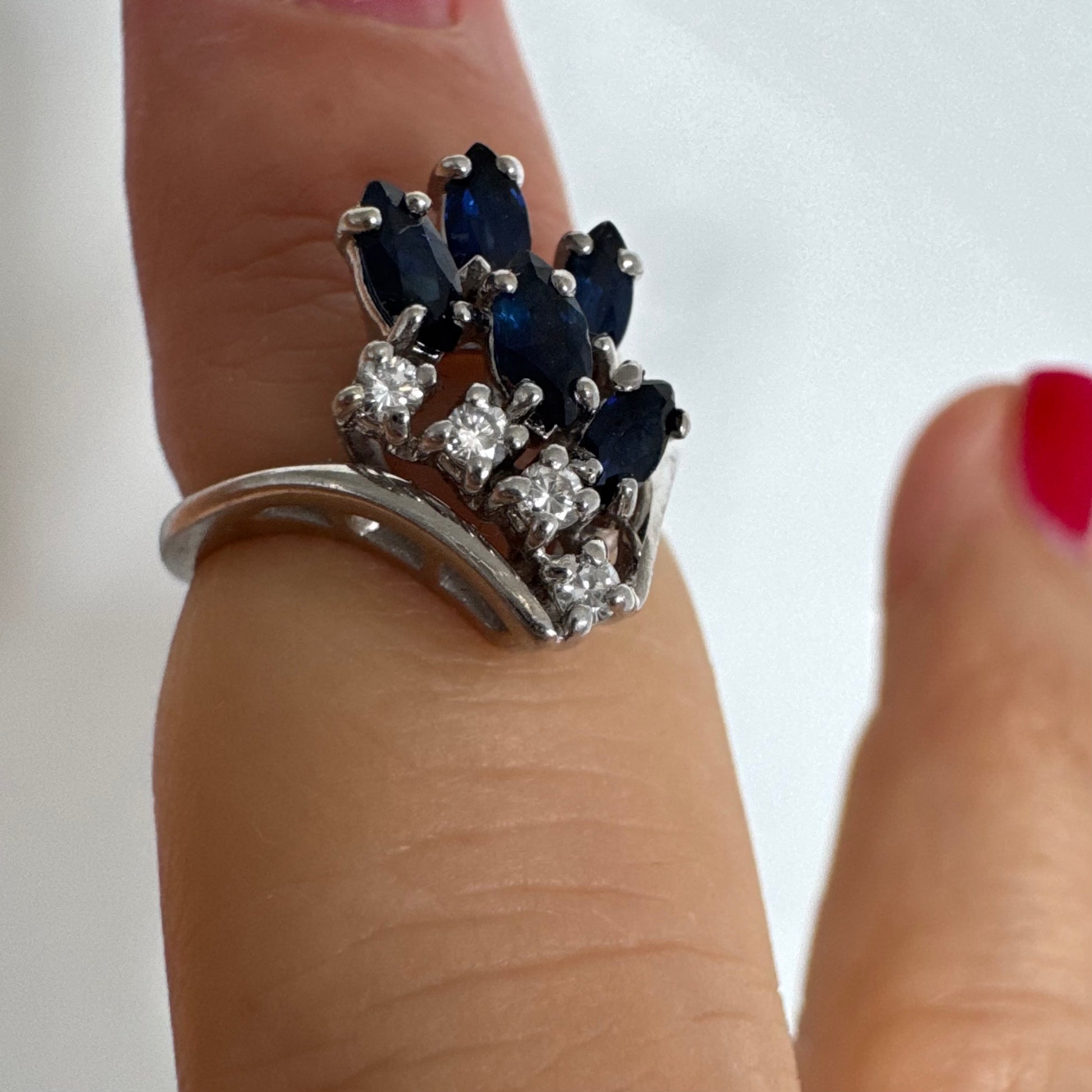 טבעת זהב לבן 14 קראט משובצת אבני ספיר כחולות בחיתוך מרקיזה ויהלומים, היוצרים מראה אלגנטי ודינמי.