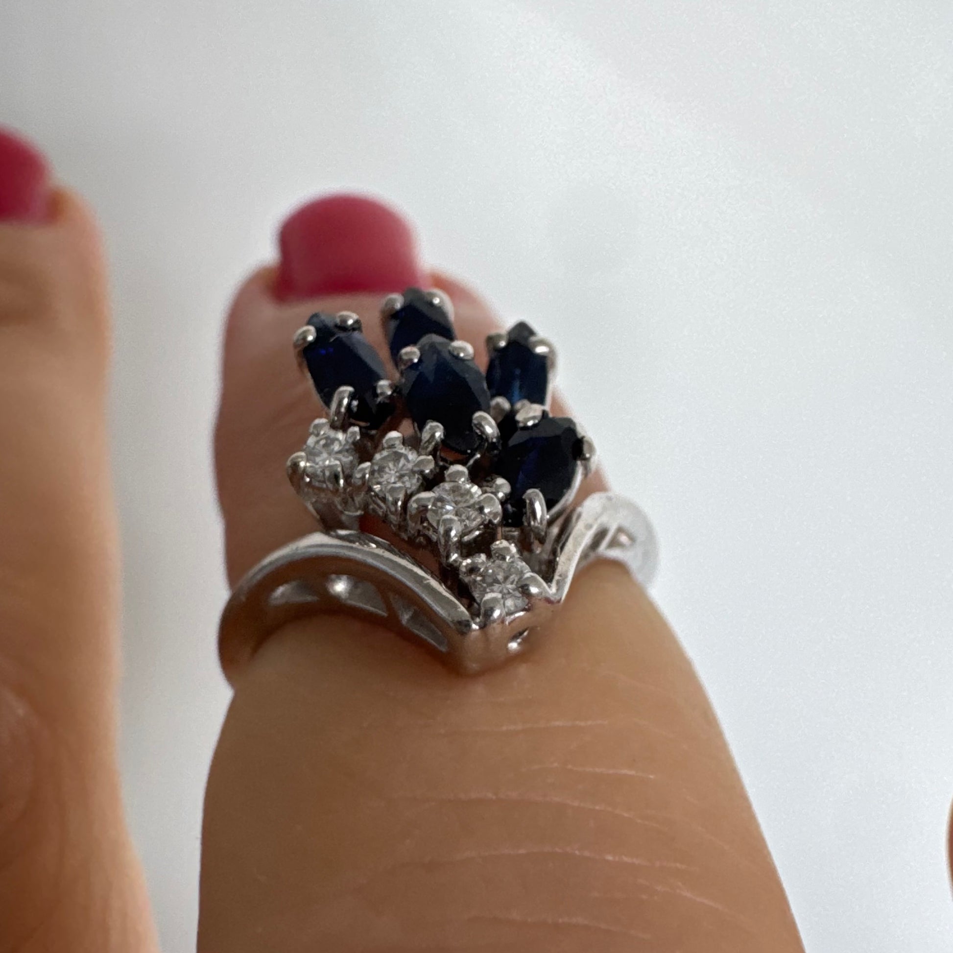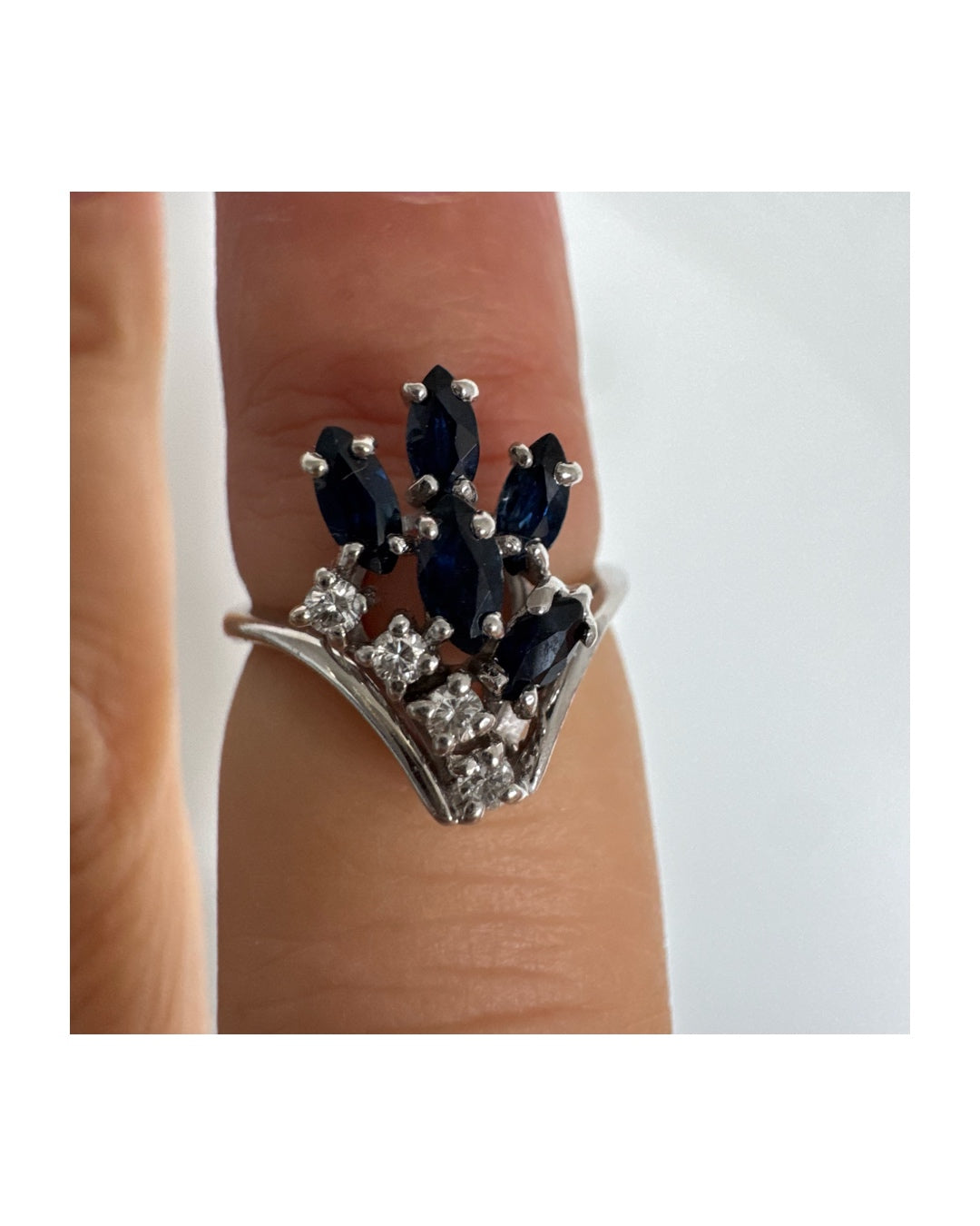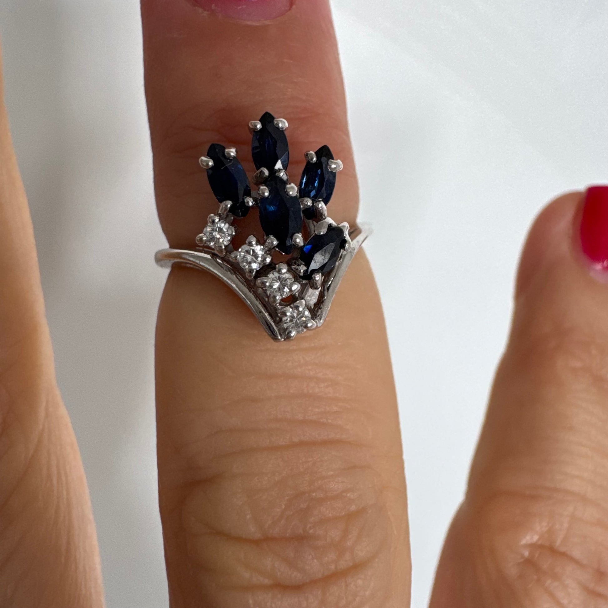 טבעת זהב לבן 14 קראט משובצת אבני ספיר כחולות בחיתוך מרקיזה ויהלומים, היוצרים מראה אלגנטי ודינמי.