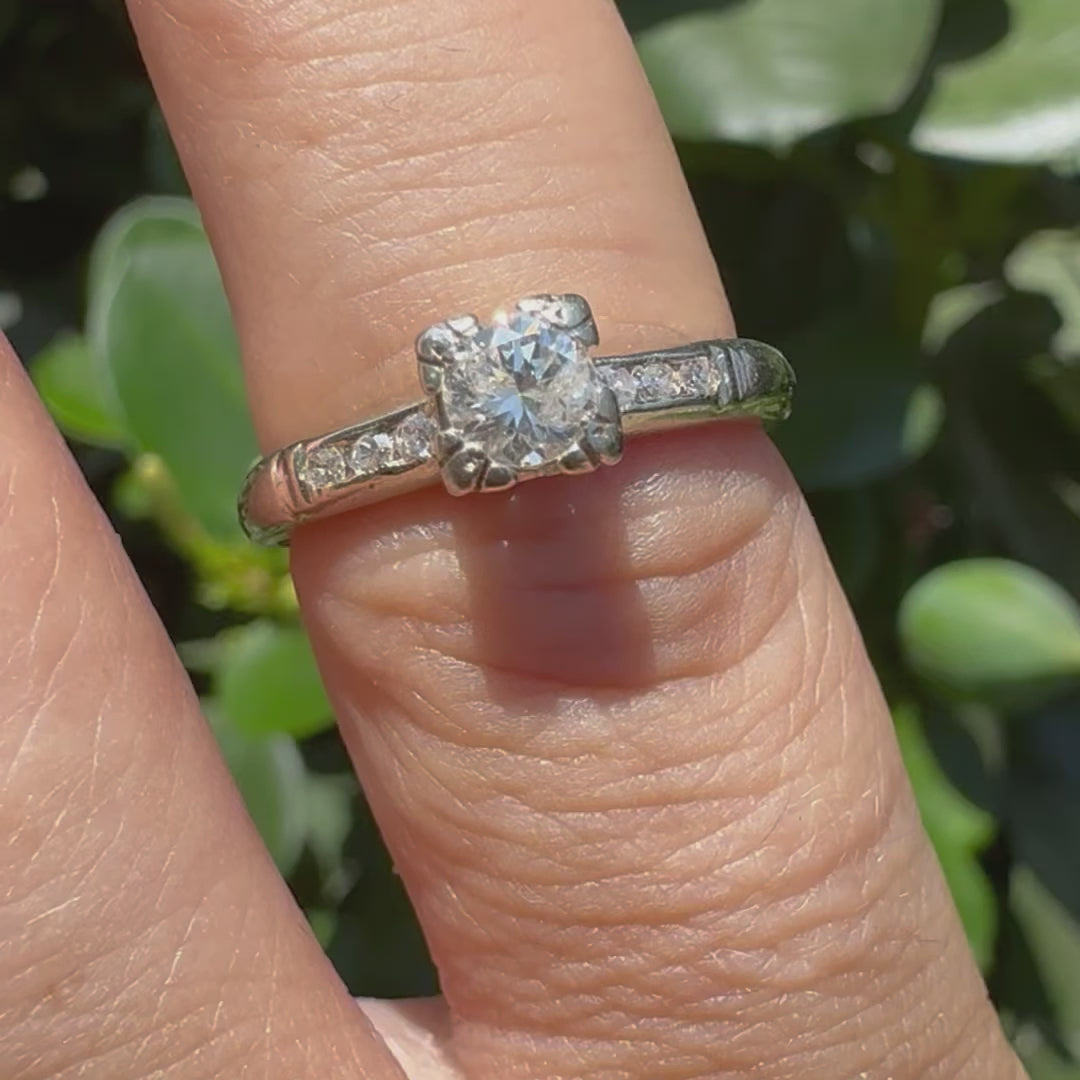 טבעת זהב לבן 14 קראט משובצת יהלום מרכזי ויהלומים בצדדים