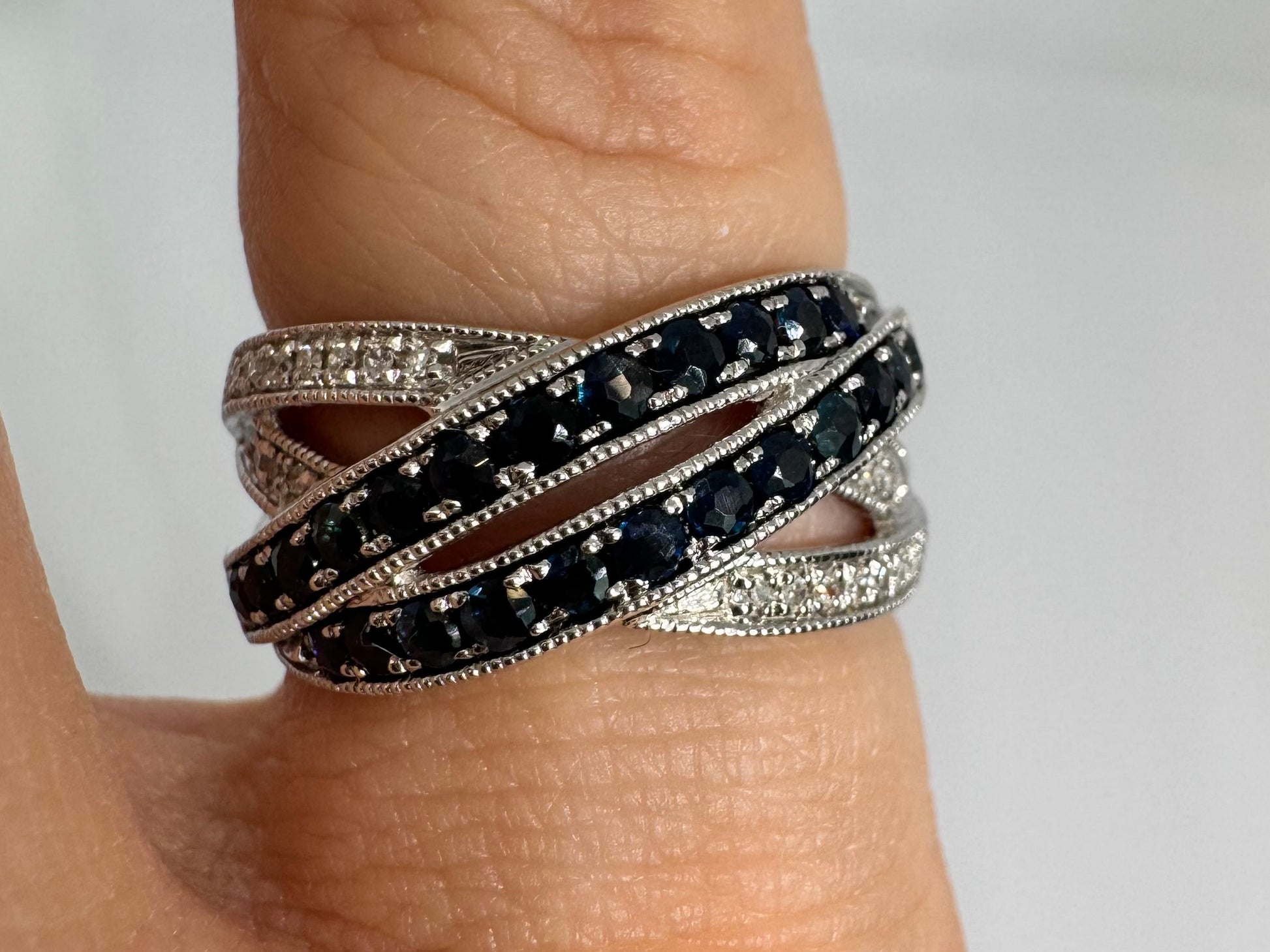 טבעת זהב לבן 14 קראט, קרוס, בעיצוב אלגנטי, משובצת בשורות של ספירים כחולים עמוקים ויהלומים מנצנצים.