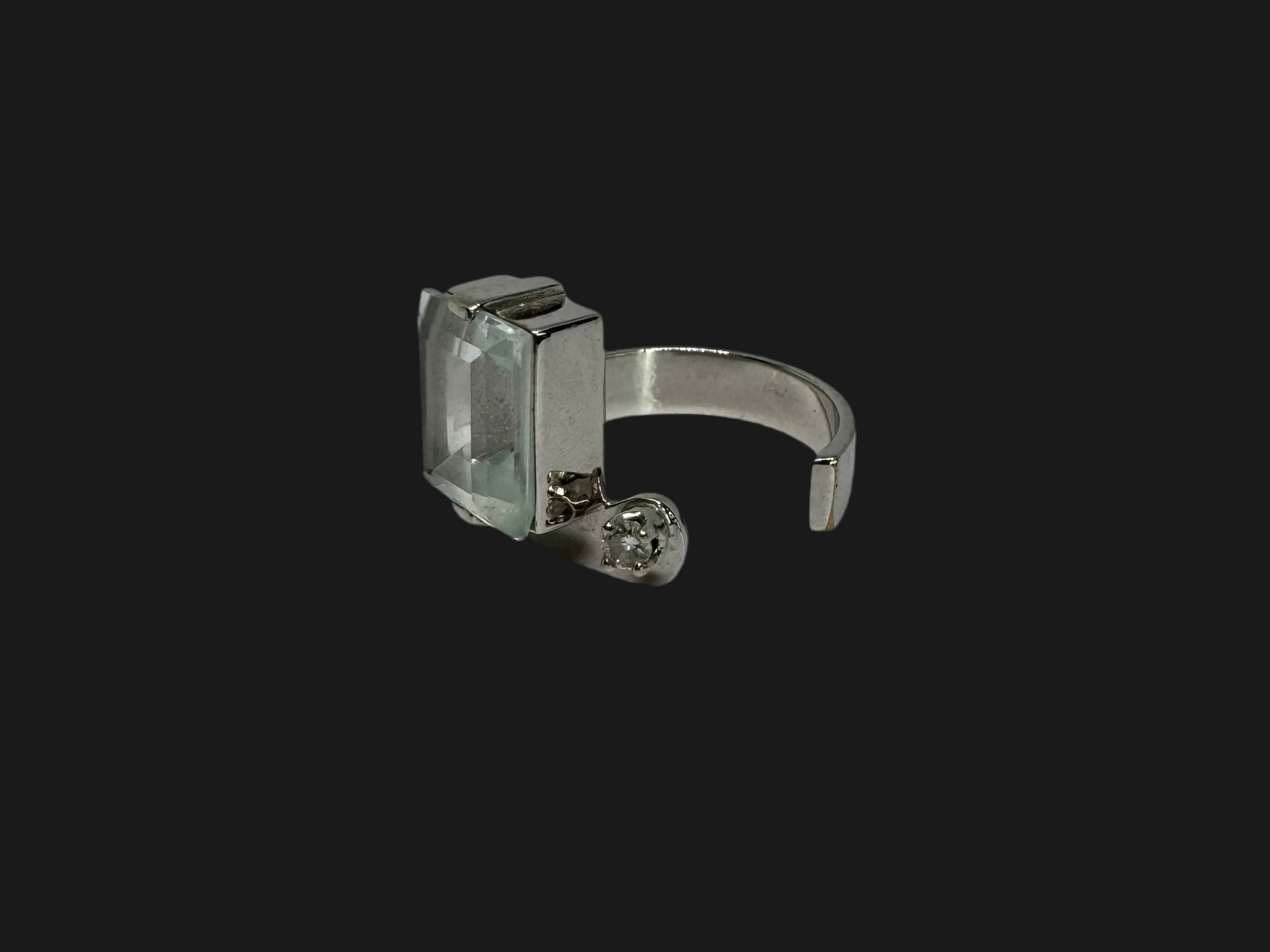 טבעת זהב לבן 18 קראט משובצת אבן אקוומרין גדולה בליטוש מלבני (חיתוך אמרלד), לצד יהלום קטן ועגול שמוסיף ניצוץ מדויק.