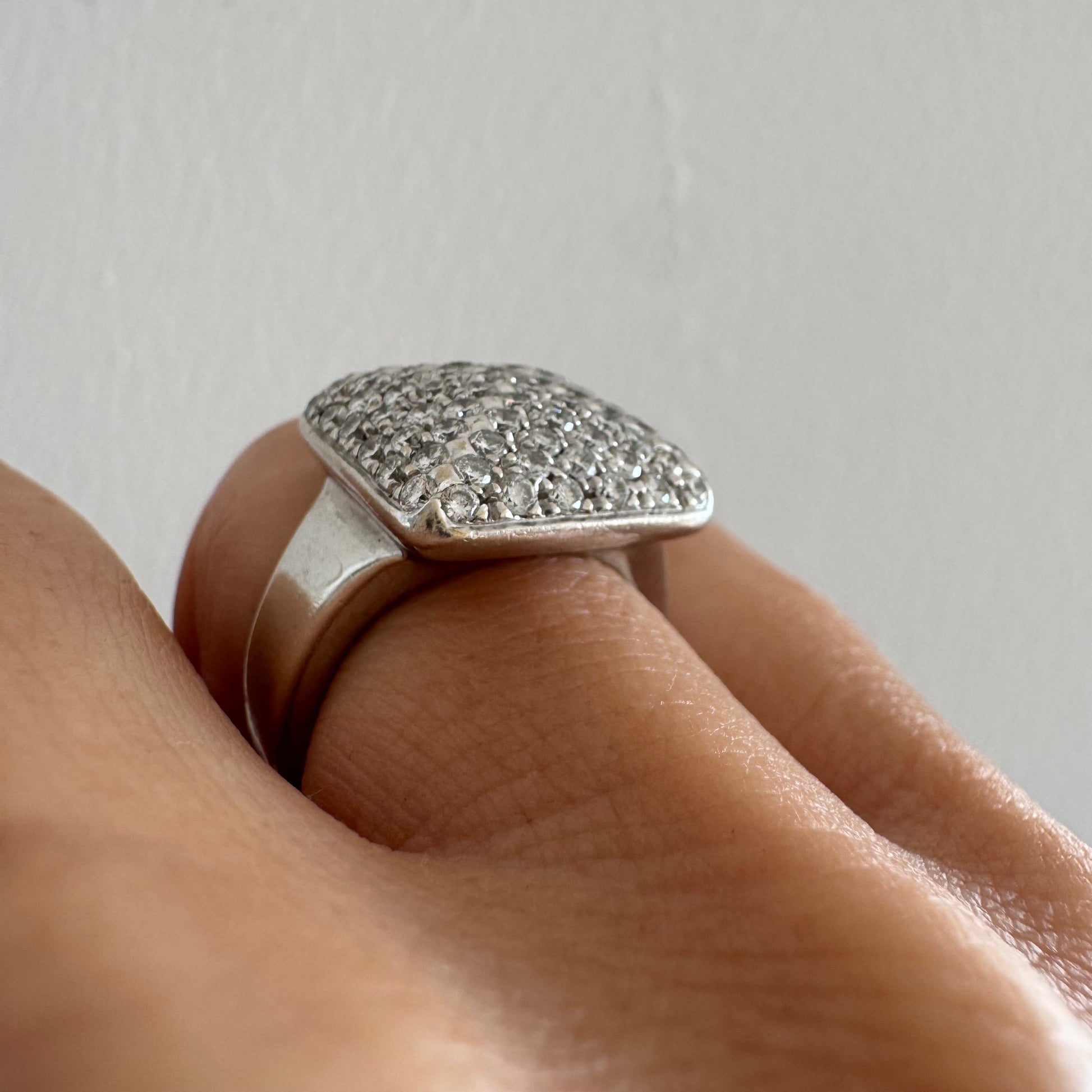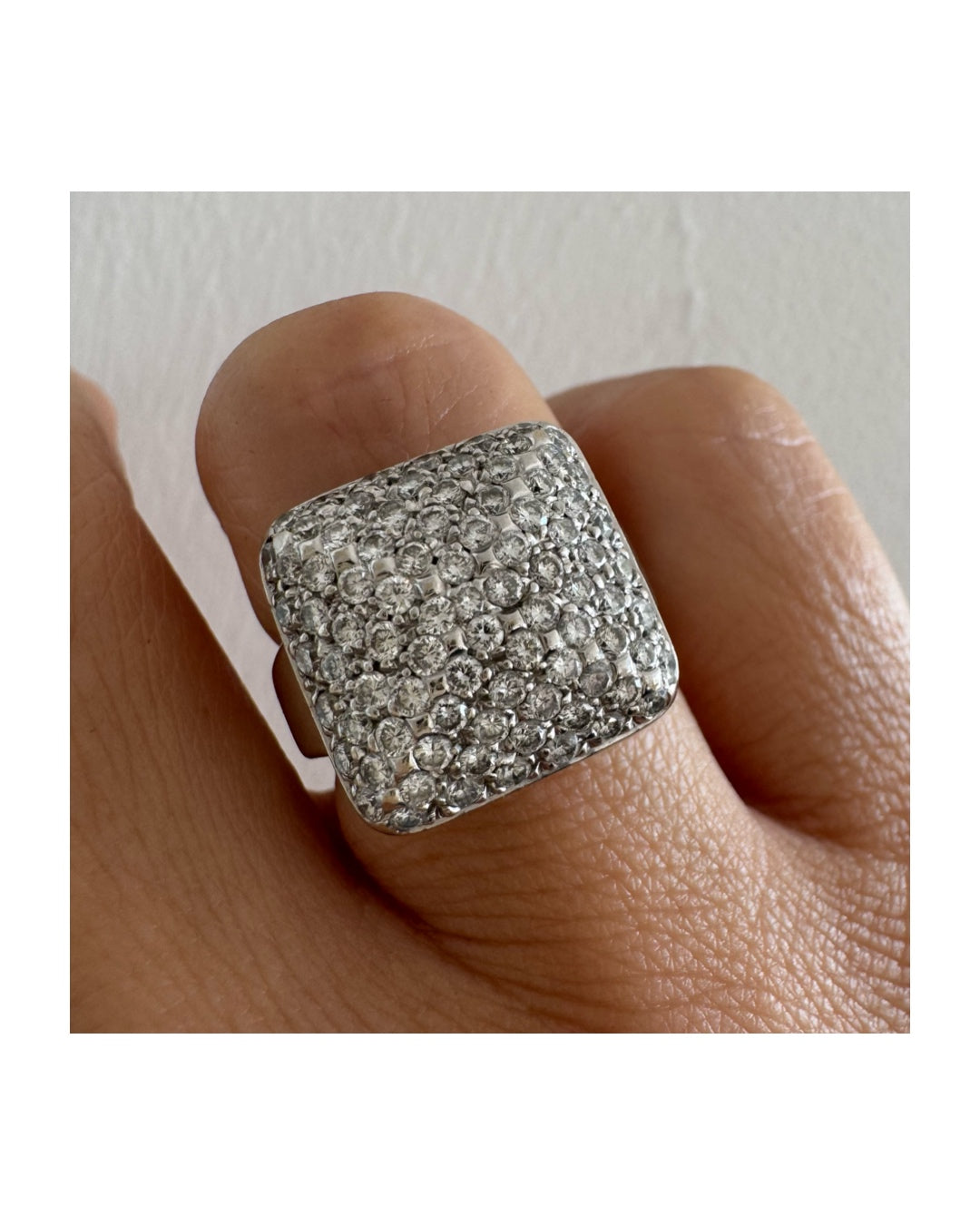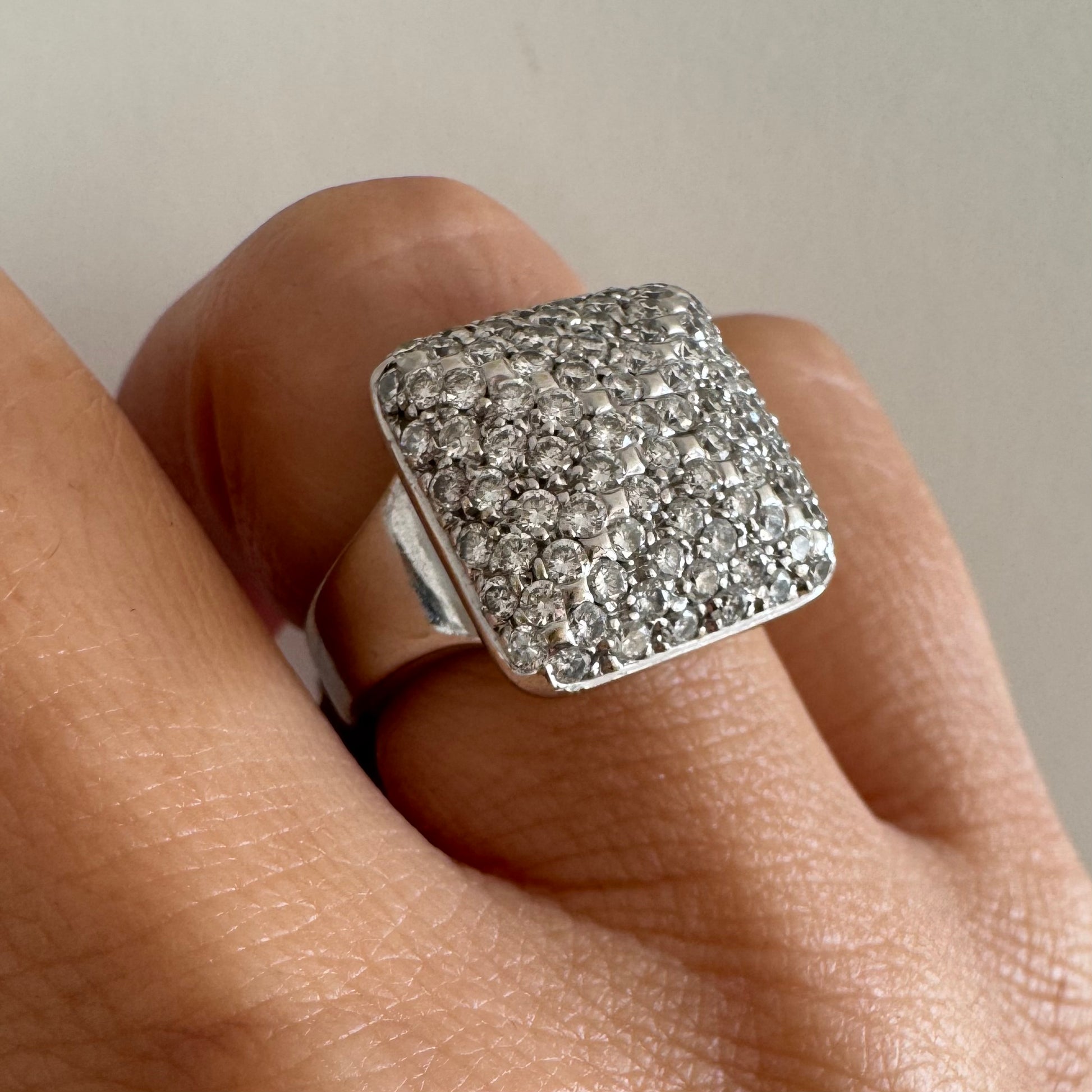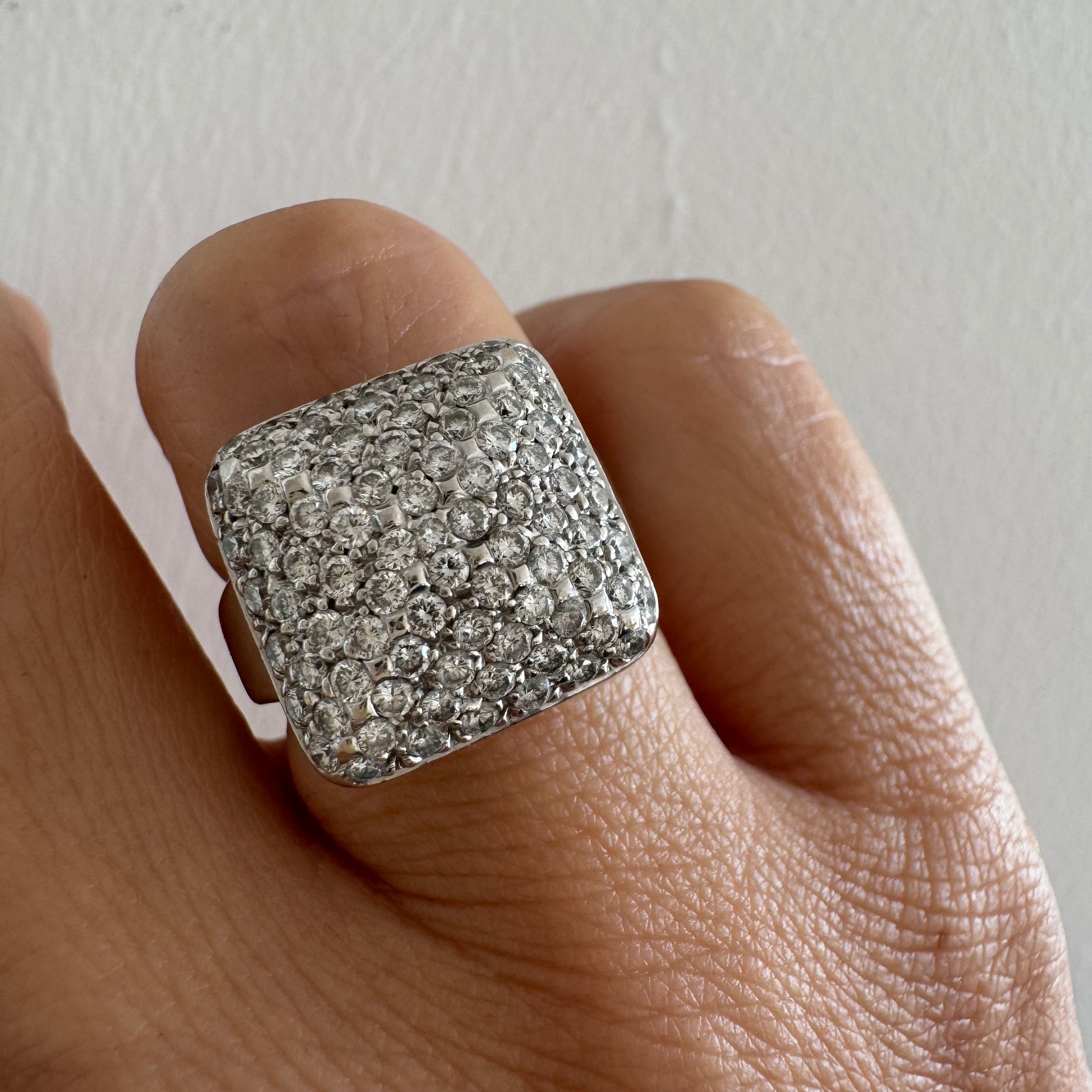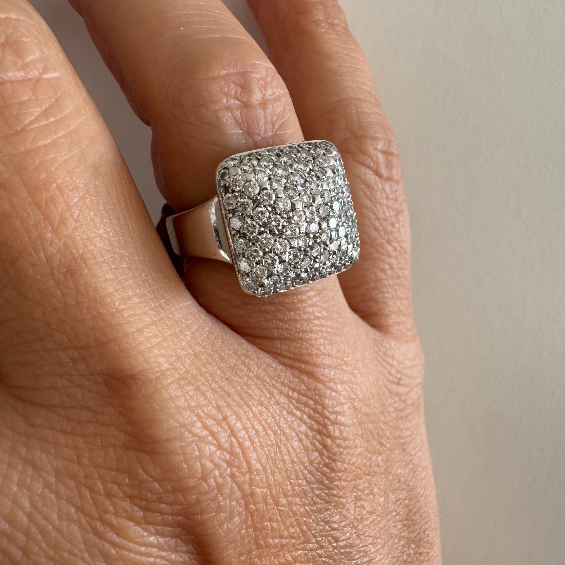 טבעת זהב לבן 18 קראט עם חלק עליון רחב בצורת ריבוע המשובץ כולו ביהלומים מנצנצים, ליצירת מראה יוקרתי ונוצץ.