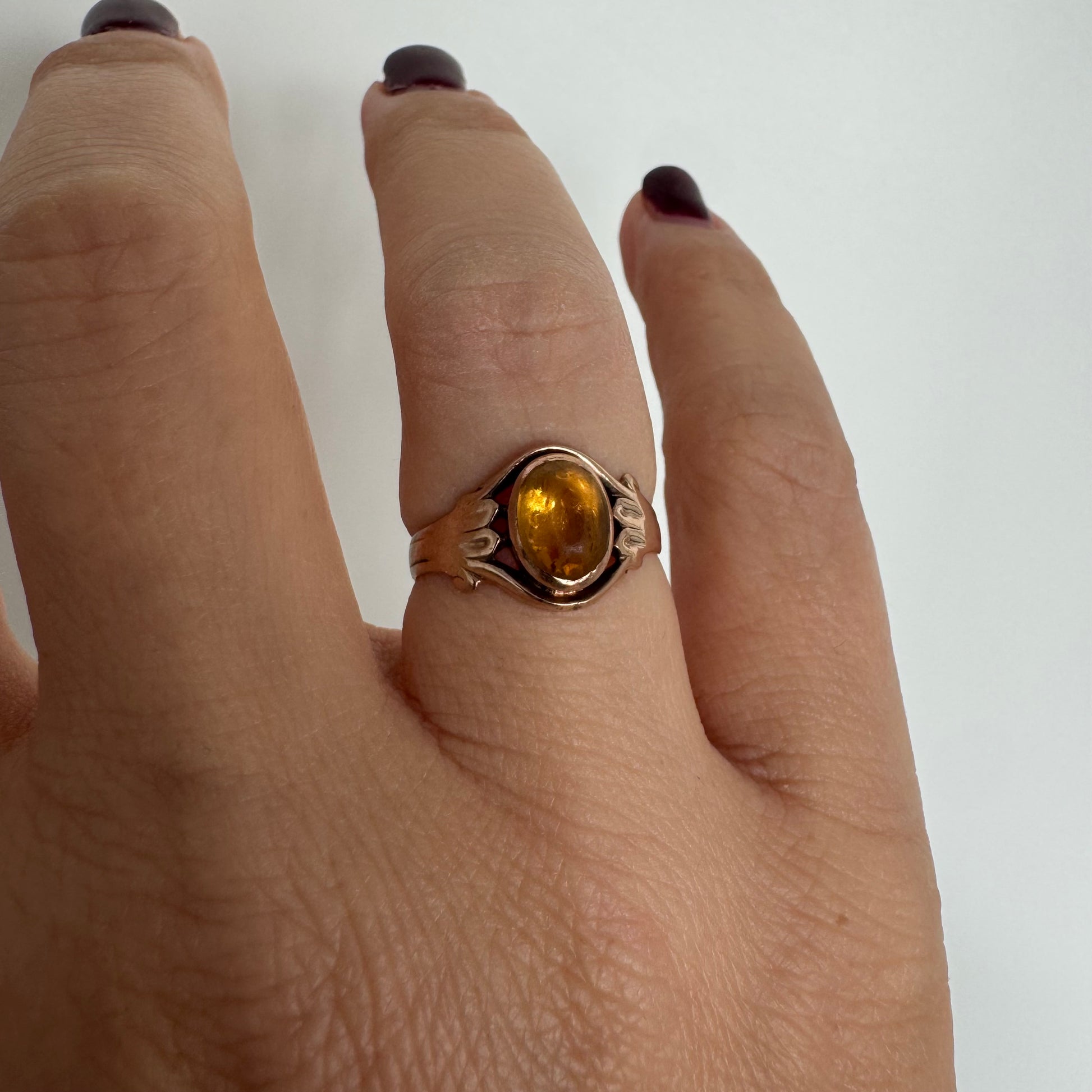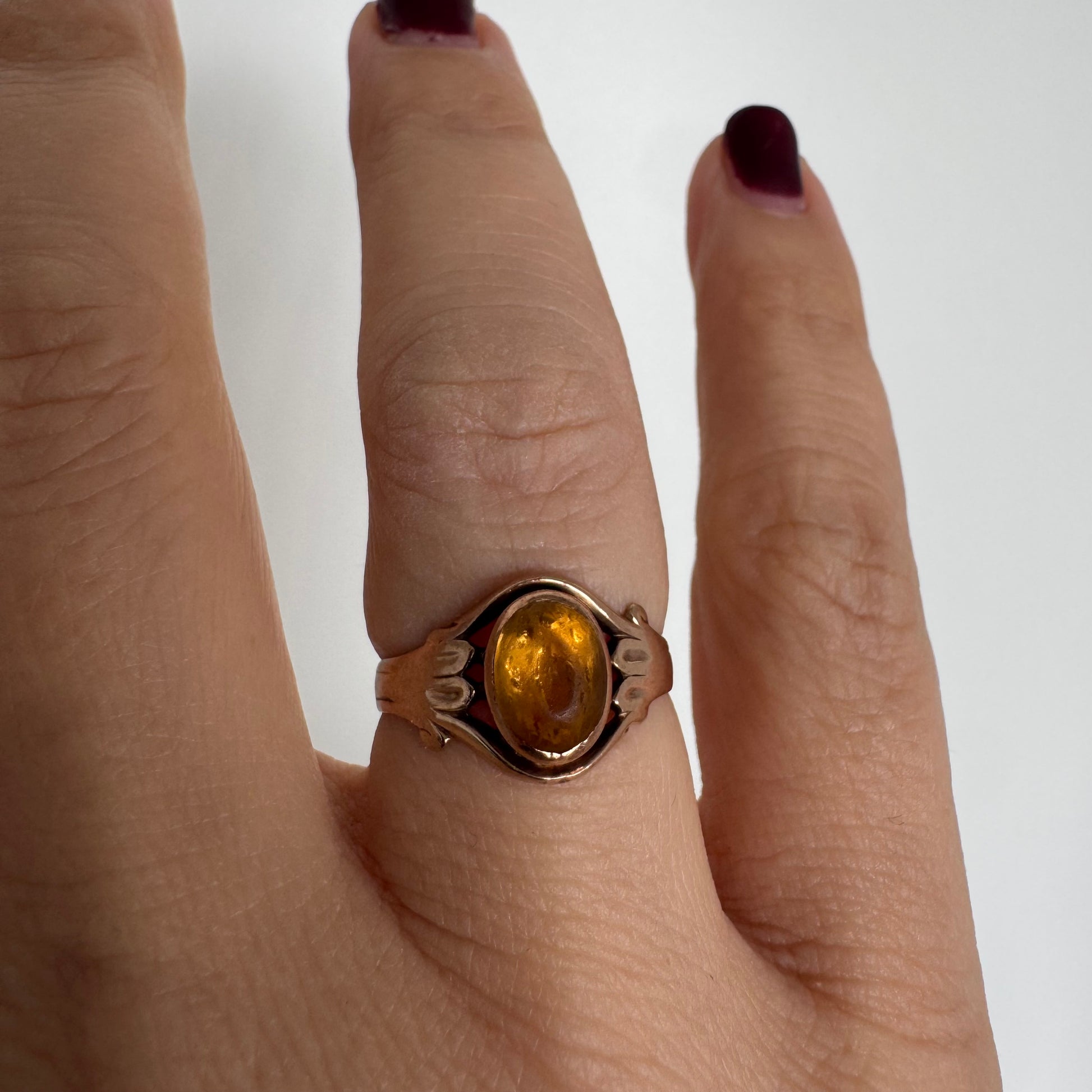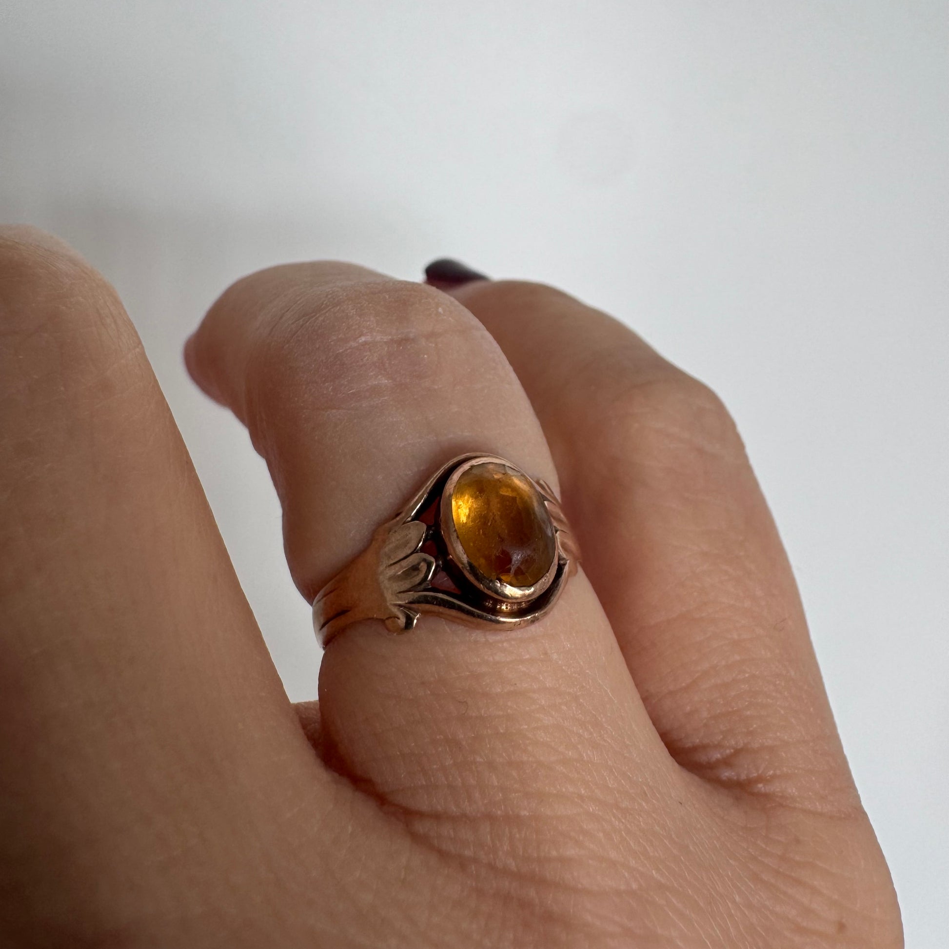 טבעת זהב צהוב 10 קראט משובצת אבן סיטרין בחיתוך קבושון אובלית בגוון דבש עמוק, עם שקיפות טבעית וברק חמים