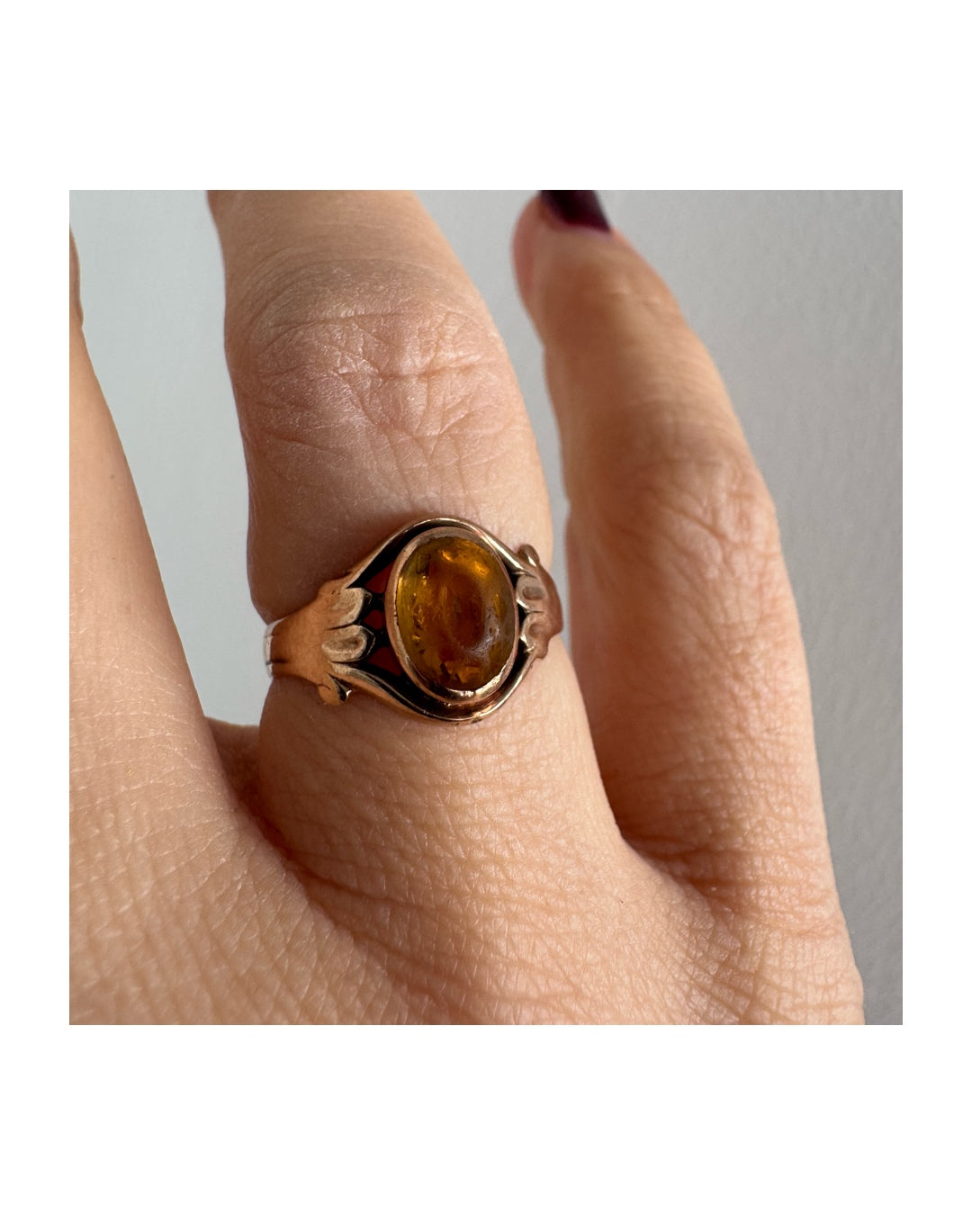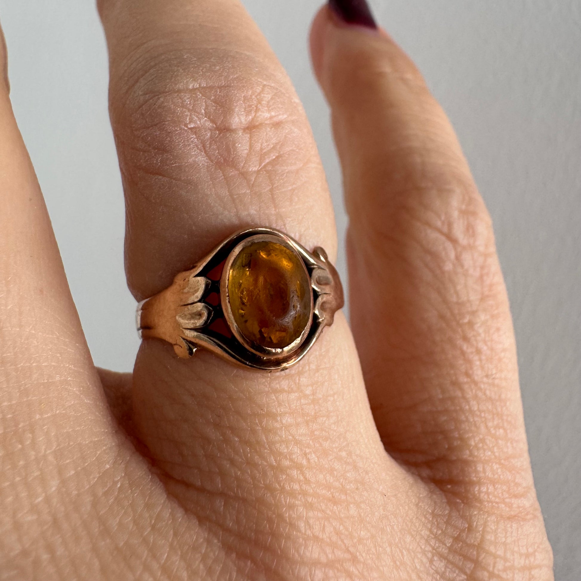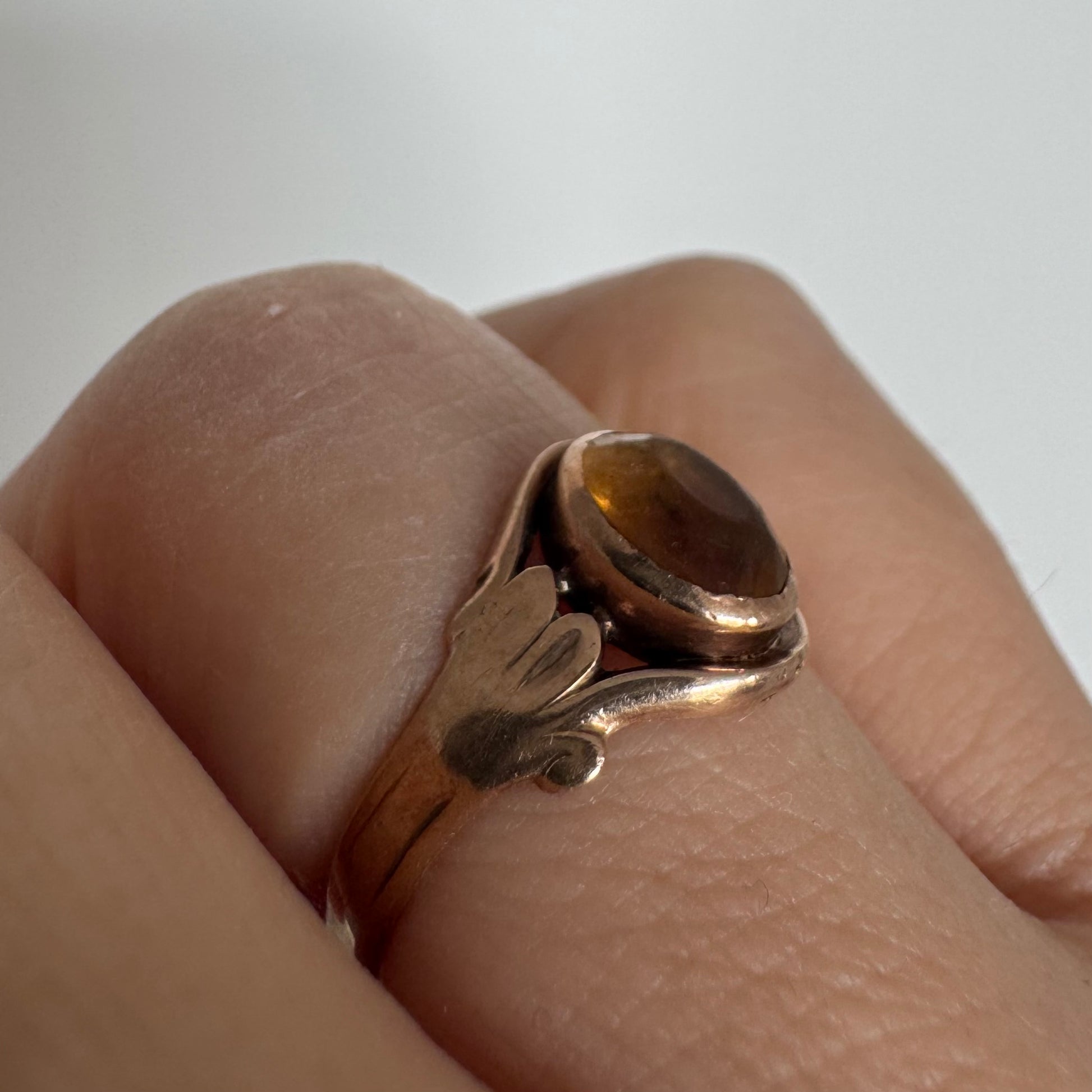 טבעת זהב צהוב 10 קראט משובצת אבן סיטרין בחיתוך קבושון אובלית בגוון דבש עמוק, עם שקיפות טבעית וברק חמים