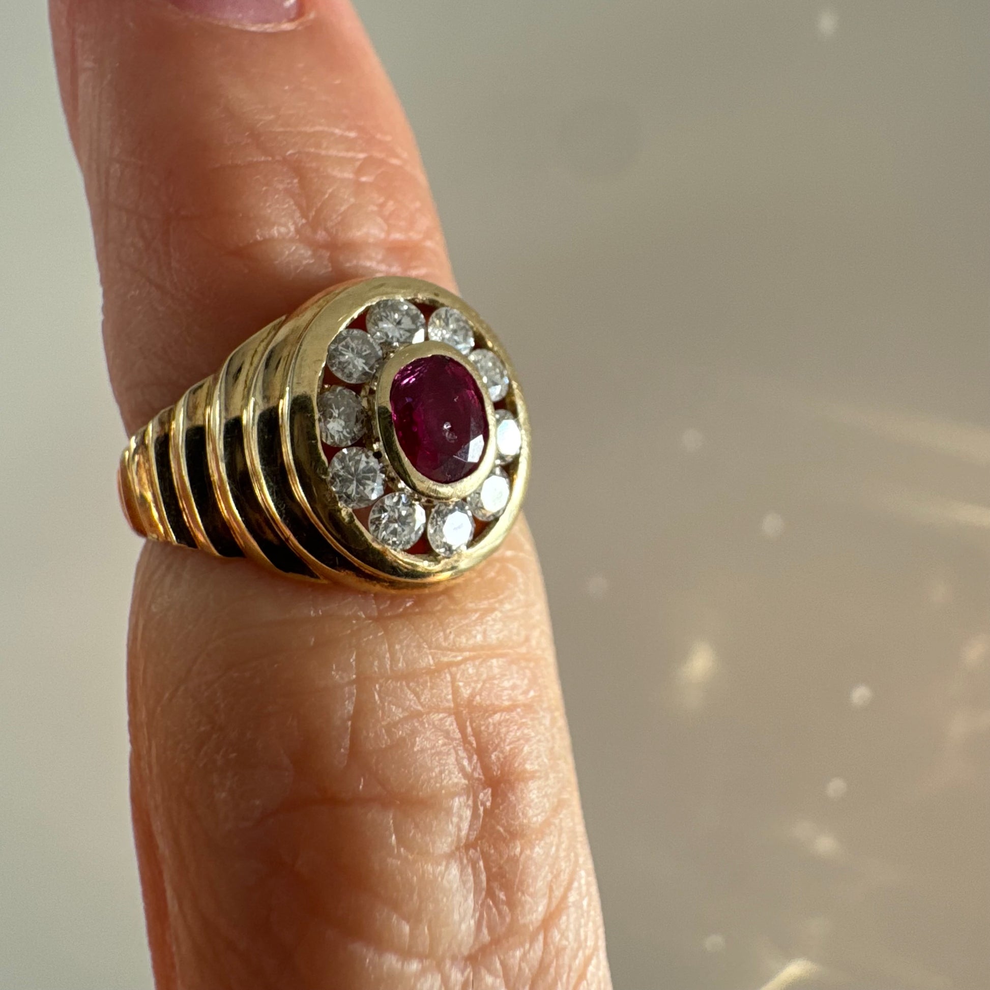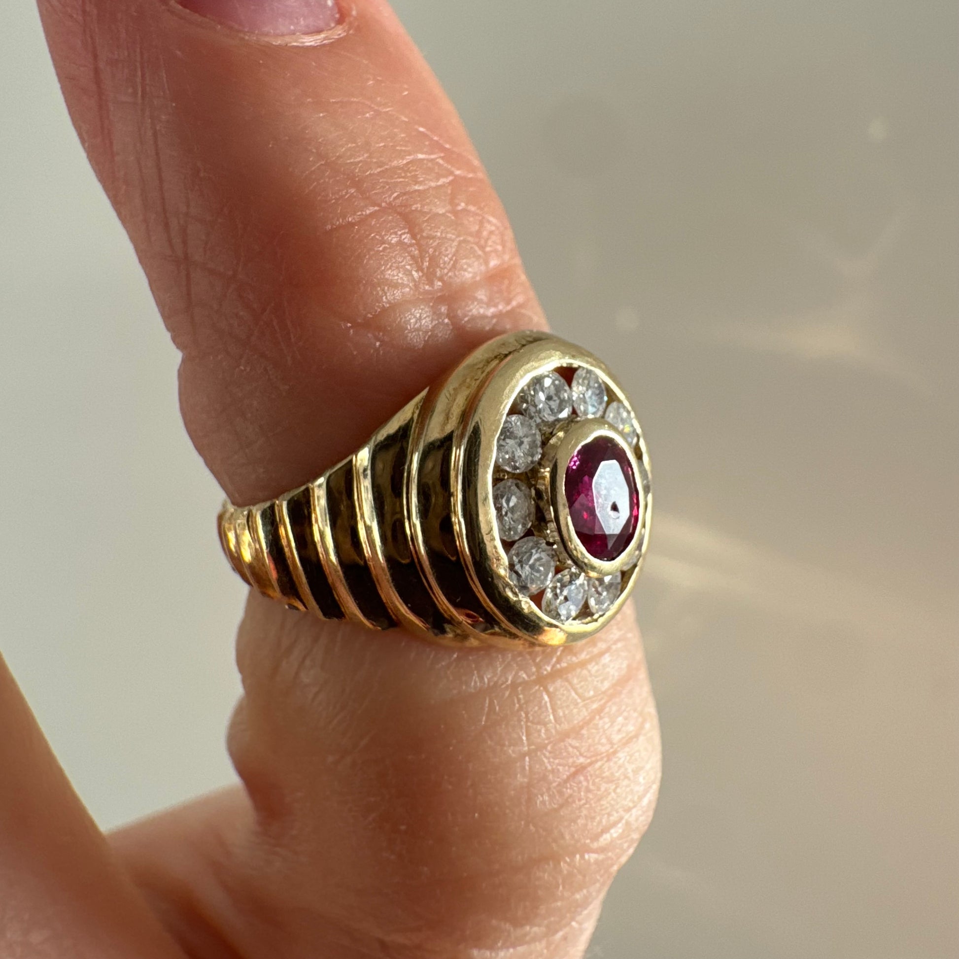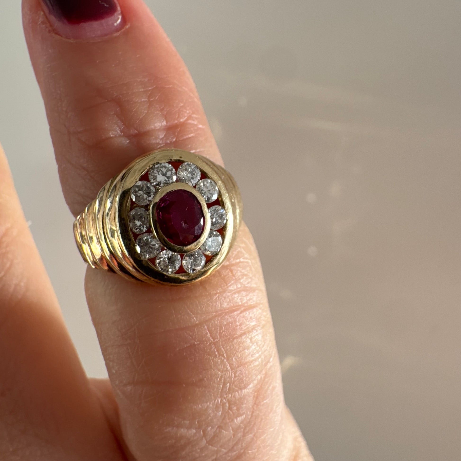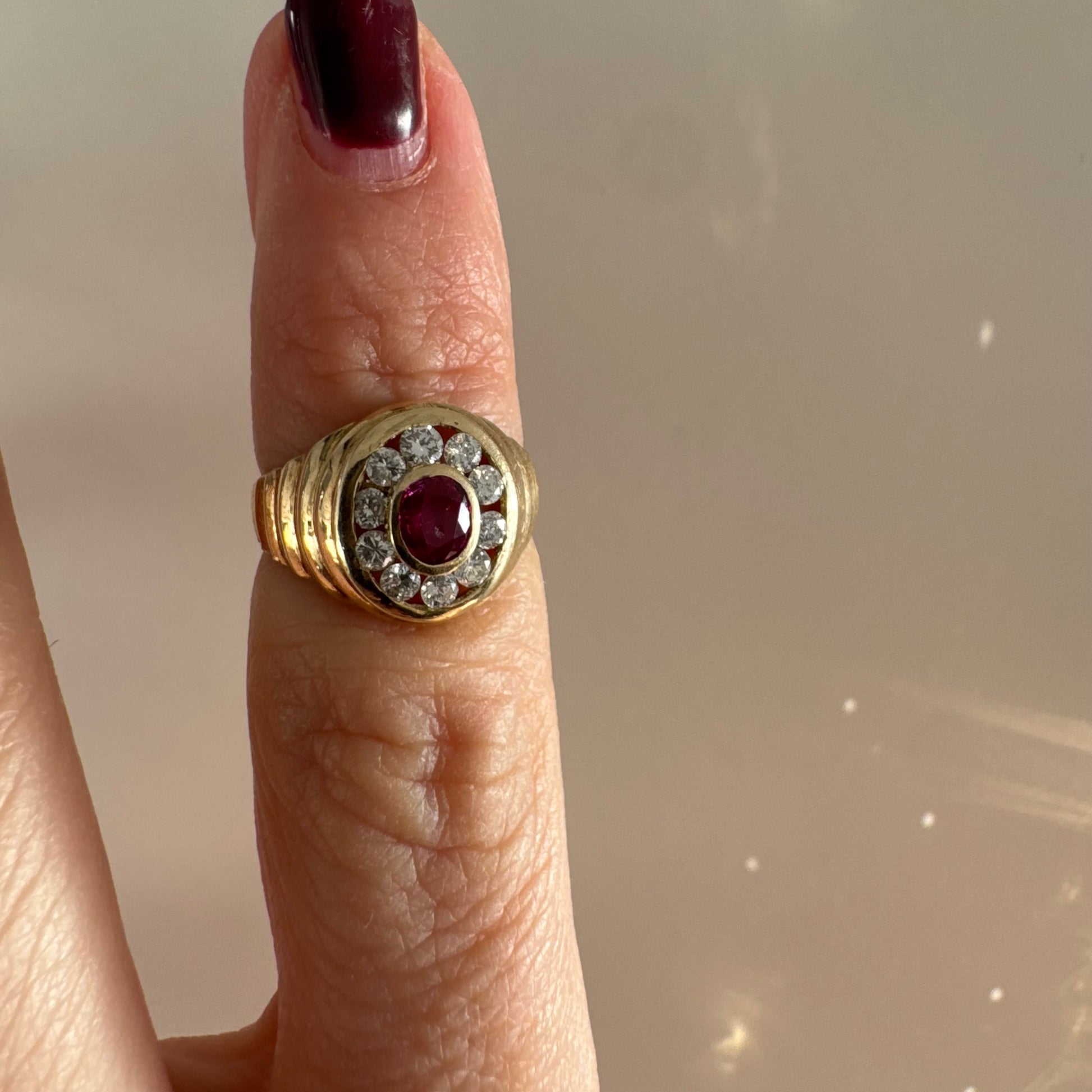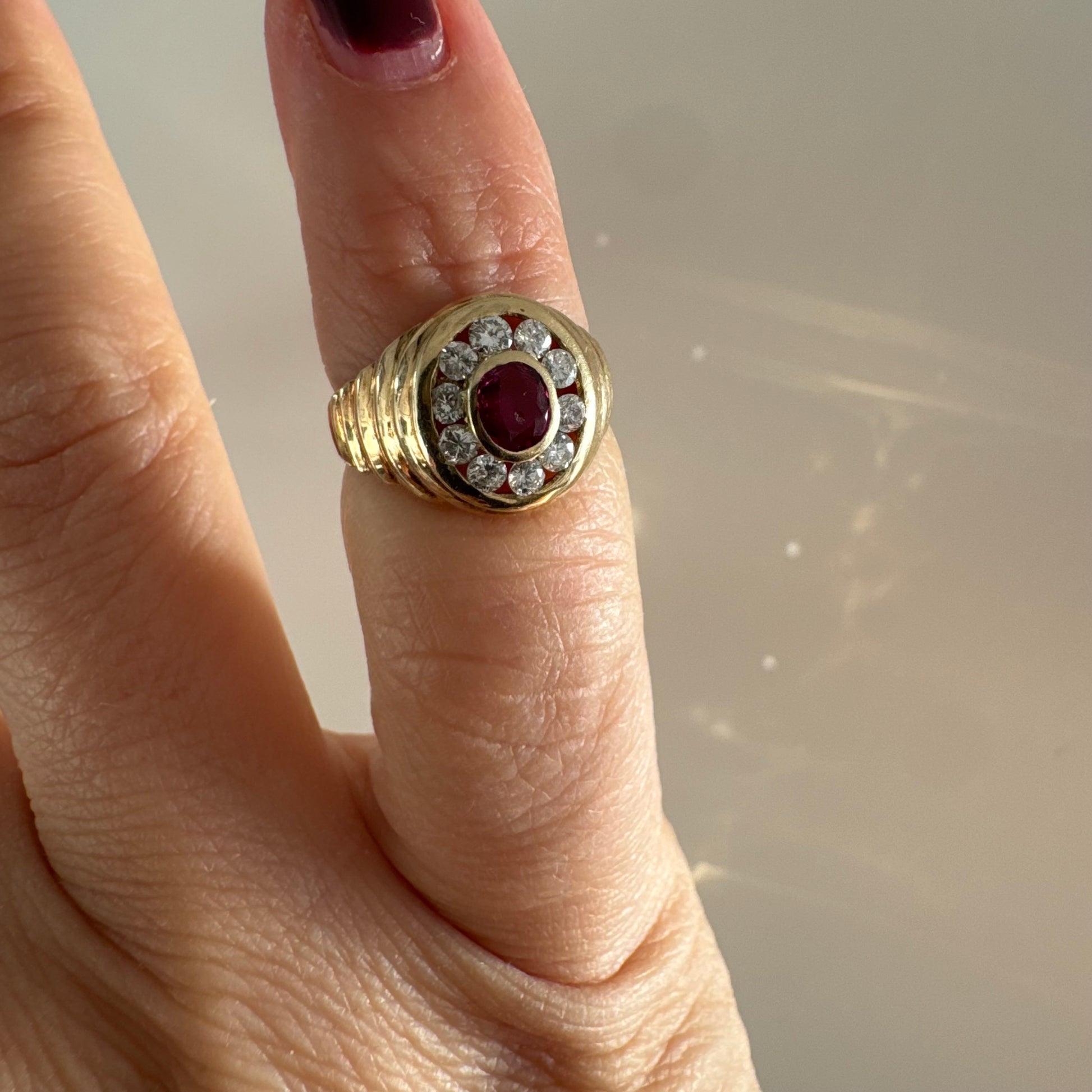 טבעת זהב צהוב 14 קראט בסגנון חותם עגול, משובצת אבן רובי מרכזית וסביבה הילה של יהלומים עגולים.