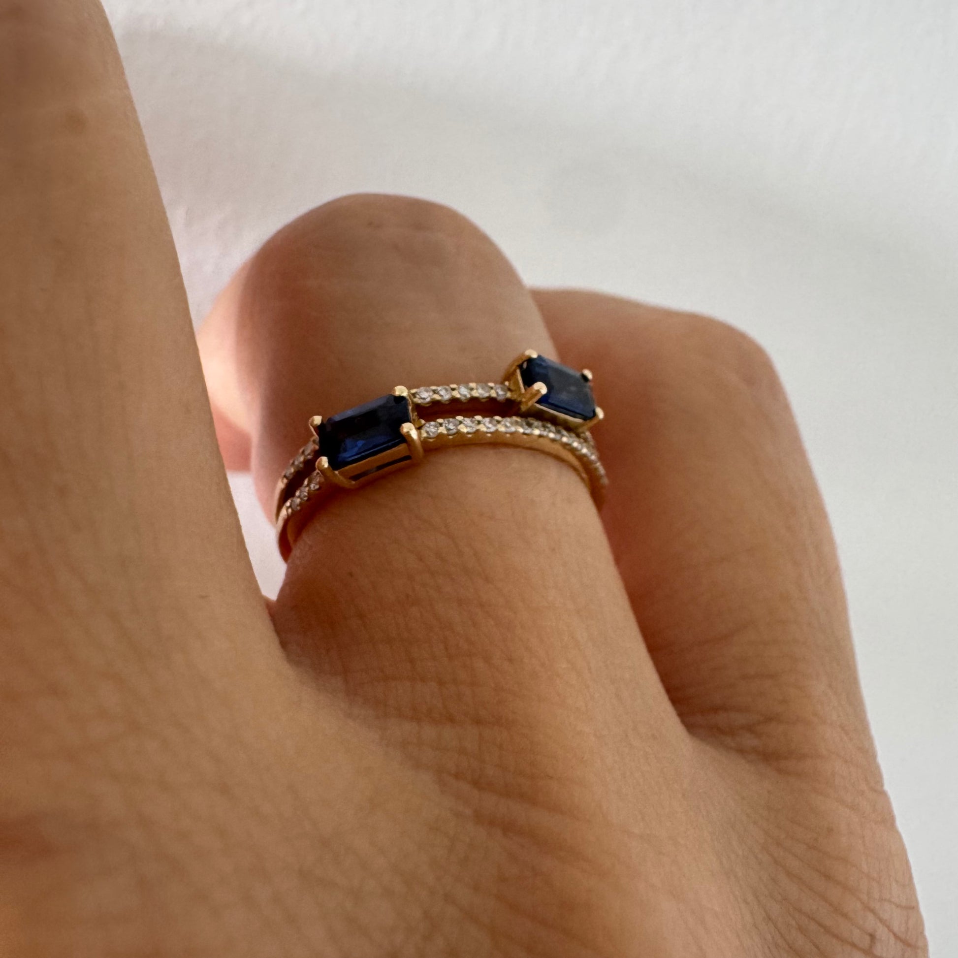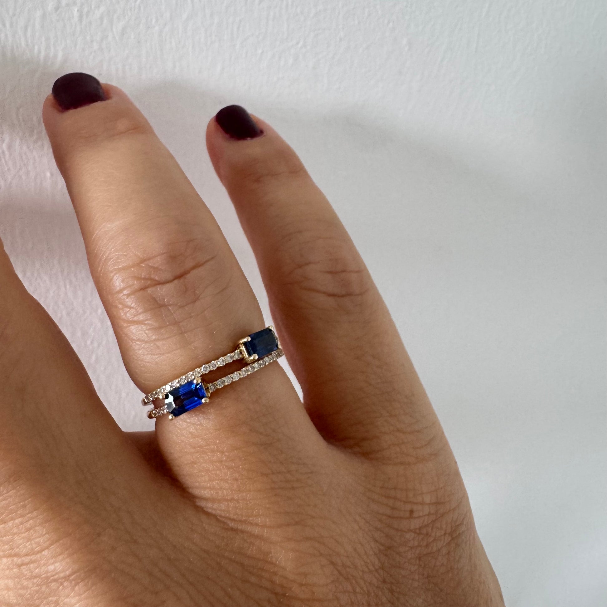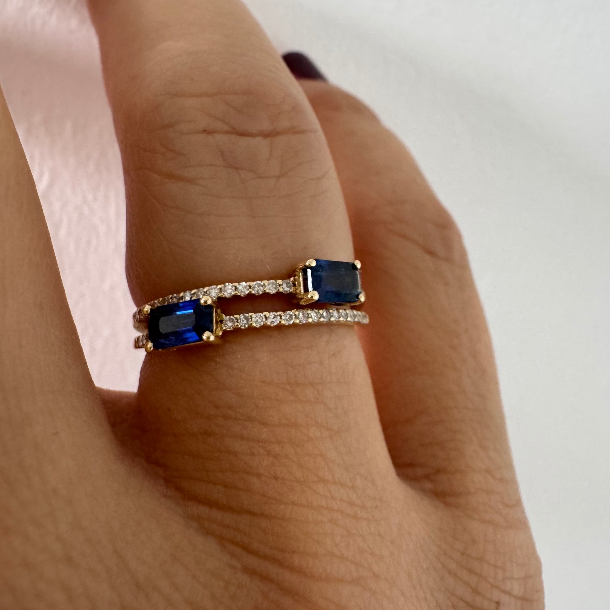 טבעת זהב צהוב 14 קראט בעיצוב פתוח, משובצת שתי אבני ספיר בחיתוך אמרלד ושורות יהלומים עדינים.