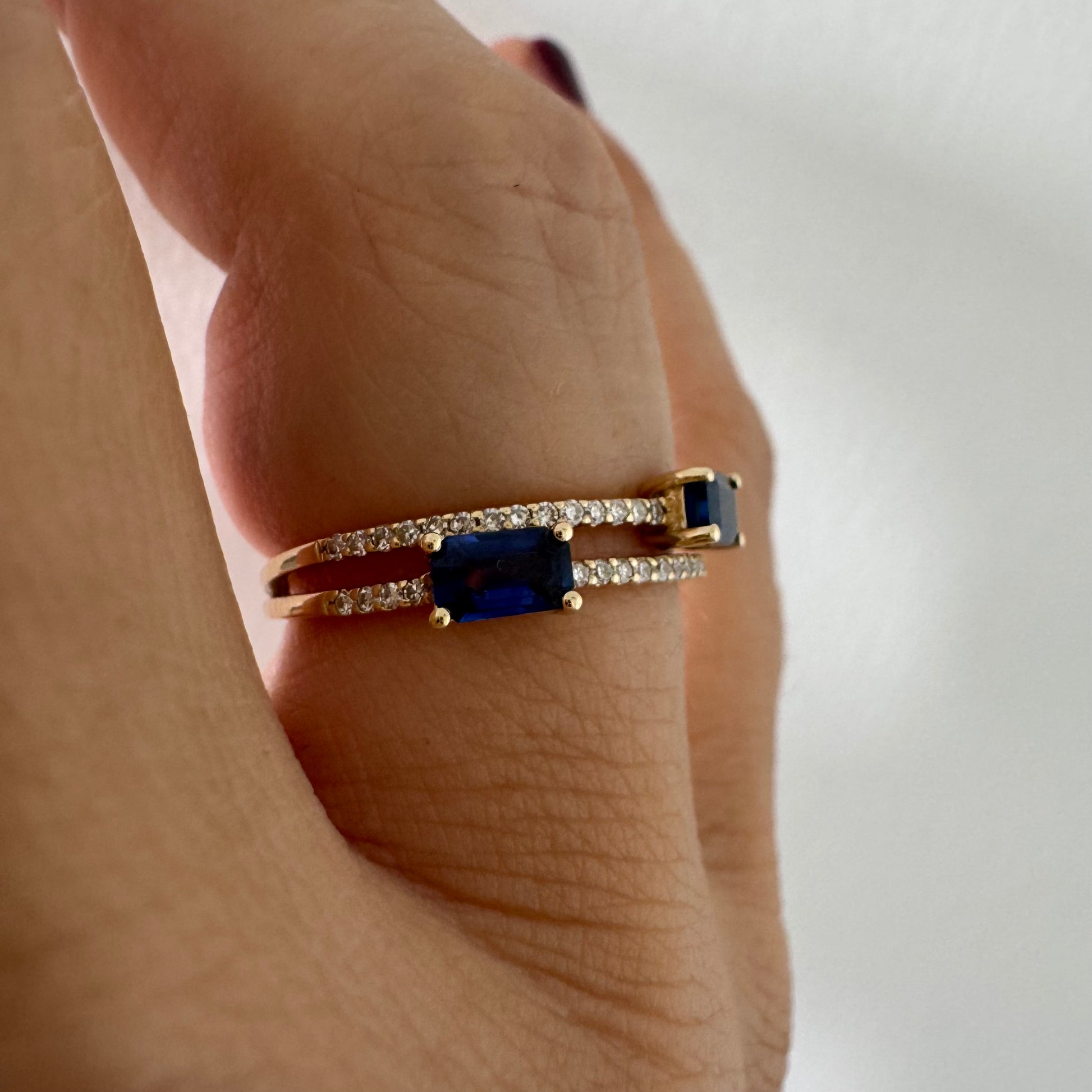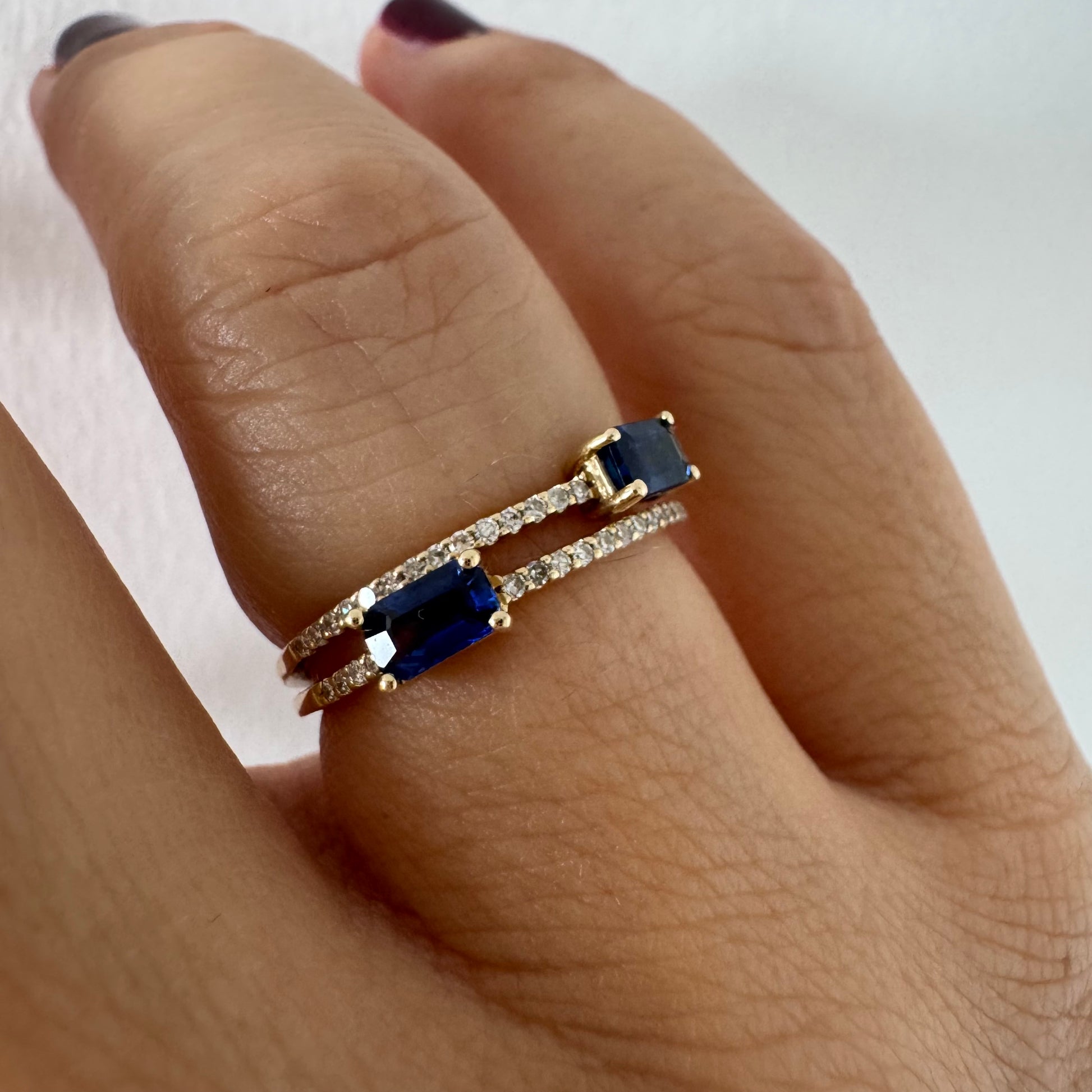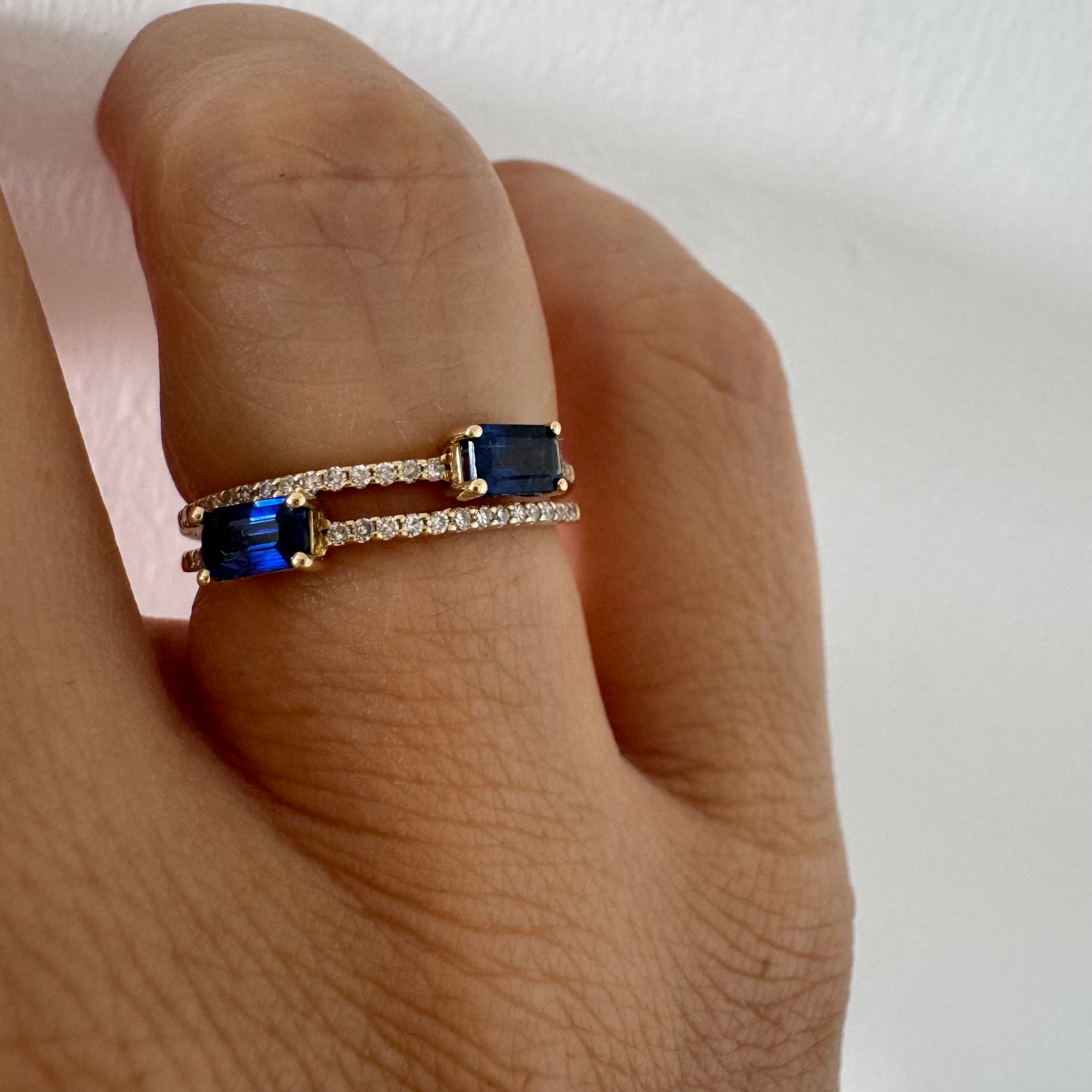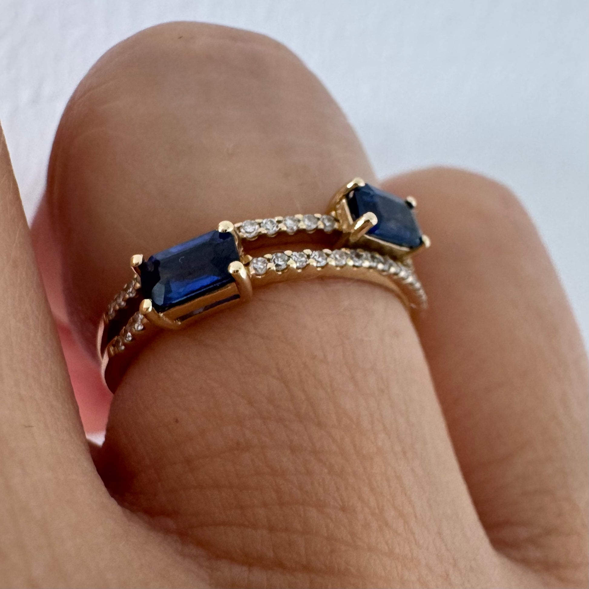 טבעת זהב צהוב 14 קראט בעיצוב פתוח, משובצת שתי אבני ספיר בחיתוך אמרלד ושורות יהלומים עדינים.
