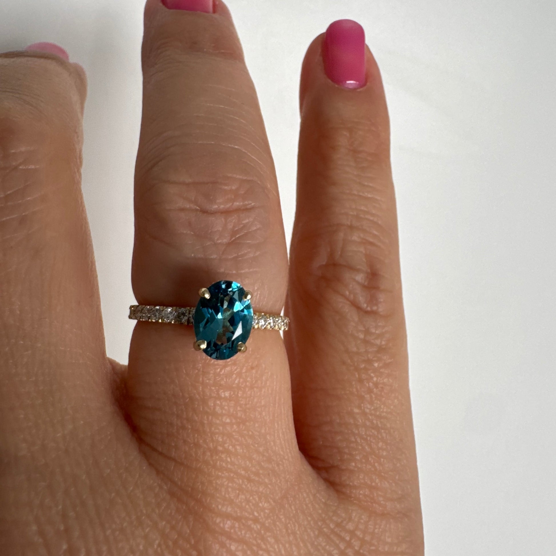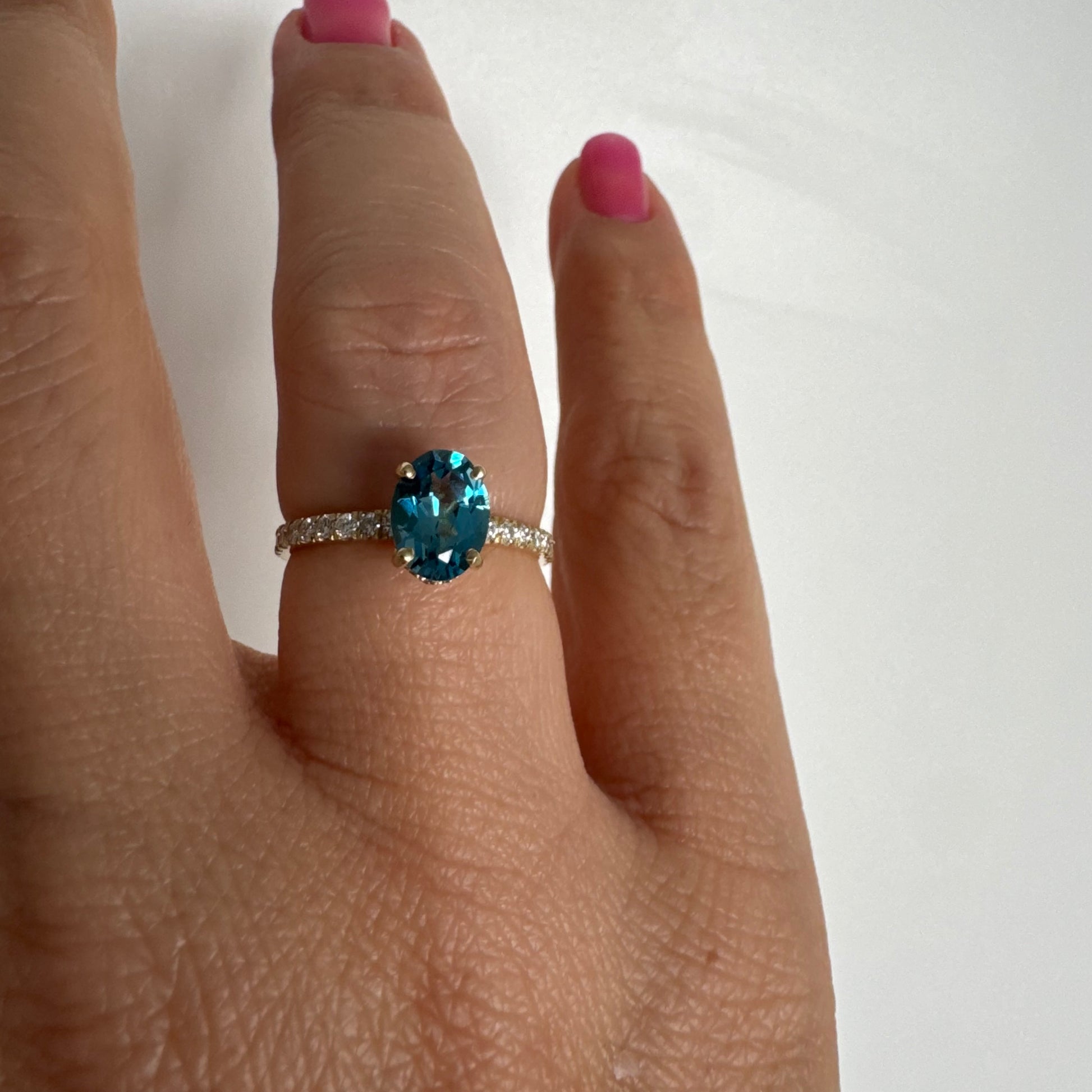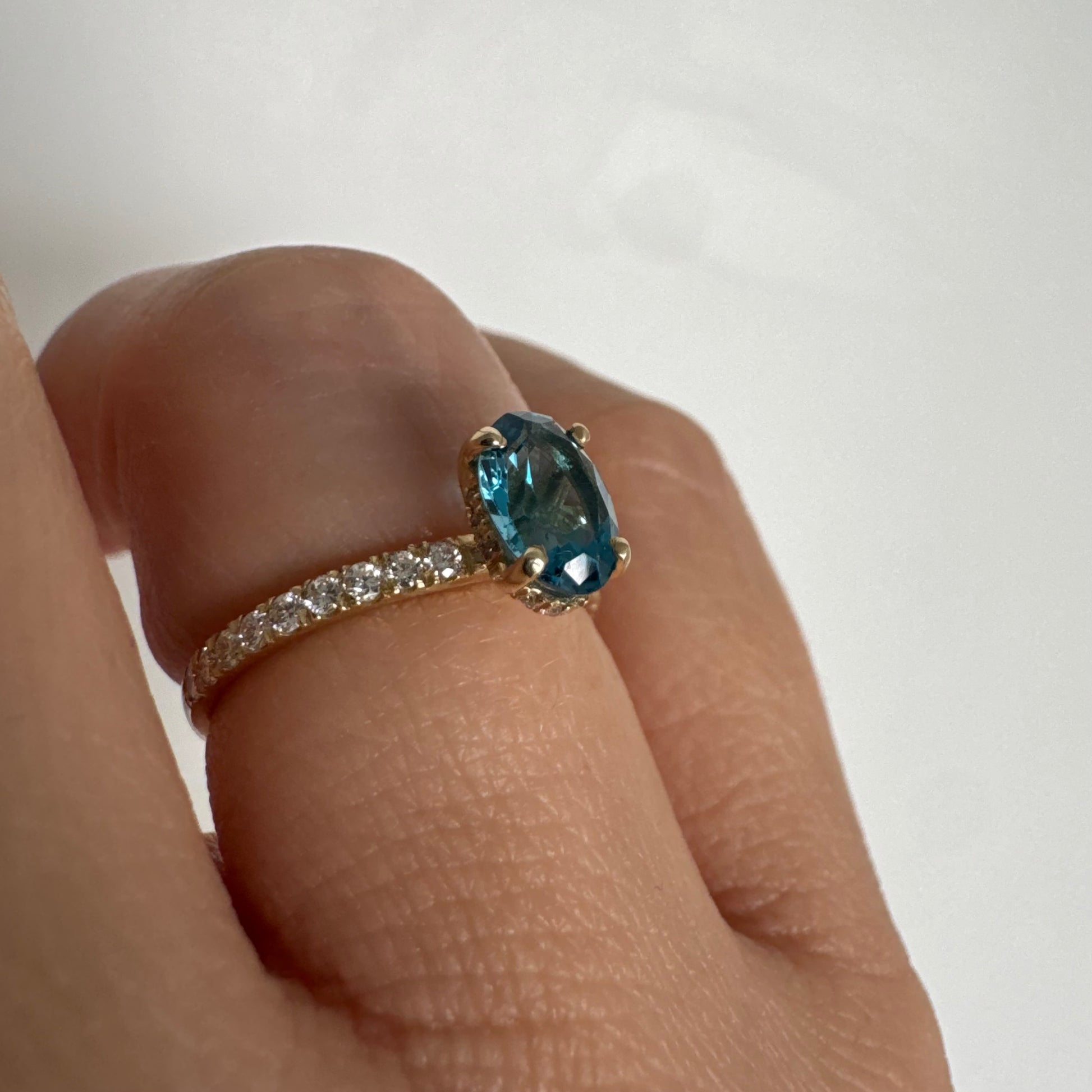 טבעת זהב צהוב 14 קראט משובצת אבן טופז כחולה אובלית בגוון טורקיז־כחול עמוק, באחיזה של ארבע שיניים עדינות ויהלומים.