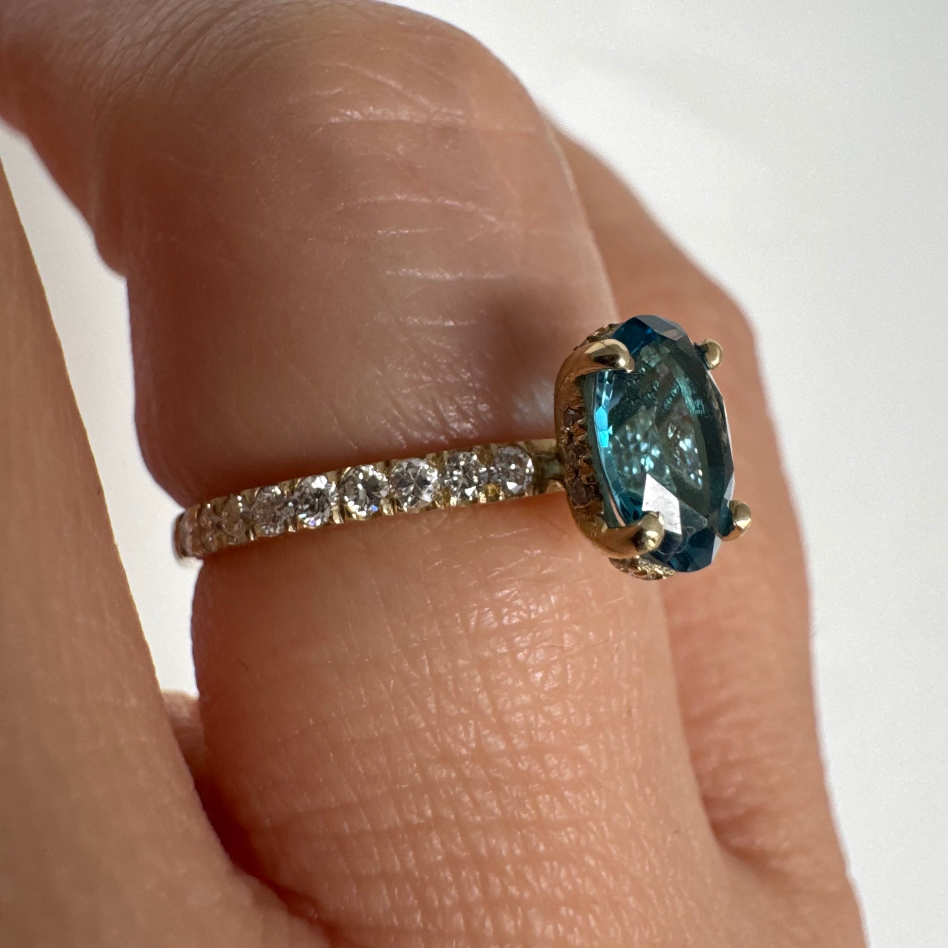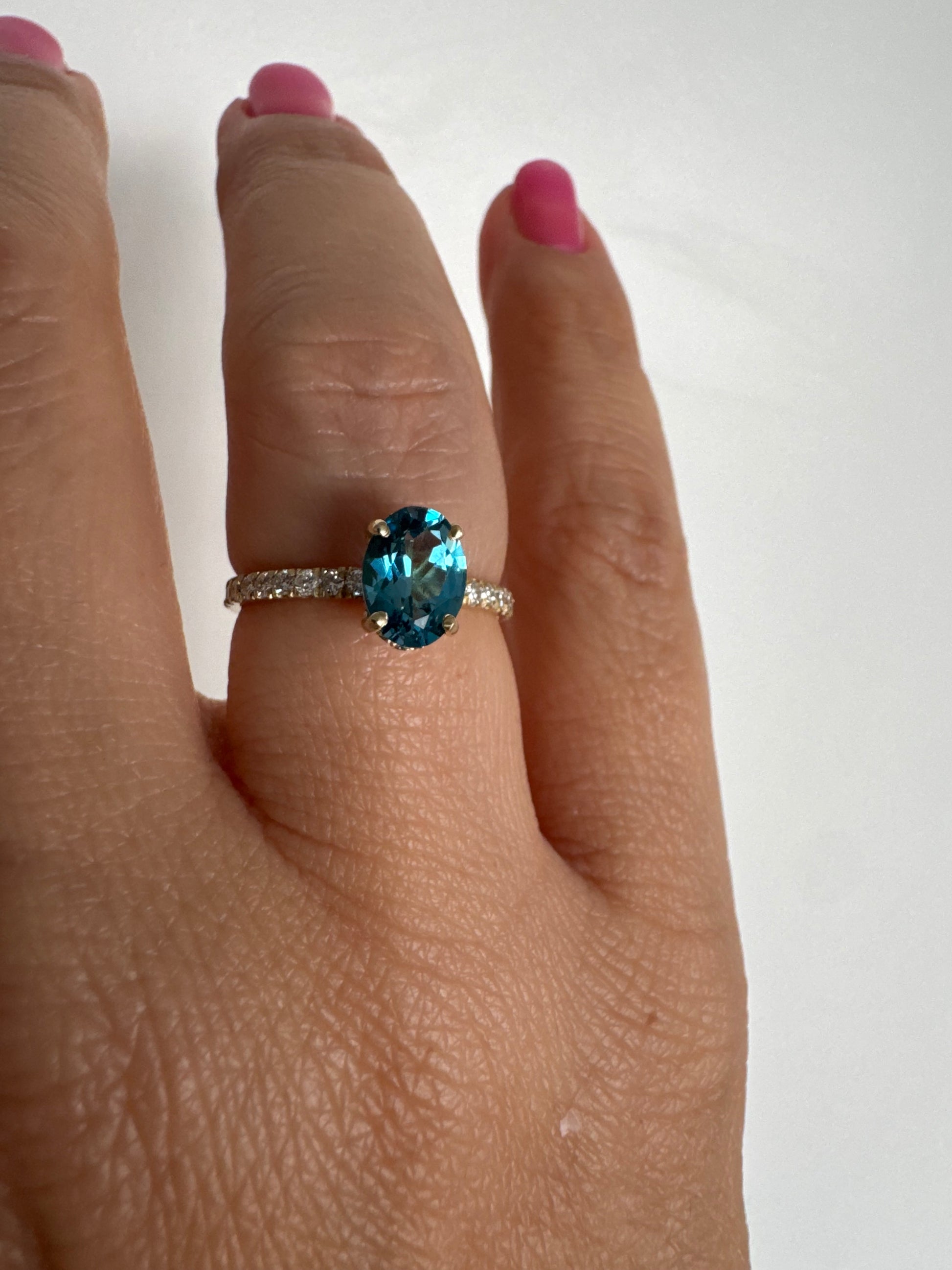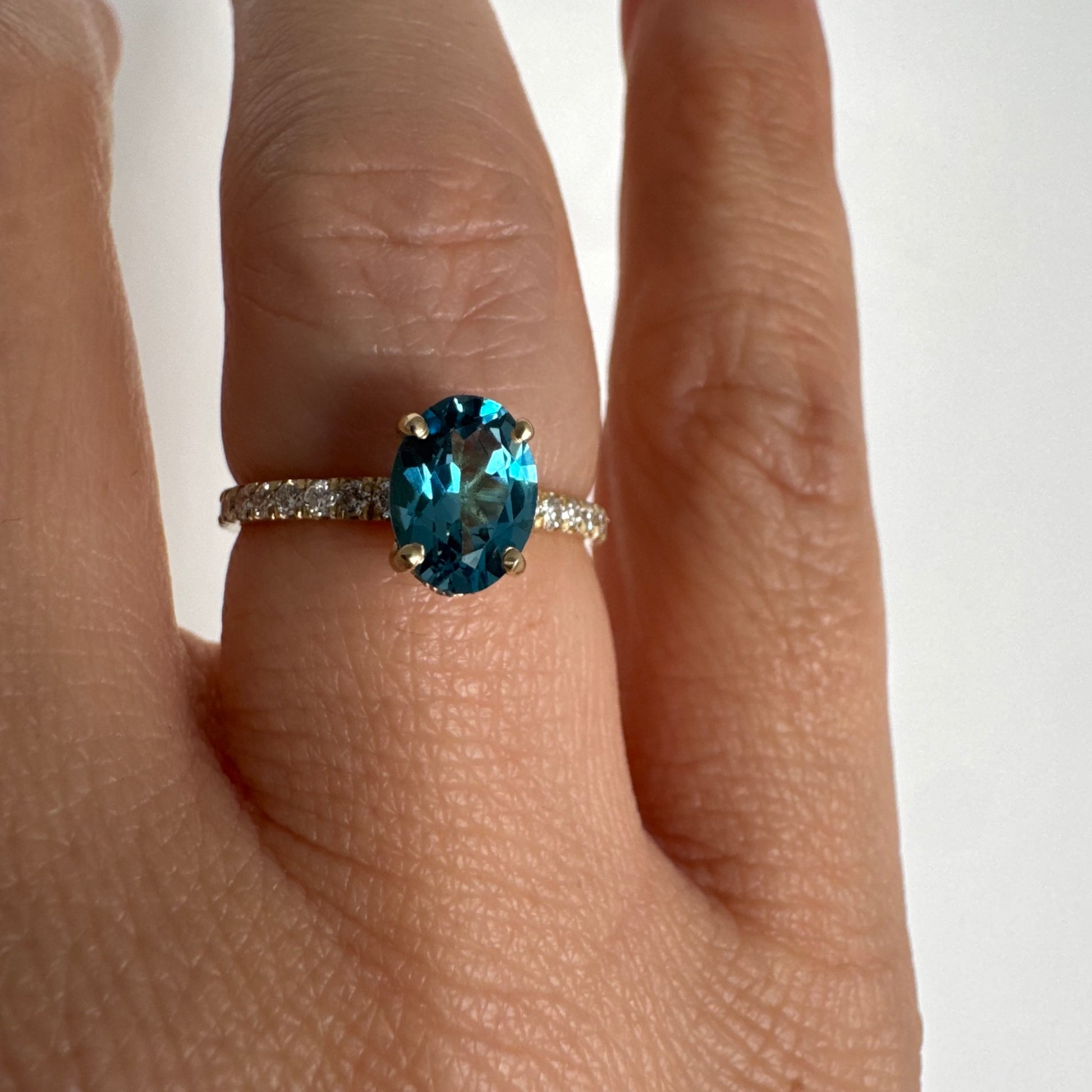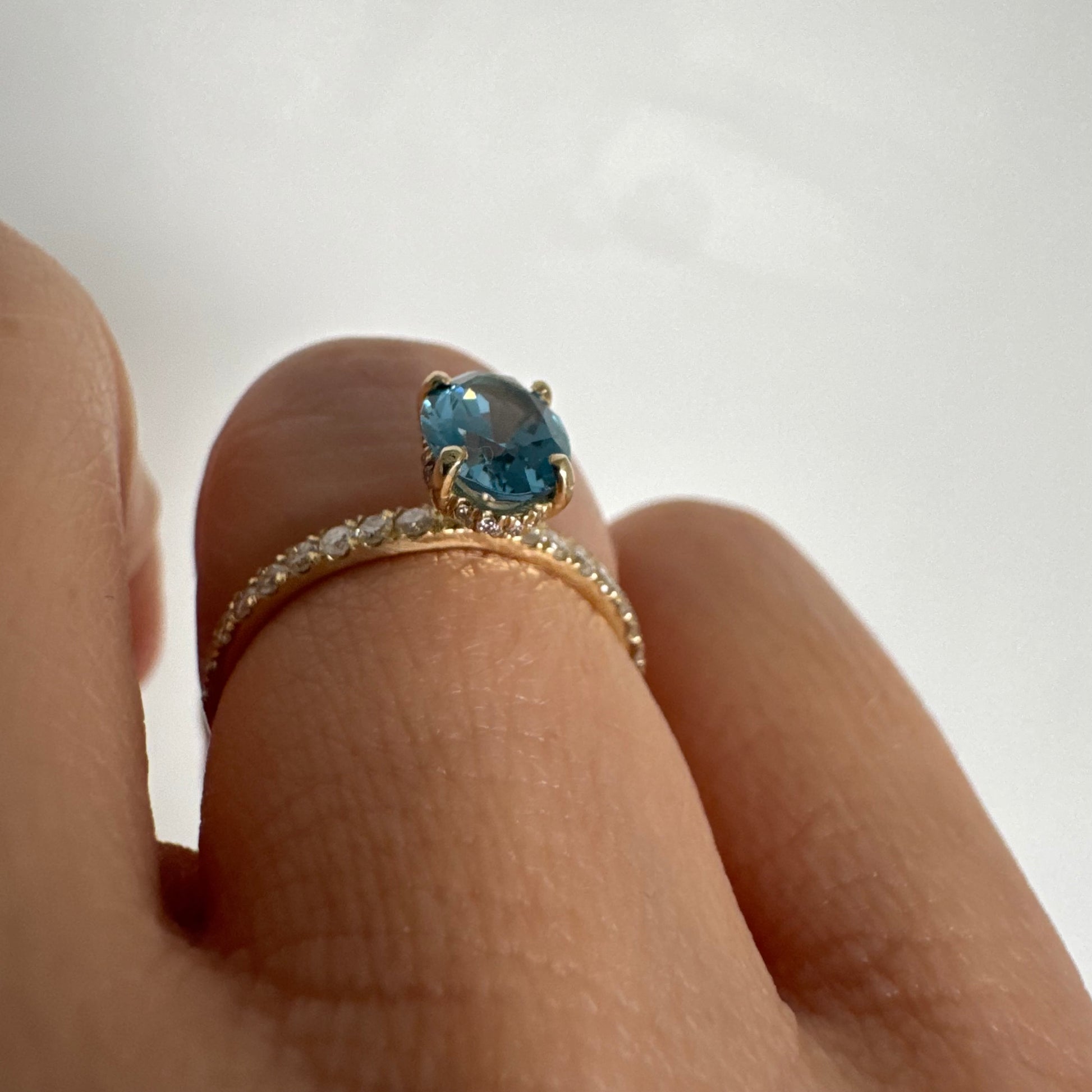 טבעת זהב צהוב 14 קראט משובצת אבן טופז כחולה אובלית בגוון טורקיז־כחול עמוק, באחיזה של ארבע שיניים עדינות ויהלומים.