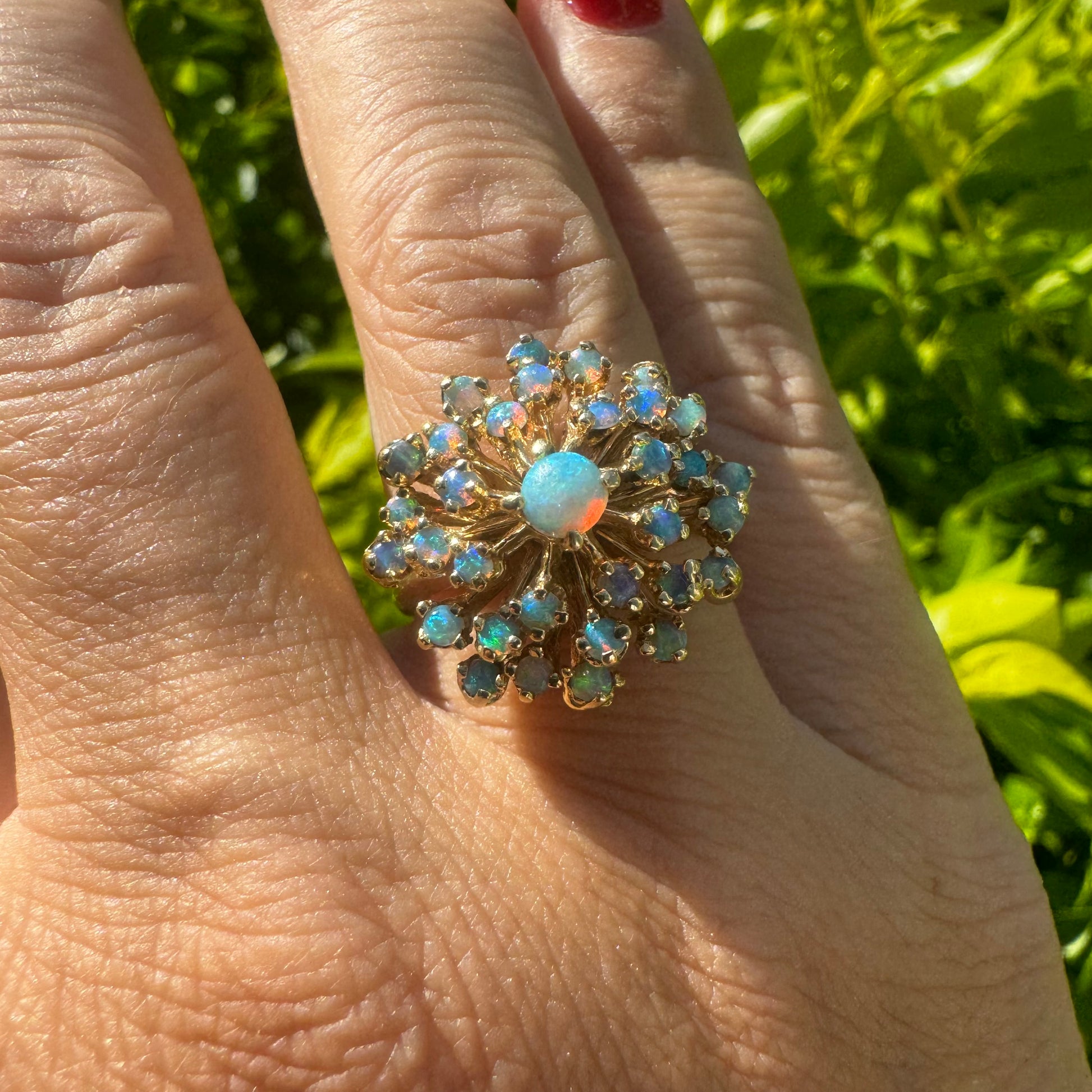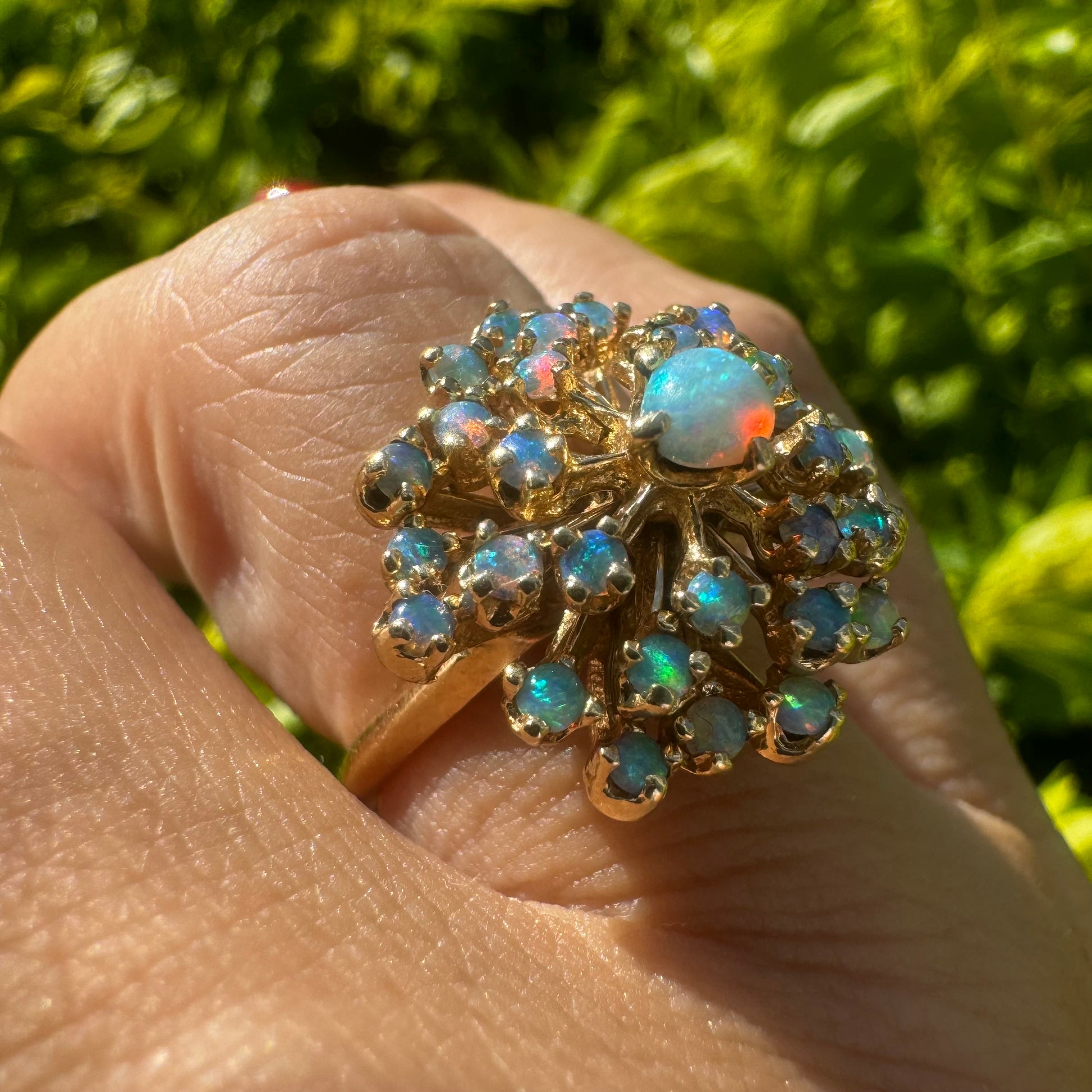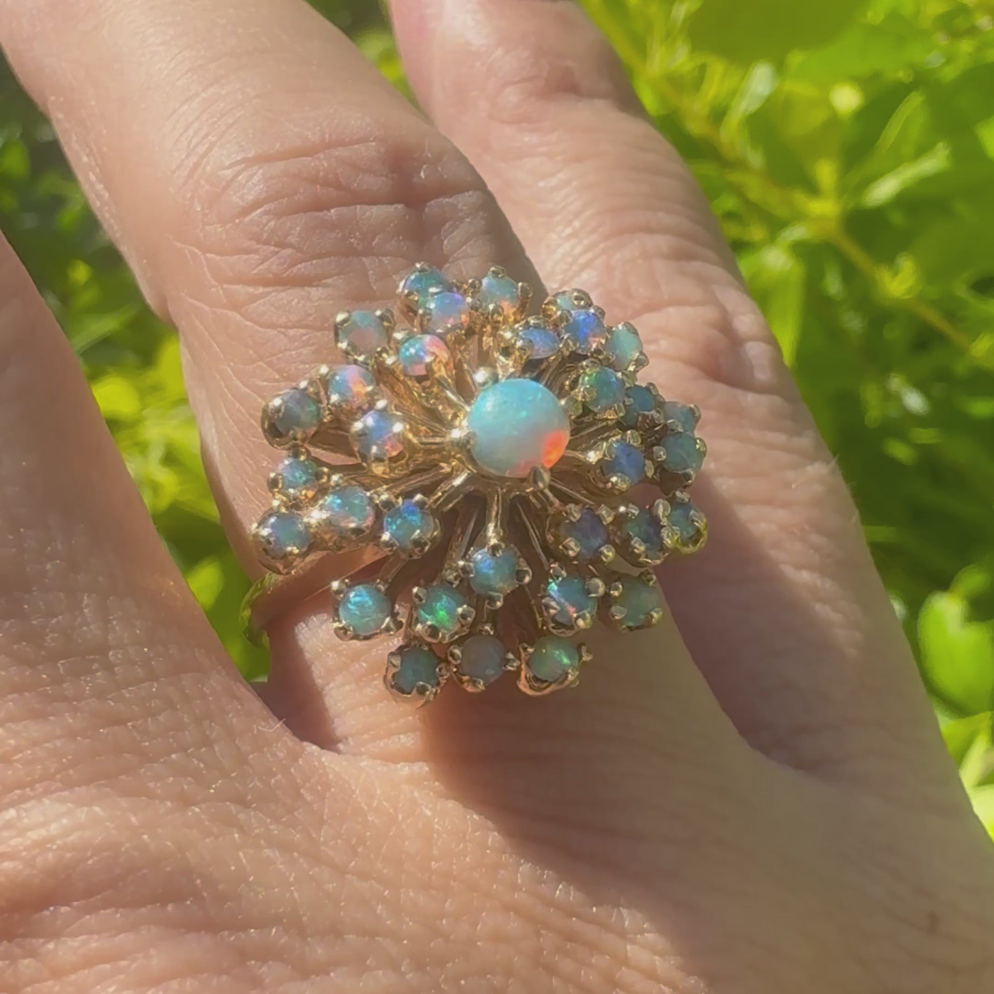 טבעת זהב צהוב 14 קראט משובצת אבני אופל עם צבעים מתחלפים