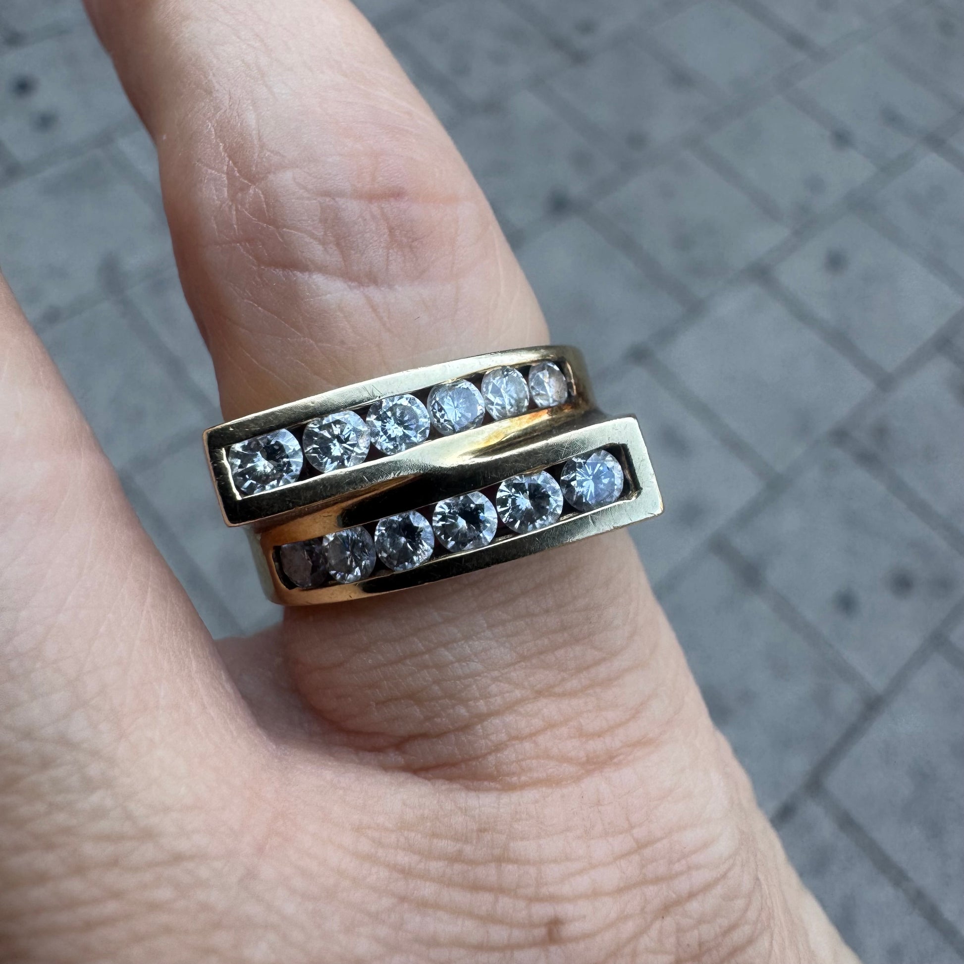 טבעת בעלת שתי רצועות זהב מקבילות משובצות ביהלומים נוצצים וביניהן רווח מרכזי פתוח שיוצר מראה אדריכלי, נקי ומודרני.
