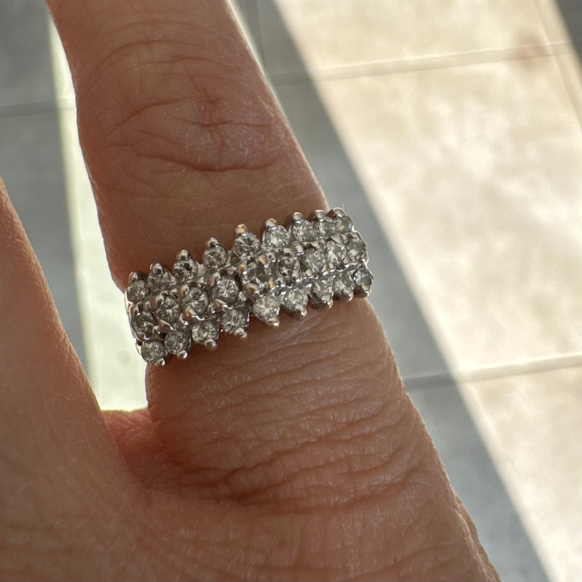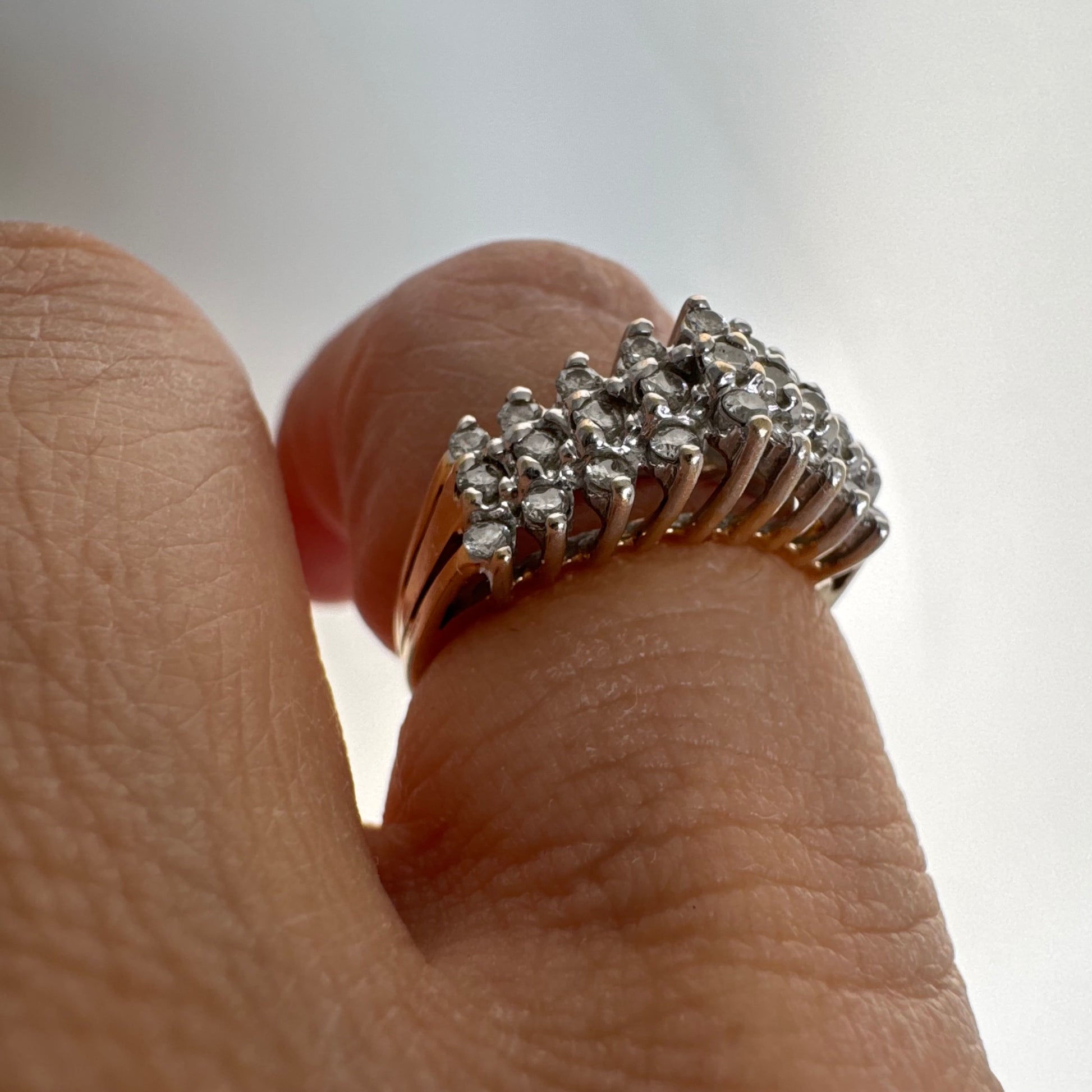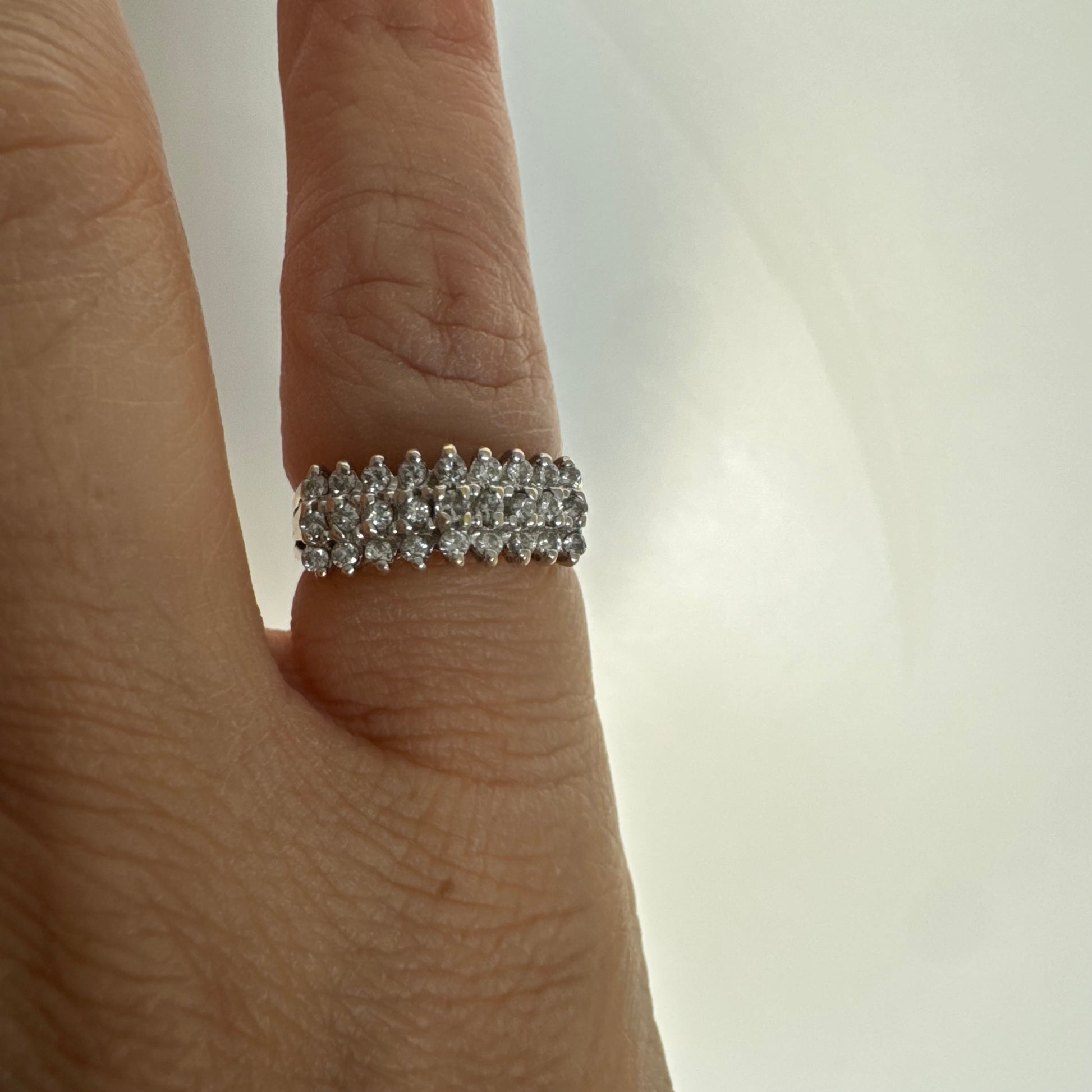 טבעת זהב צהוב 14 קראט משובצת שורות של יהלומים עגולים.