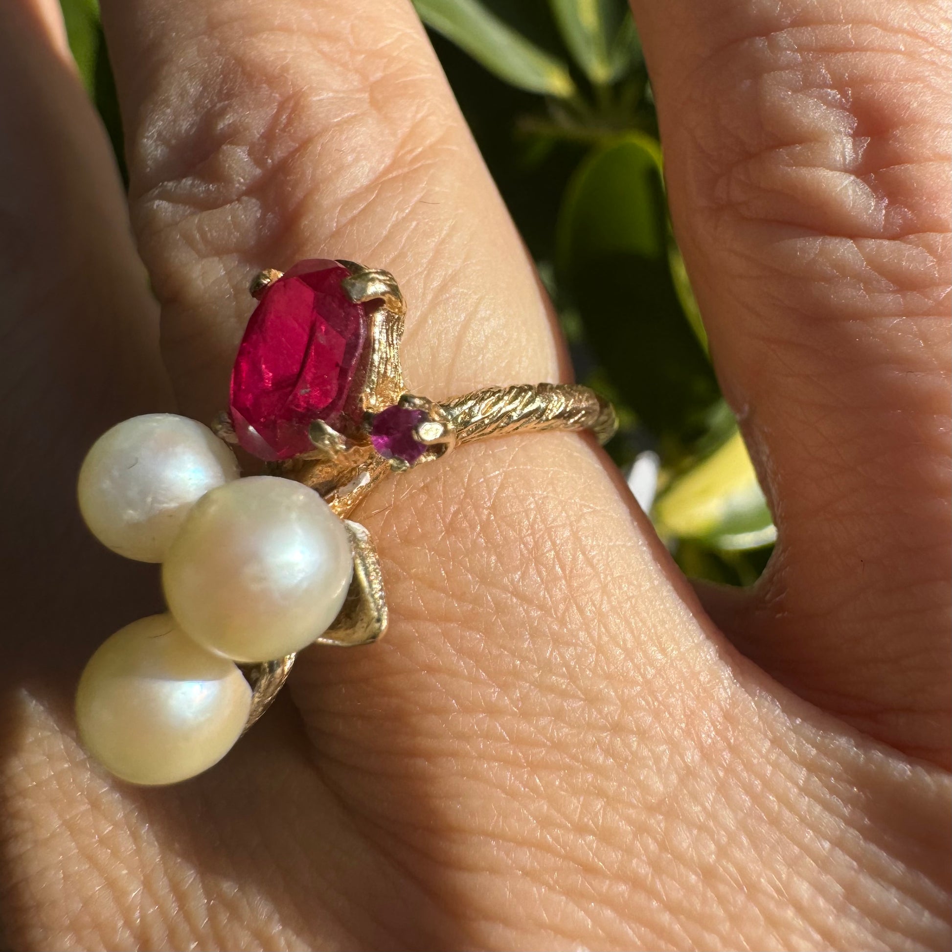 טבעת זהב צהוב 14 קראט משובצת 3 פנינים ואבן רובי