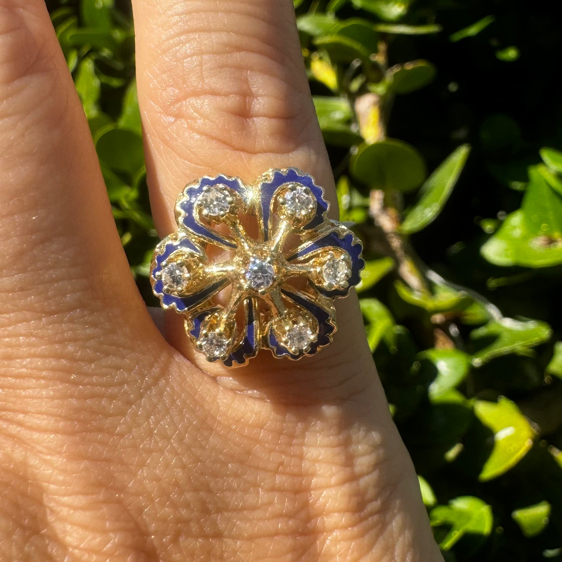 טבעת זהב 14K משובצת יהלומים ואמייל כחול