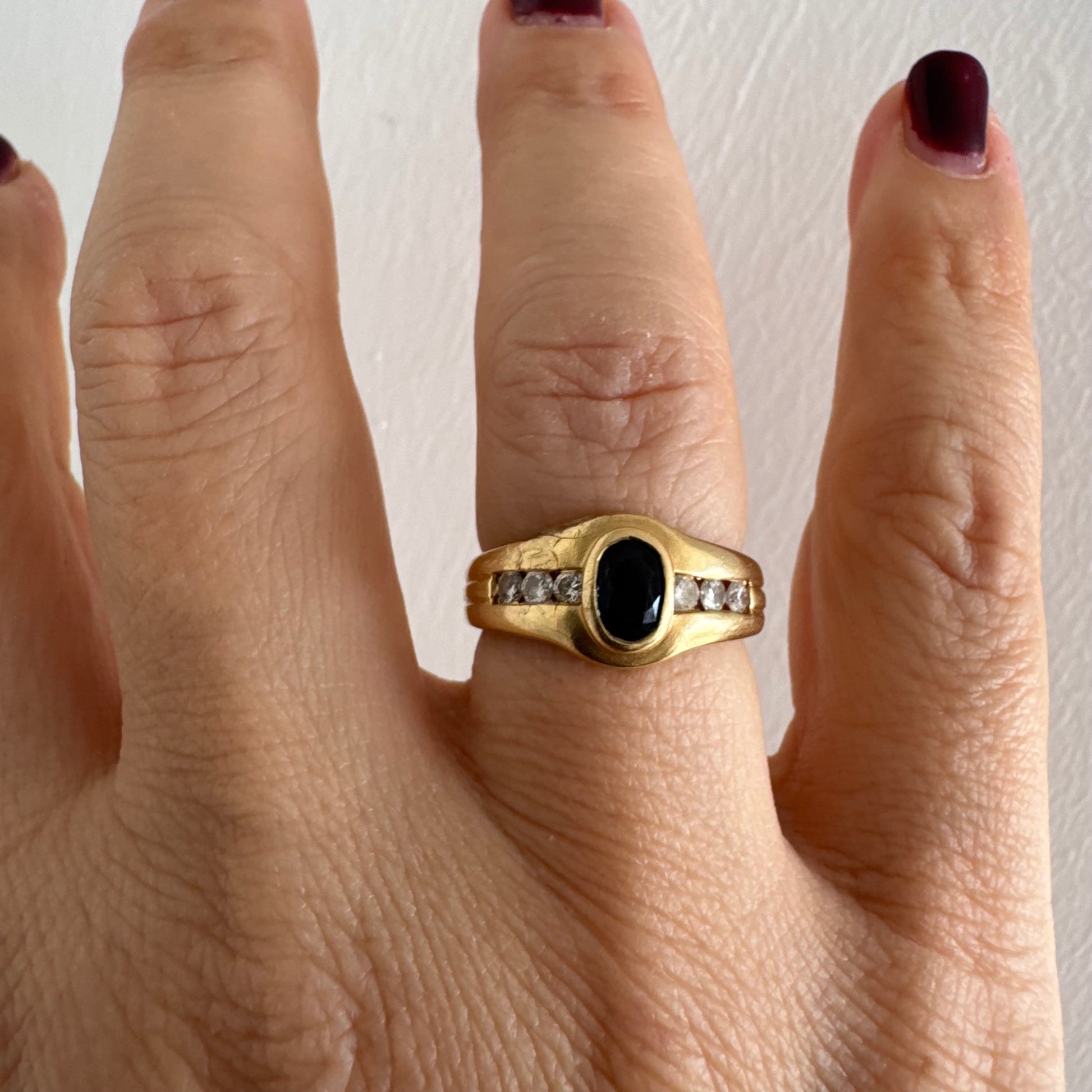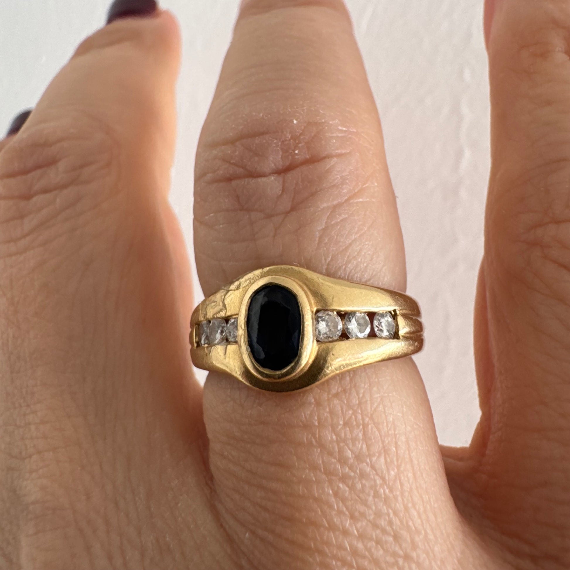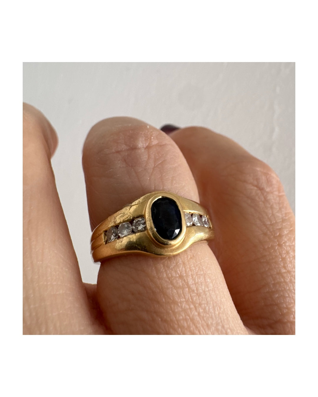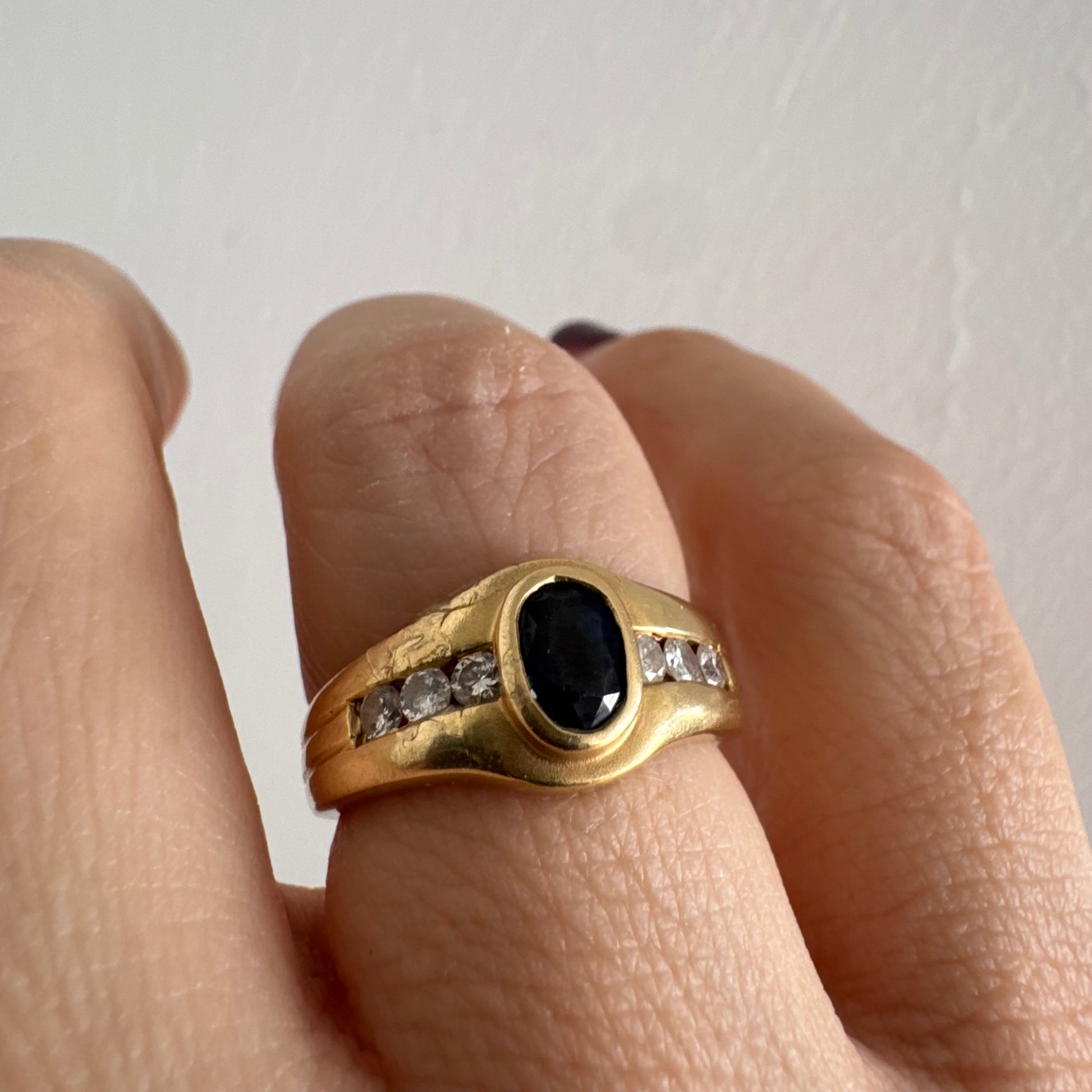טבעת זהב צהוב 18 קראט משובצת אבן ספיר אובלית בגוון כחול עמוק, במסגרת חלקה ומודגשת, ומשני צדדיה שורת יהלומים משובצים בתעלה.