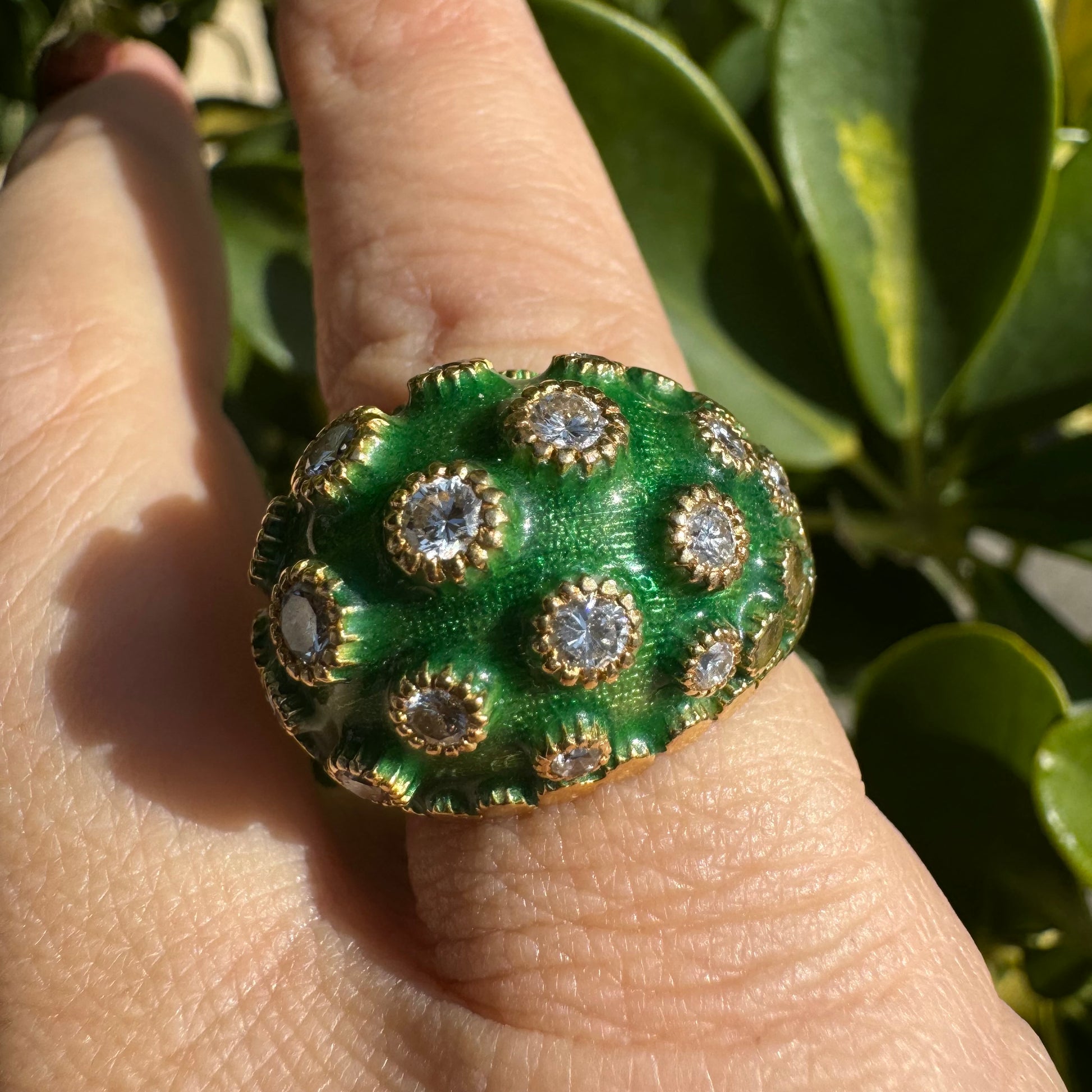 טבעת זהב צהוב 18 קראט משובצת יהלומים ואמייל ירוק
