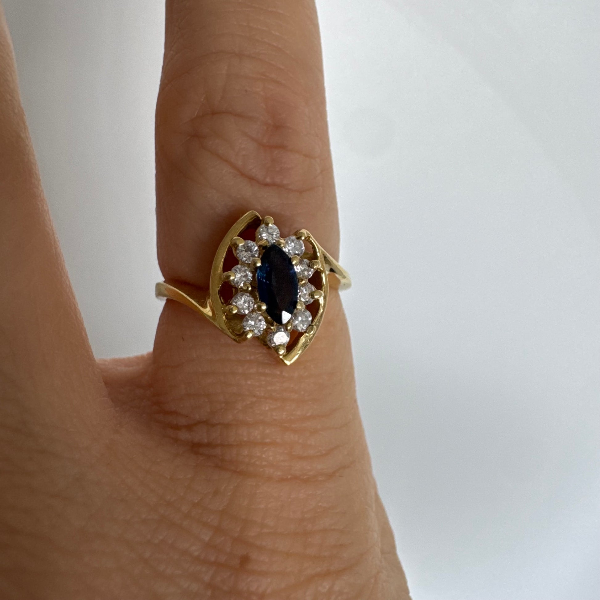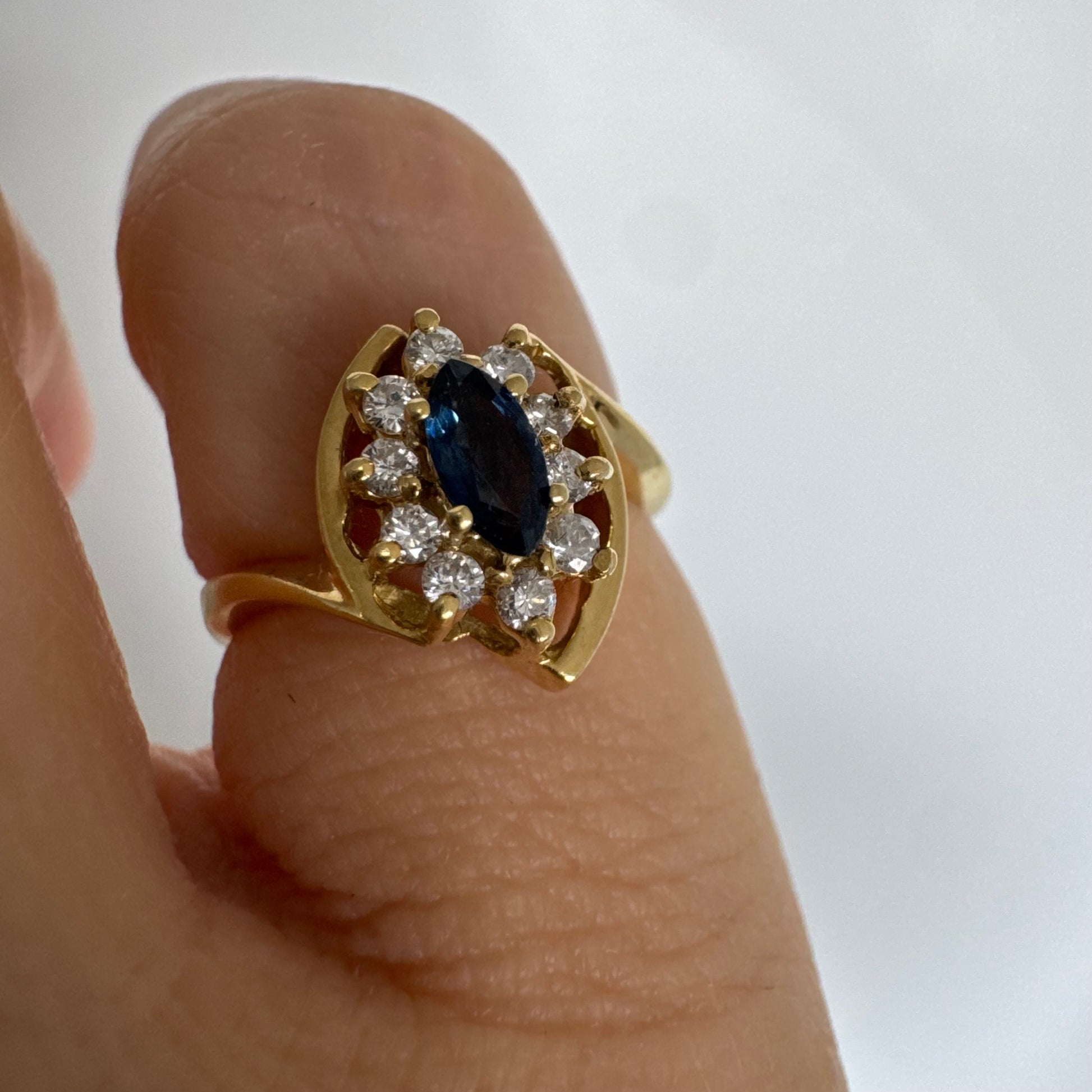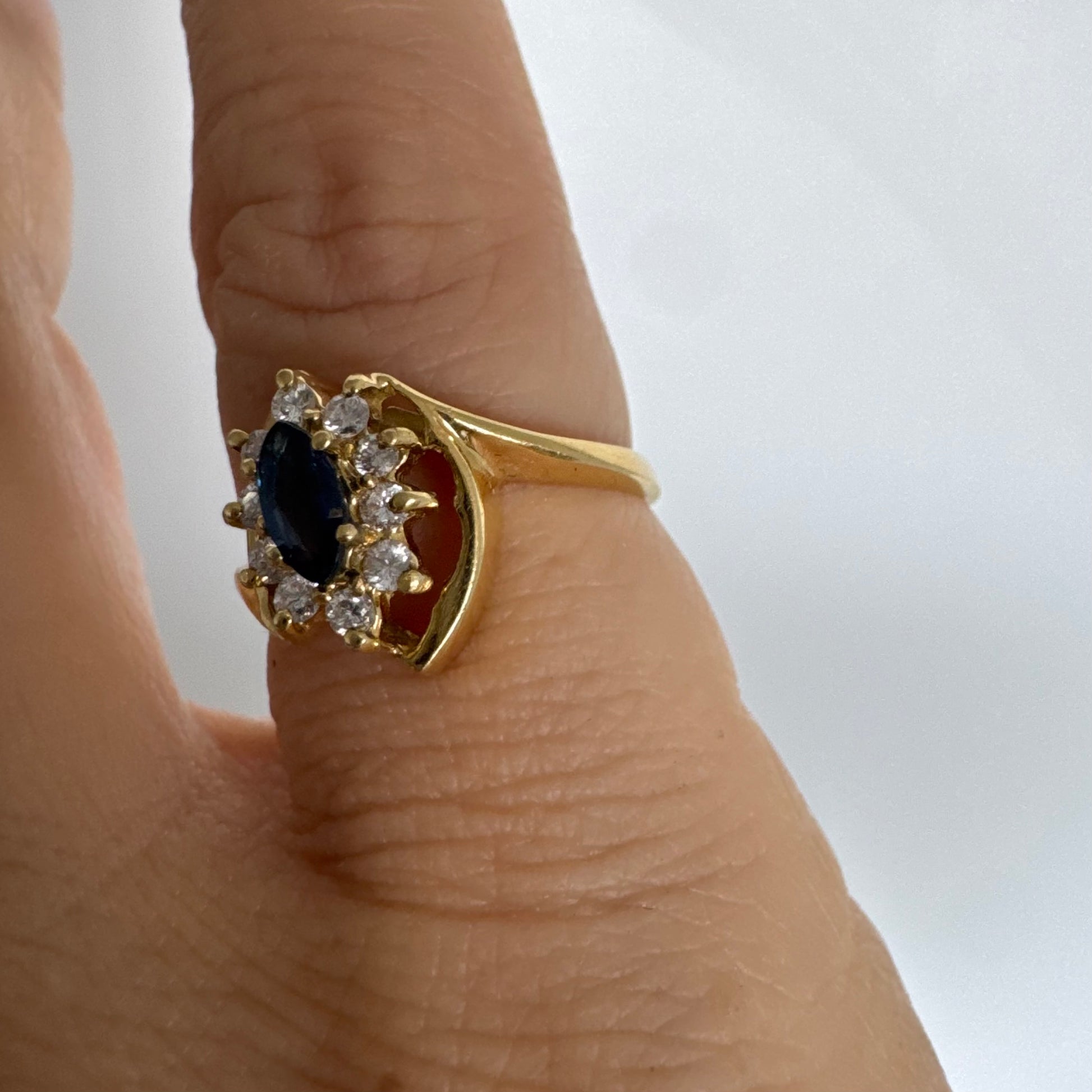 טבעת זהב צהוב 18 קראט משובצת ספיר כחול מרכזי בחיתוך מרקיזה, מוקף הילה של יהלומים המעניקים ניצוץ עדין ומדגישים את צבע האבן העמוק.
