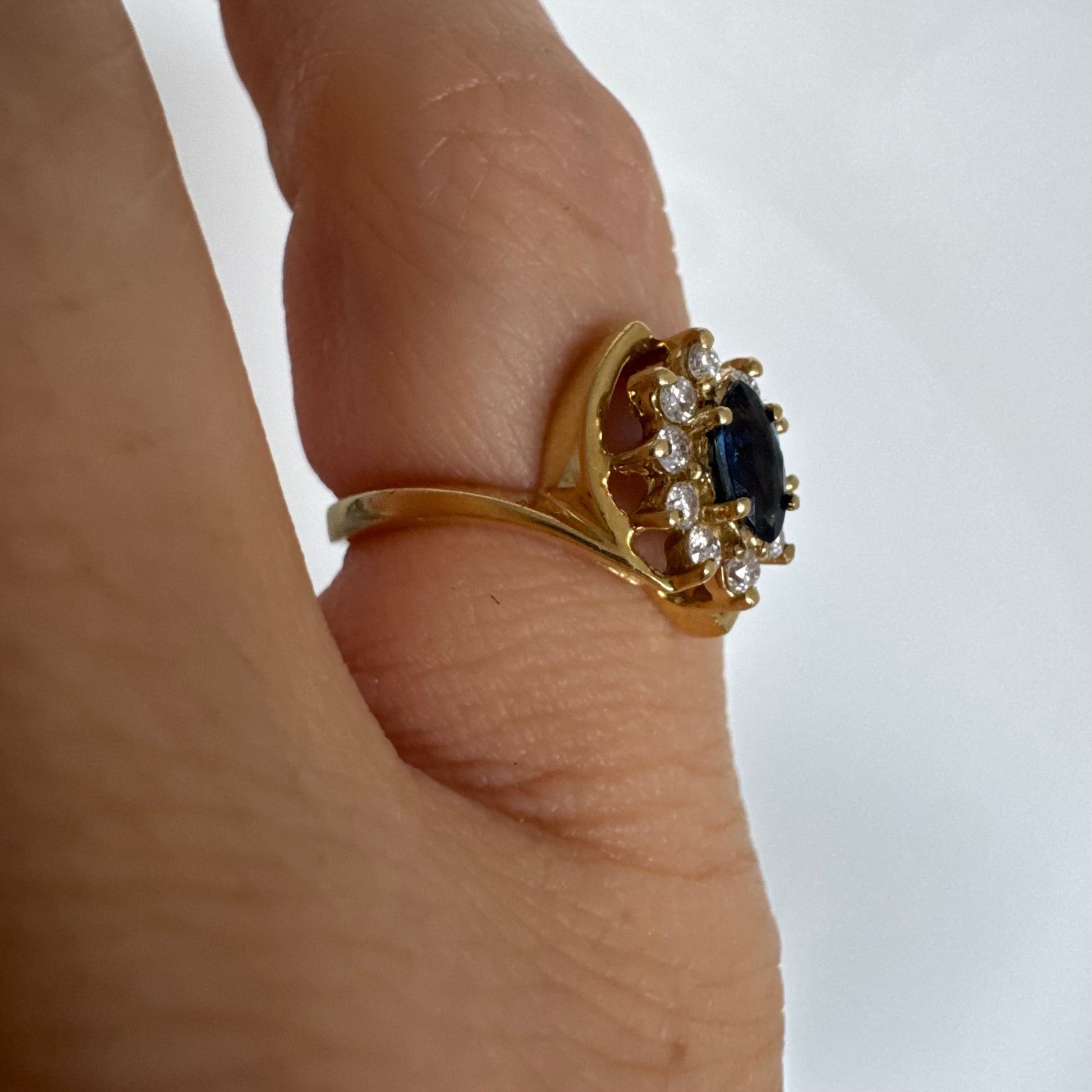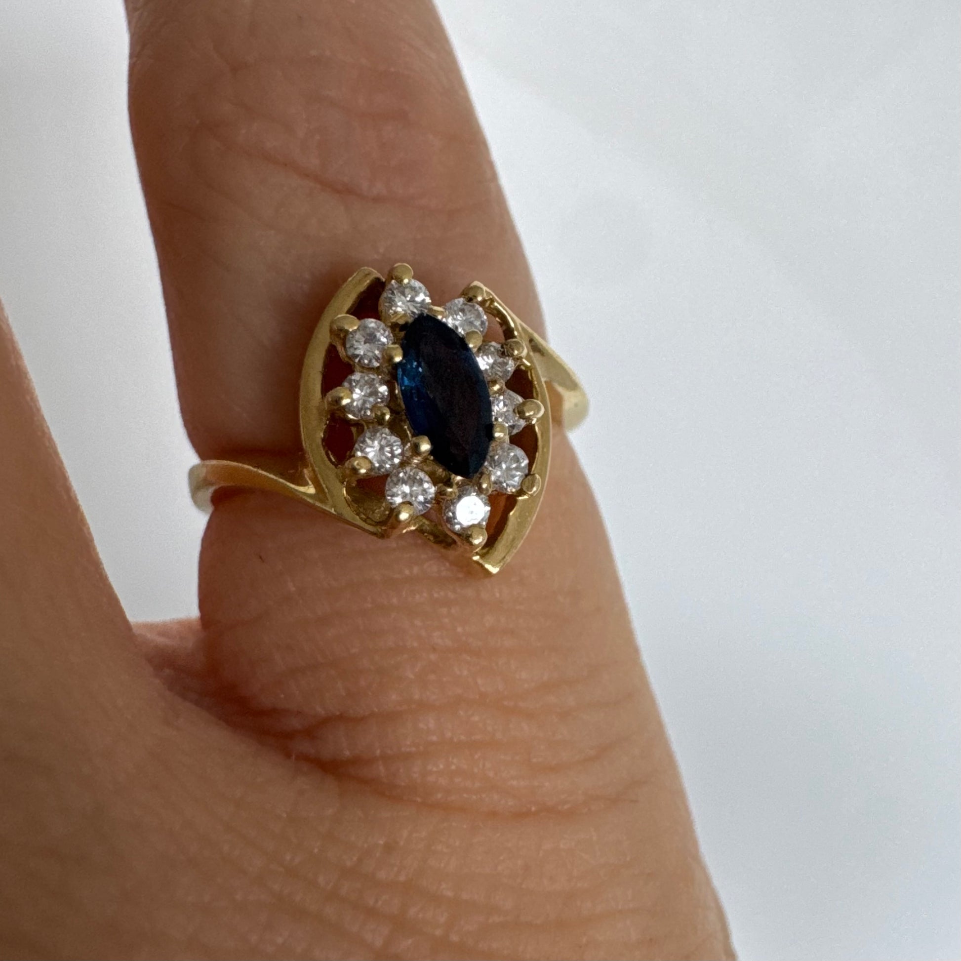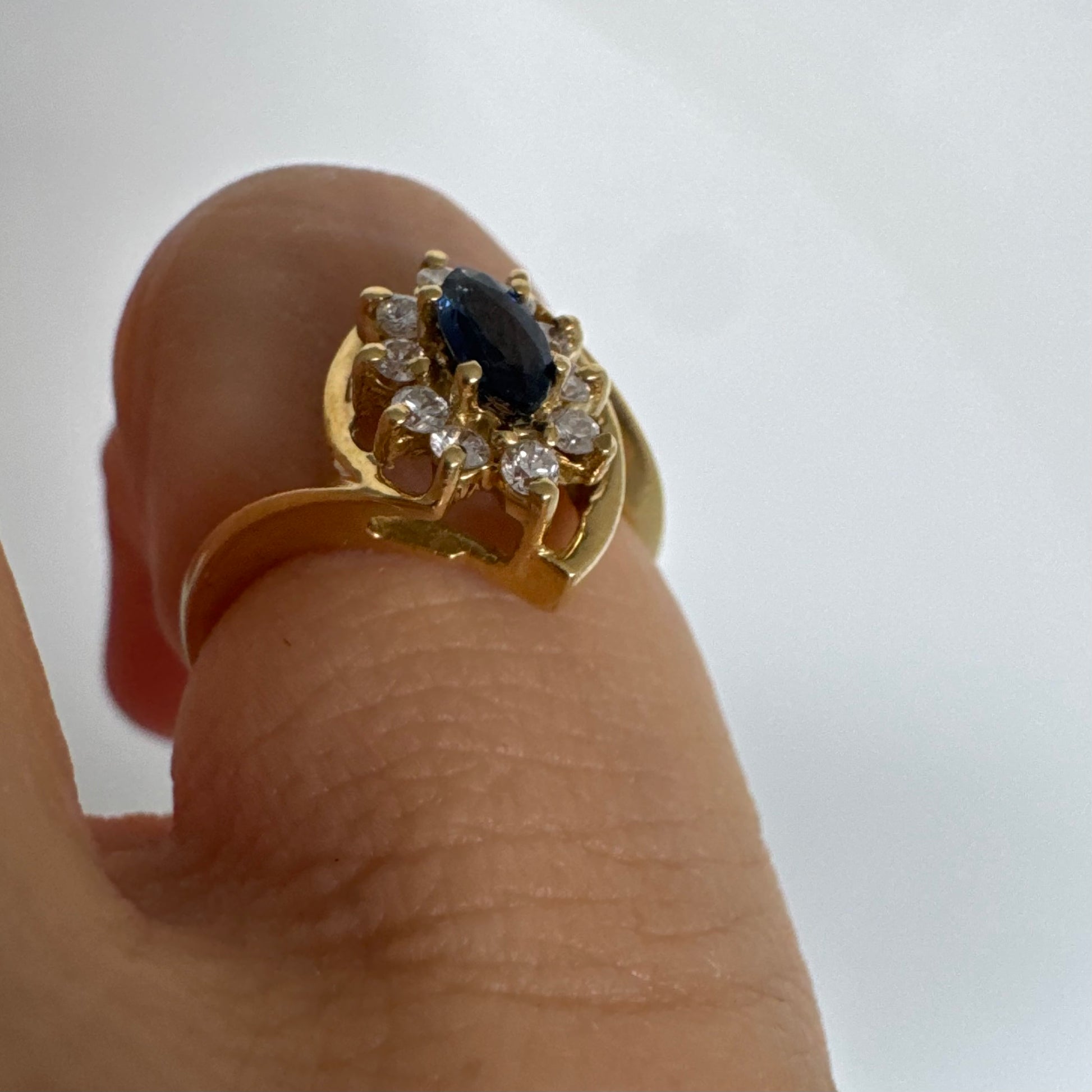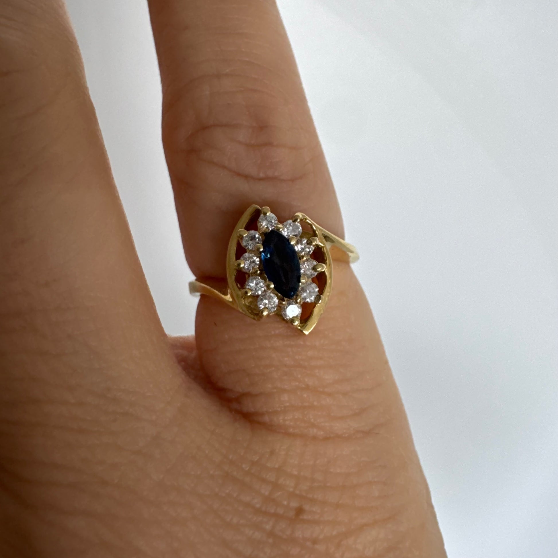 טבעת זהב צהוב 18 קראט משובצת ספיר כחול מרכזי בחיתוך מרקיזה, מוקף הילה של יהלומים המעניקים ניצוץ עדין ומדגישים את צבע האבן העמוק.