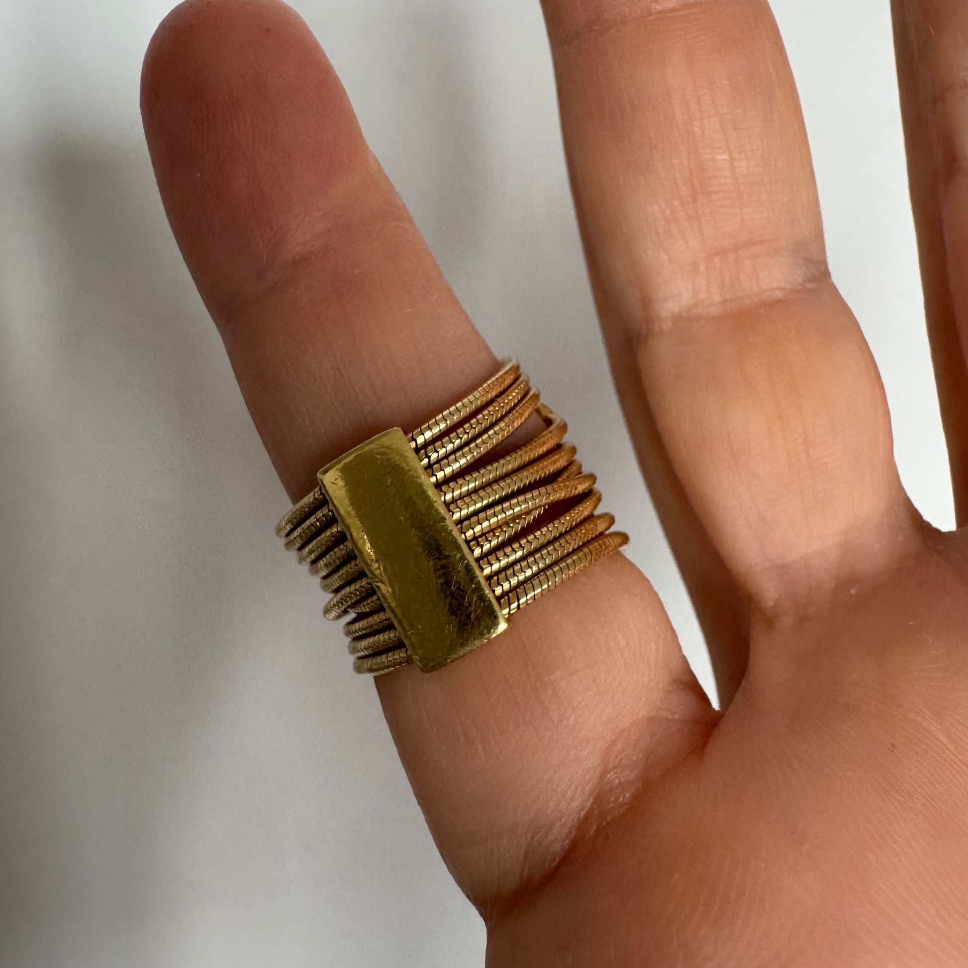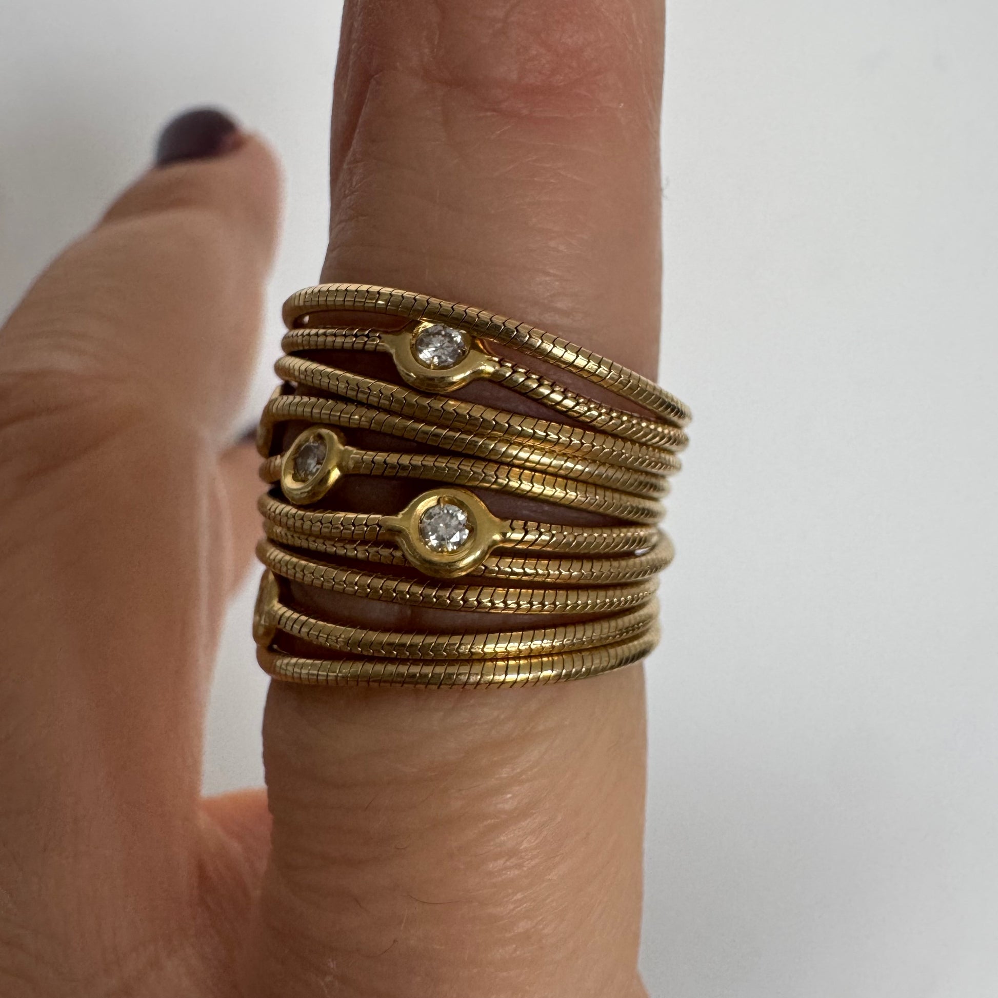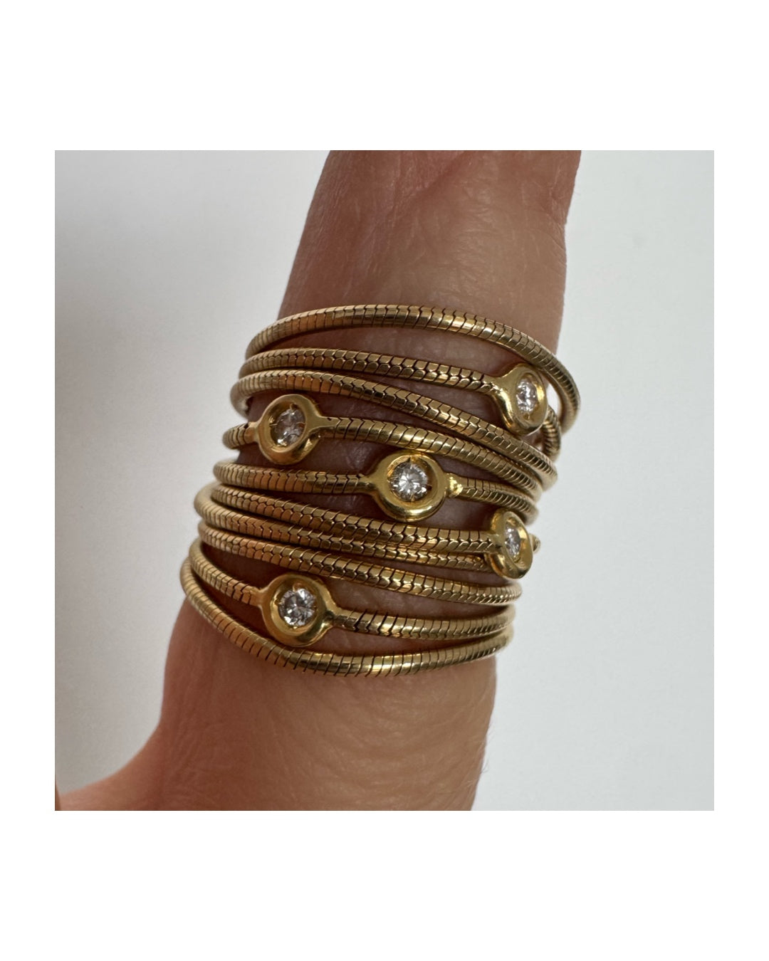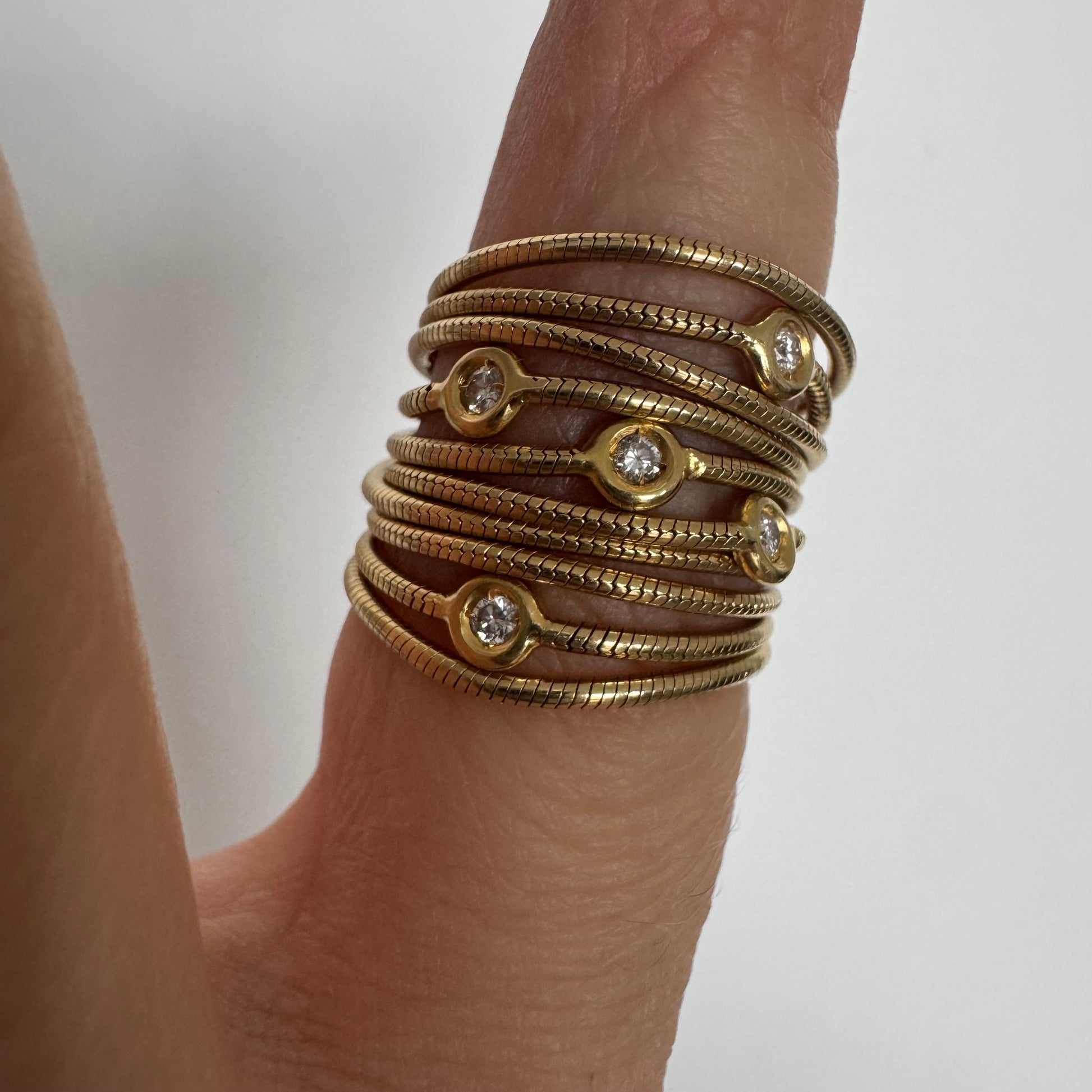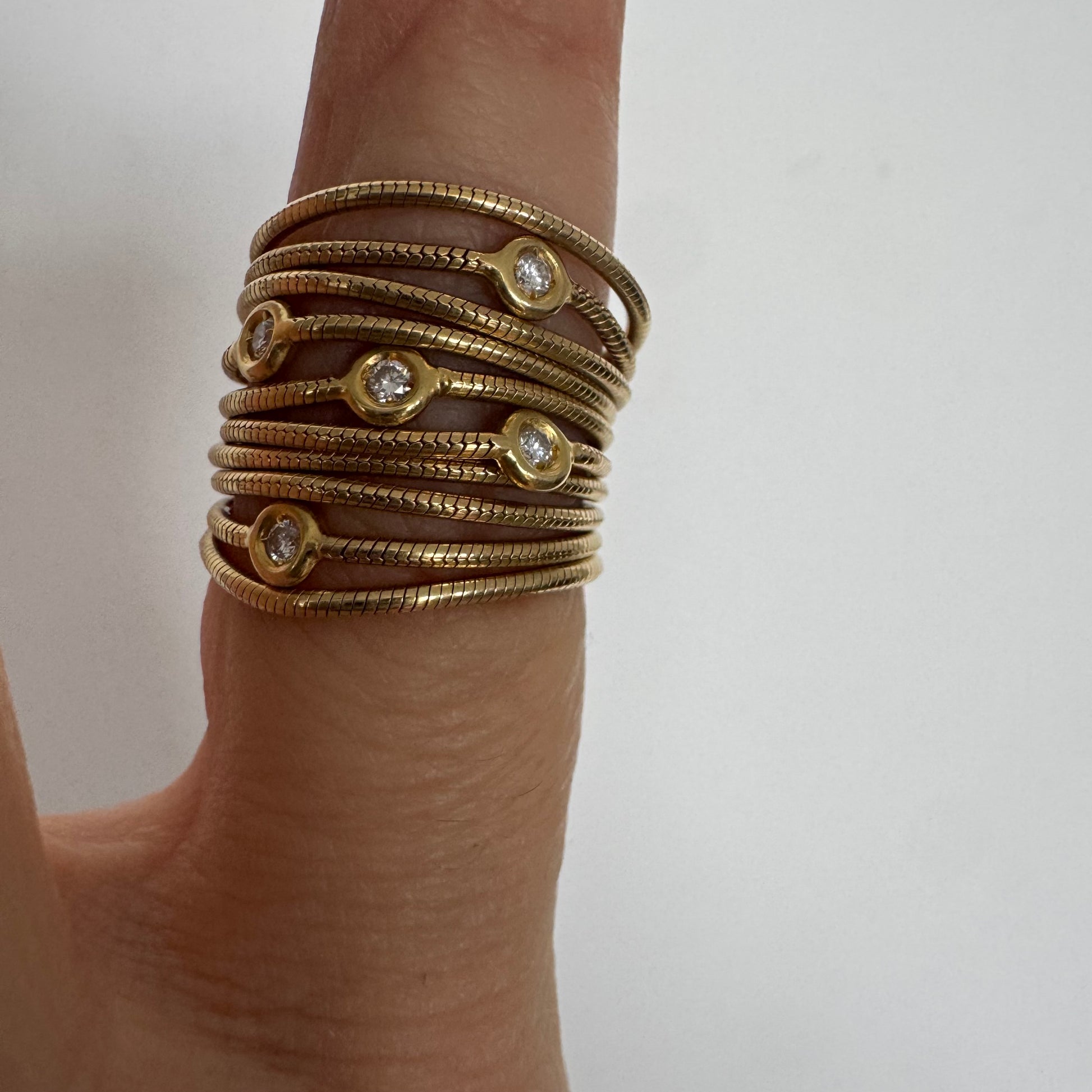 טבעת זהב צהוב 18 קראט של המותג H. Stern משובצת יהלומים בעיצוב רב־ליפופים אלגנטי היוצר מראה עוטף ודינמי על האצבע. לאורך הטבעת משובצים יהלומים עגולים בשיבוץ כוס (bezel setting), המעניק מראה נקי, מודרני ובטוח לענידה יומיומית.