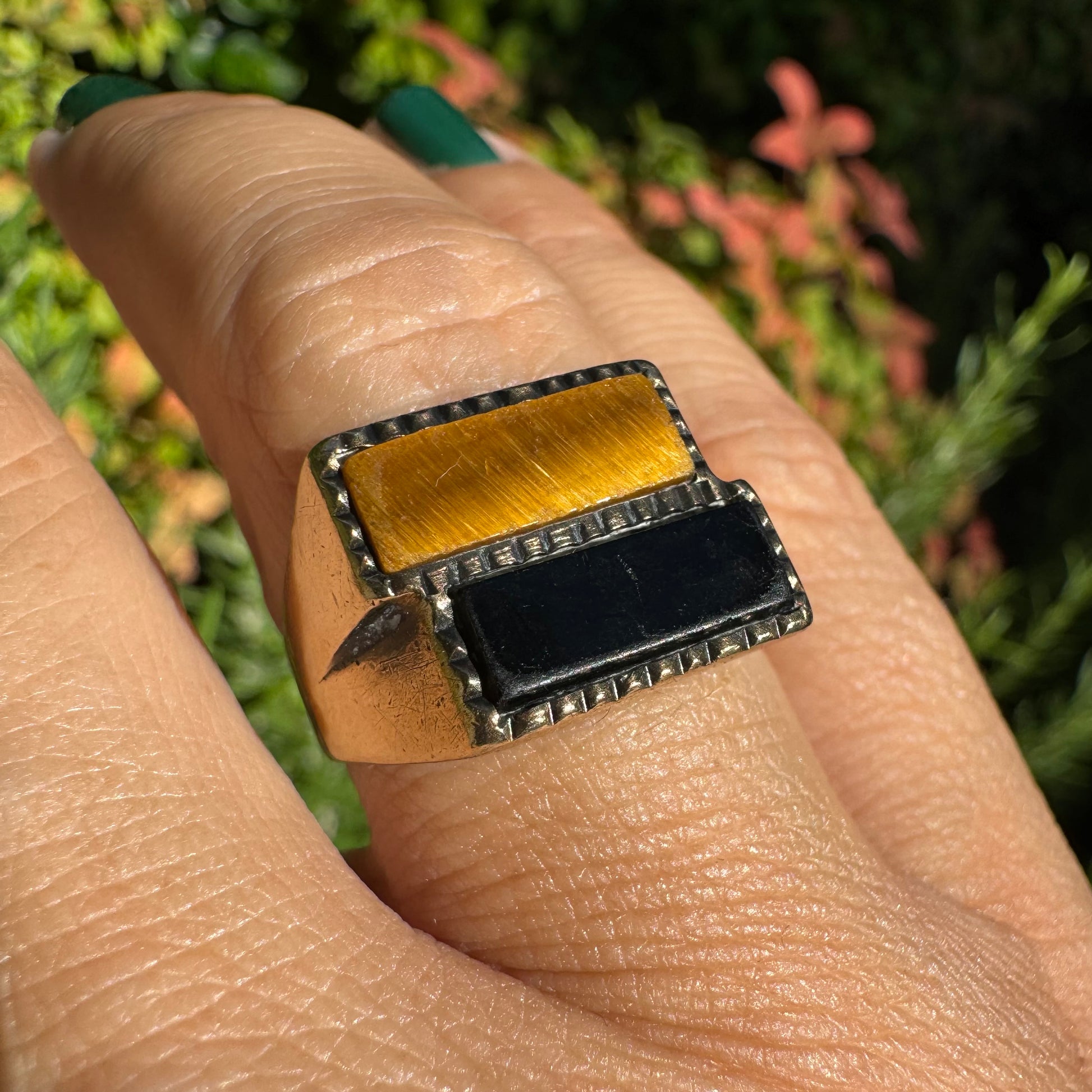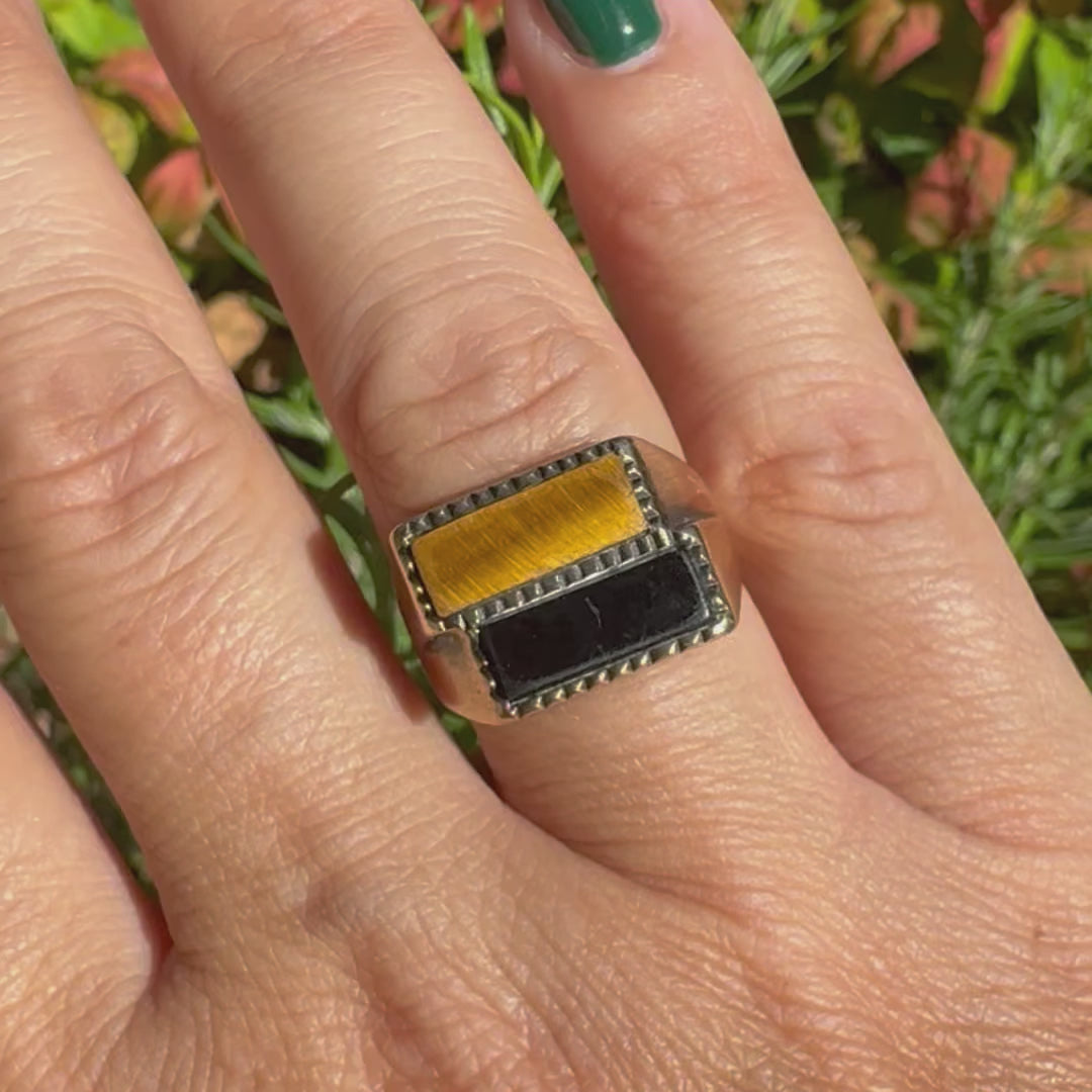 טבעת זהב צהוב 9 קראט משובצת אבן אוניקס בצבע שחור ואבן ״עין הנמר״