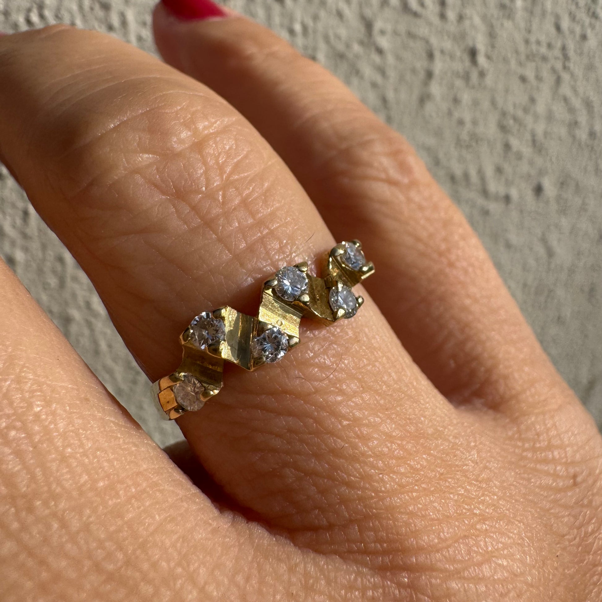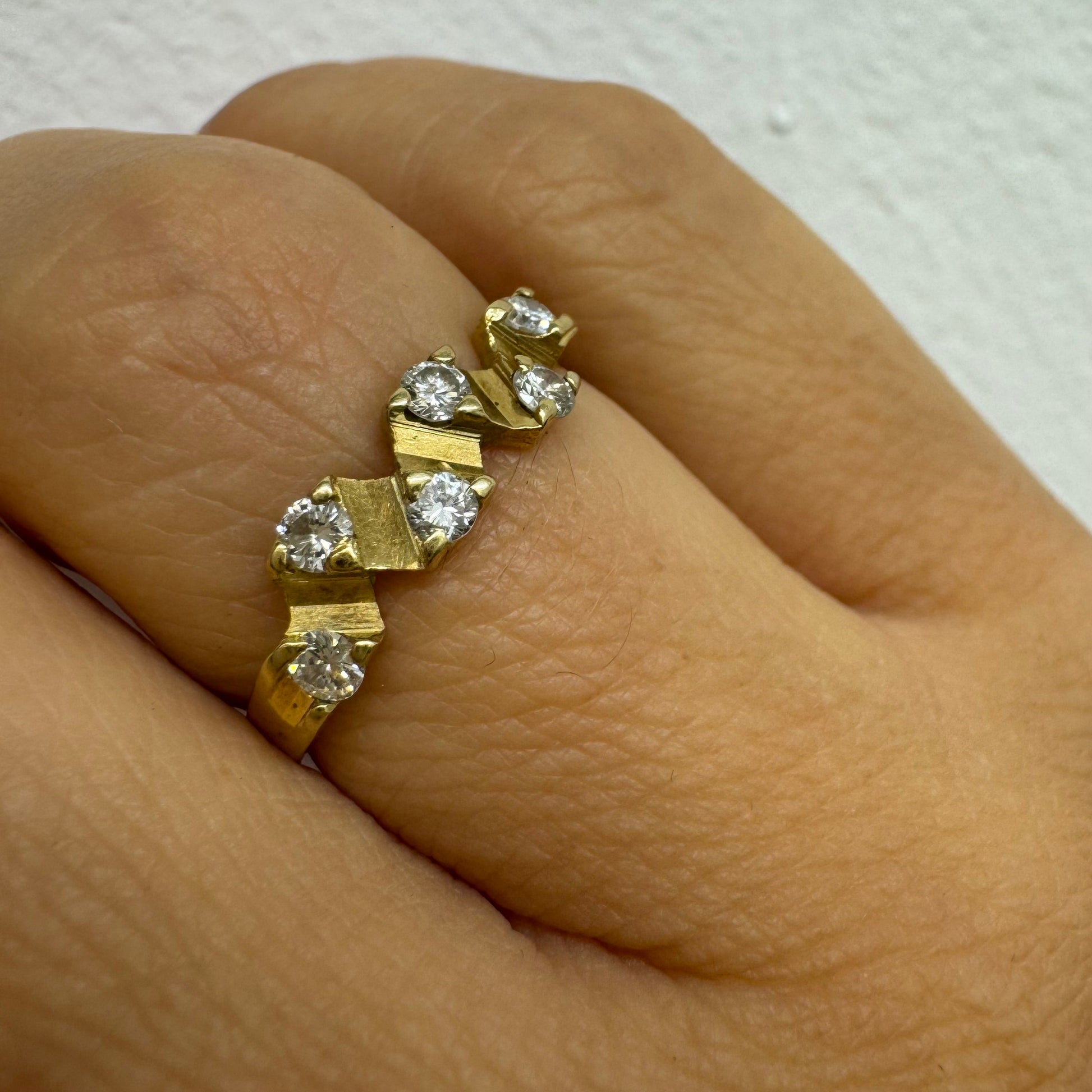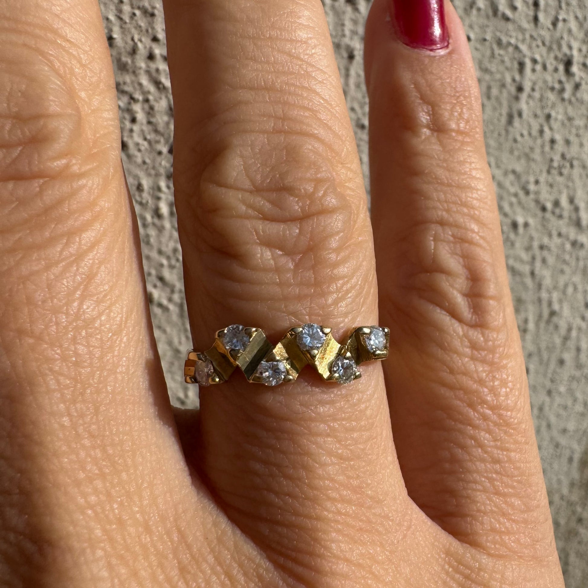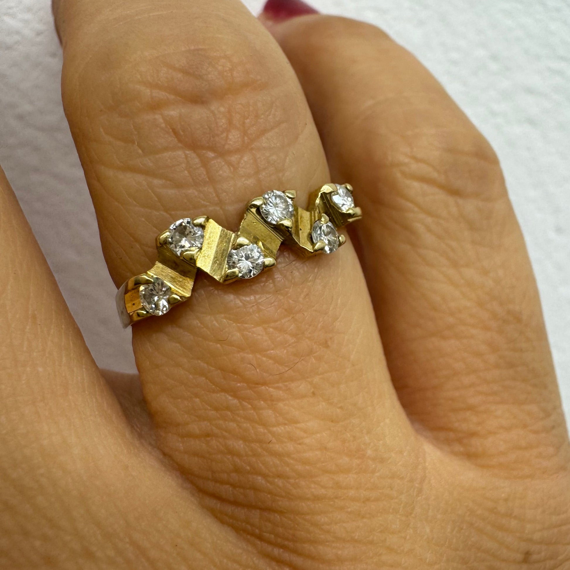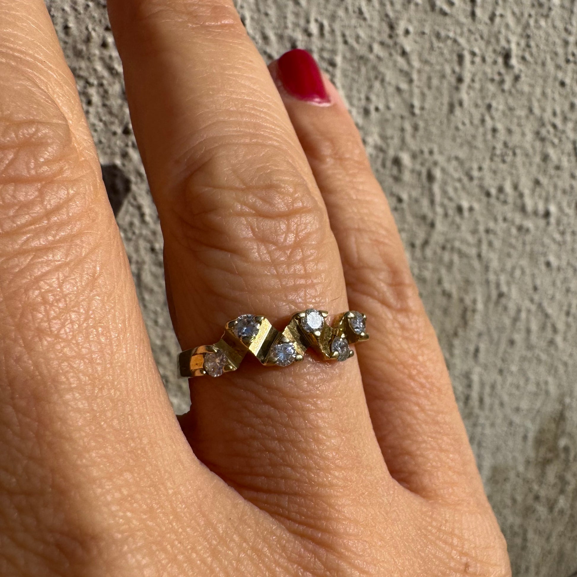 טבעת זהב 14 קראט בעיצוב זיגזג, משובצת יהלומים נוצצים. תכשיט וינטג’ עדין עם טאץ’ גאומטרי ייחודי.