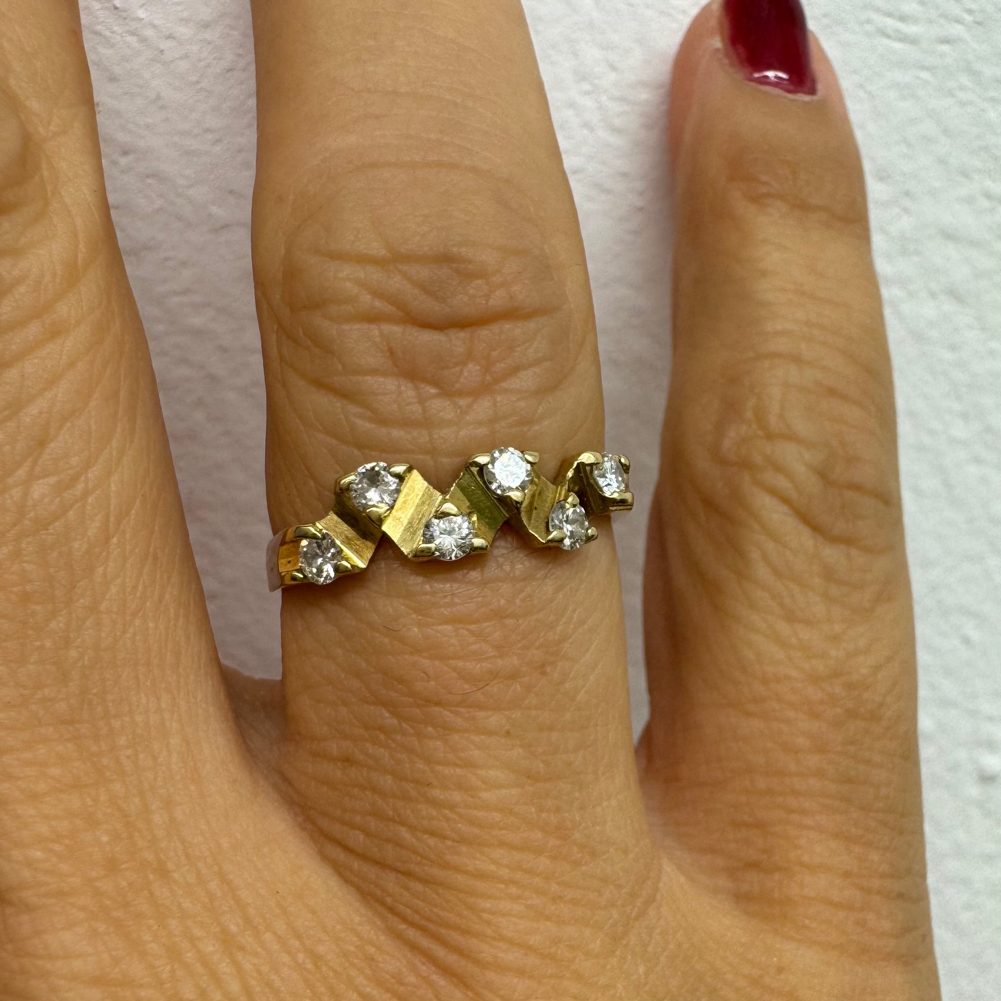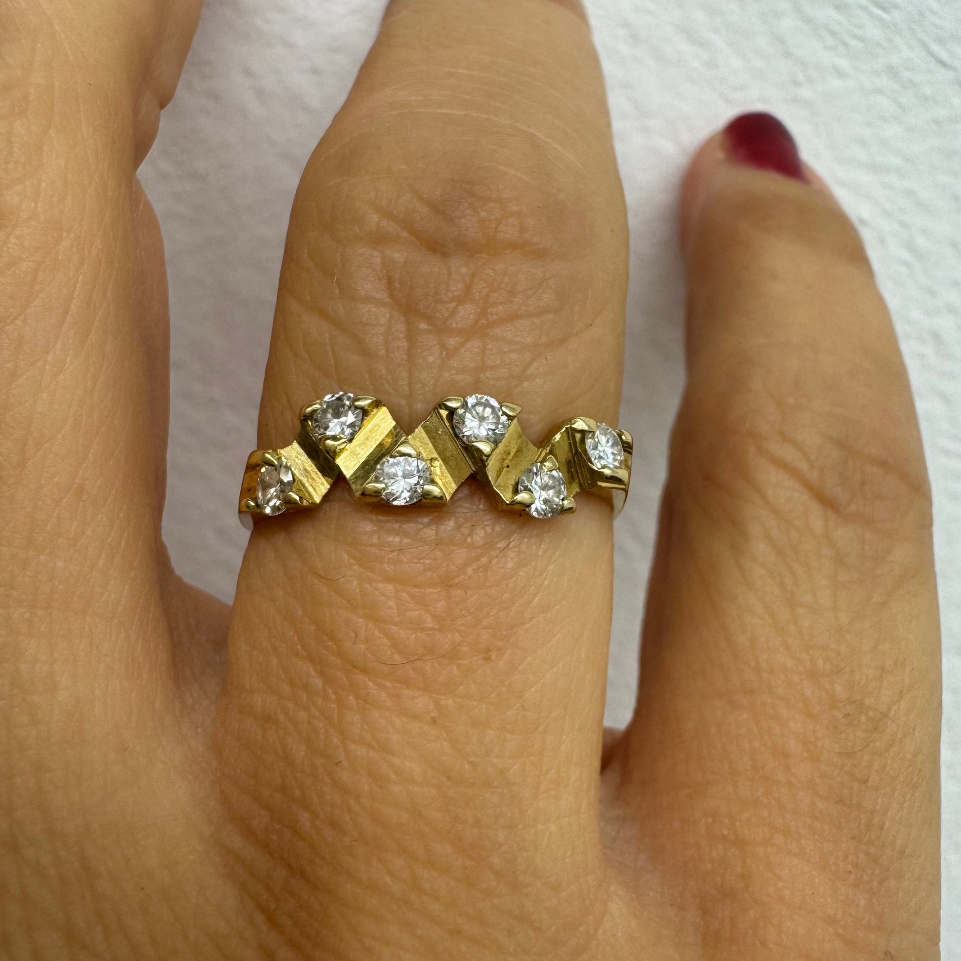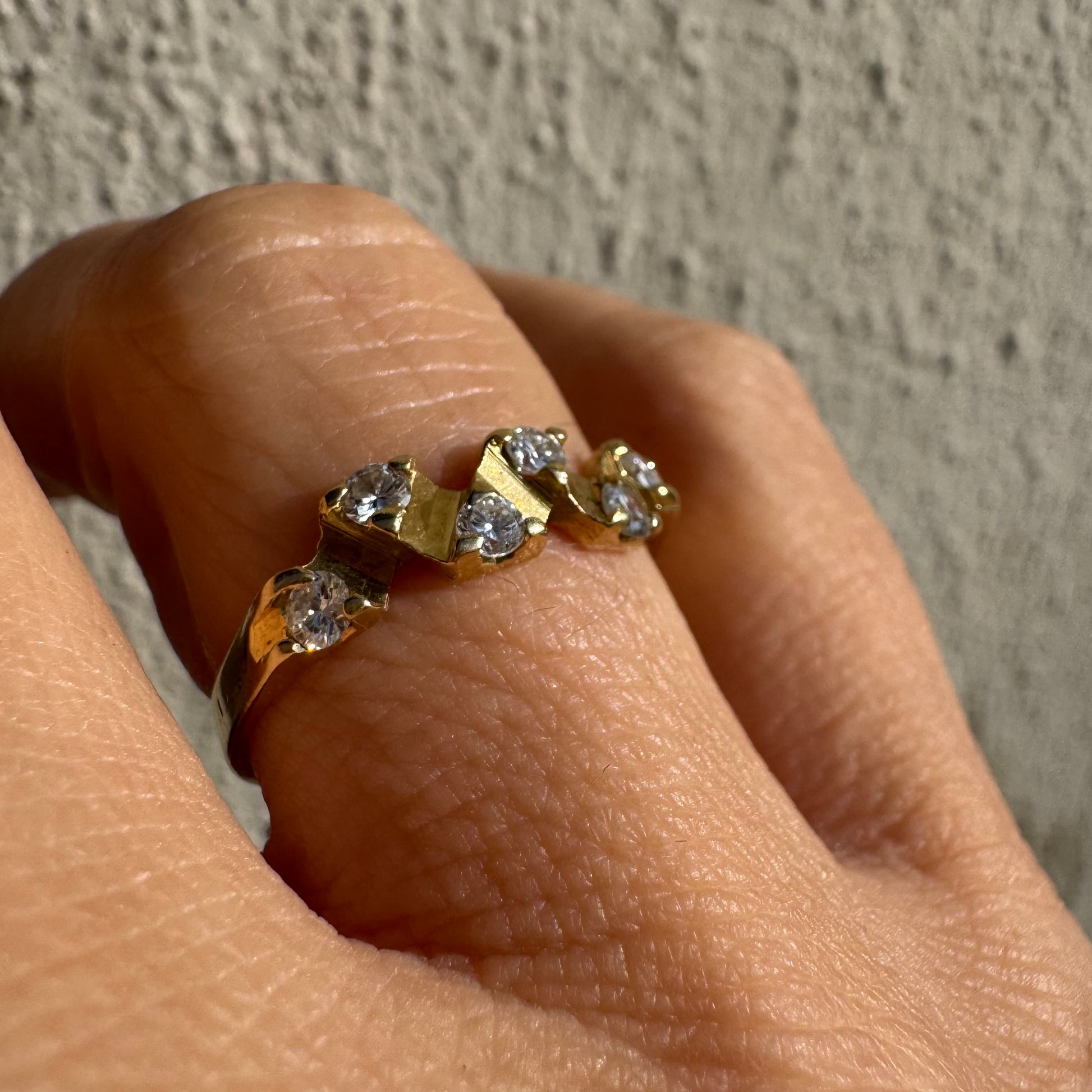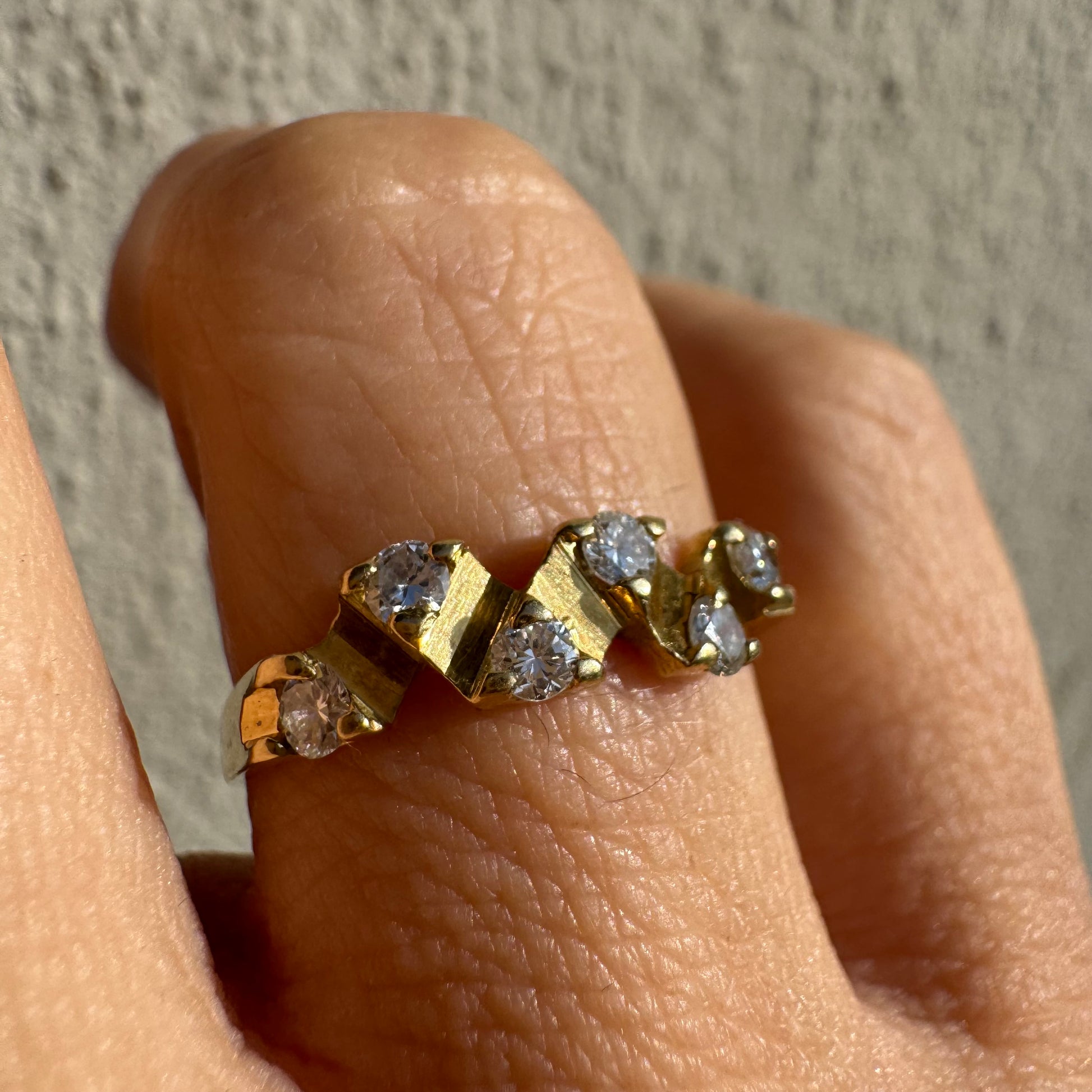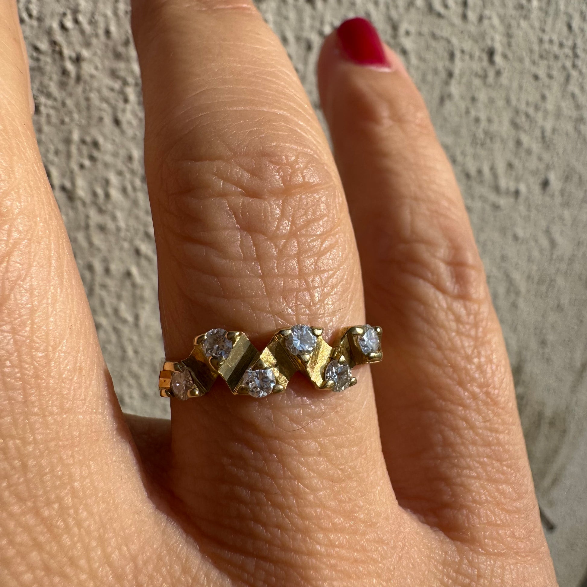 טבעת זהב 14 קראט בעיצוב זיגזג, משובצת יהלומים נוצצים. תכשיט וינטג’ עדין עם טאץ’ גאומטרי ייחודי.