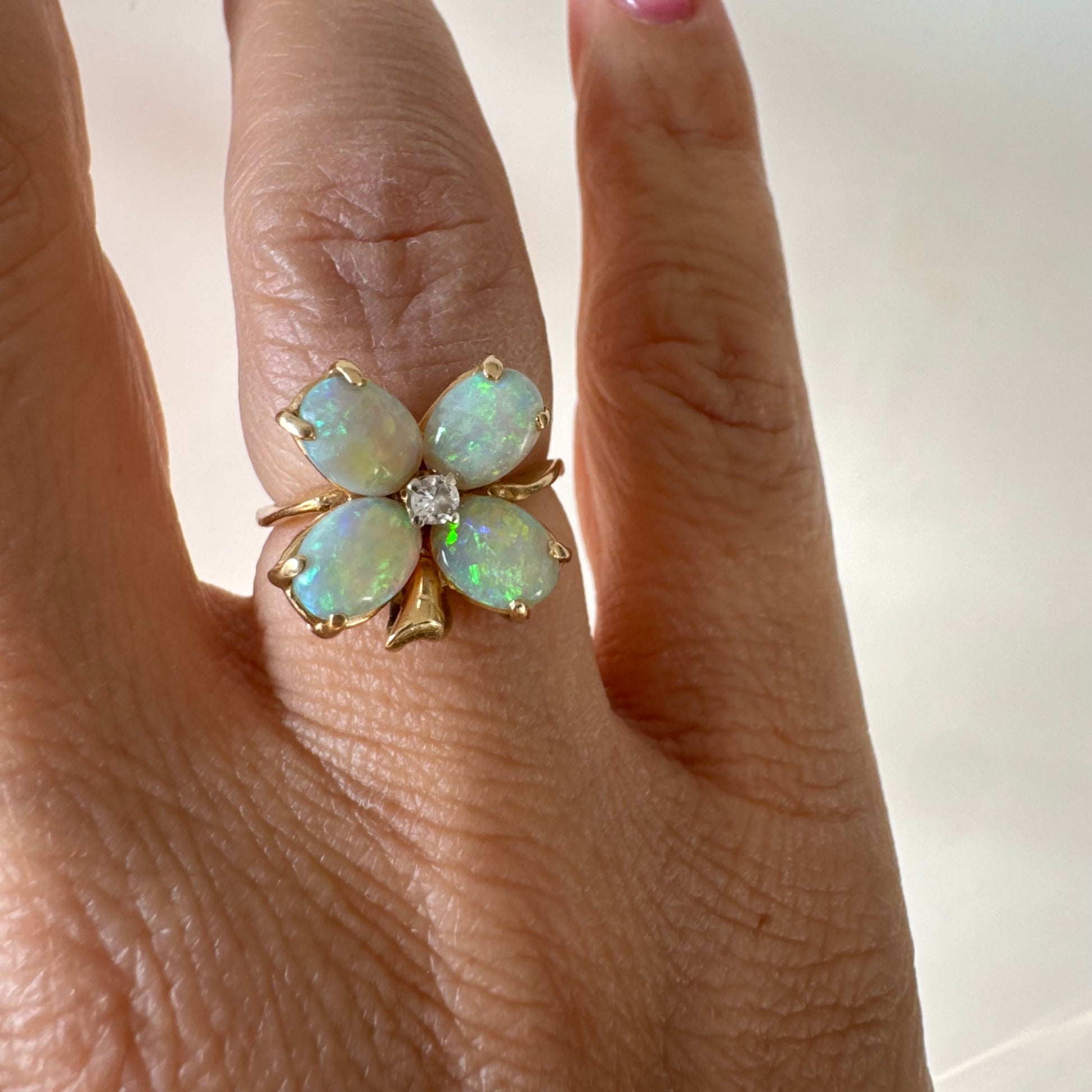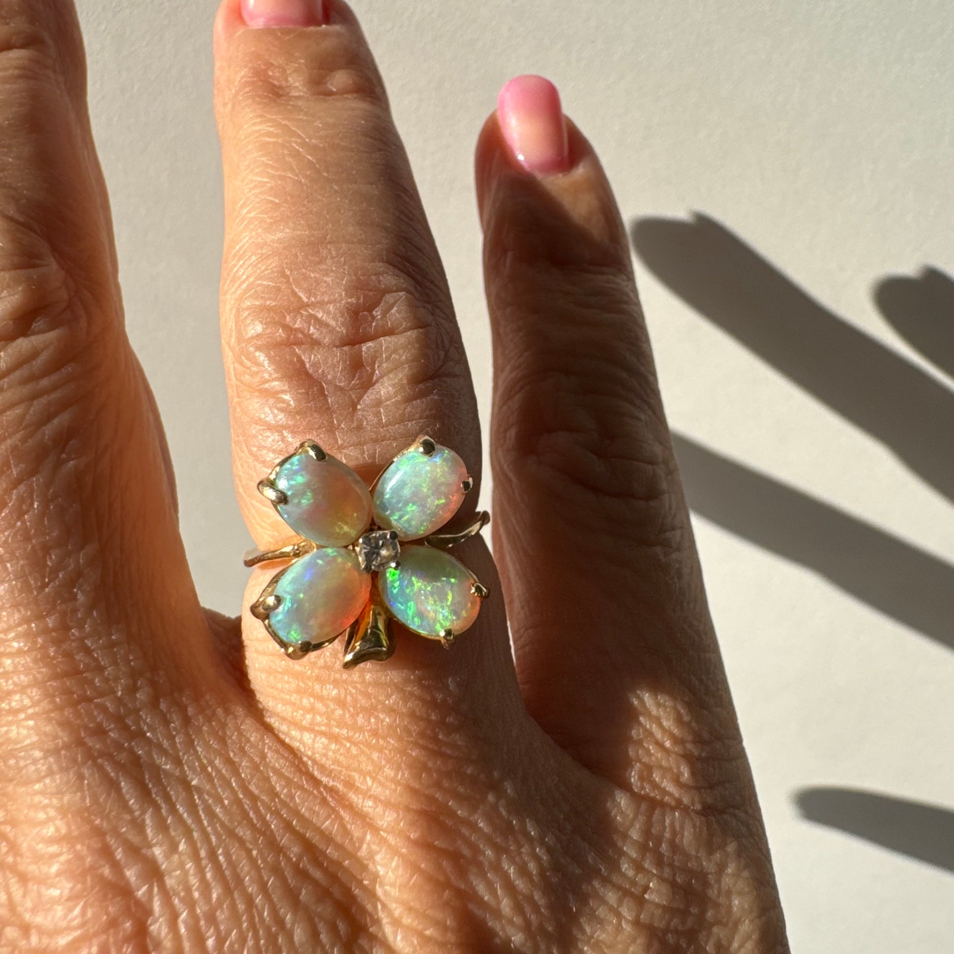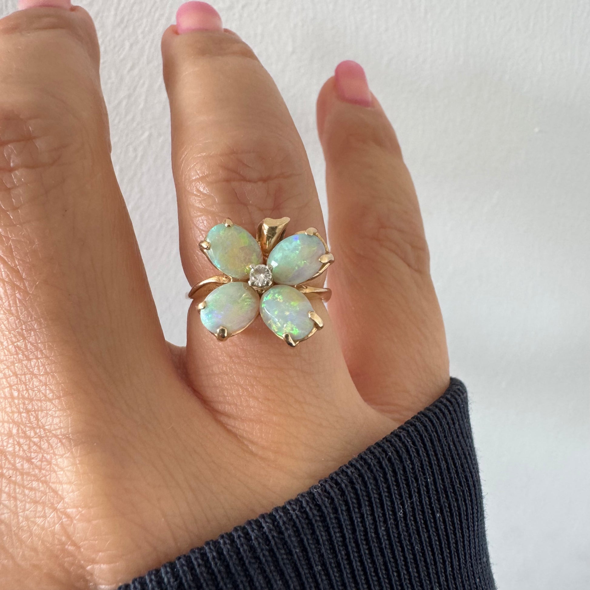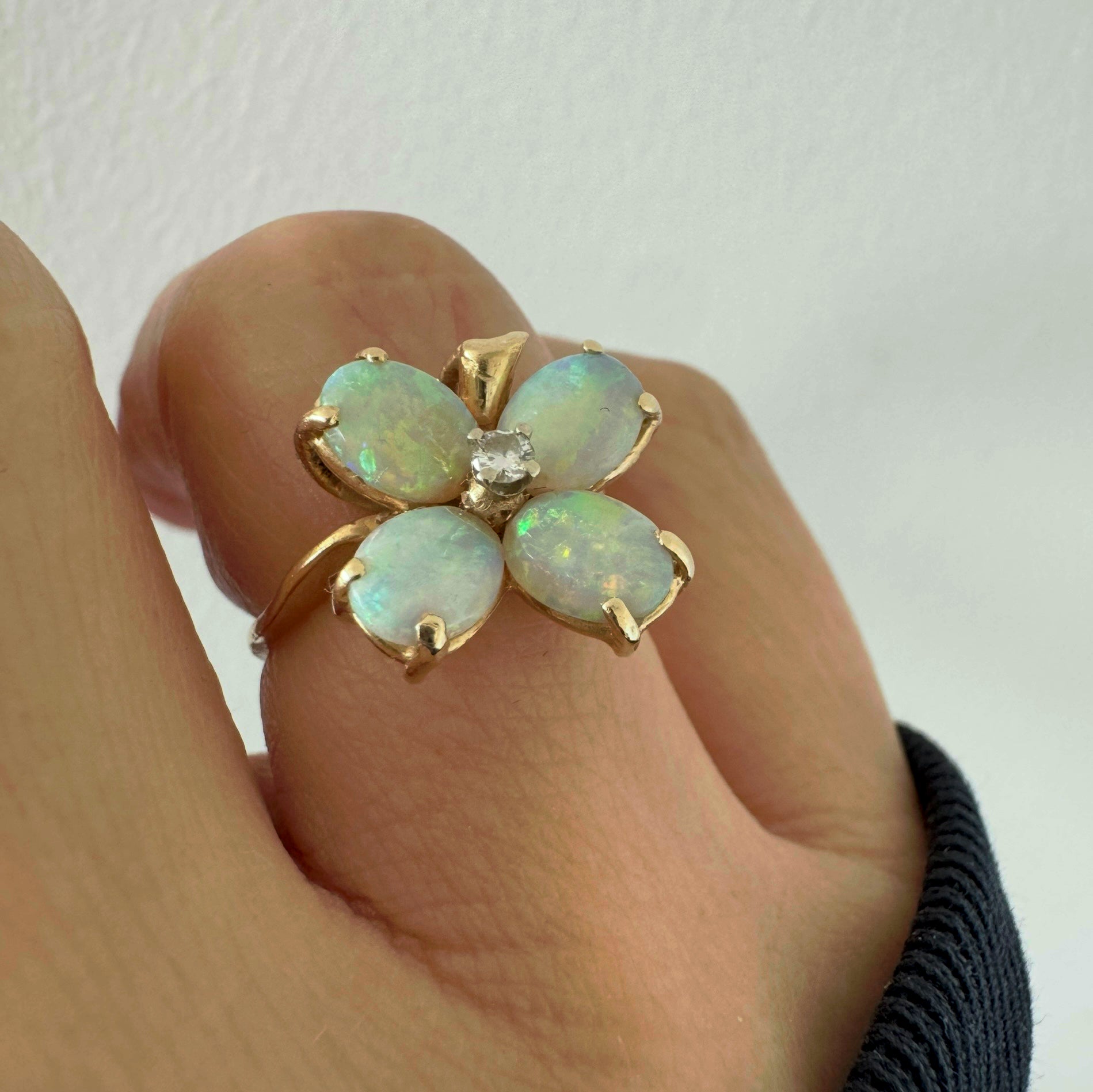 טבעת זהב 14 קראט בעיצוב פרח, משובצת ארבע אבני אופל בחיתוך טיפה ובמרכז יהלום טבעי.