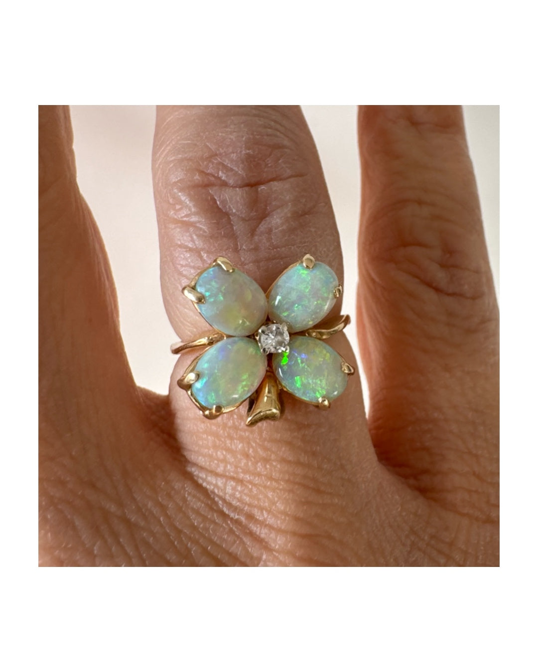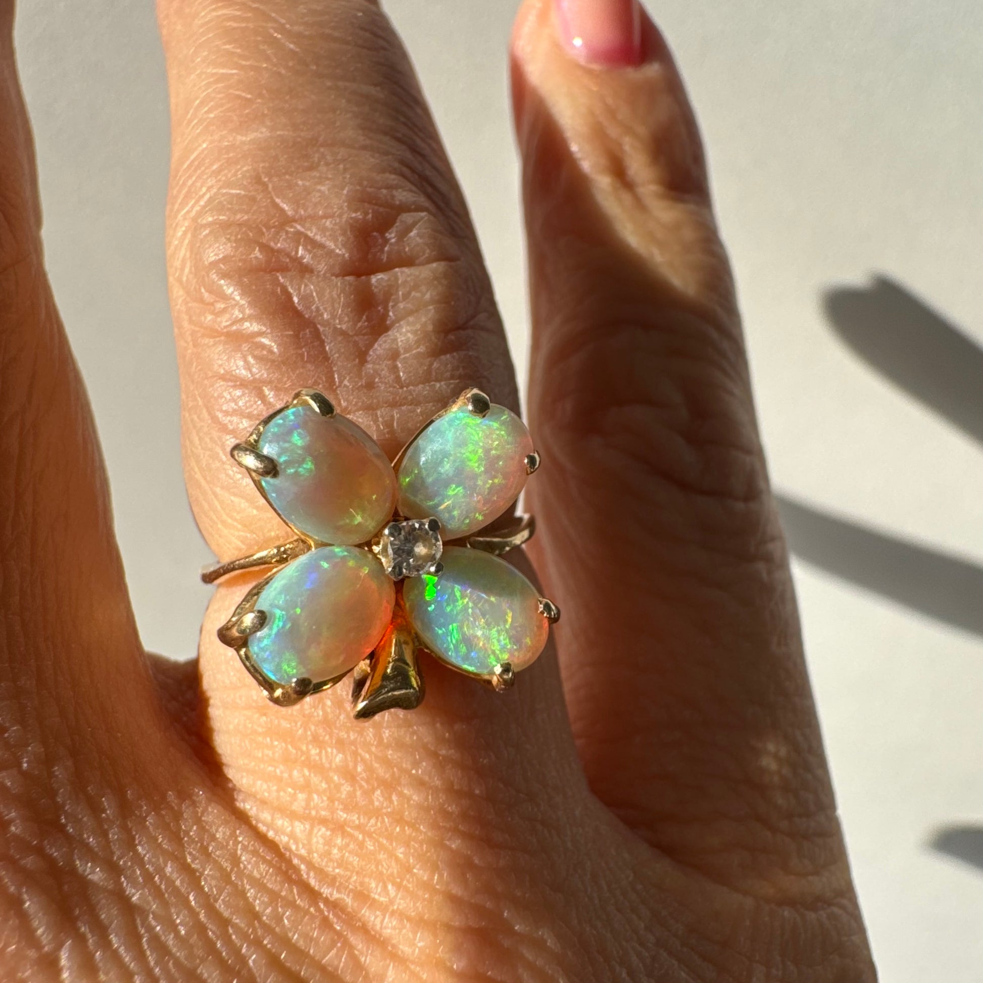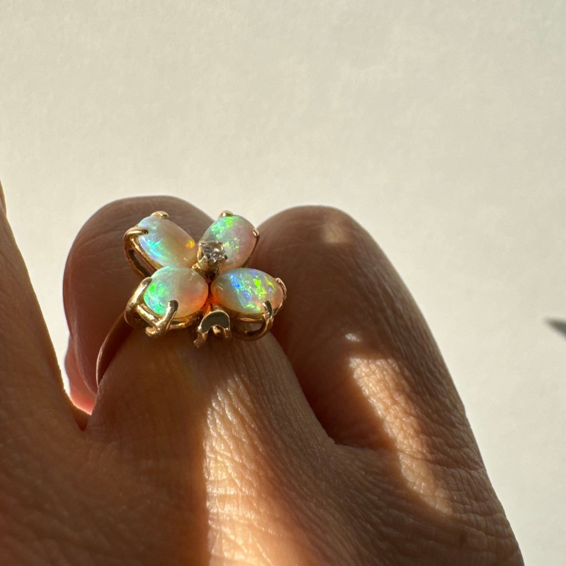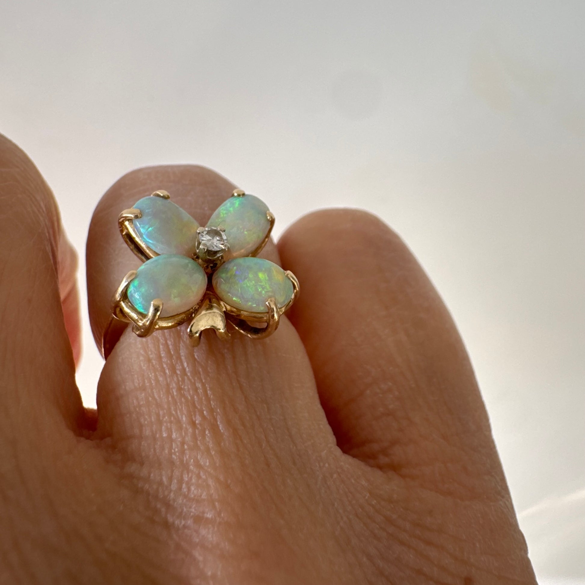 טבעת זהב 14 קראט בעיצוב פרח, משובצת ארבע אבני אופל בחיתוך טיפה ובמרכז יהלום טבעי.
