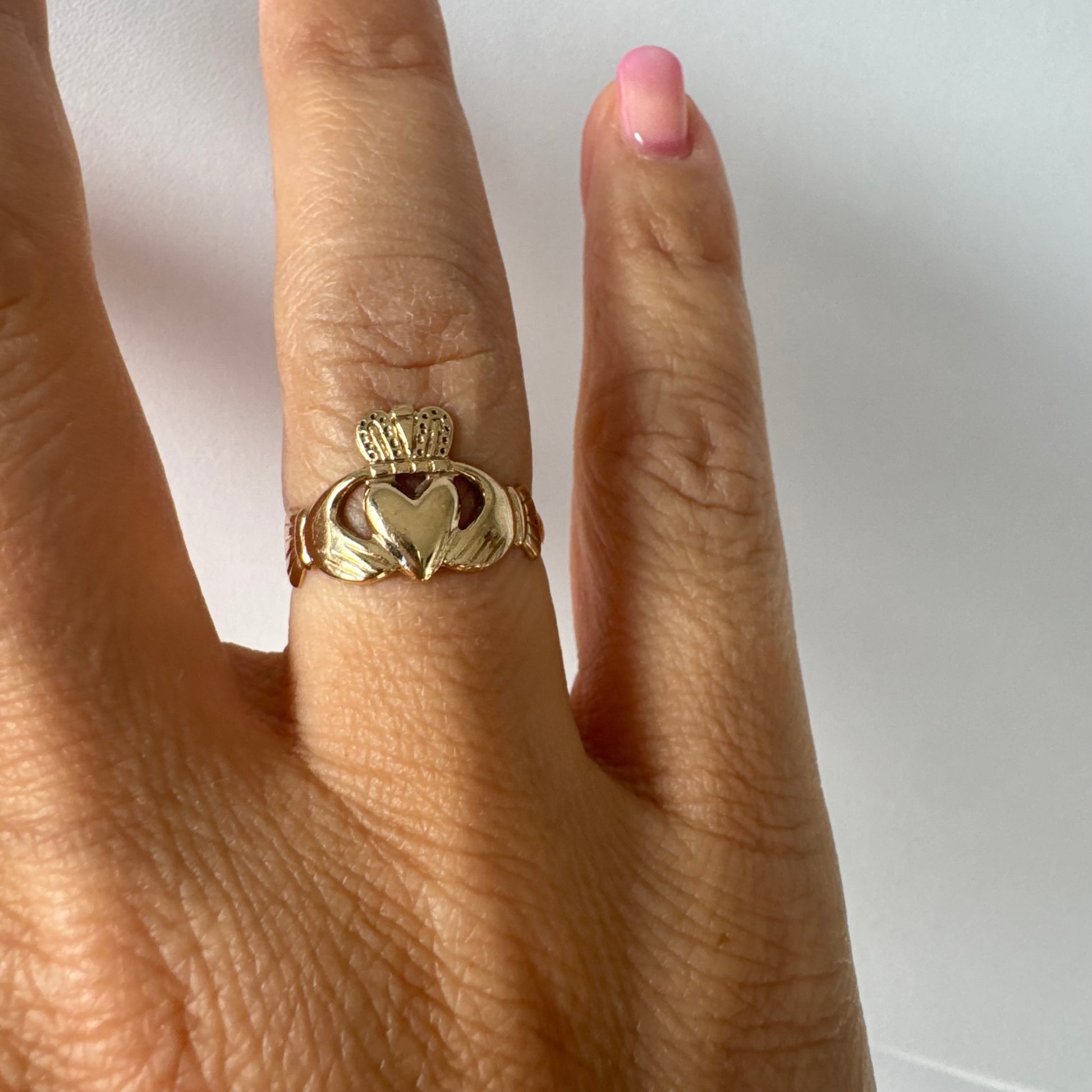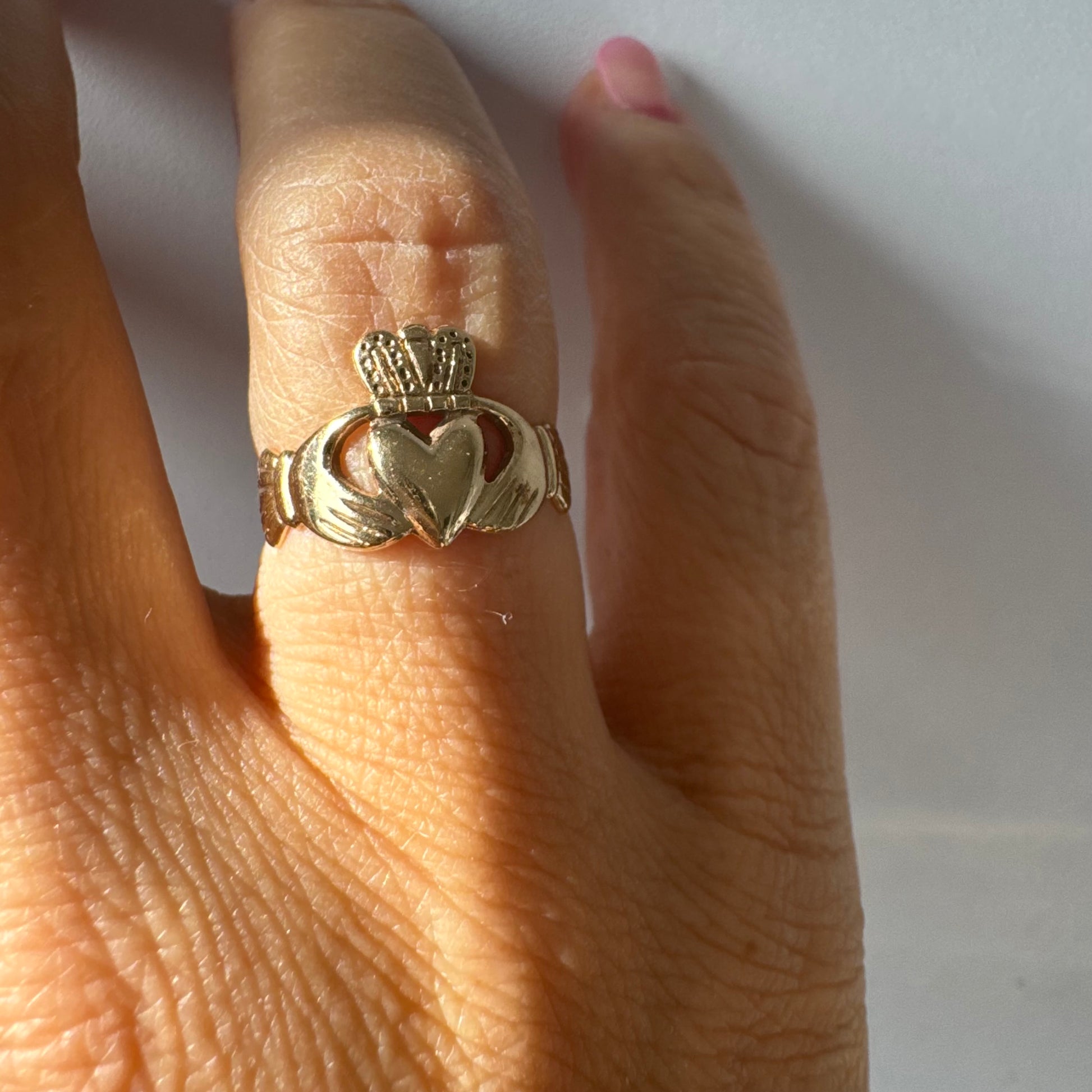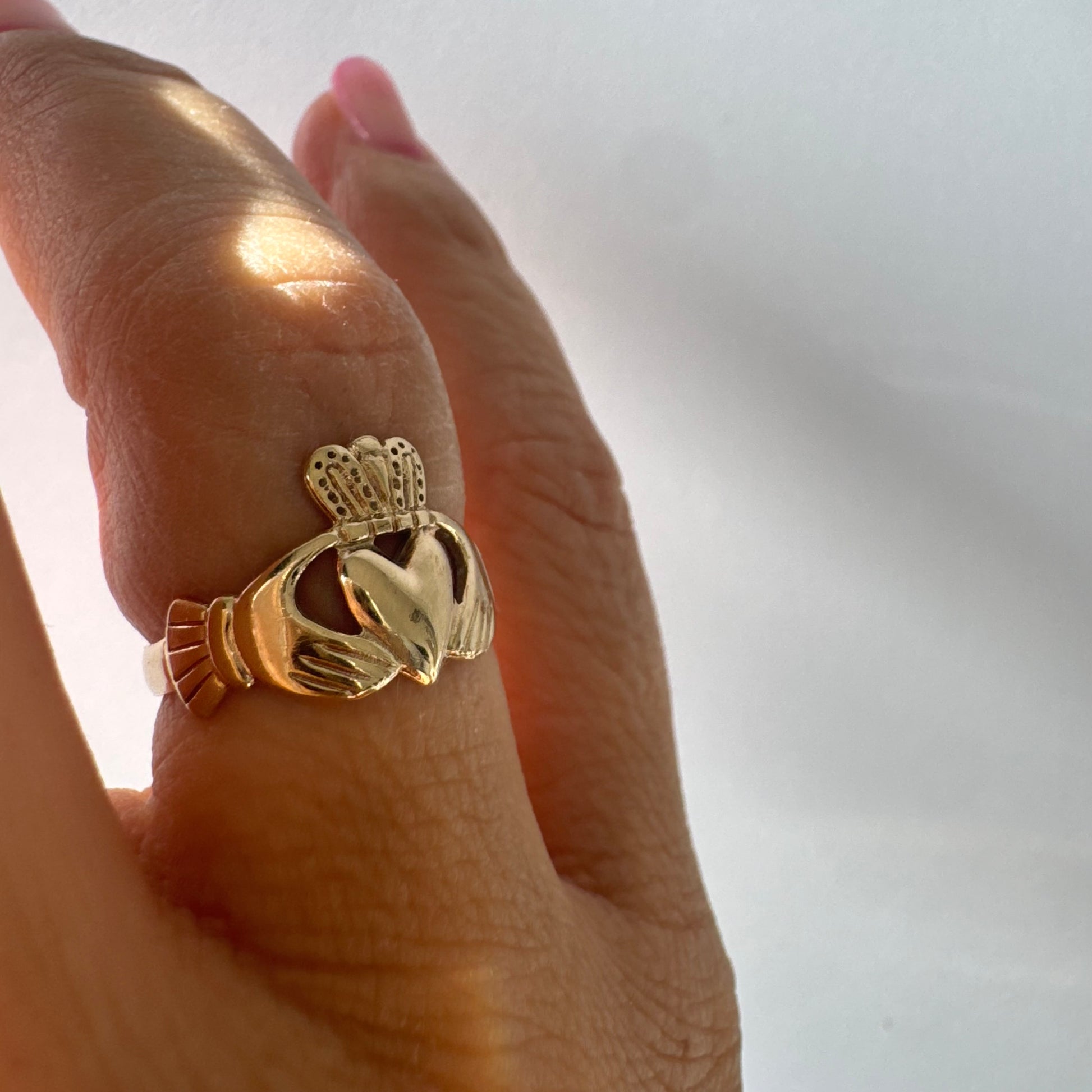 טבעת זהב 9 קראט בעיצוב קלאסי של לב עם כתר מעליו וידיים אוחזות, עיצוב קלדה מסורתי המסמל אהבה, נאמנות וחברות.