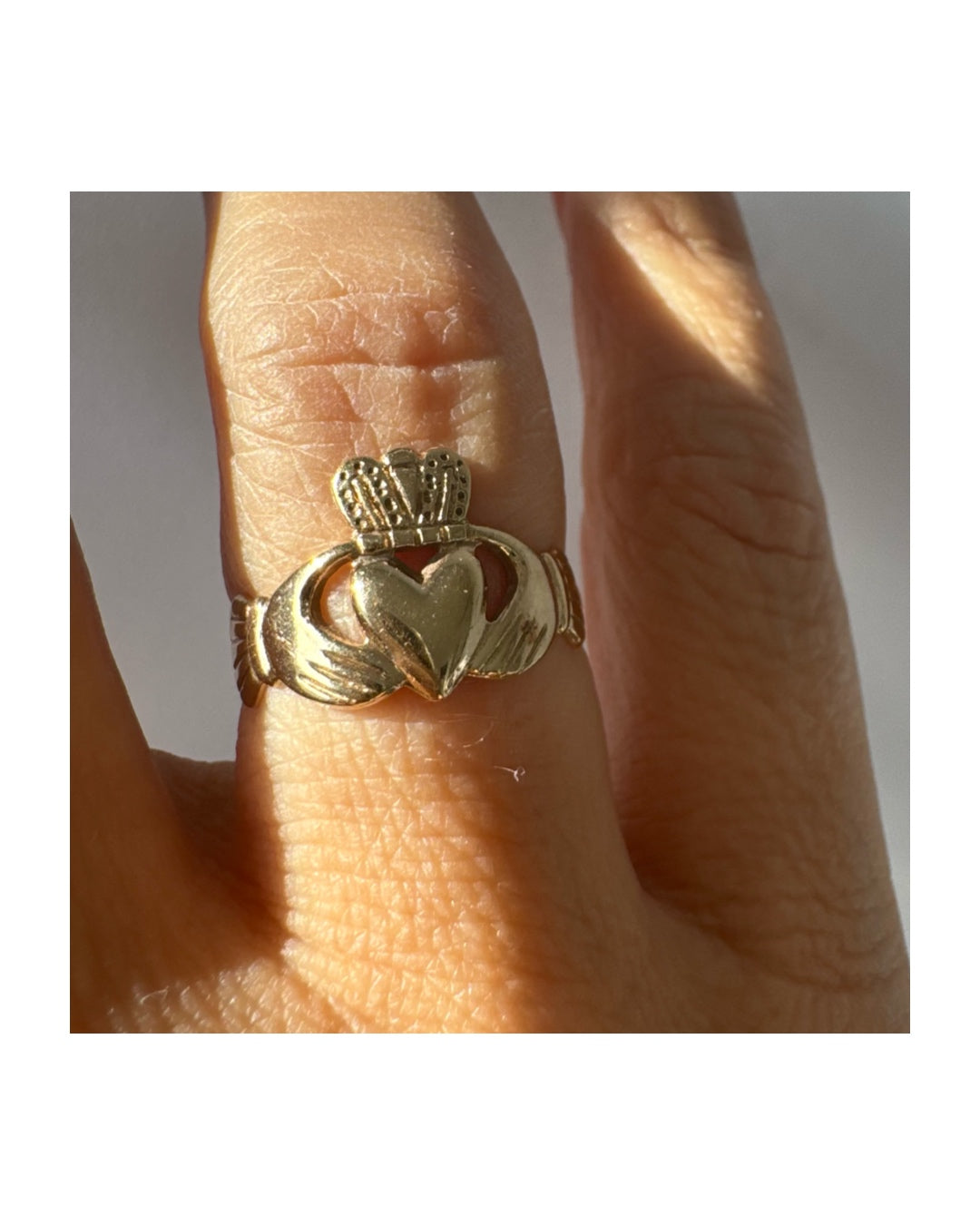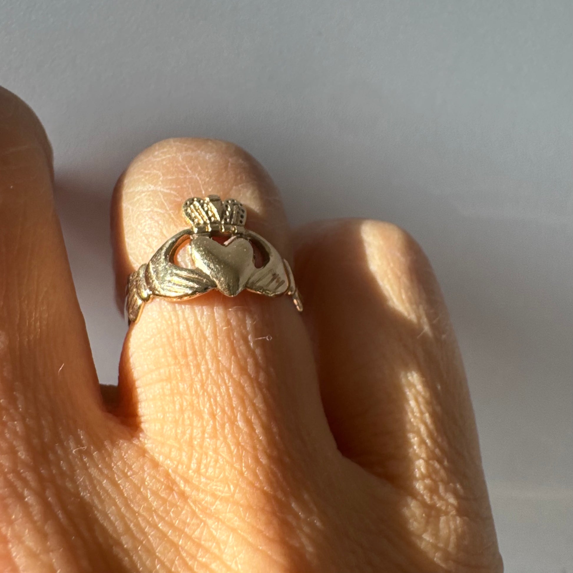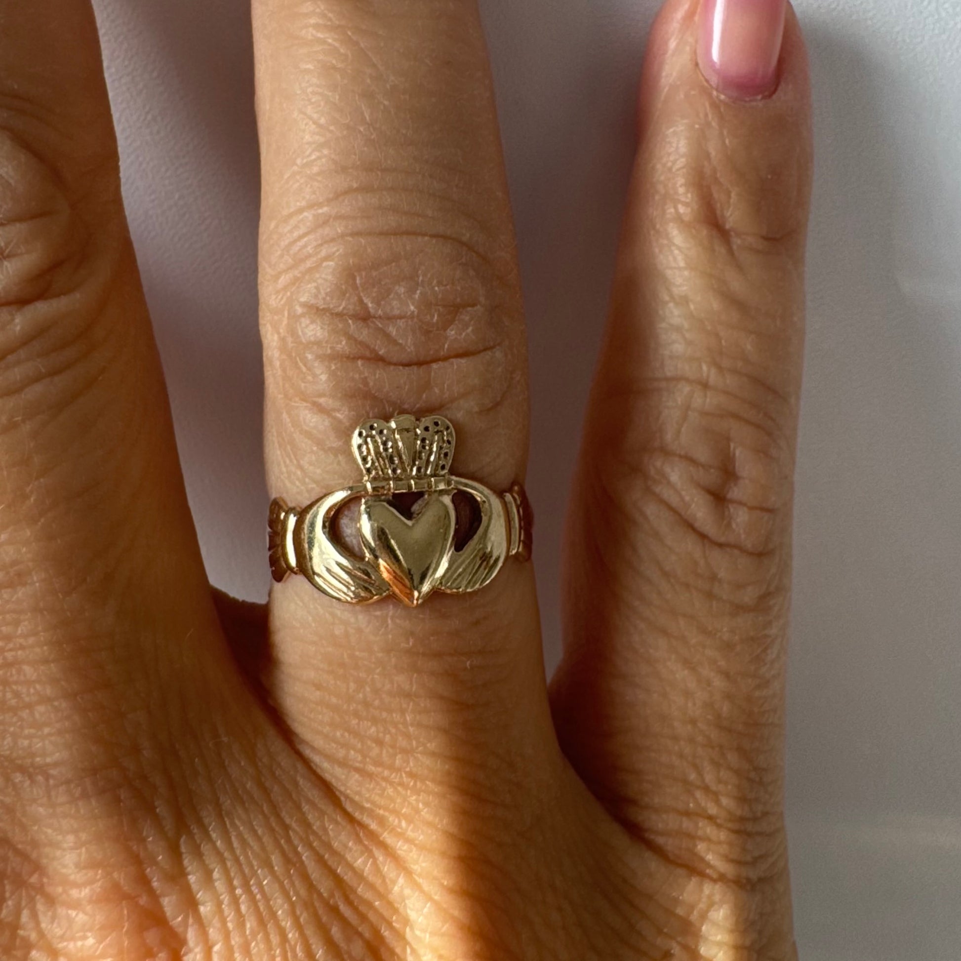 טבעת זהב 9 קראט בעיצוב קלאסי של לב עם כתר מעליו וידיים אוחזות, עיצוב קלדה מסורתי המסמל אהבה, נאמנות וחברות.