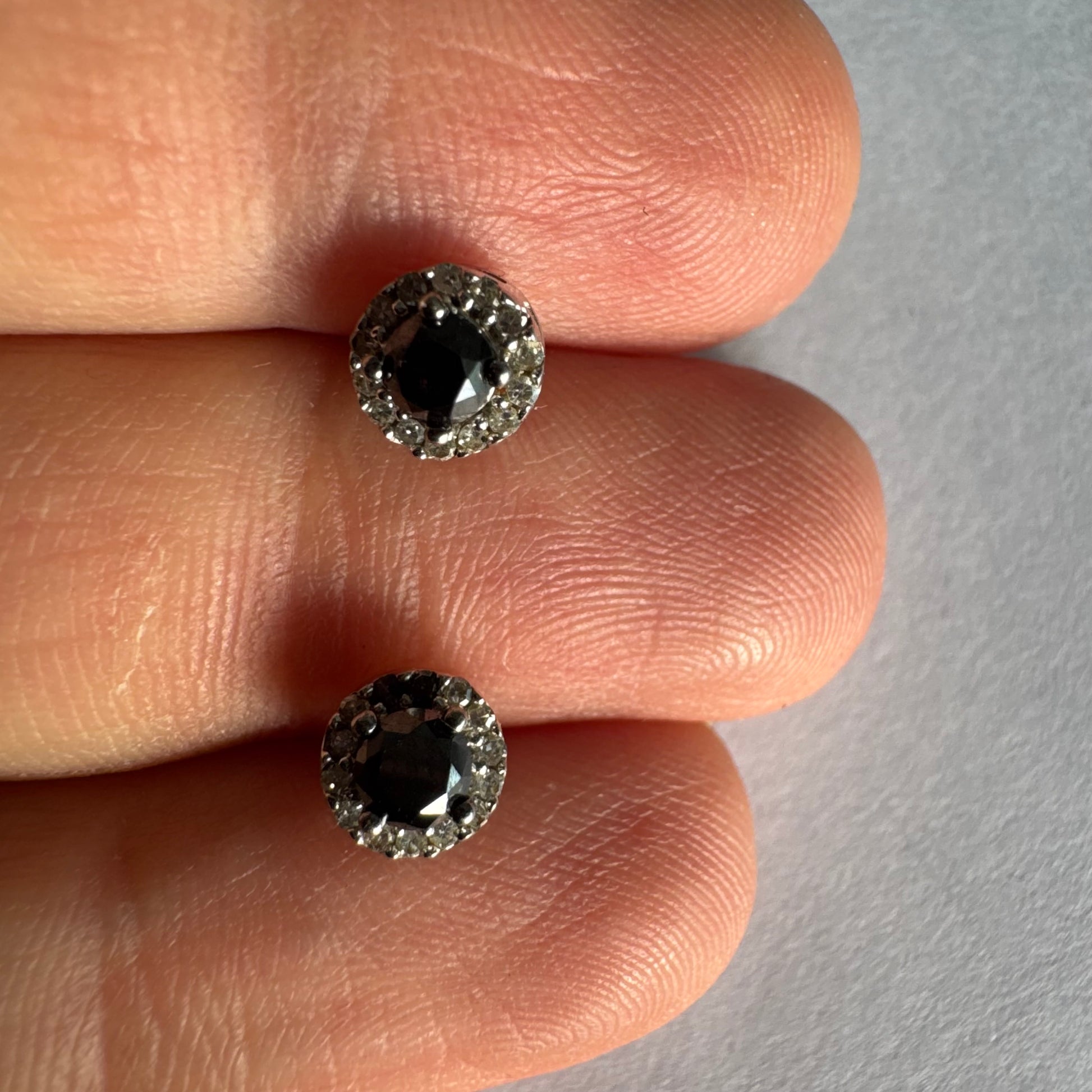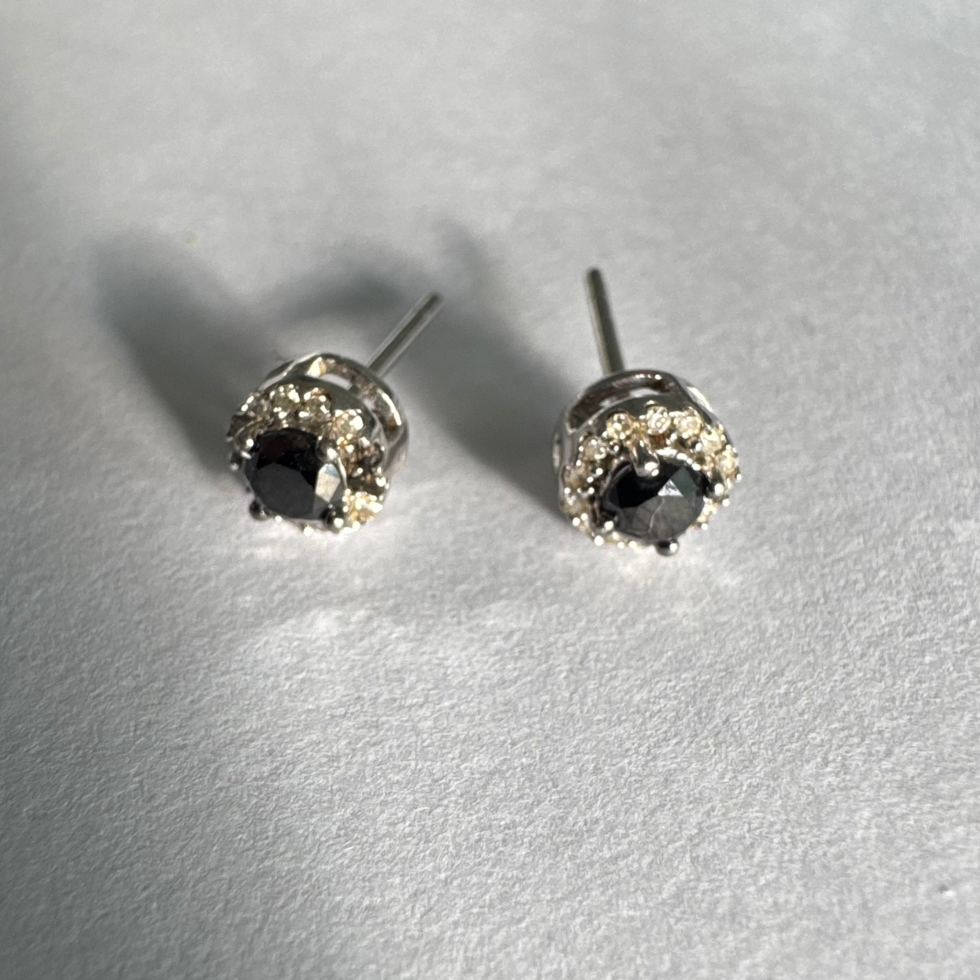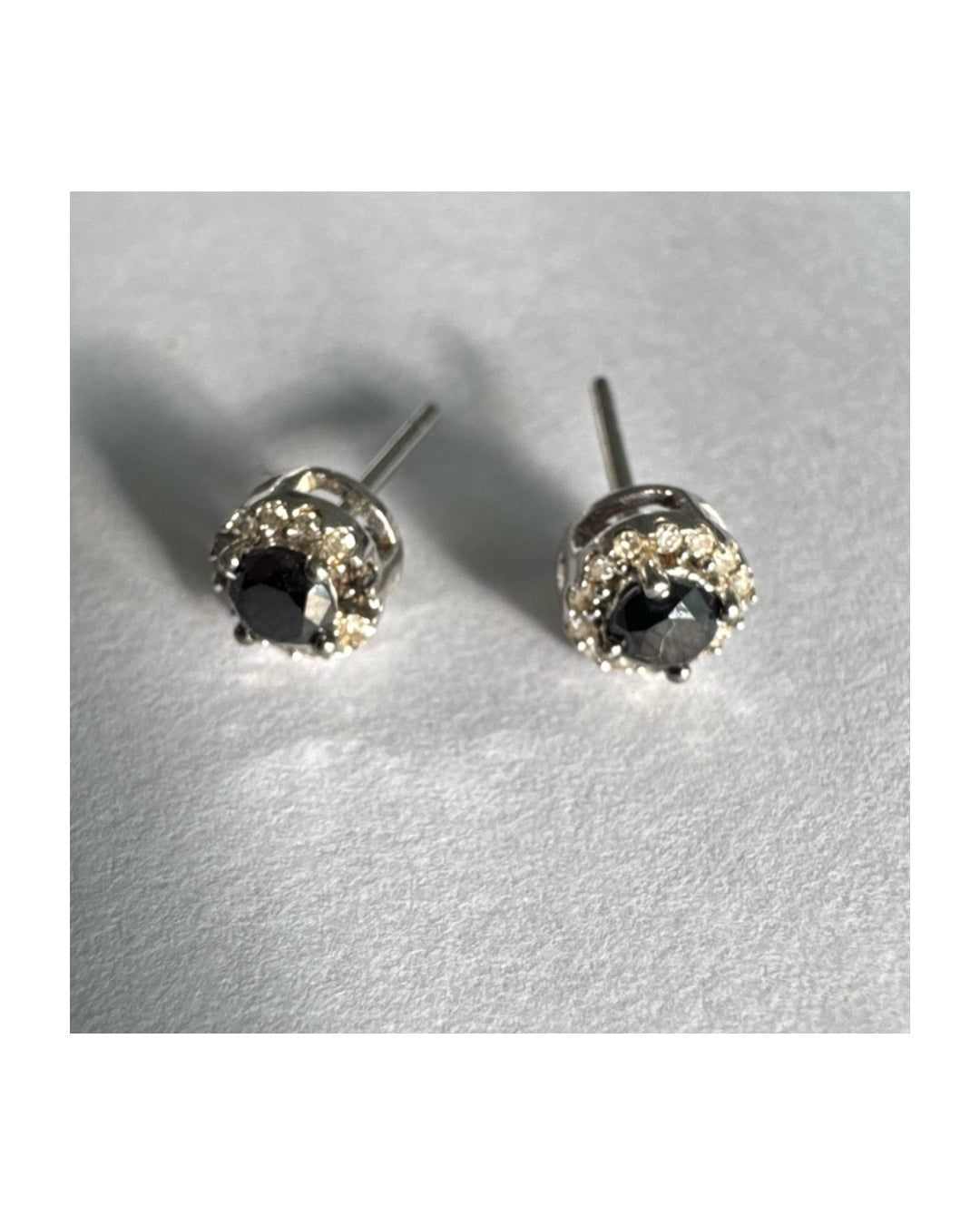 עגילי זהב לבן 10 קראט צמודים לאוזן, משובצים יהלומים שחורים עגולים במרכז ומסביבם הילה של יהלומים לבנים מנצנצים.
