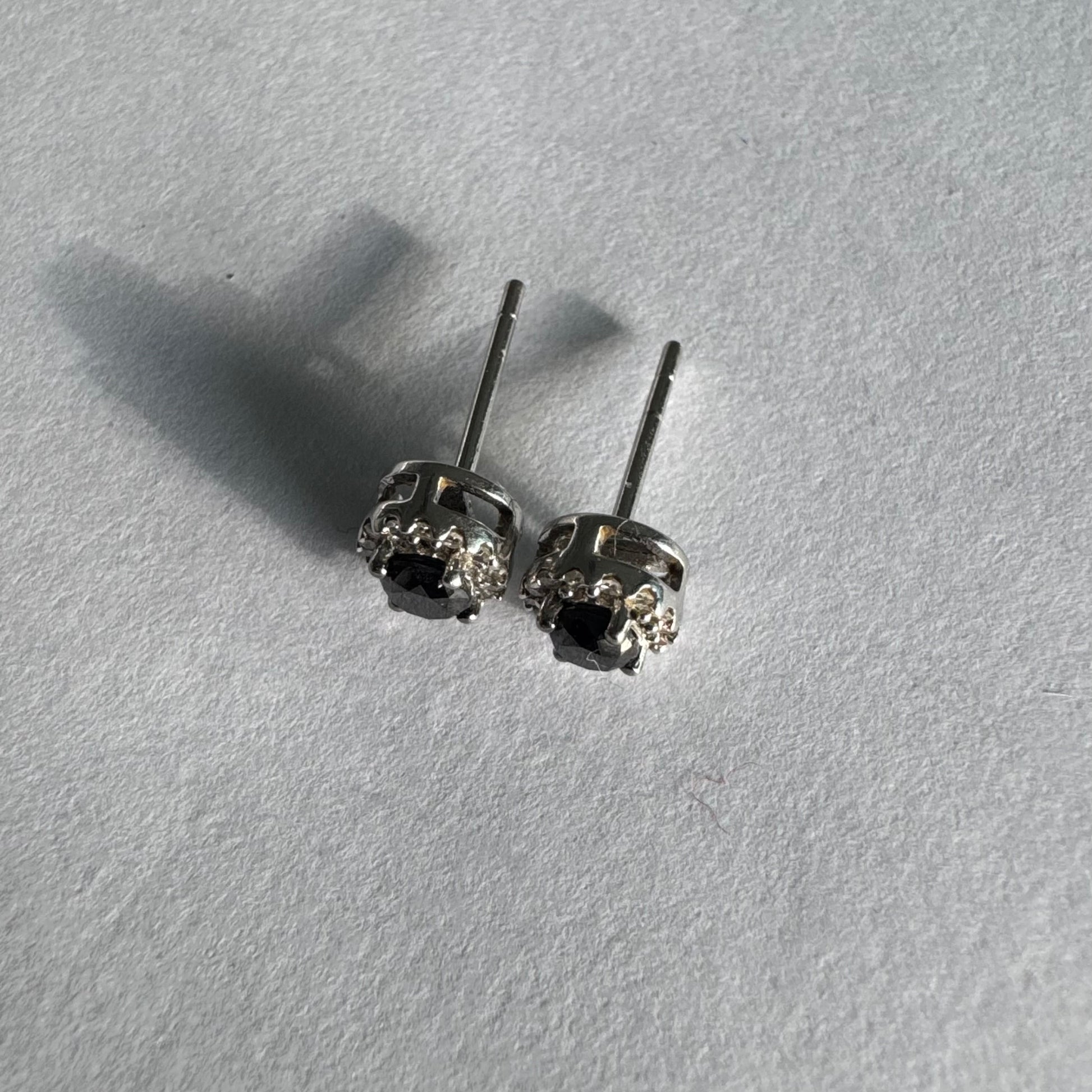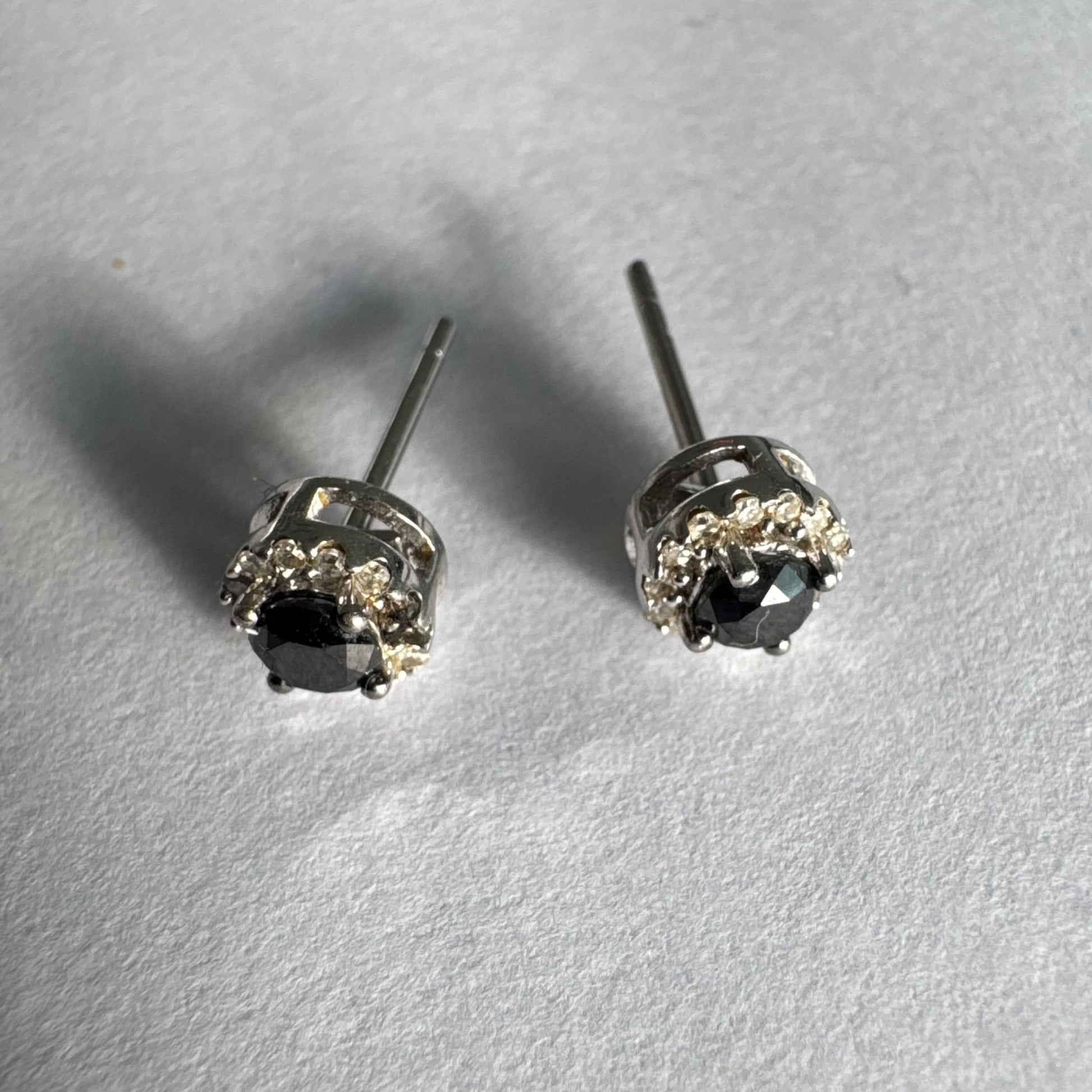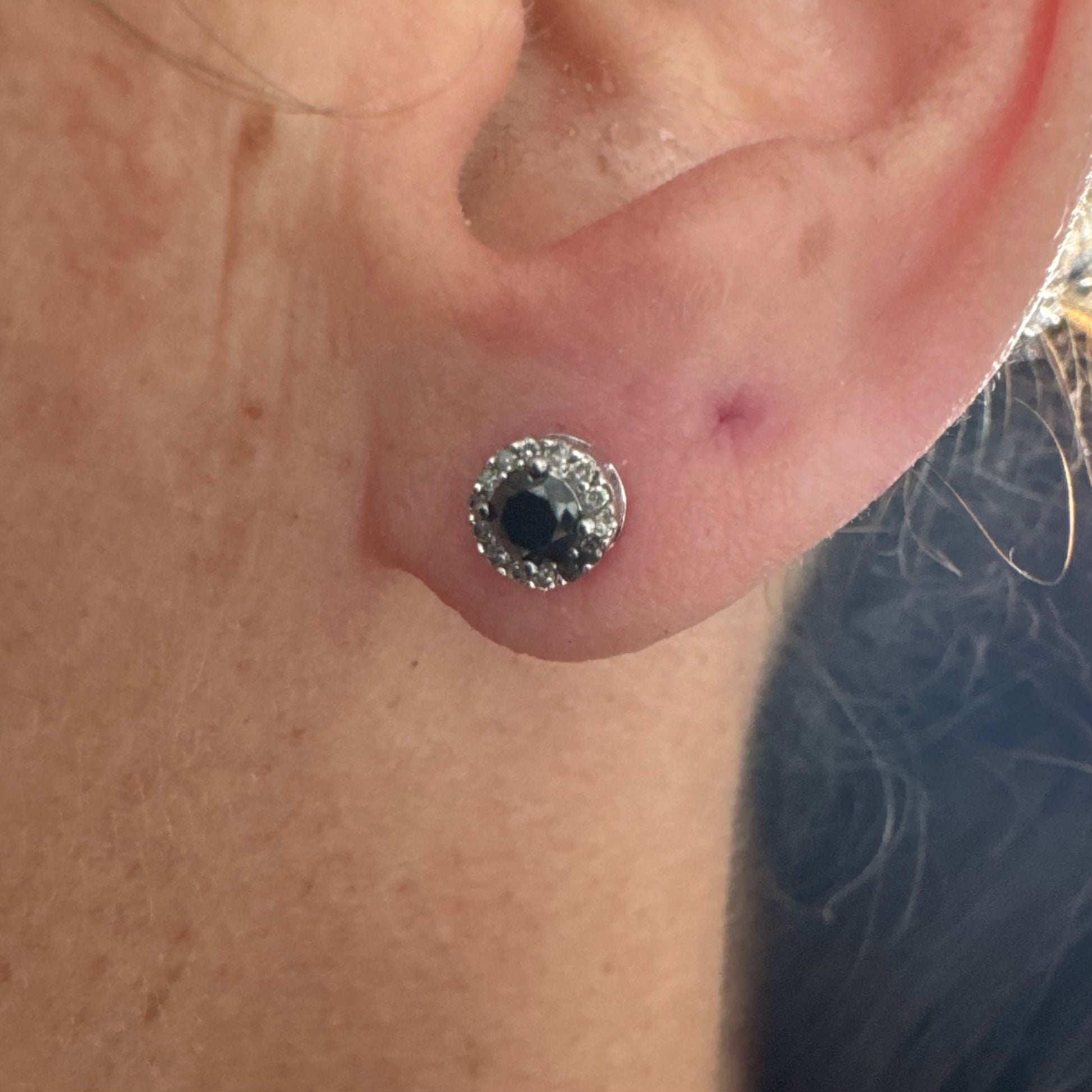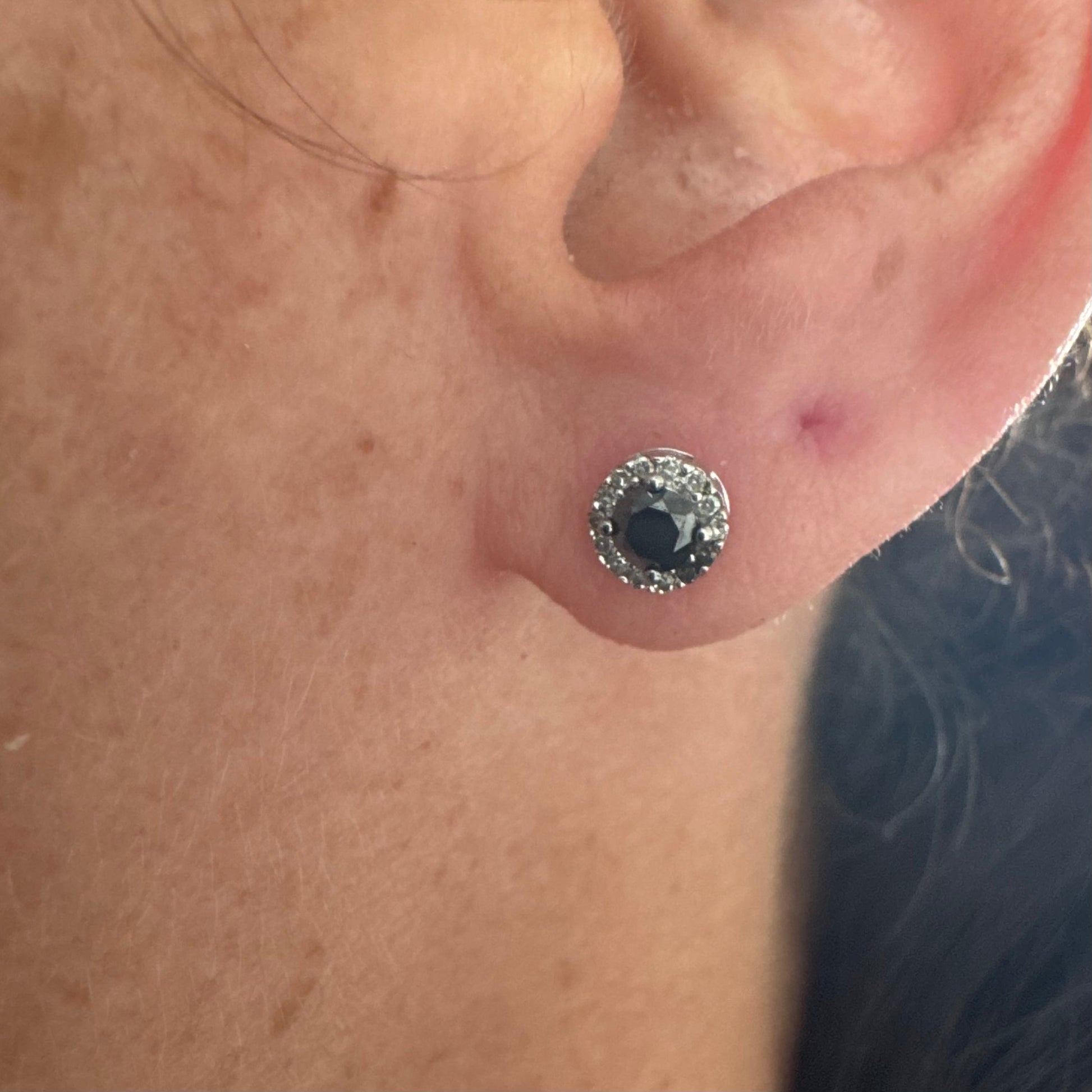 עגילי זהב לבן 10 קראט צמודים לאוזן, משובצים יהלומים שחורים עגולים במרכז ומסביבם הילה של יהלומים לבנים מנצנצים.