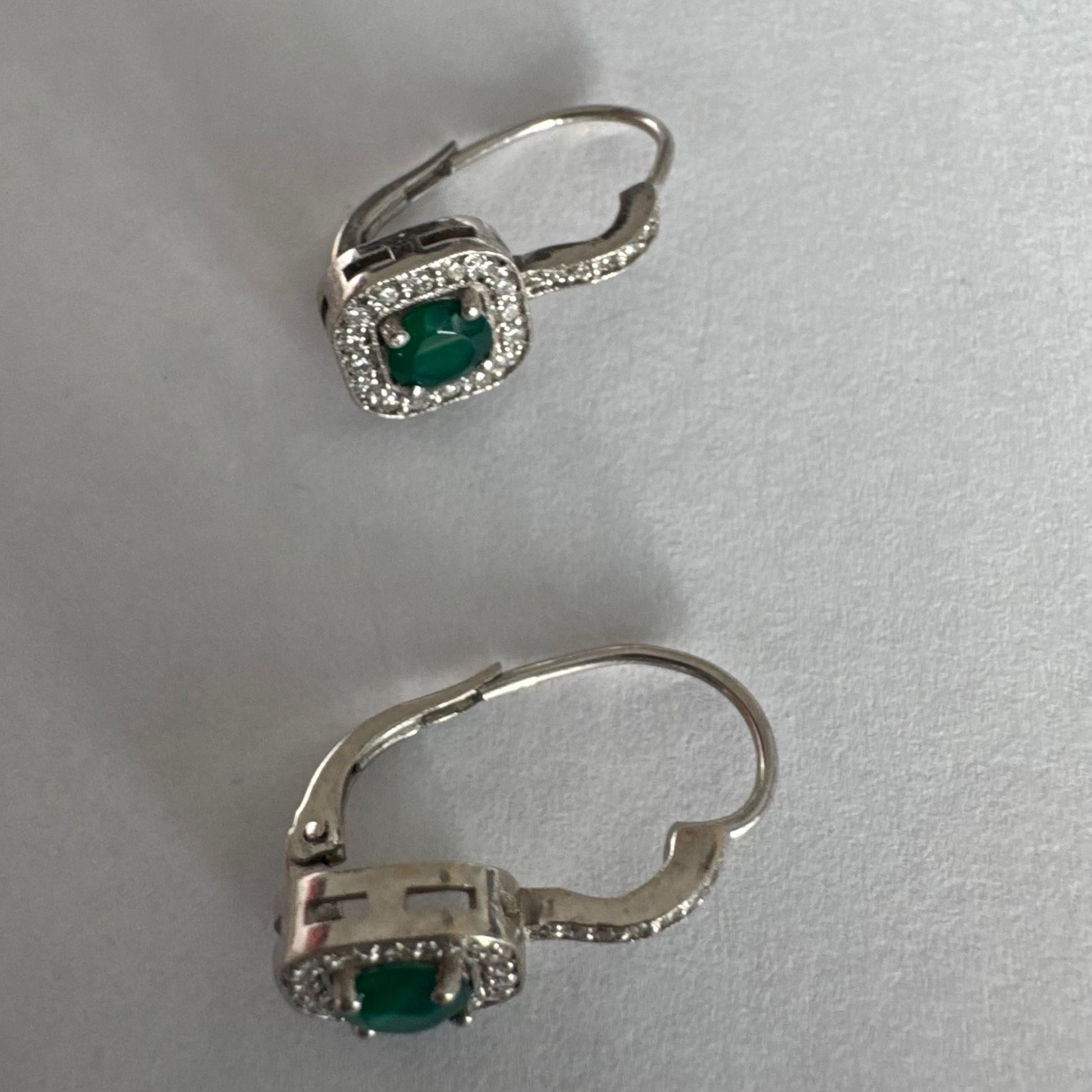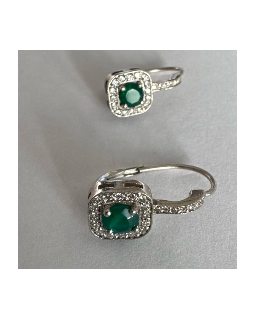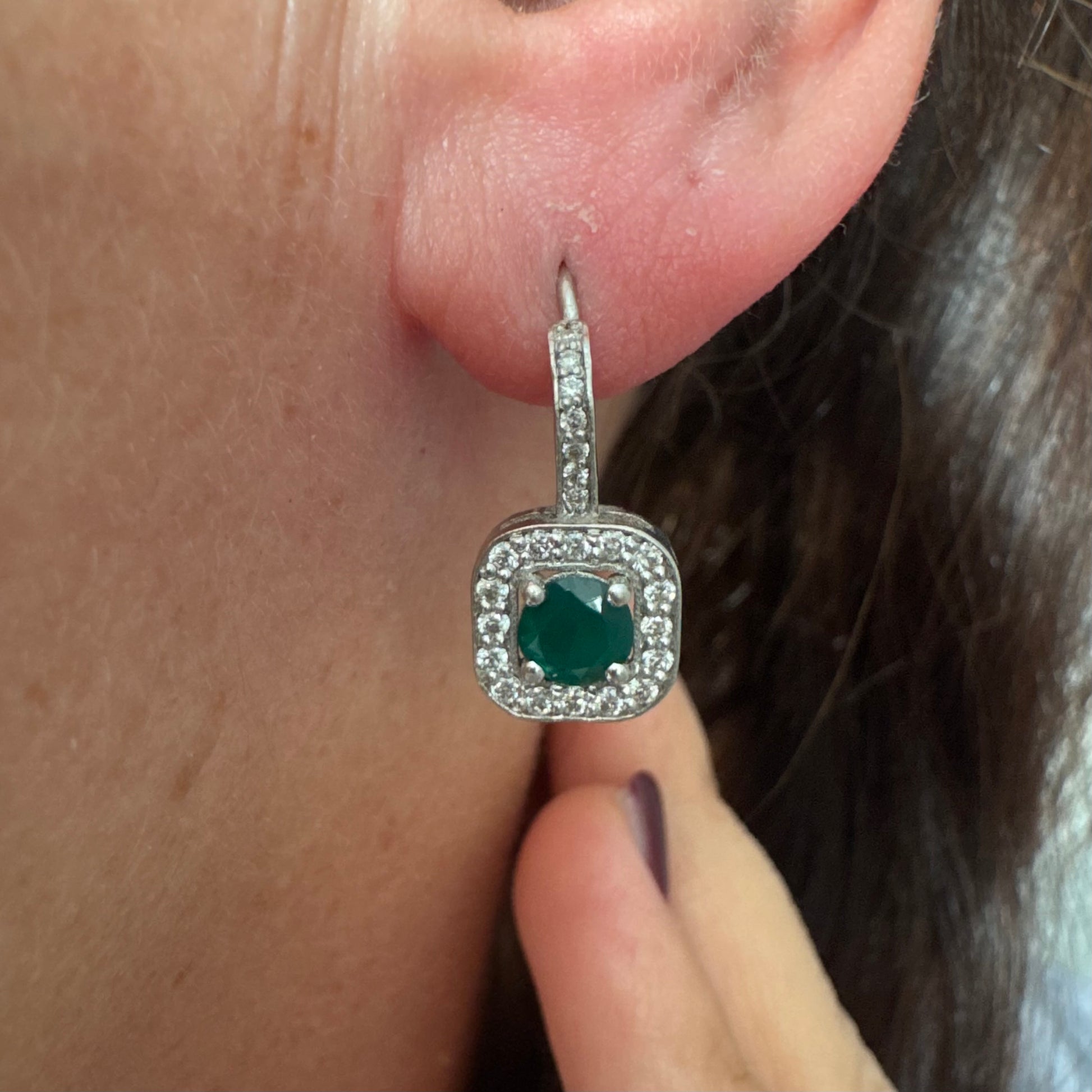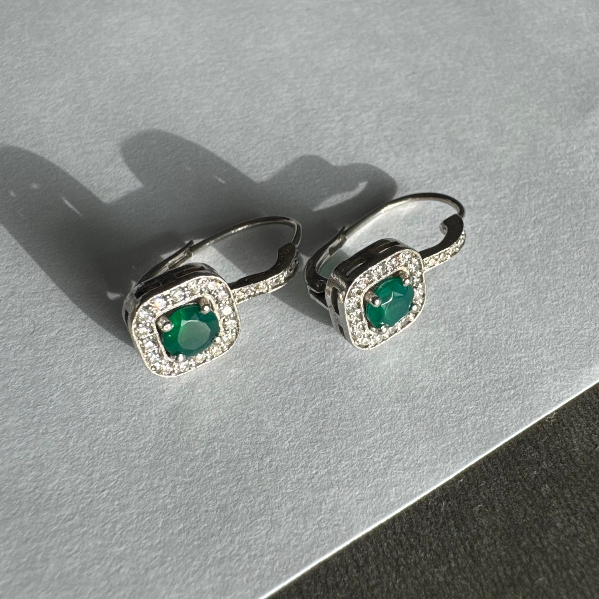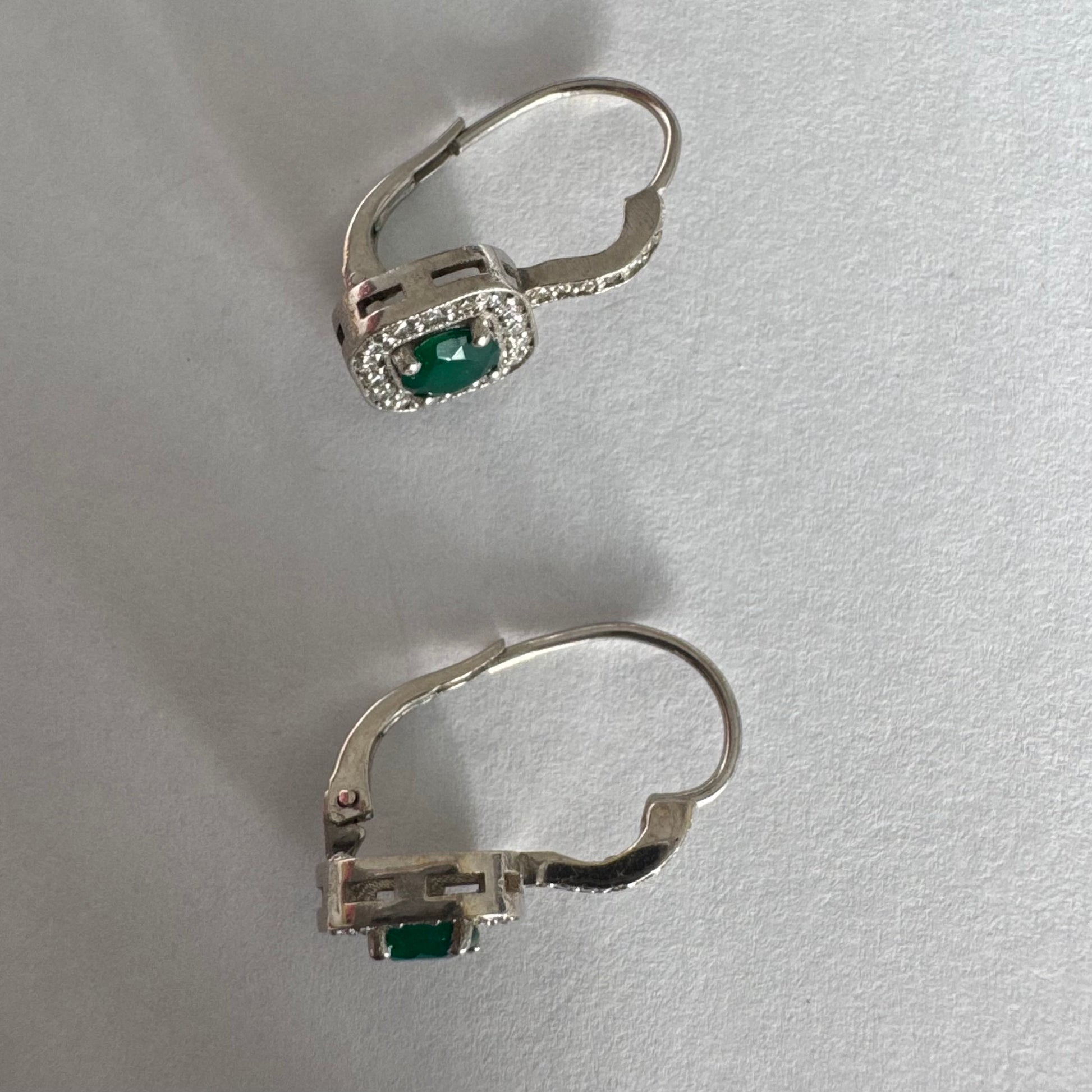 עגילי זהב לבן 14 קראט בעיצוב אלגנטי ונקי, משובצים אבן אמרלד מרכזית במראה עשיר ועמוק, מוקפת הילה מנצנצת של יהלומים.