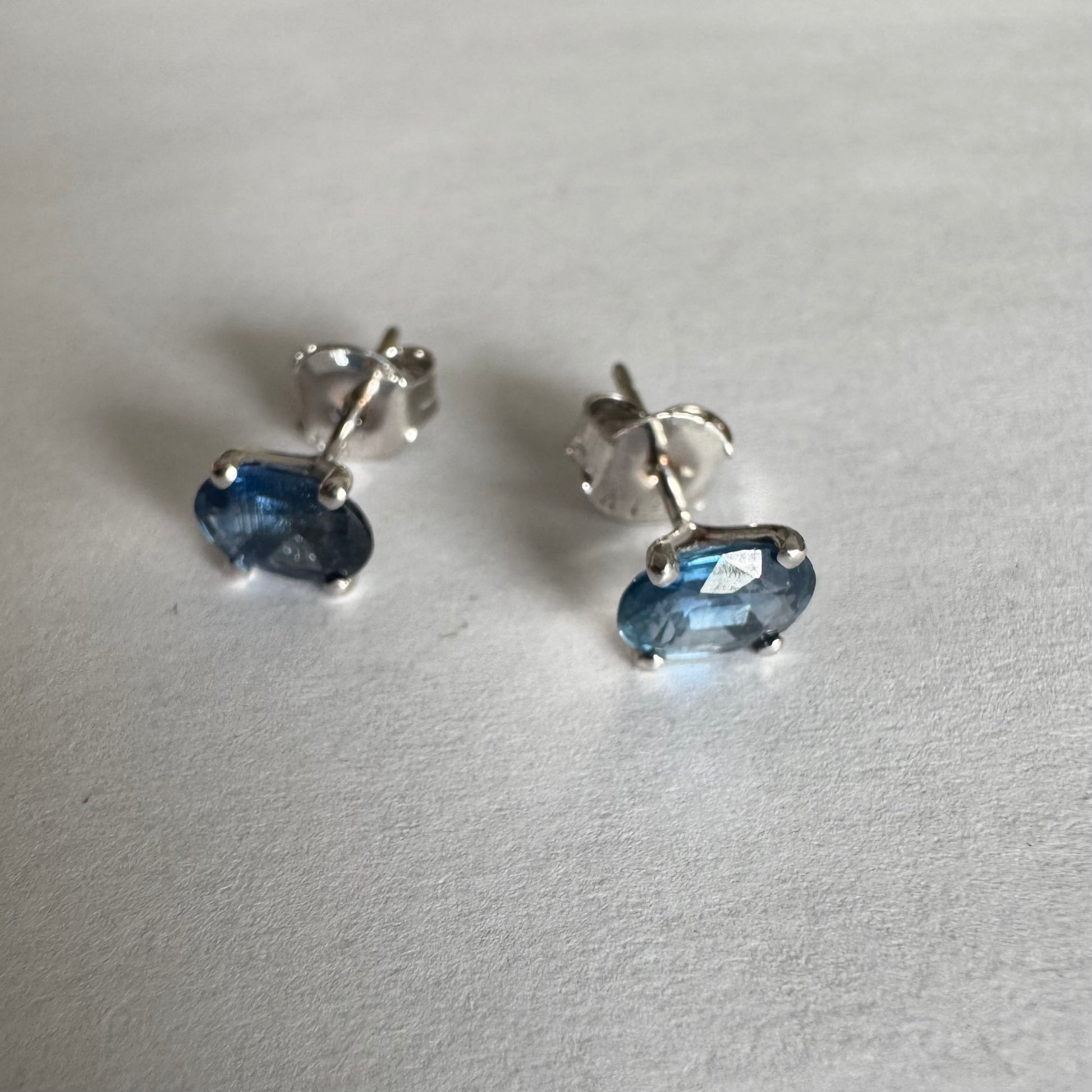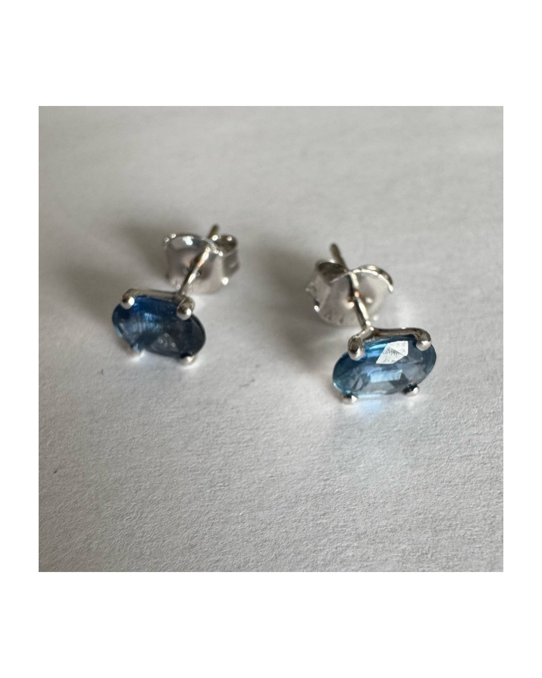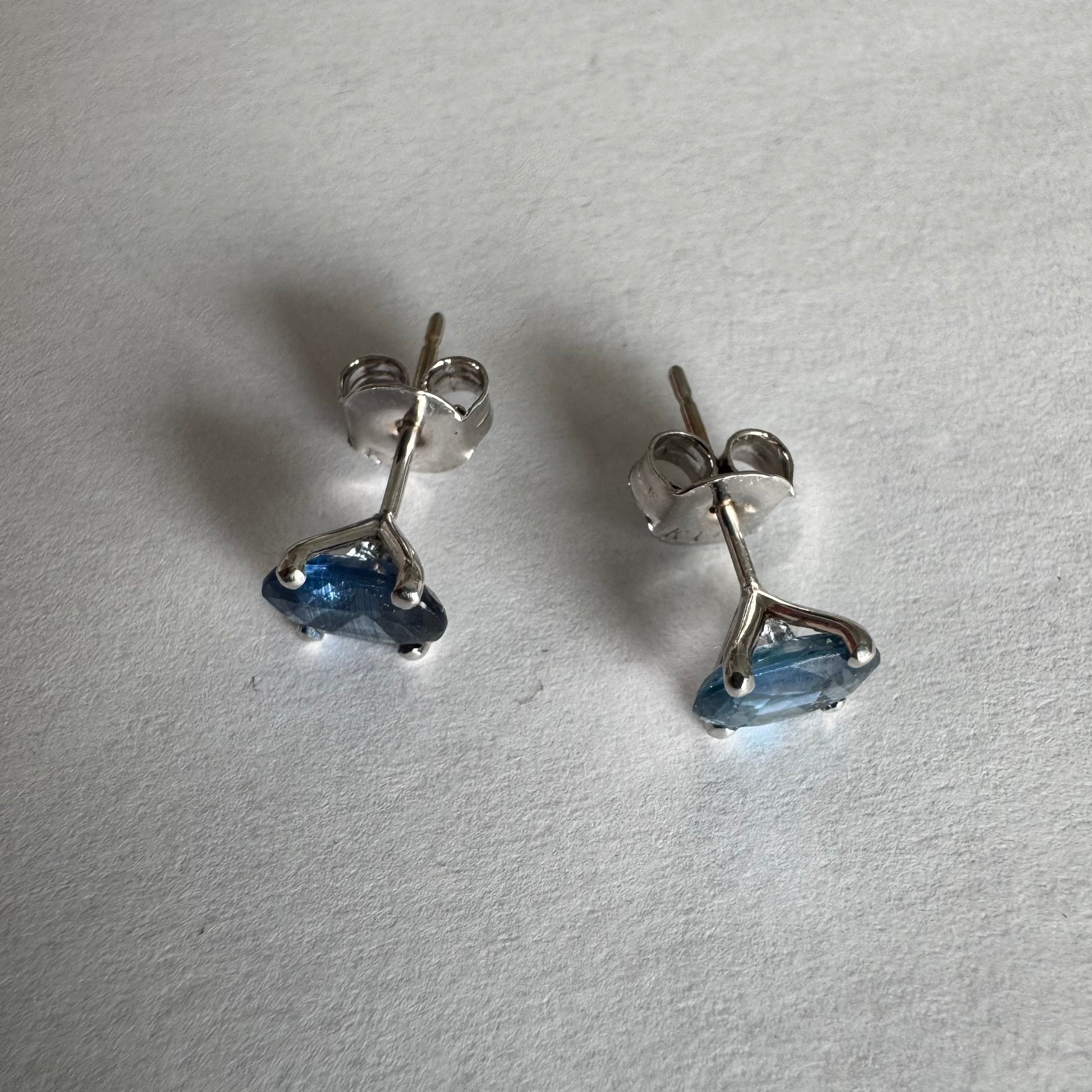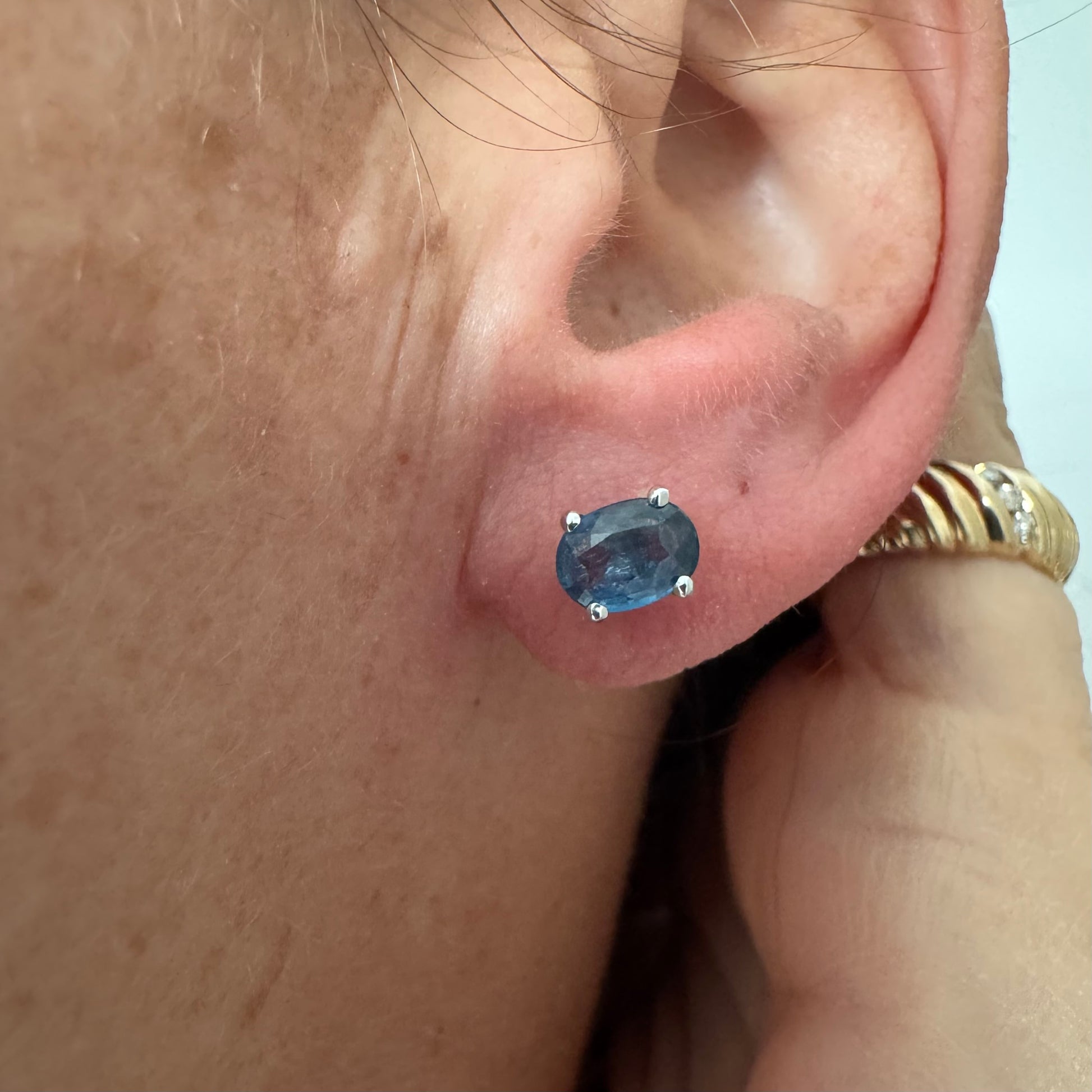 עגילי זהב לבן 14 קראט משובצים אבני טופז כחולות בחיתוך אובלי.