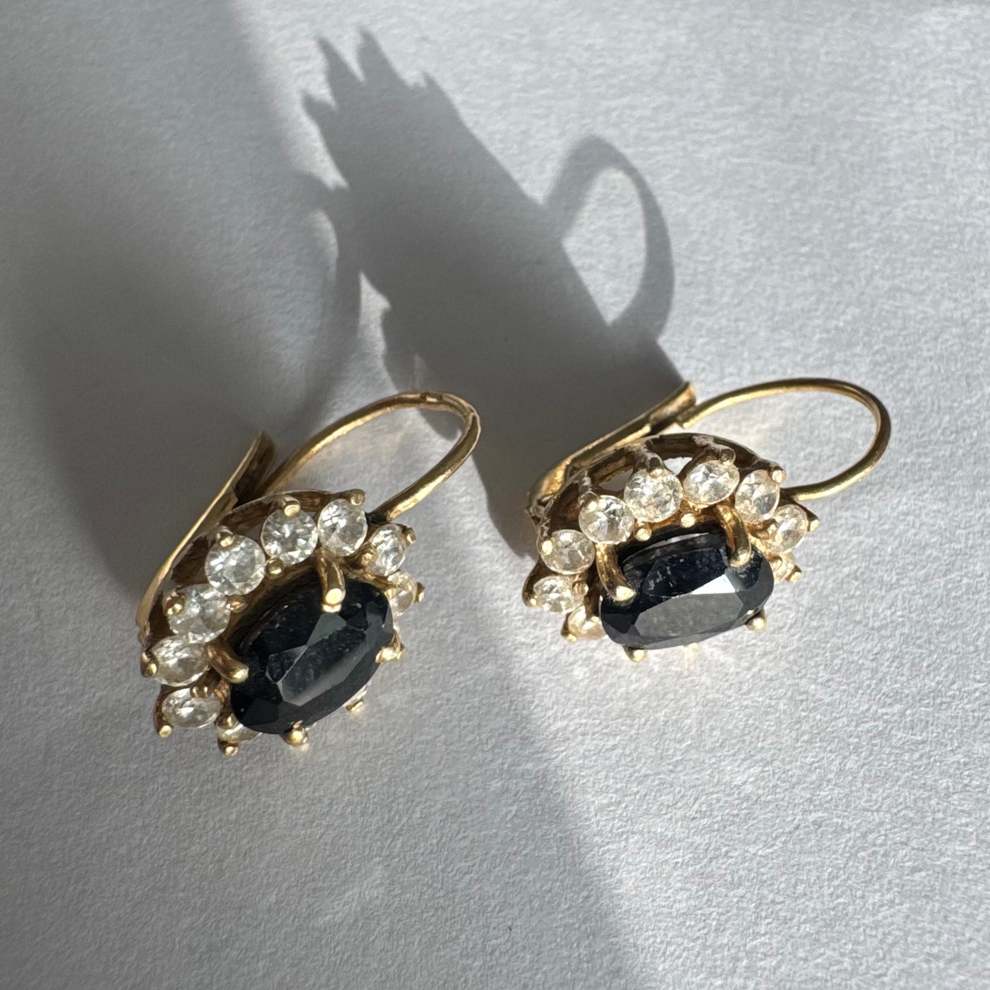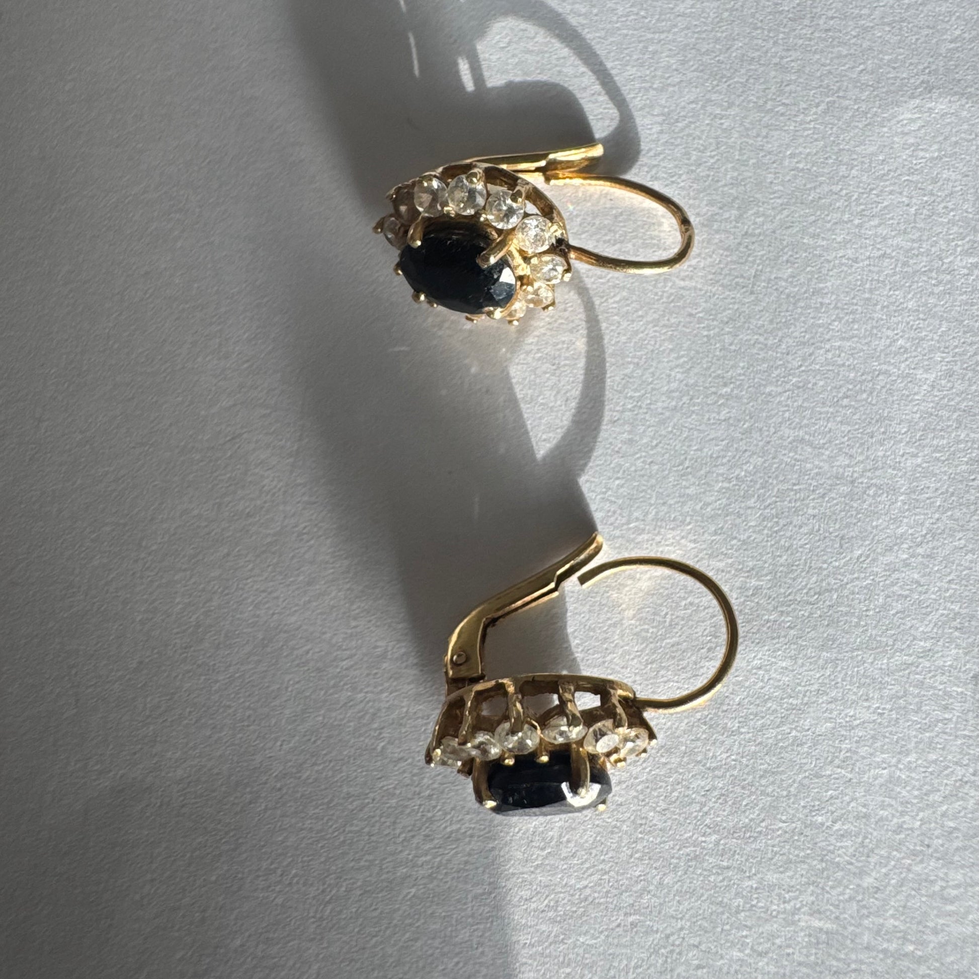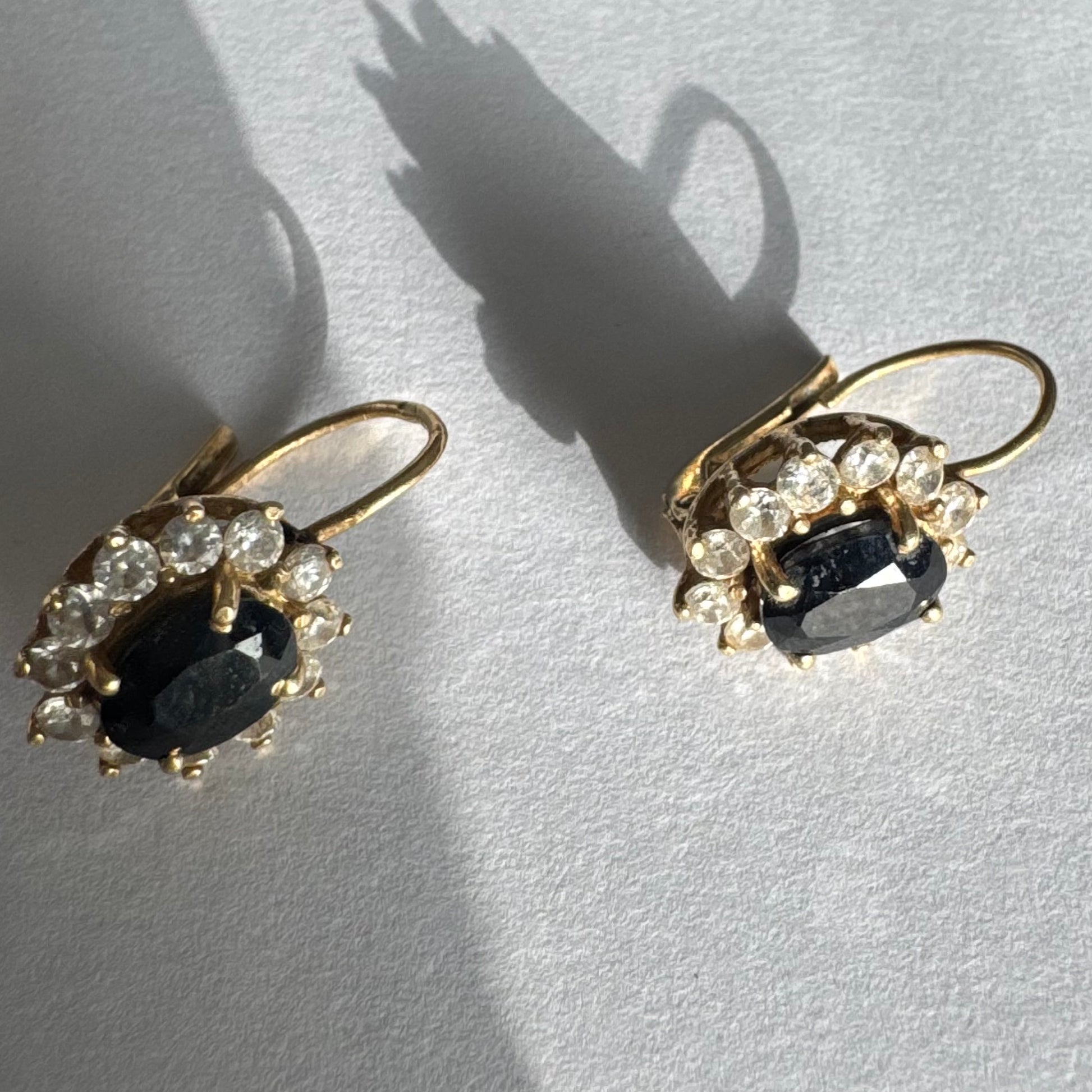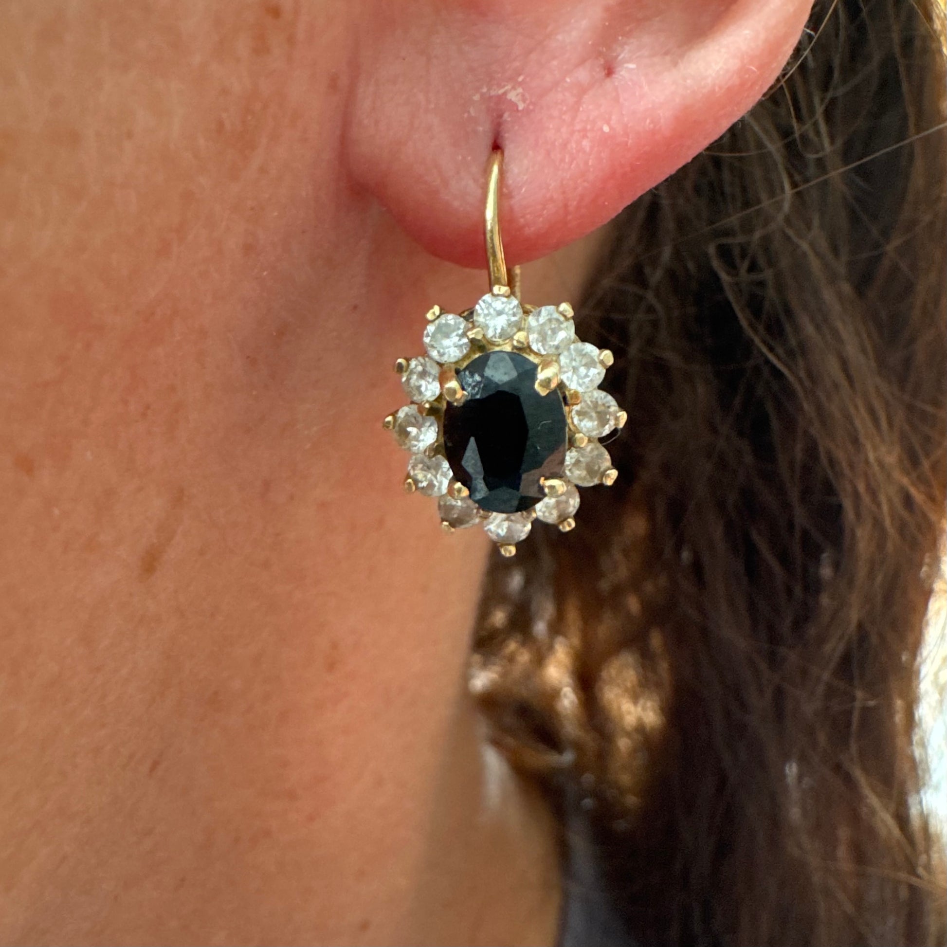 עגילי זהב צהוב 14 קראט בעיצוב קלאסי ומרשים, משובצים אבן ספיר בגוון כחול כהה בחיתוך אובלי, ומסביבה משובצים אבנים נוצצות שמוסיפות אור וזוהר לכל תנועה.