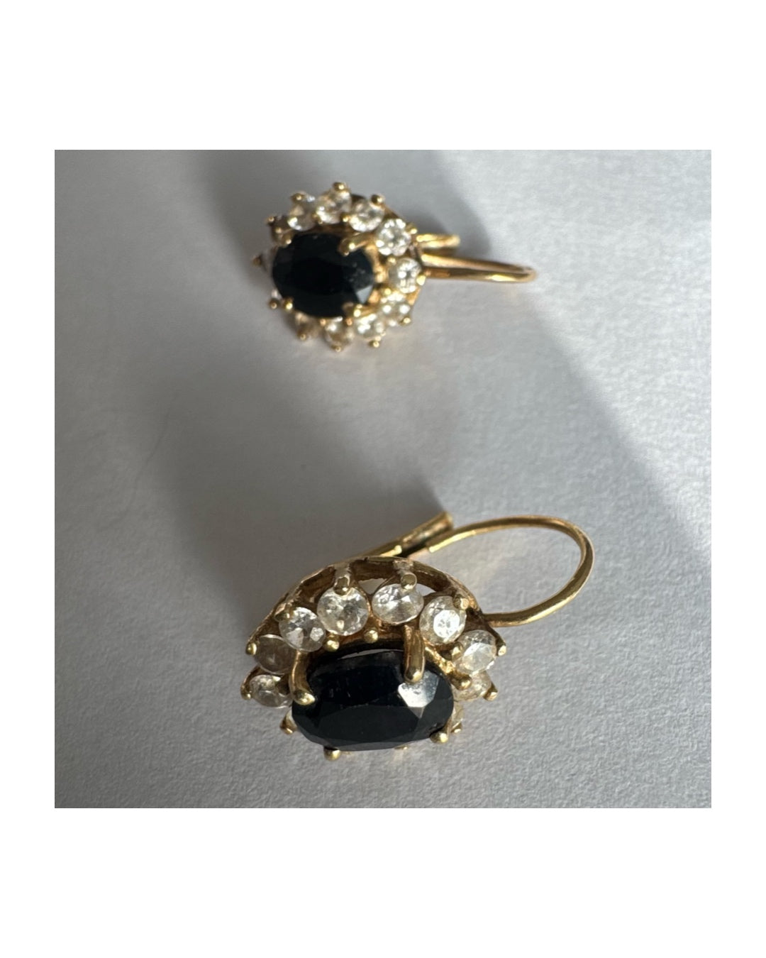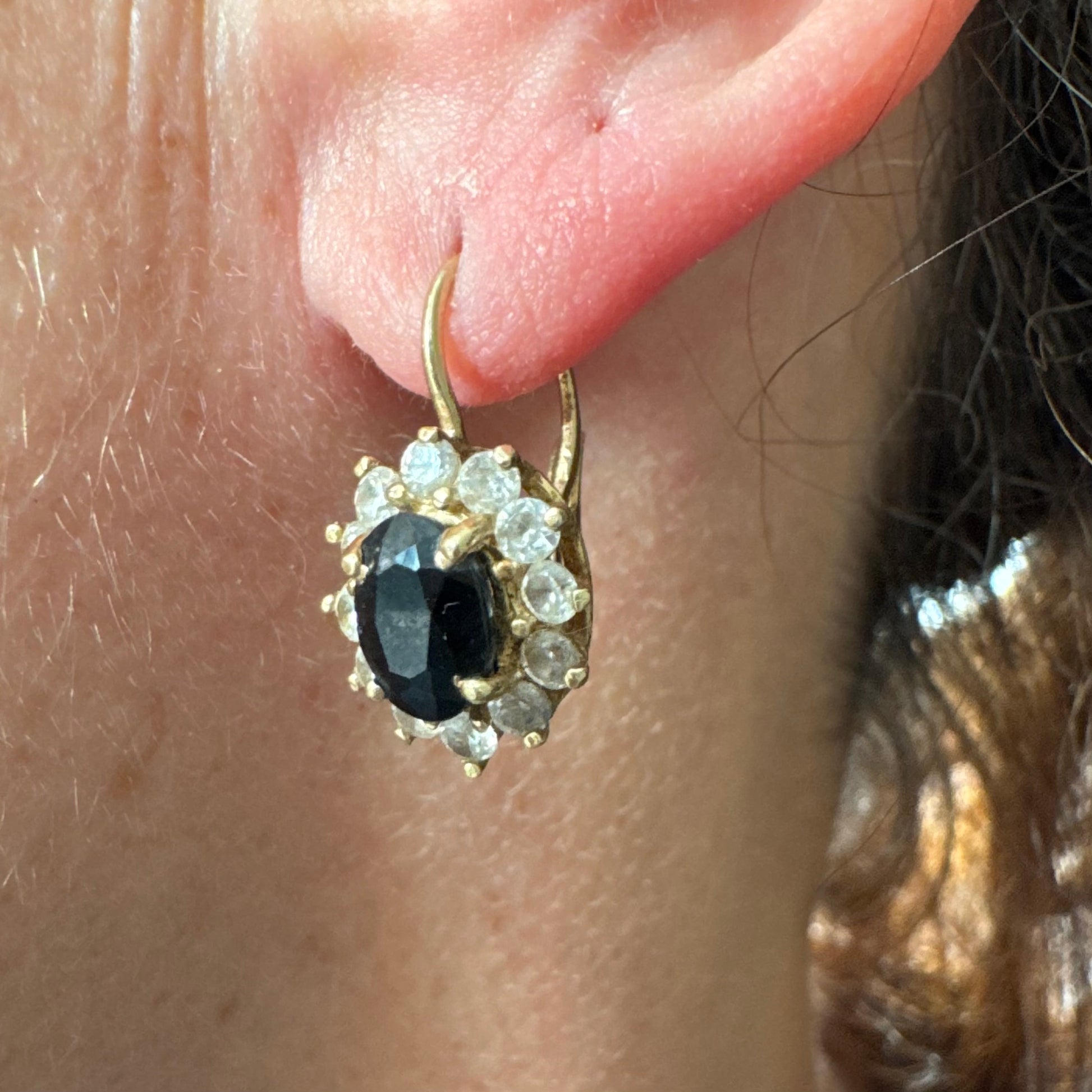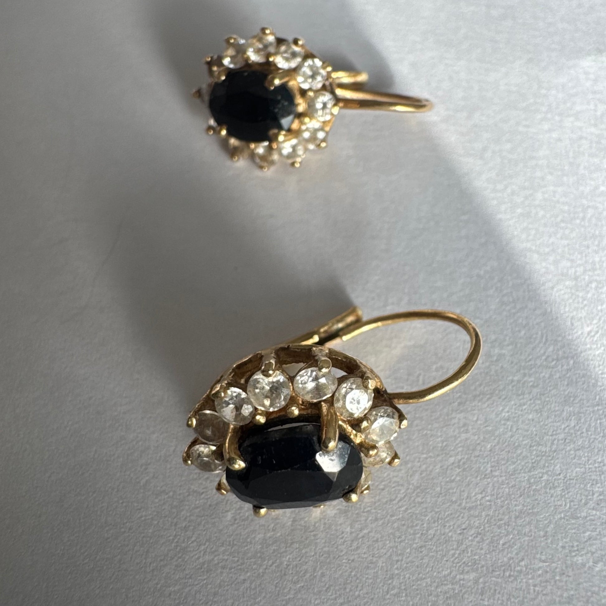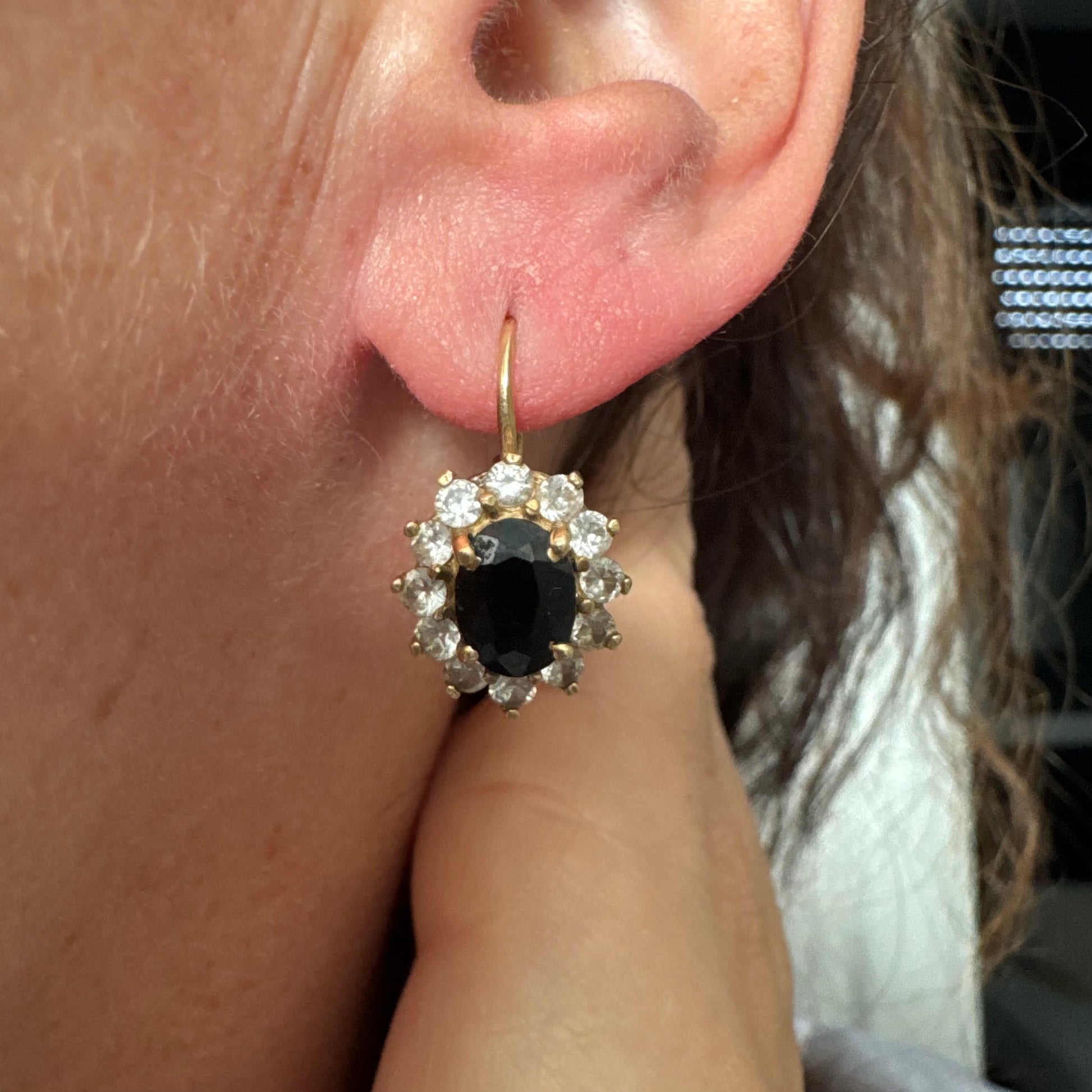 עגילי זהב צהוב 14 קראט בעיצוב קלאסי ומרשים, משובצים אבן ספיר בגוון כחול כהה בחיתוך אובלי, ומסביבה משובצים אבנים נוצצות שמוסיפות אור וזוהר לכל תנועה.