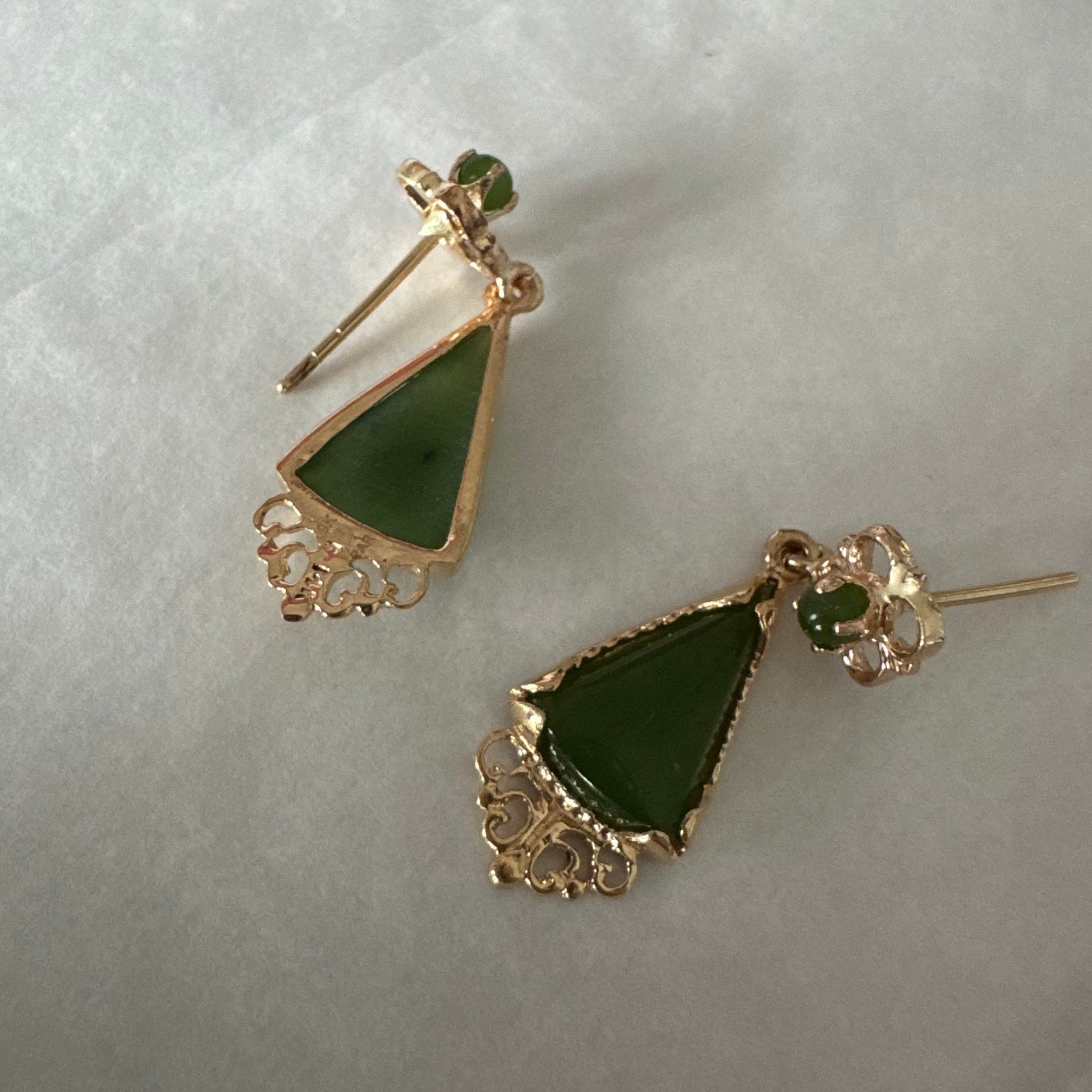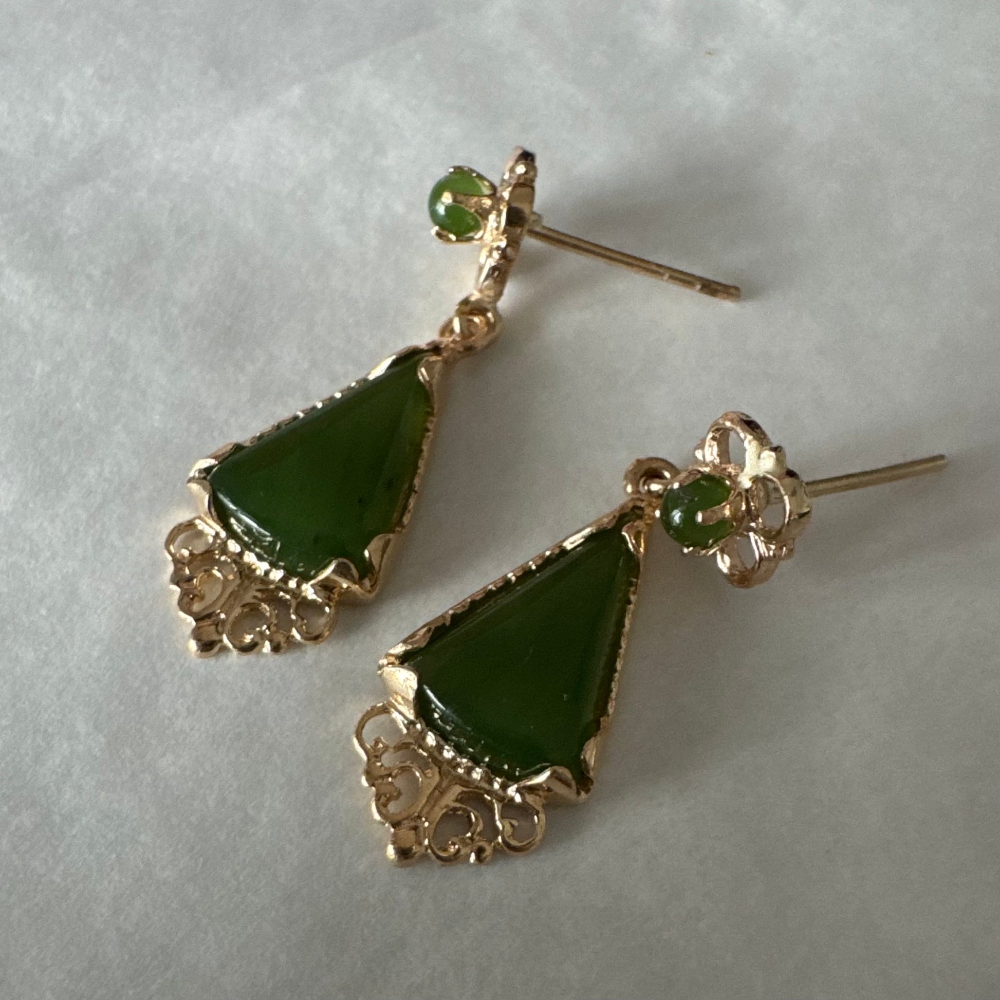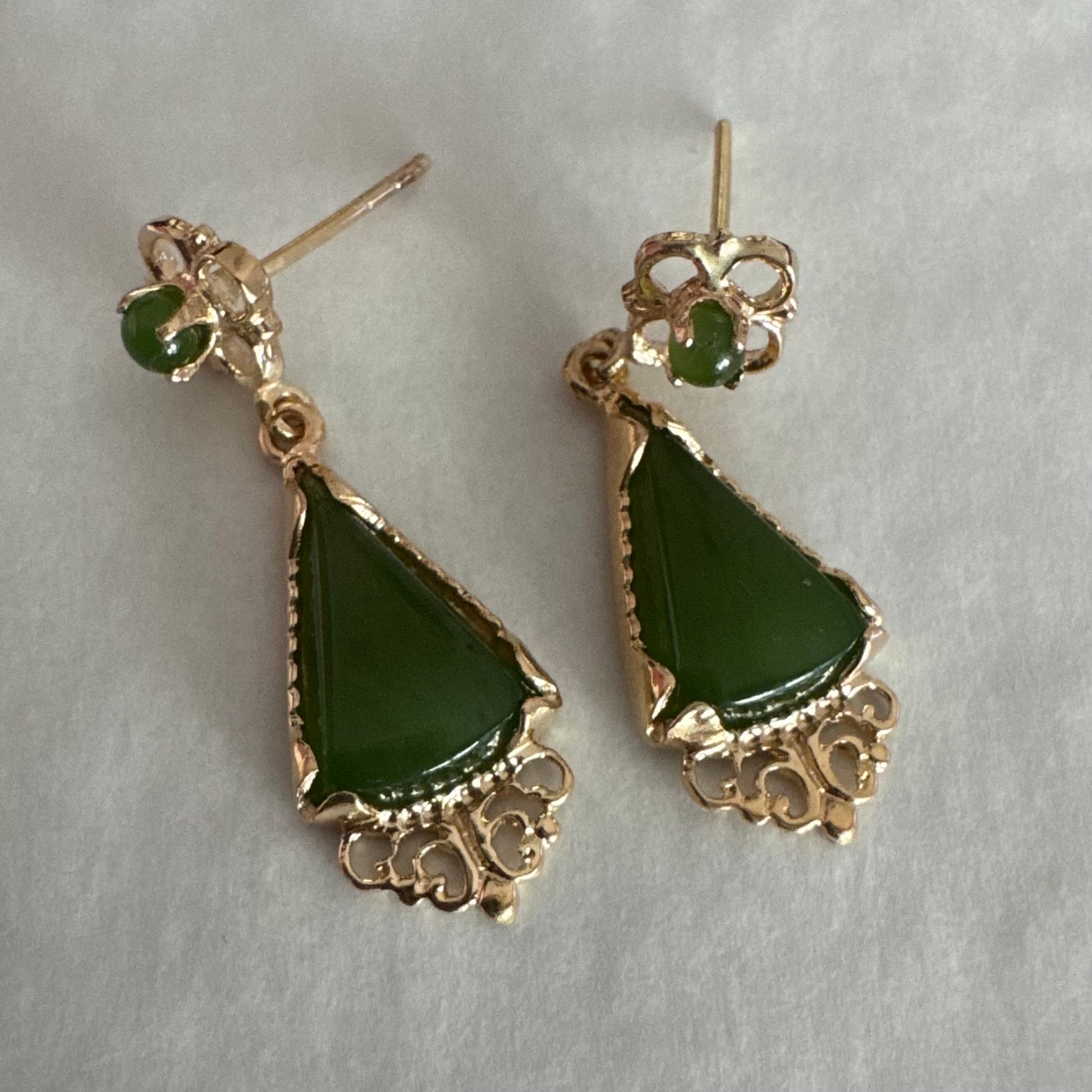 עגילי זהב צהוב 14 קראט משובצים אבני ג׳ייד ירוקות בגוון עמוק בחיתוך משולש.