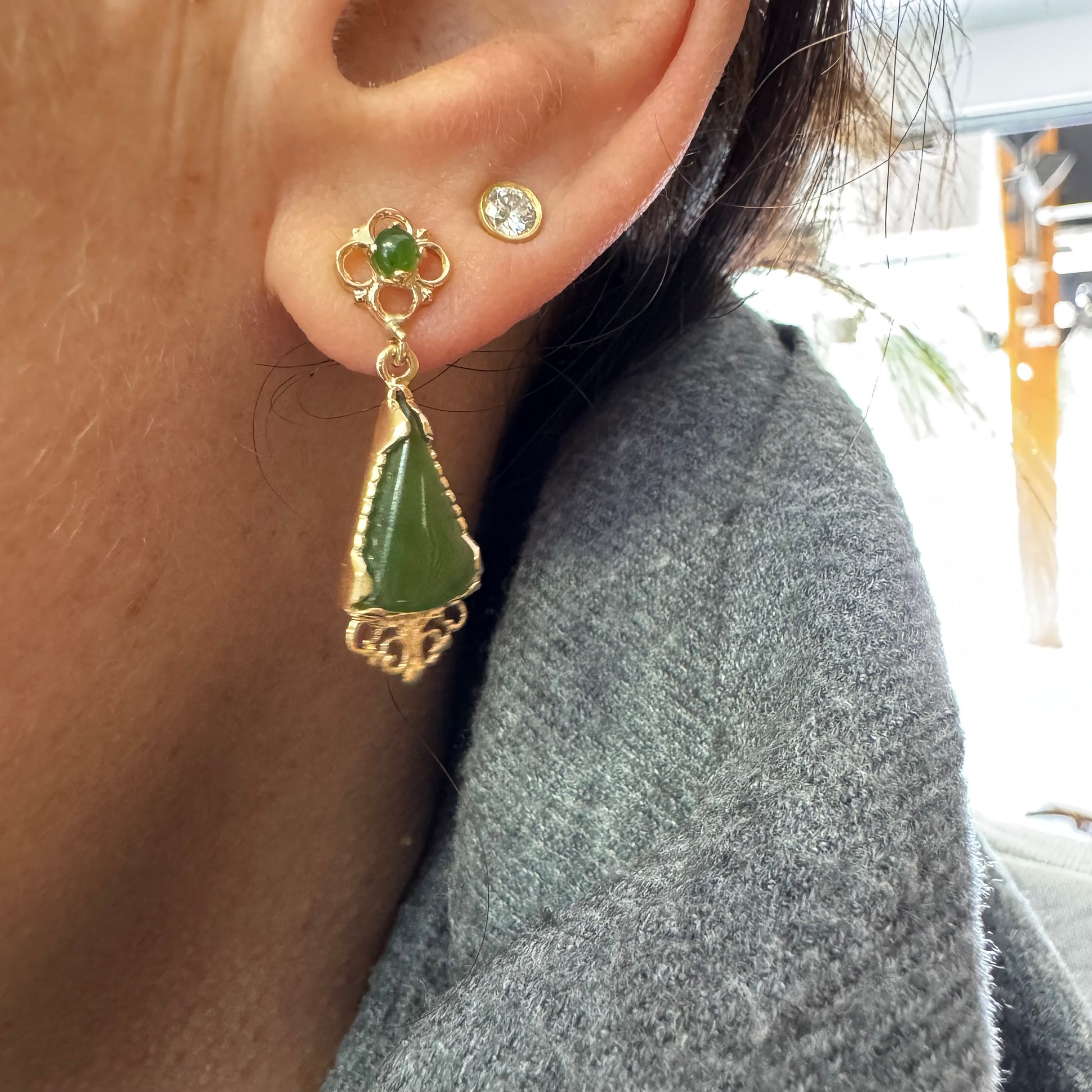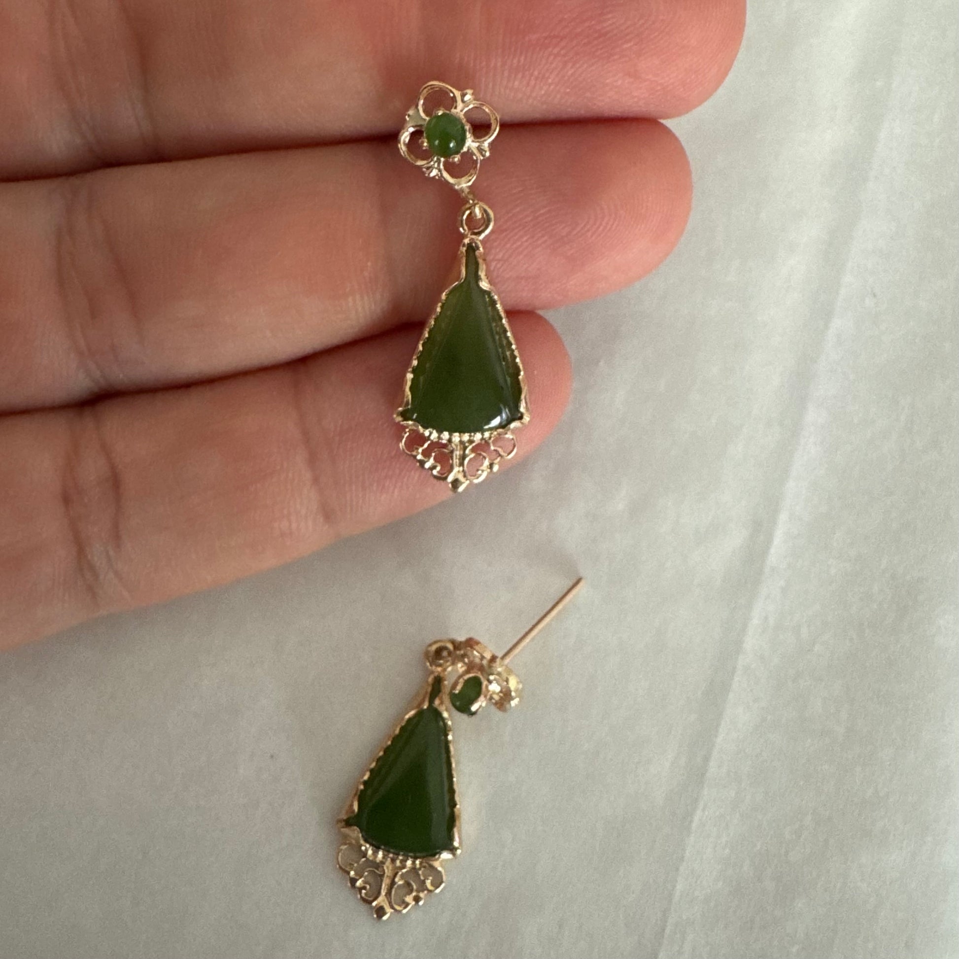 אבן הג׳ייד הקטנה העליונה והעיטורים העדינים בזהב מוסיפים מראה וינטג’י אלגנטי והעיצוב התלוי מעניק תנועה עדינה ונוכחות מיוחדת.