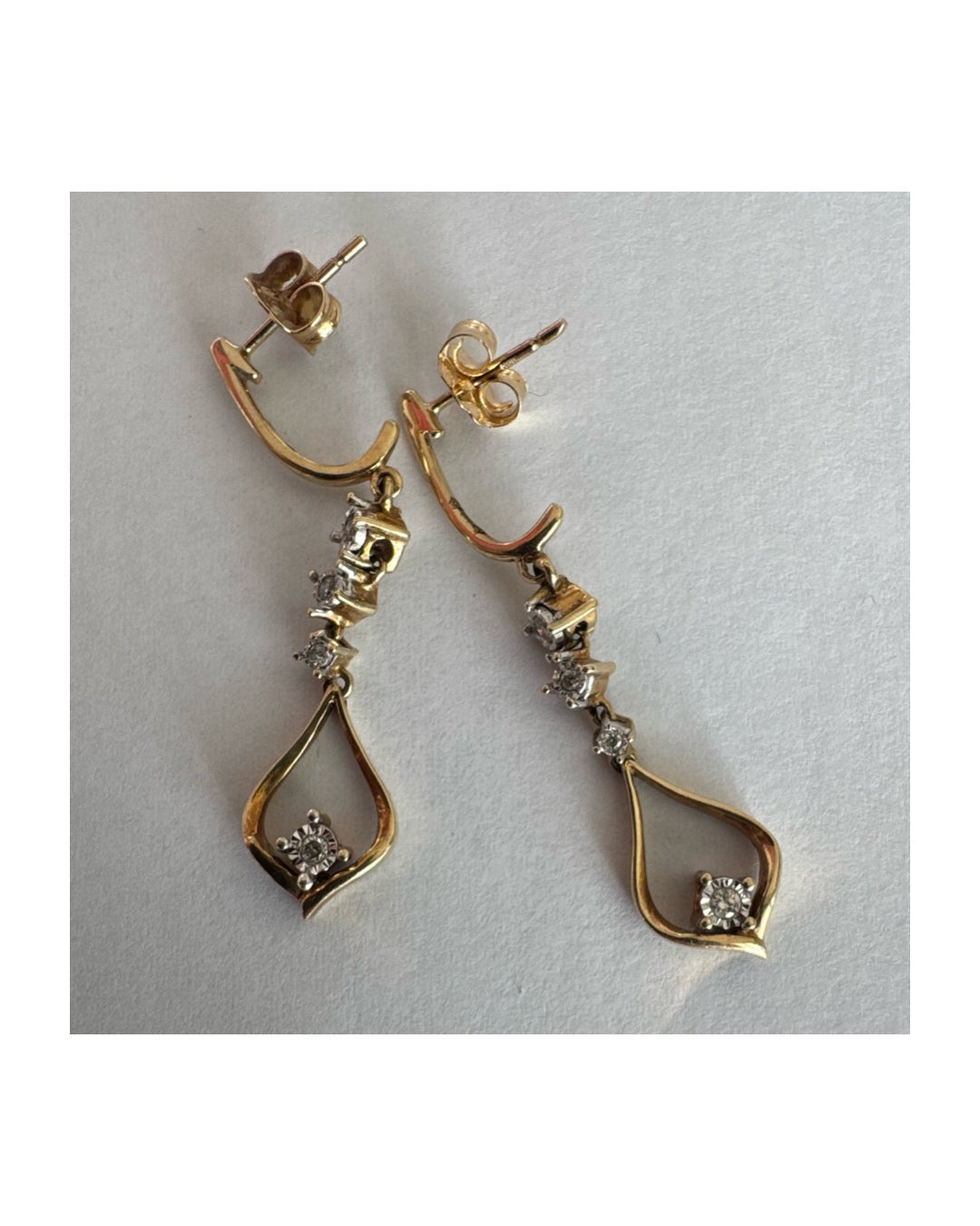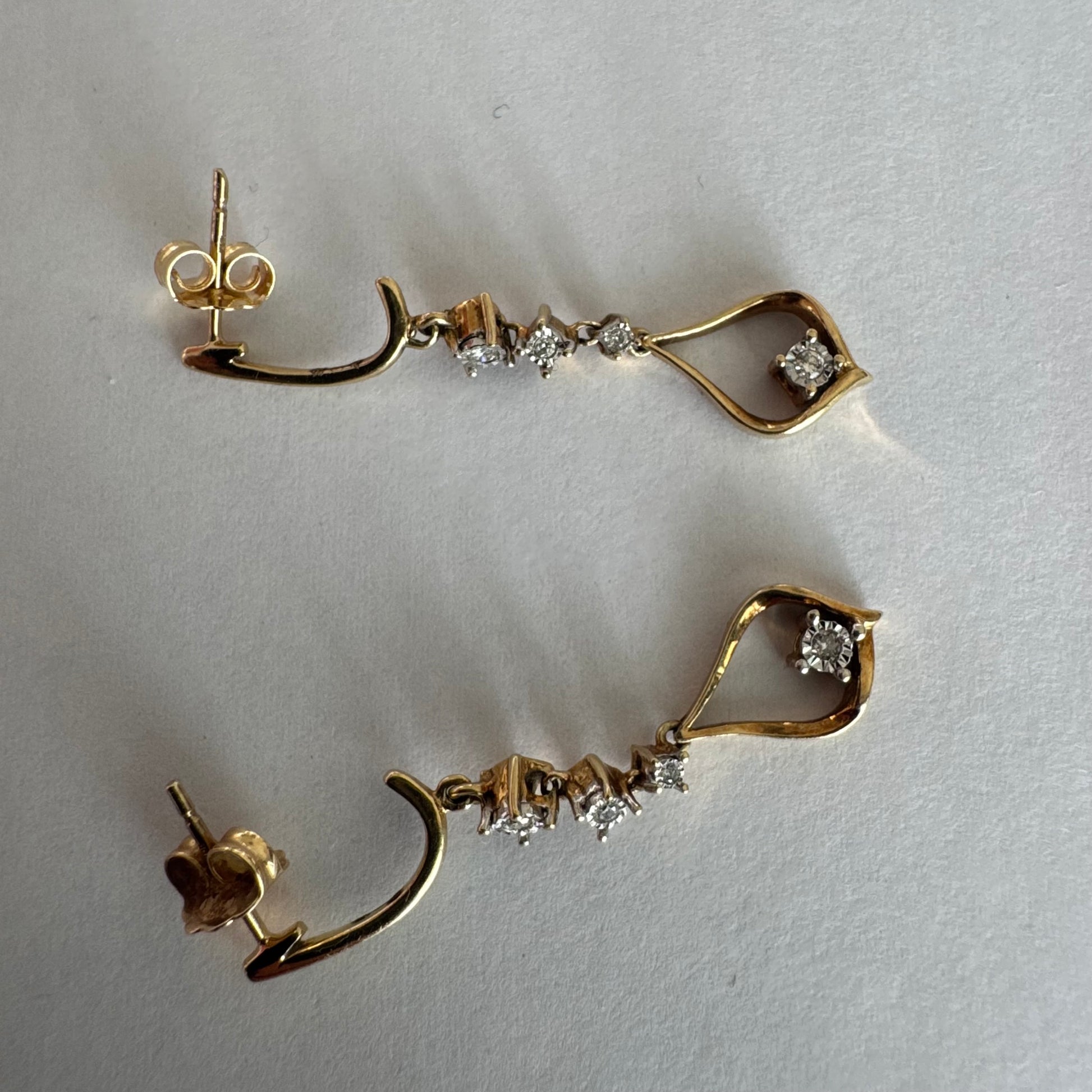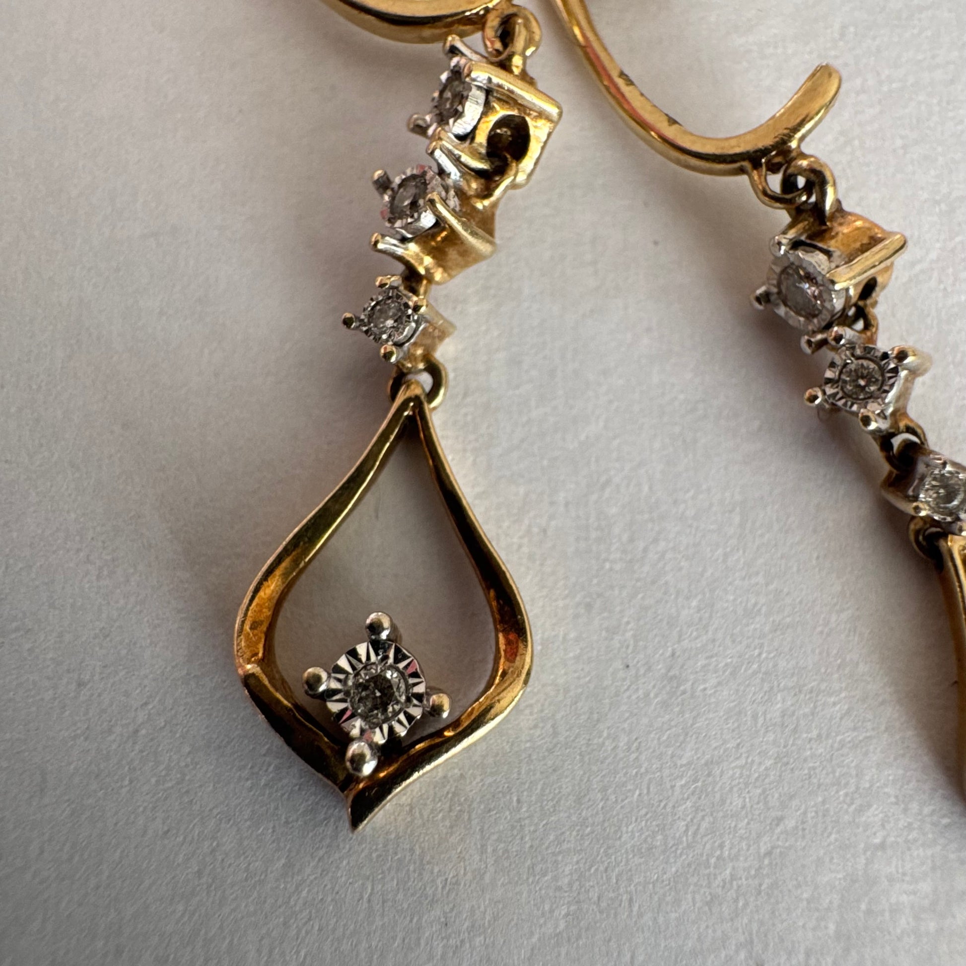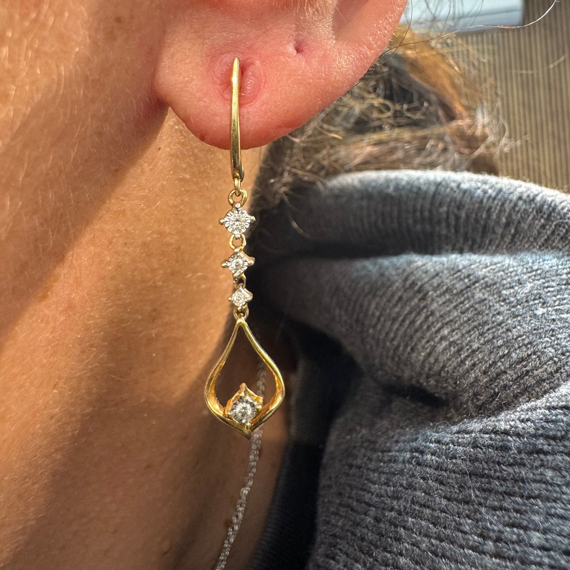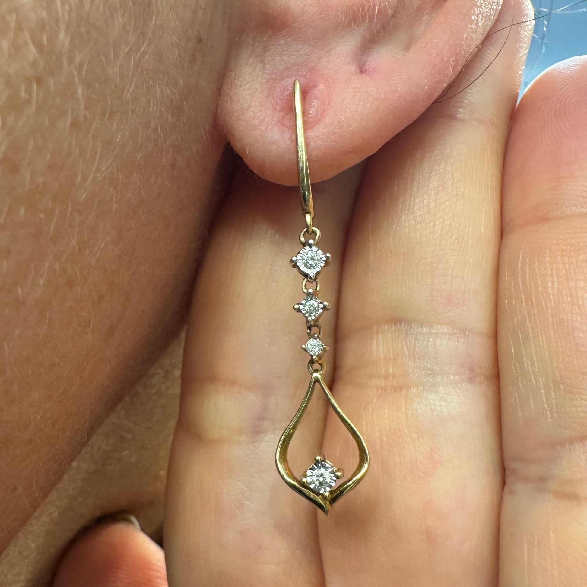 עגילי זהב 14 קראט תלויים בעיצוב עדין ומודרני, משובצים יהלומים לבנים לאורך החלק המרכזי ובטיפה פתוחה בתחתית משובץ יהלום נוסף.