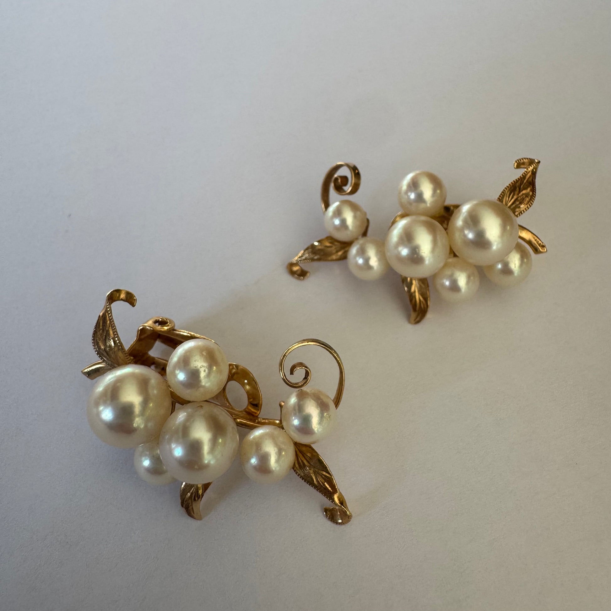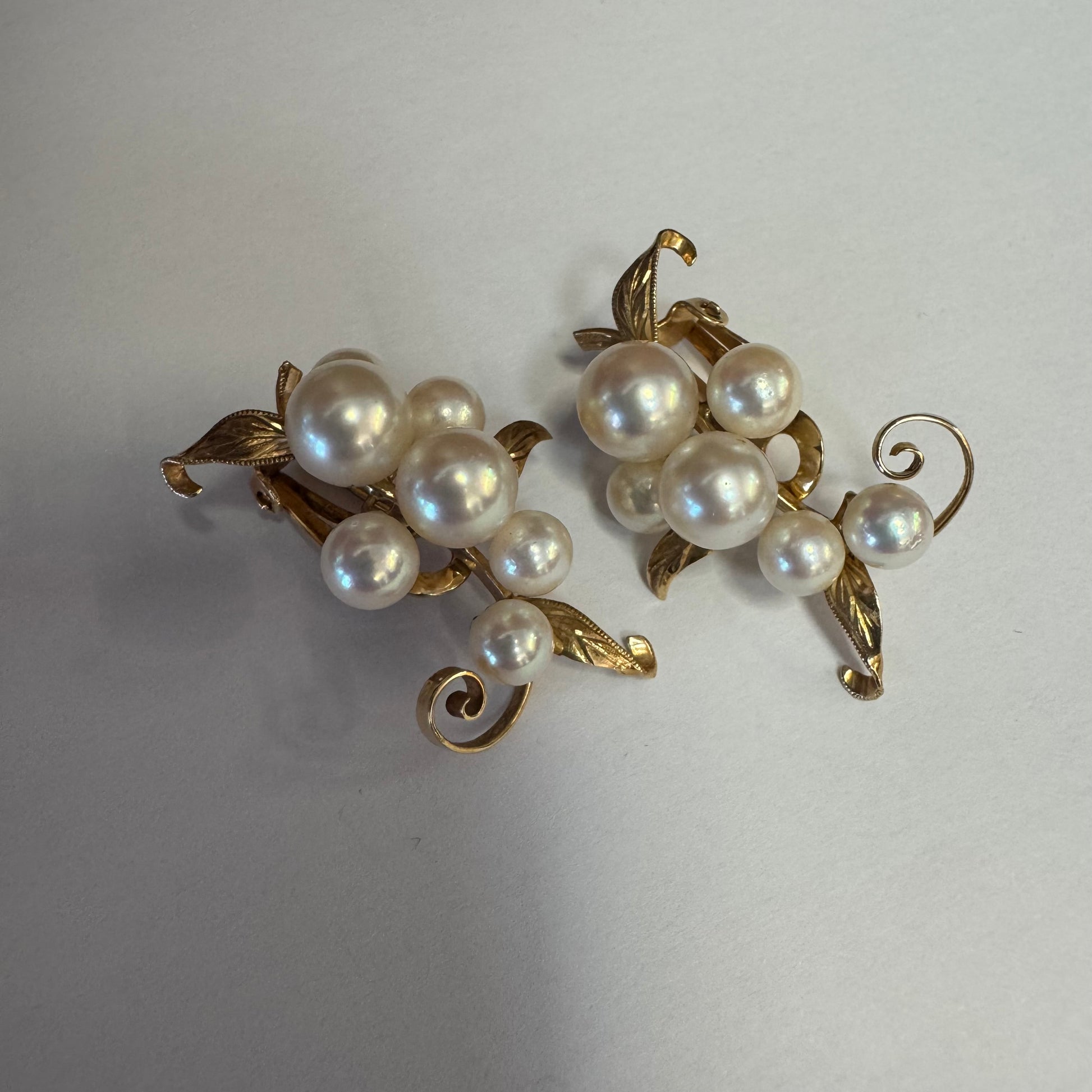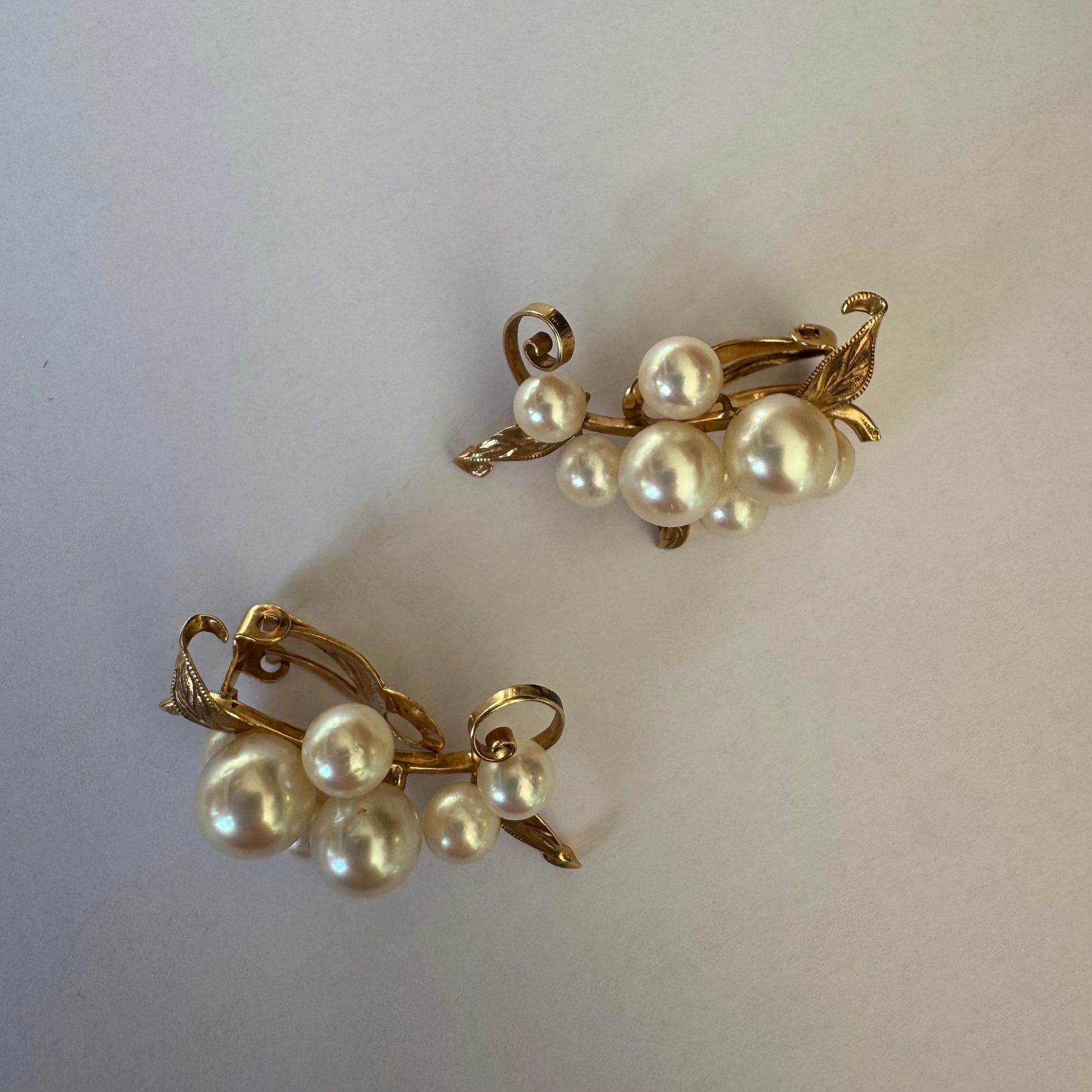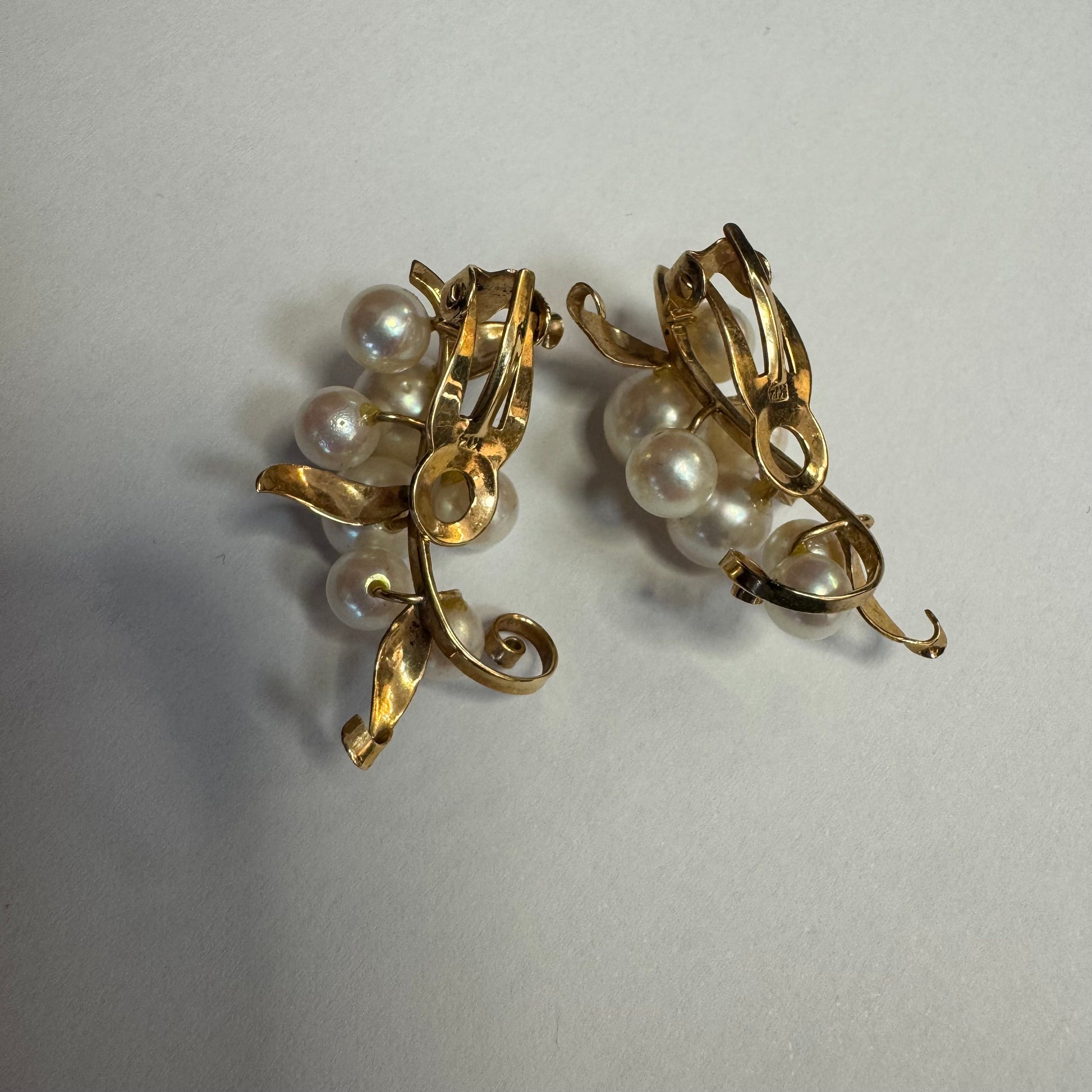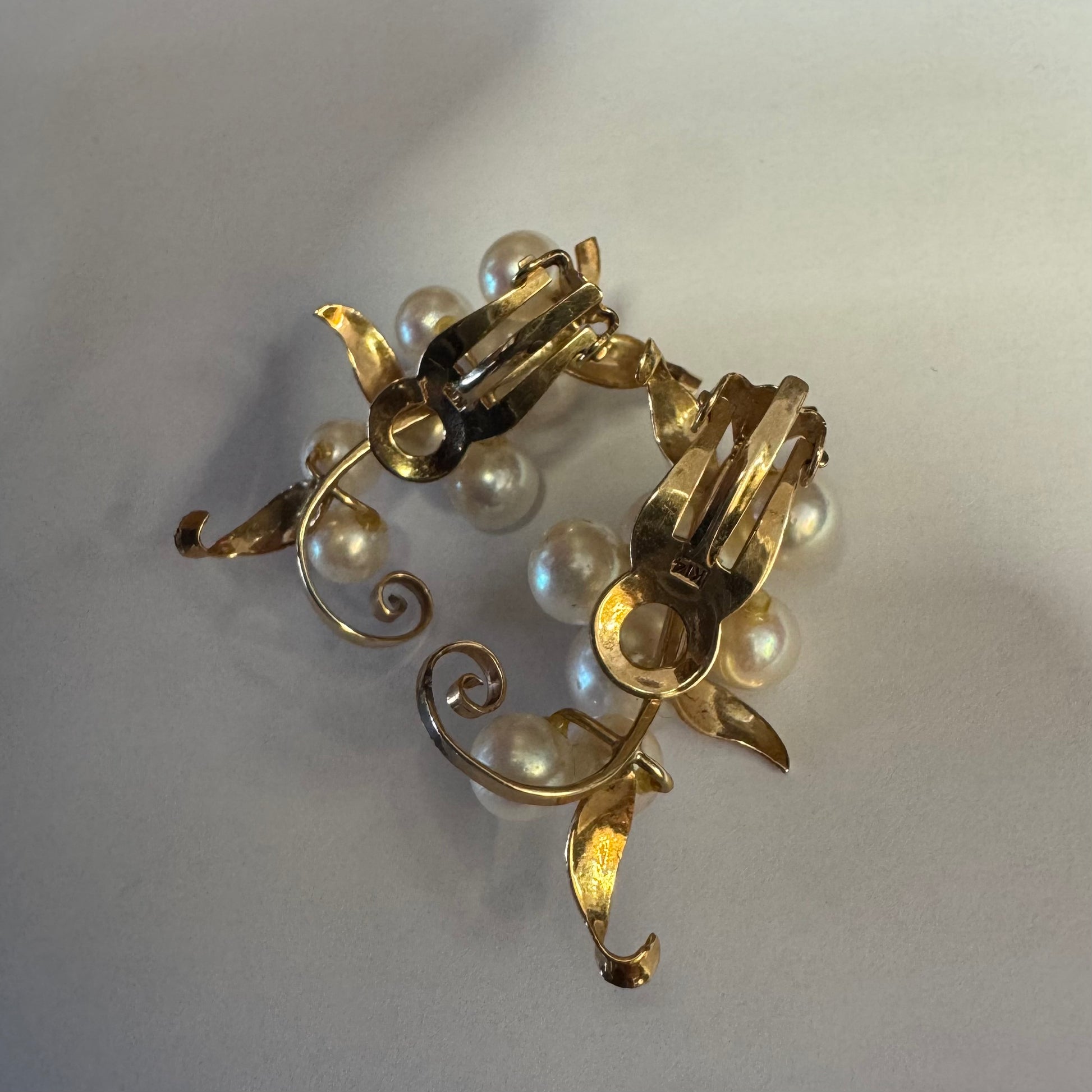 עגילי קליפס זהב 14 קראט, משובצים אשכול פנינים בגווני לבן-קרם.
