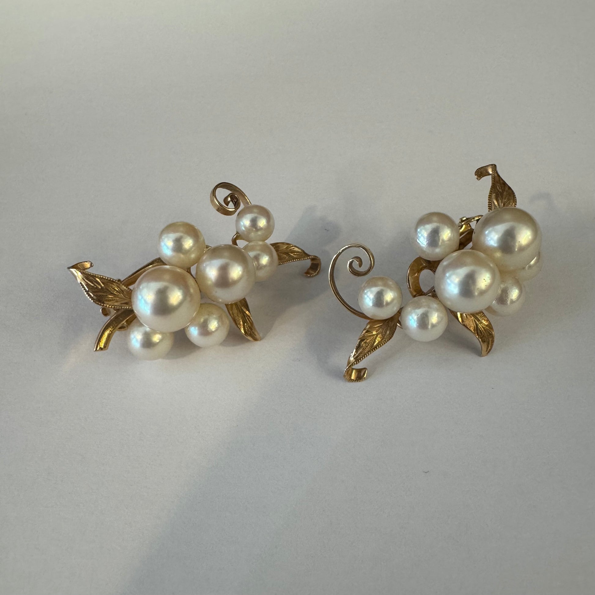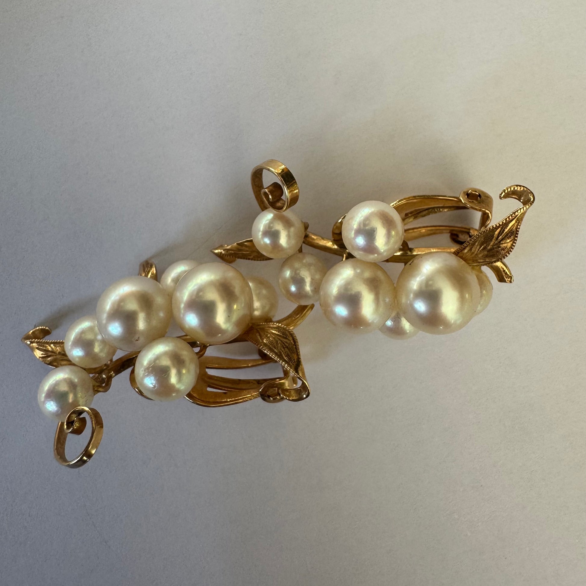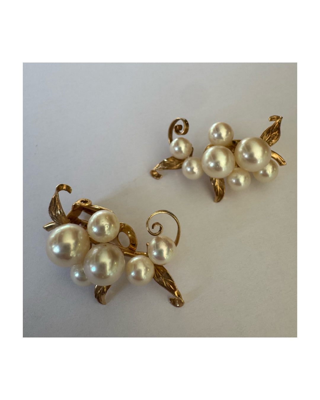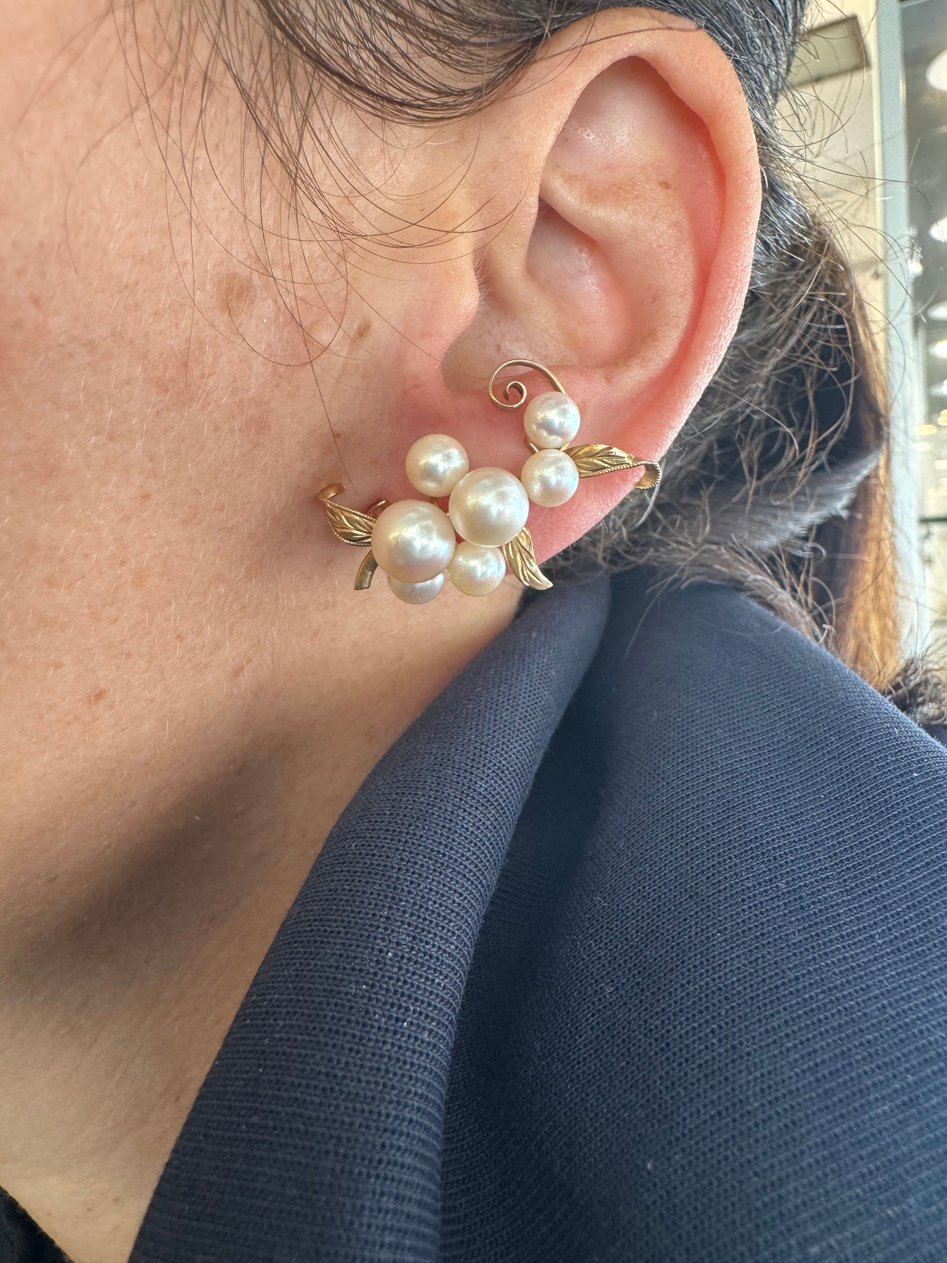עגילי קליפס זהב 14 קראט, משובצים אשכול פנינים בגווני לבן-קרם.