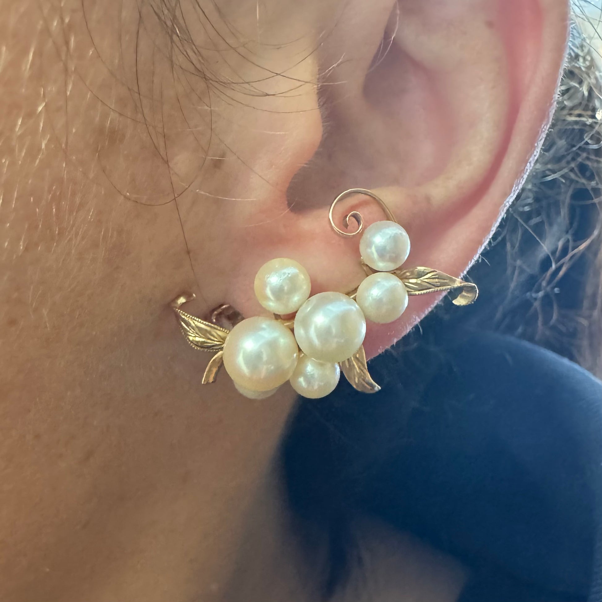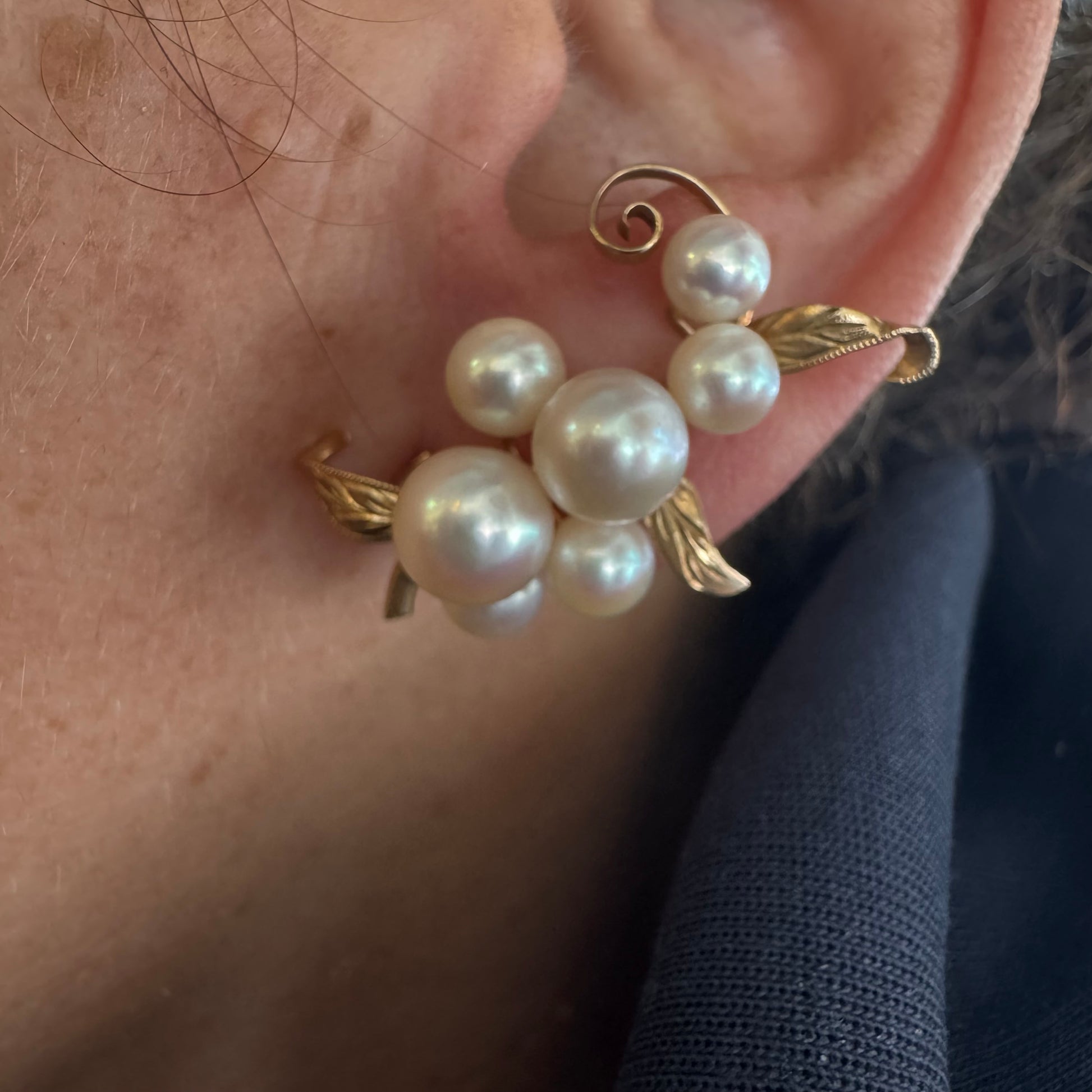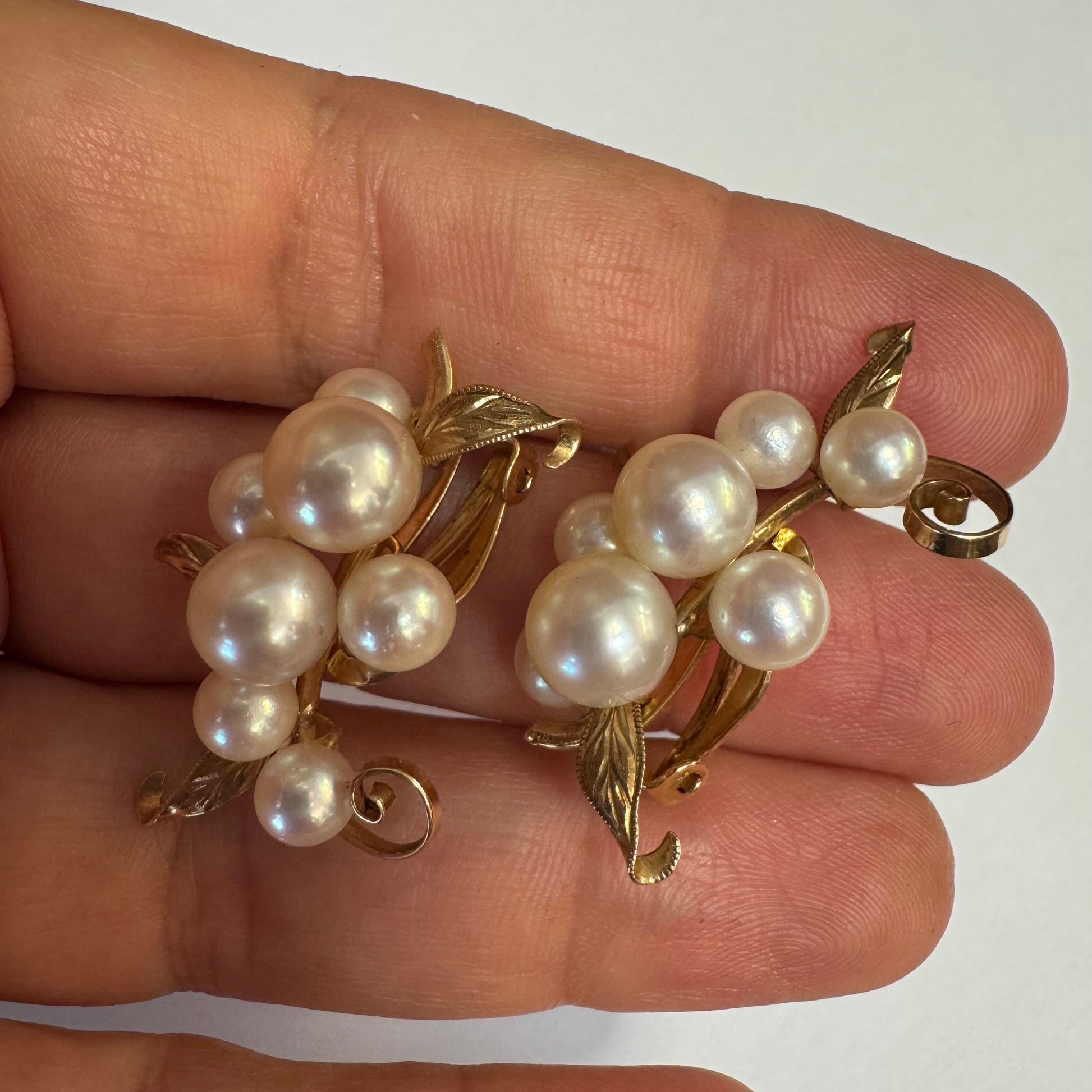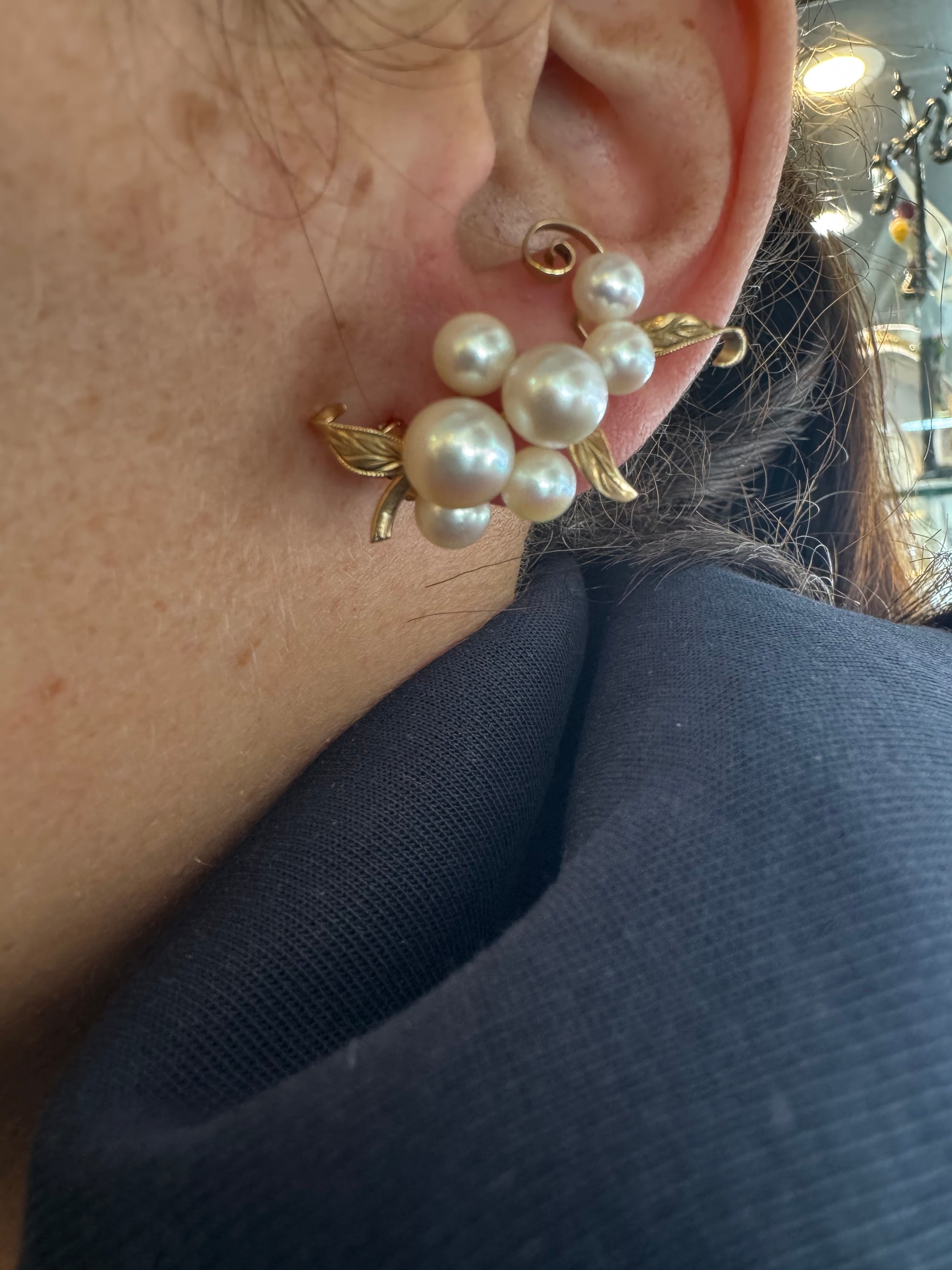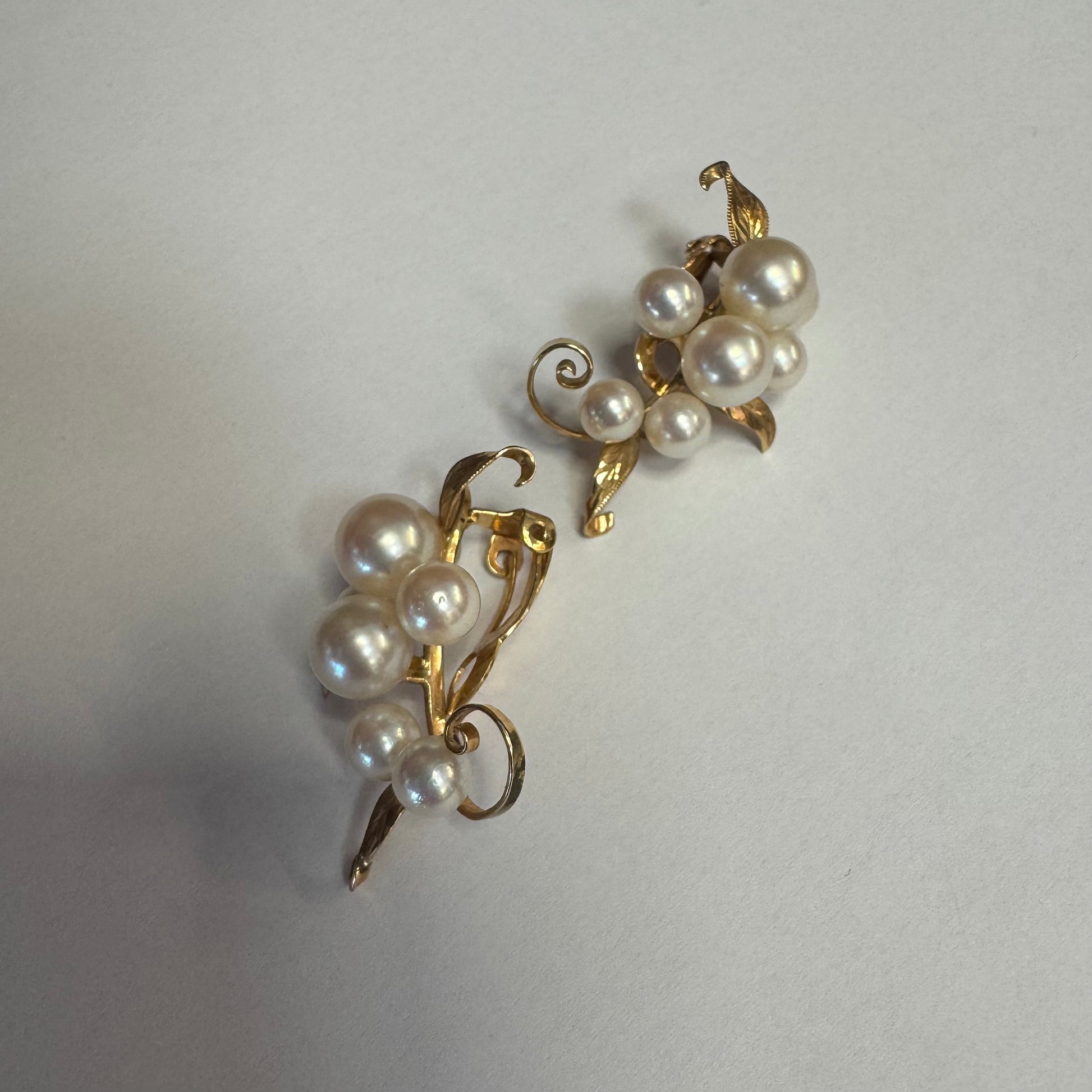 עגילי קליפס זהב 14 קראט, משובצים אשכול פנינים בגווני לבן-קרם.