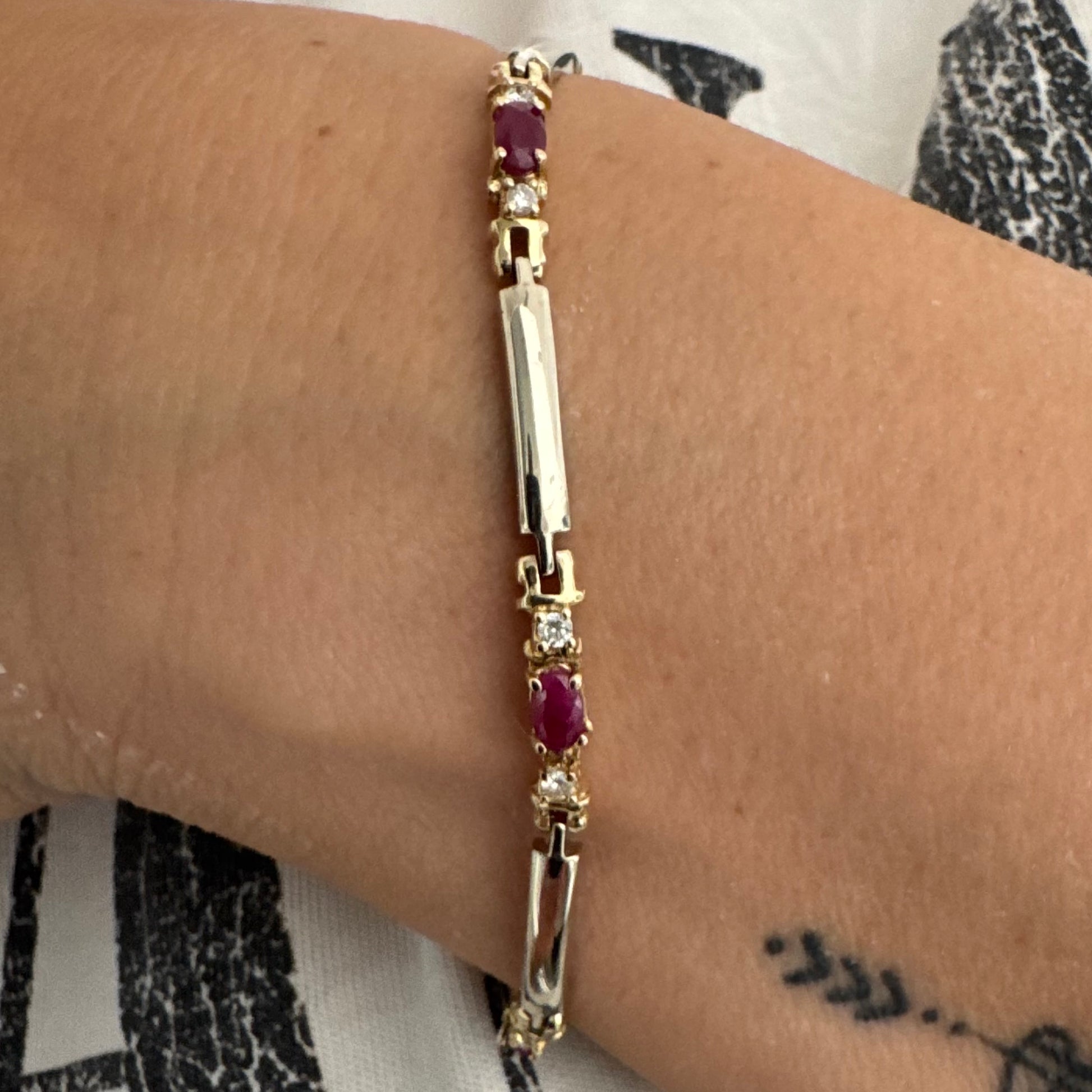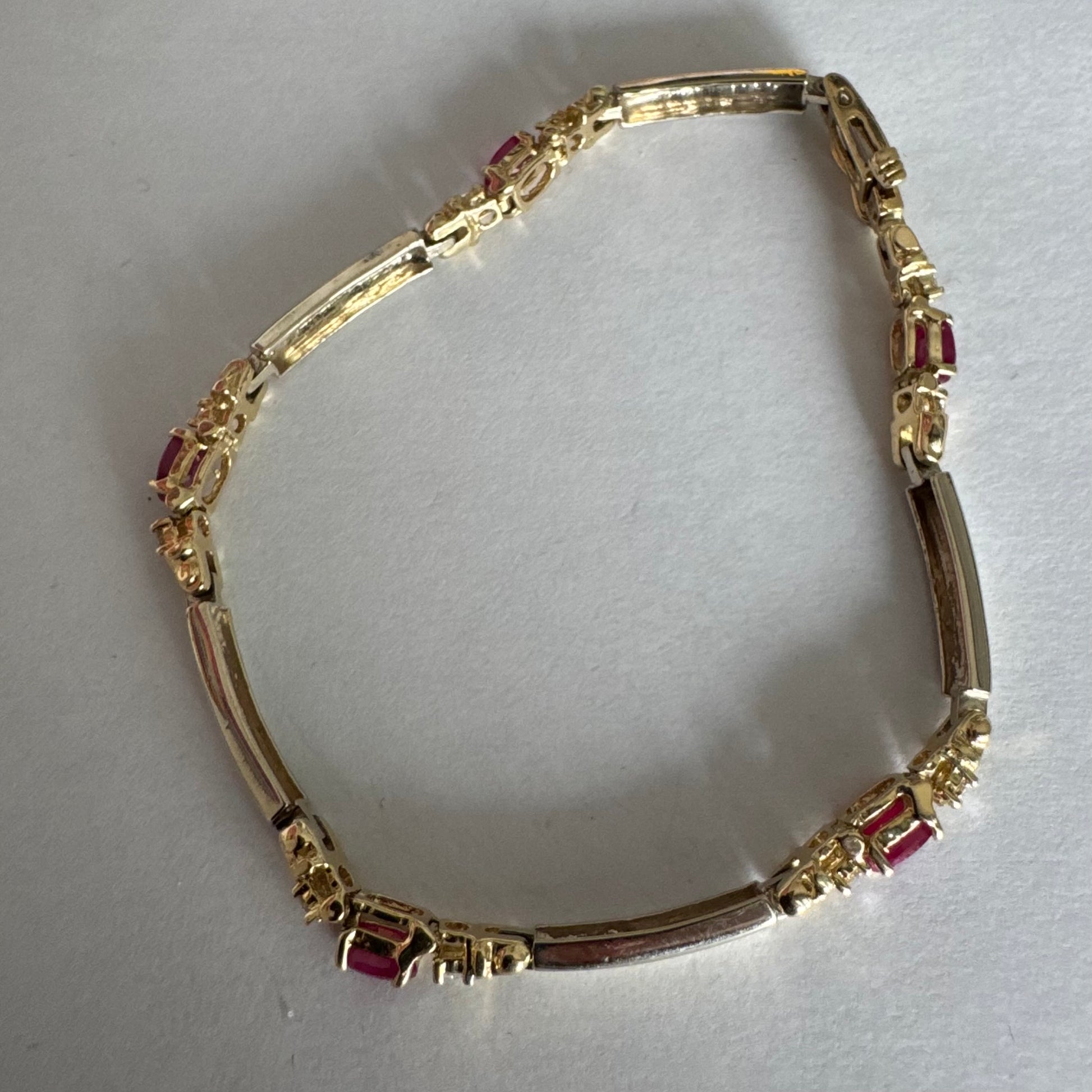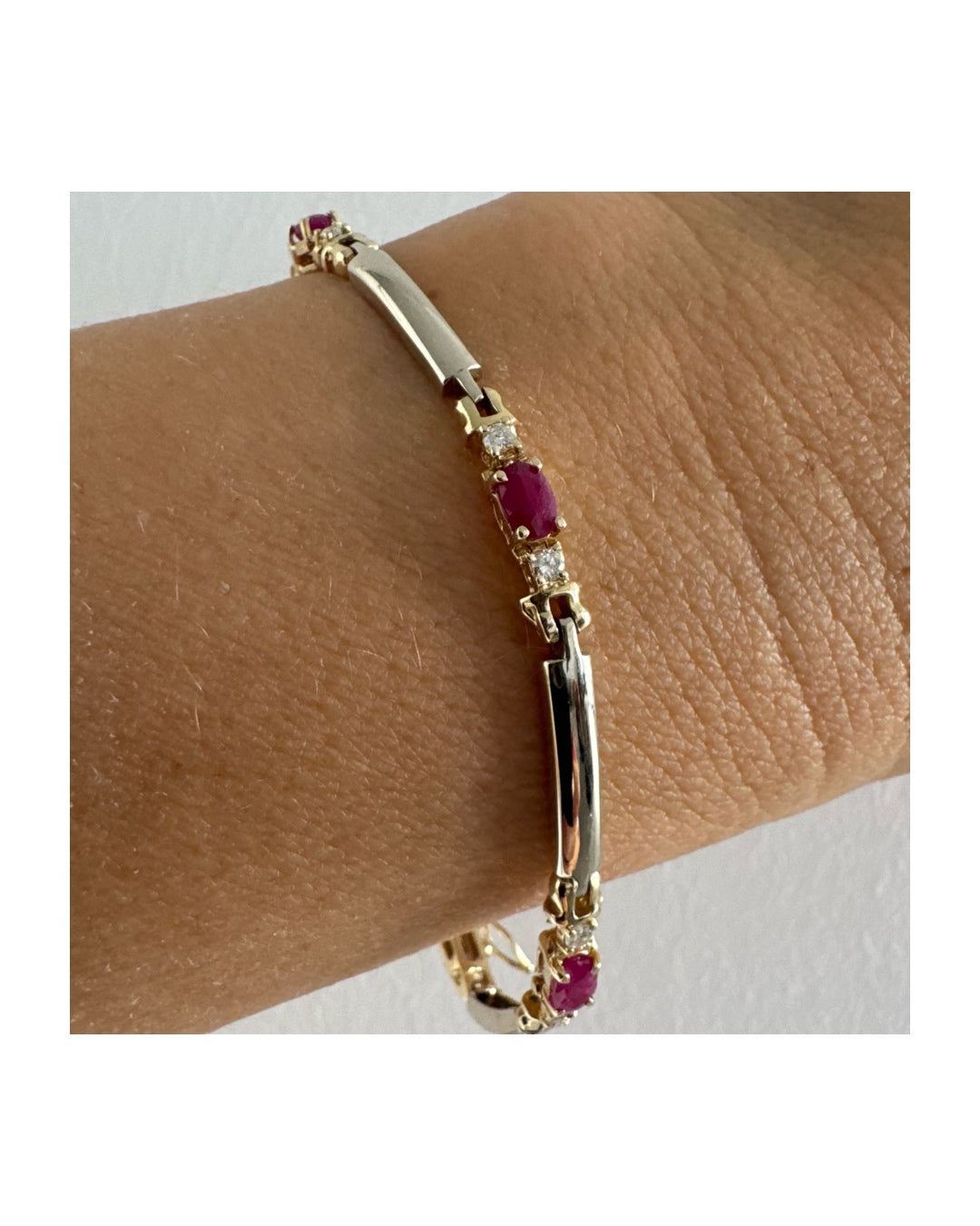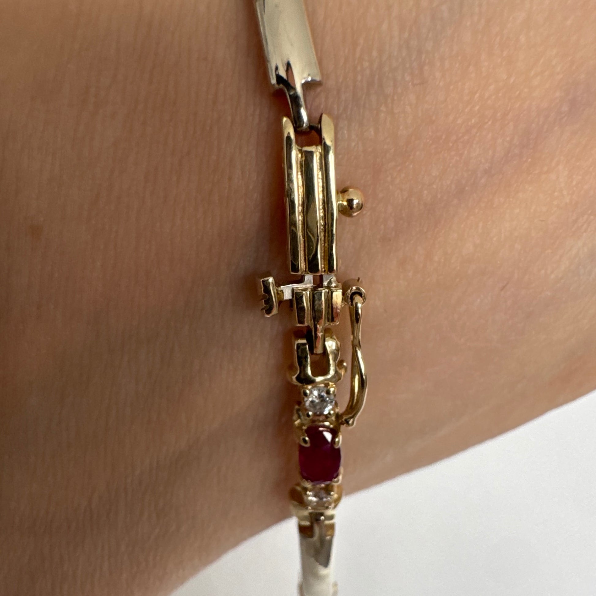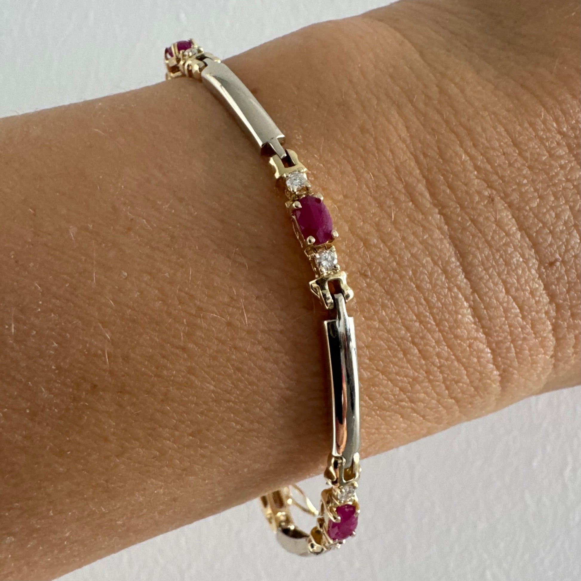 צמיד זהב צהוב 14 קראט משובץ אבני רובי אדומות בחיתוך אובלי, עם יהלומים המשובצים ביניהן להוספת ברק עדין.