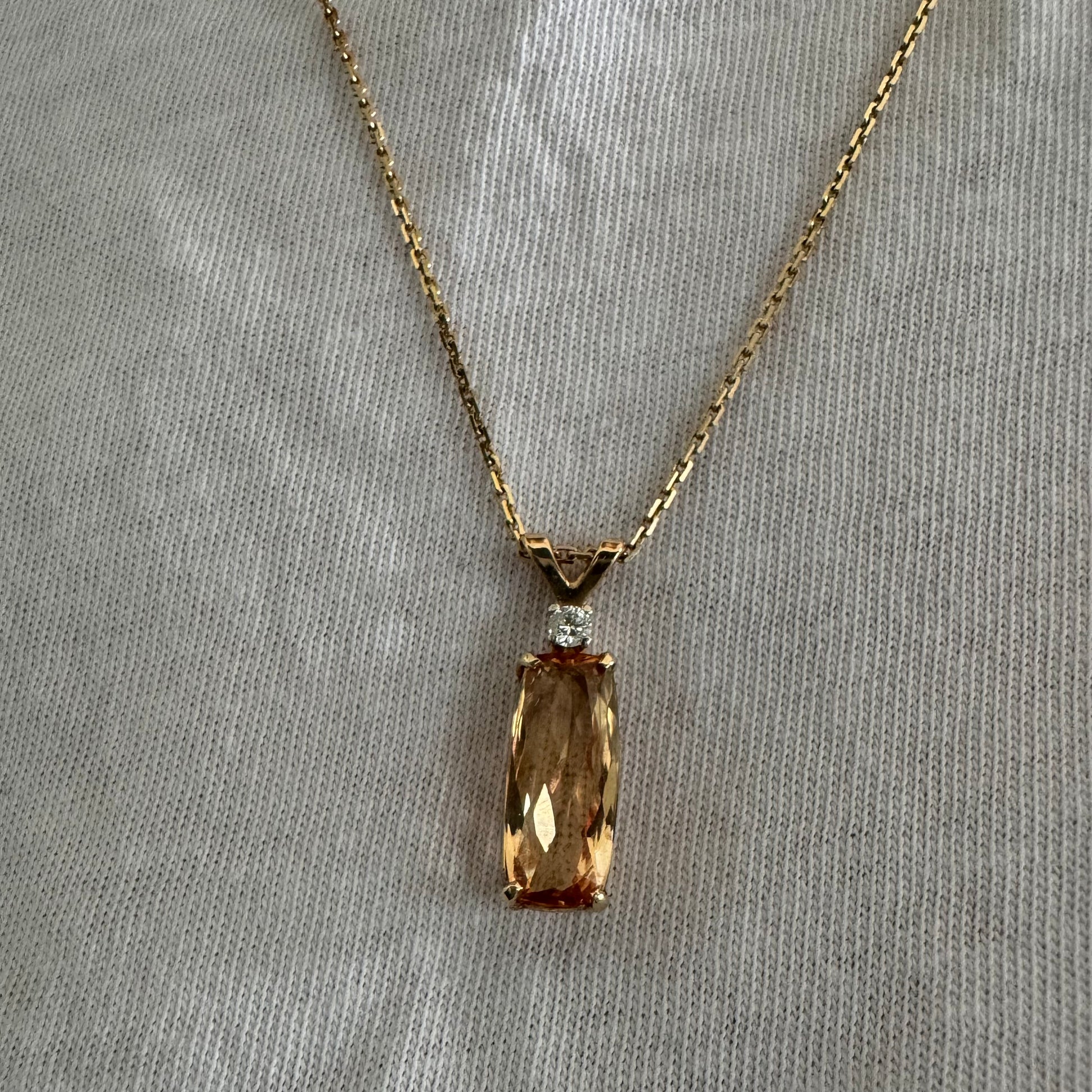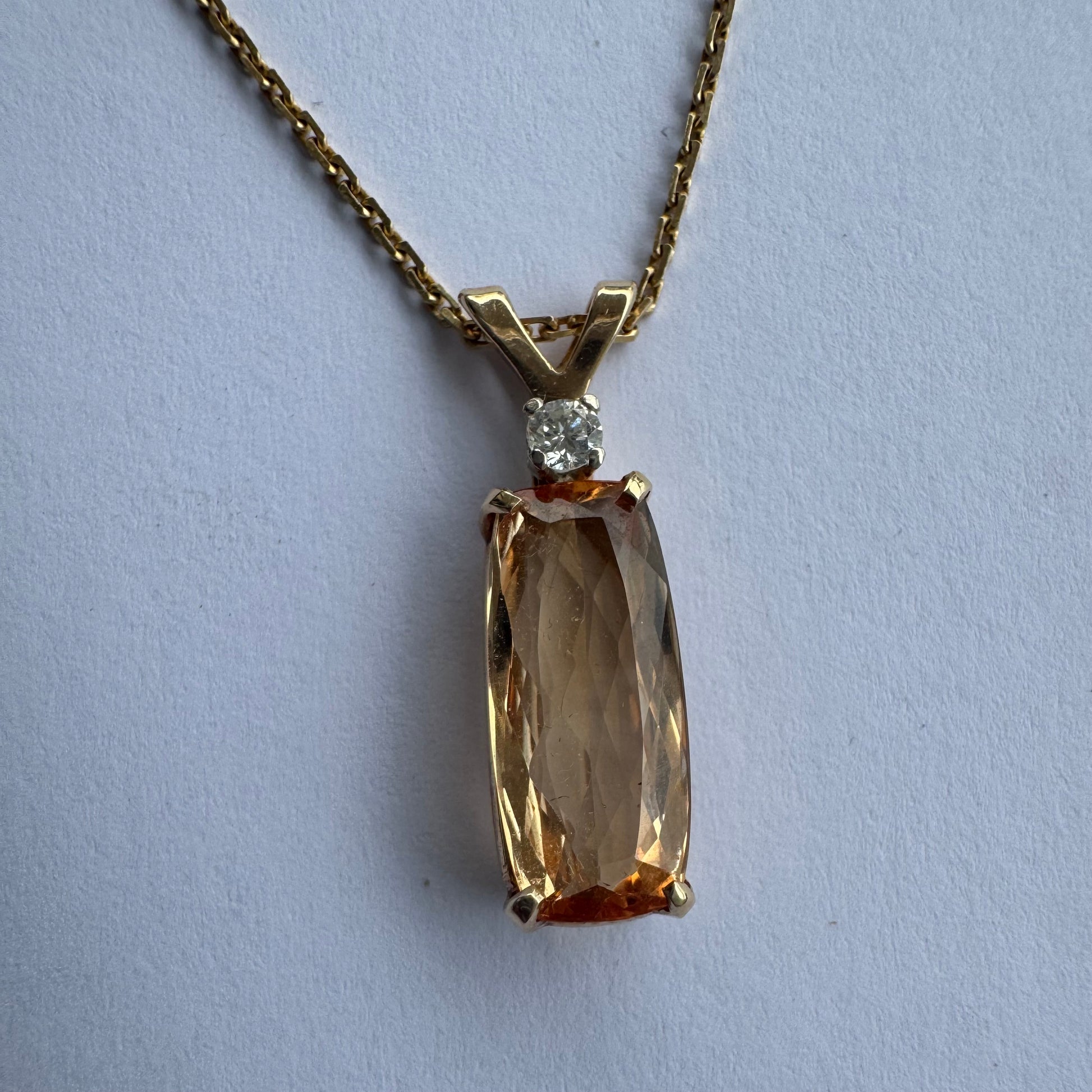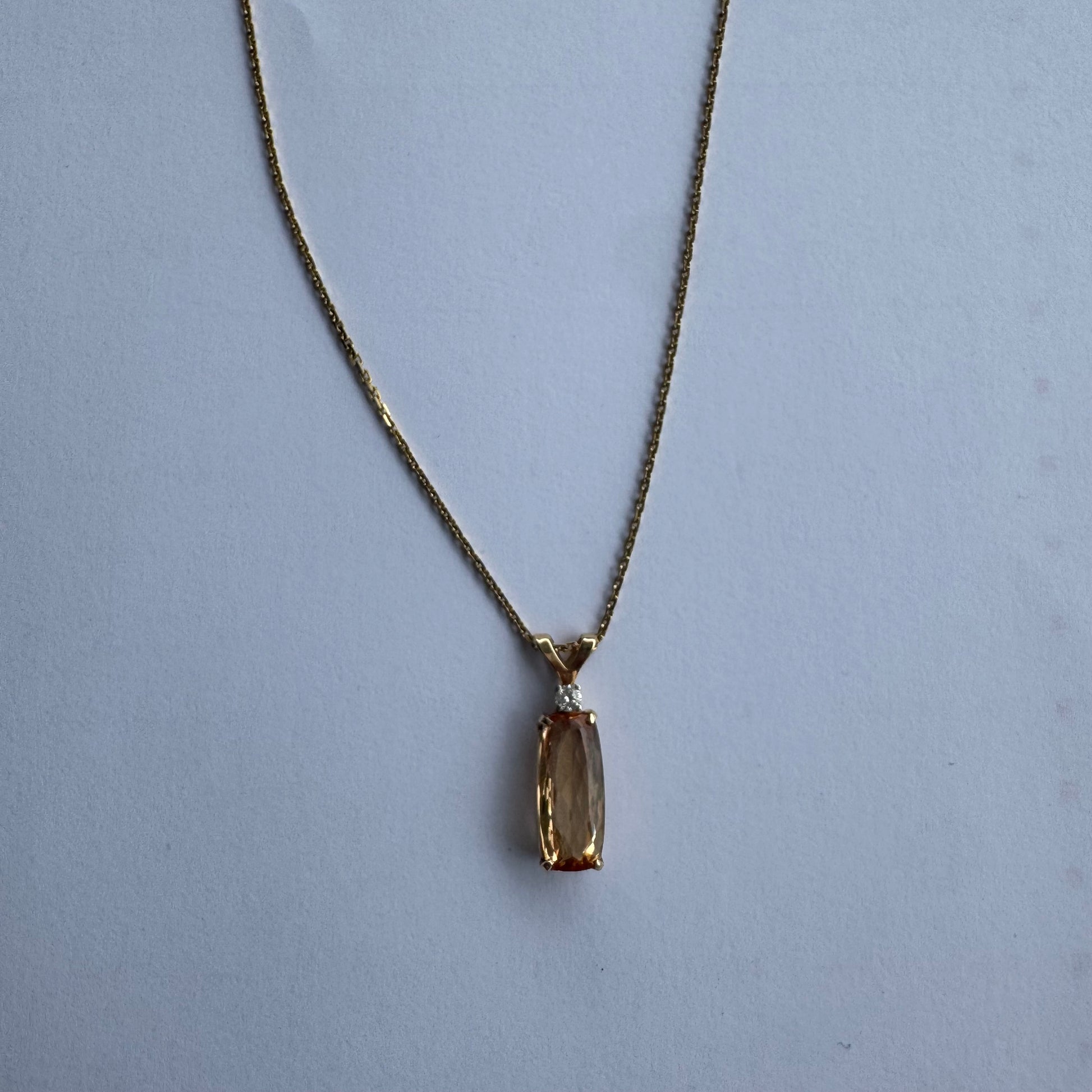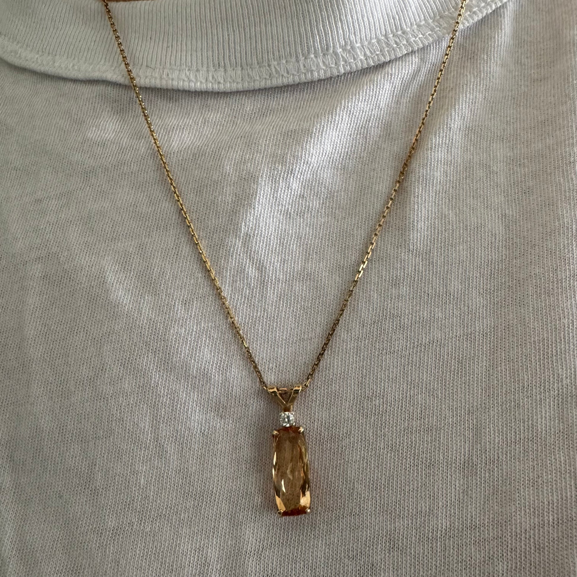שרשרת זהב 14 קראט עם תליון זהב 14 קראט משובץ אבן קוורץ מלבנית בגוון שמפניה חמים, ומעליה יהלום נוצץ להדגשה עדינה של הברק.