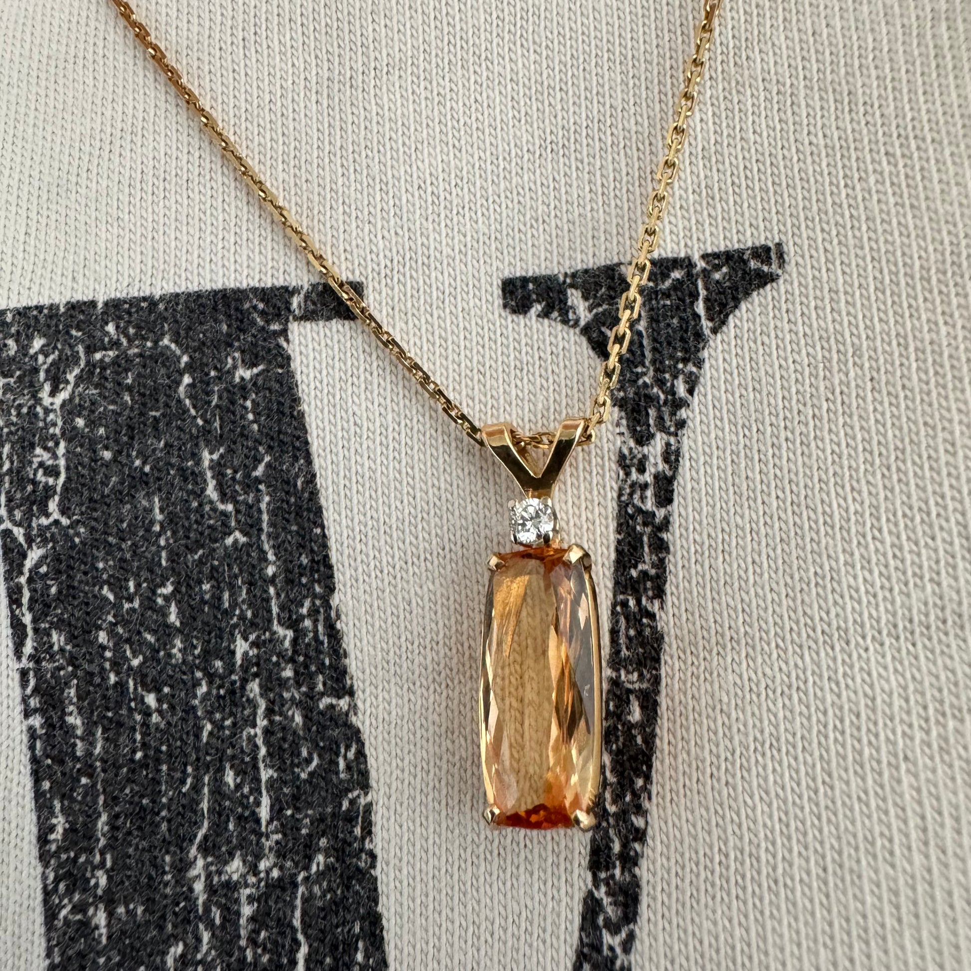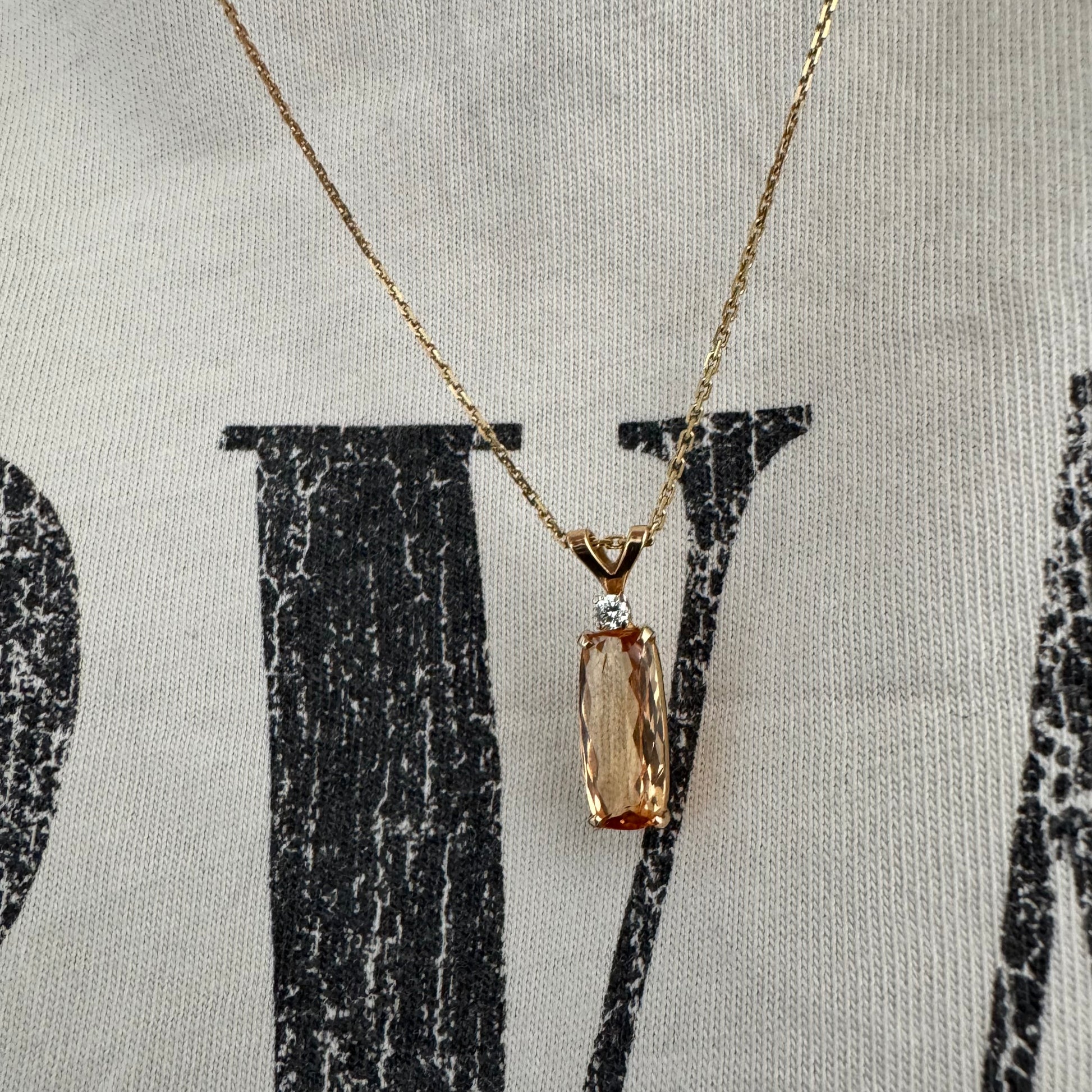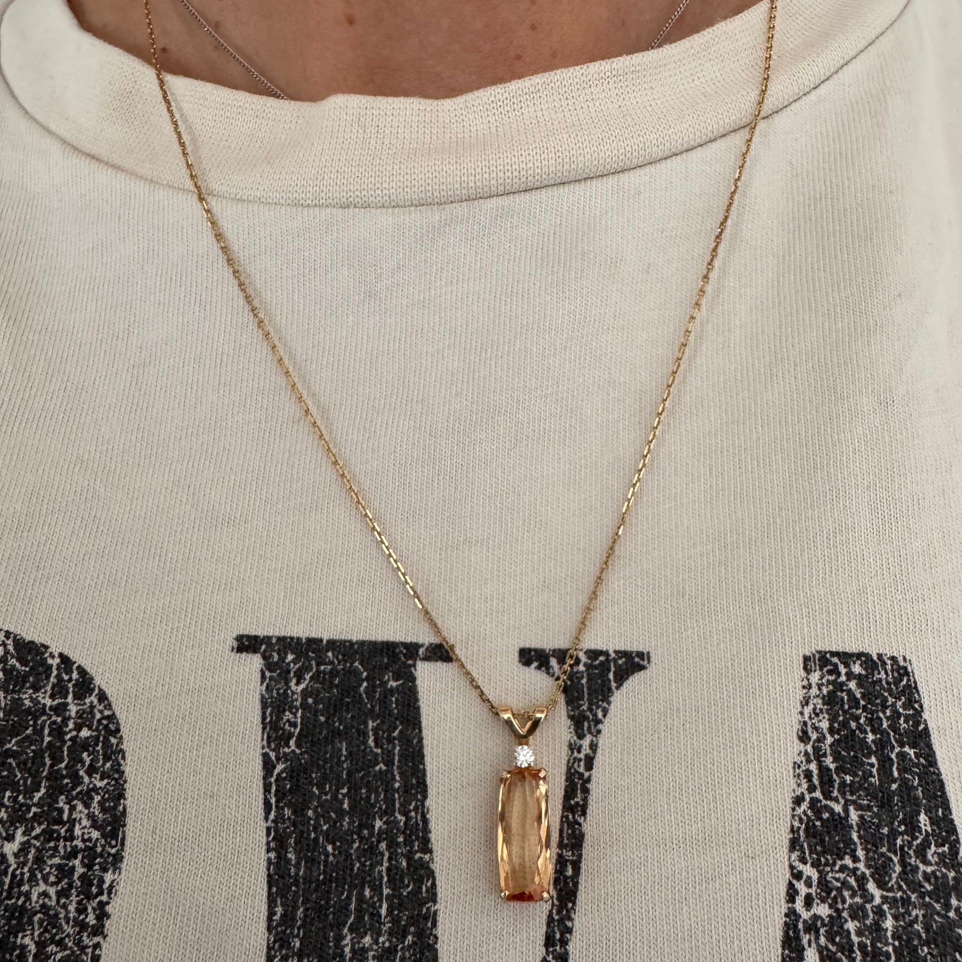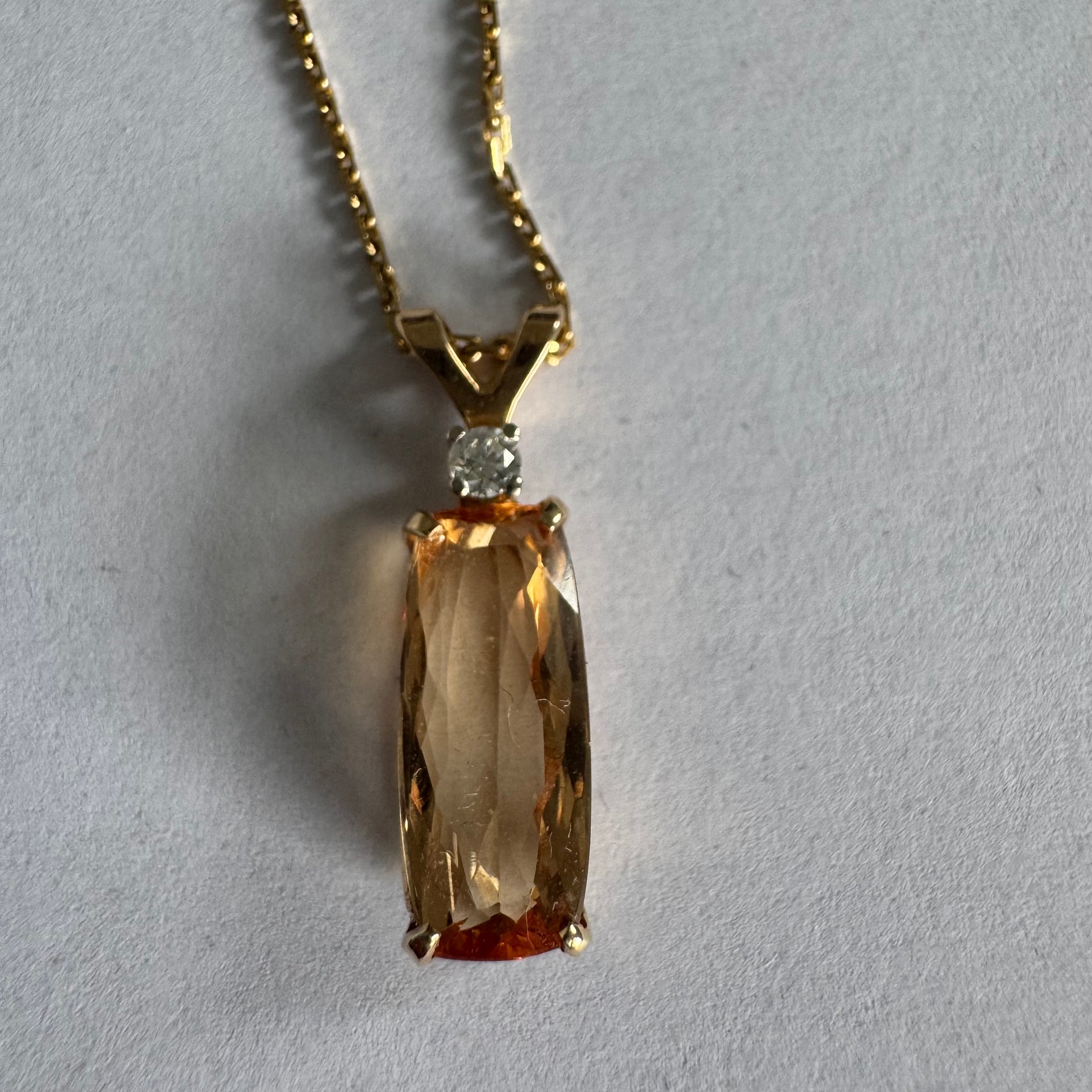 שרשרת זהב 14 קראט עם תליון זהב 14 קראט משובץ אבן קוורץ מלבנית בגוון שמפניה חמים, ומעליה יהלום נוצץ להדגשה עדינה של הברק.