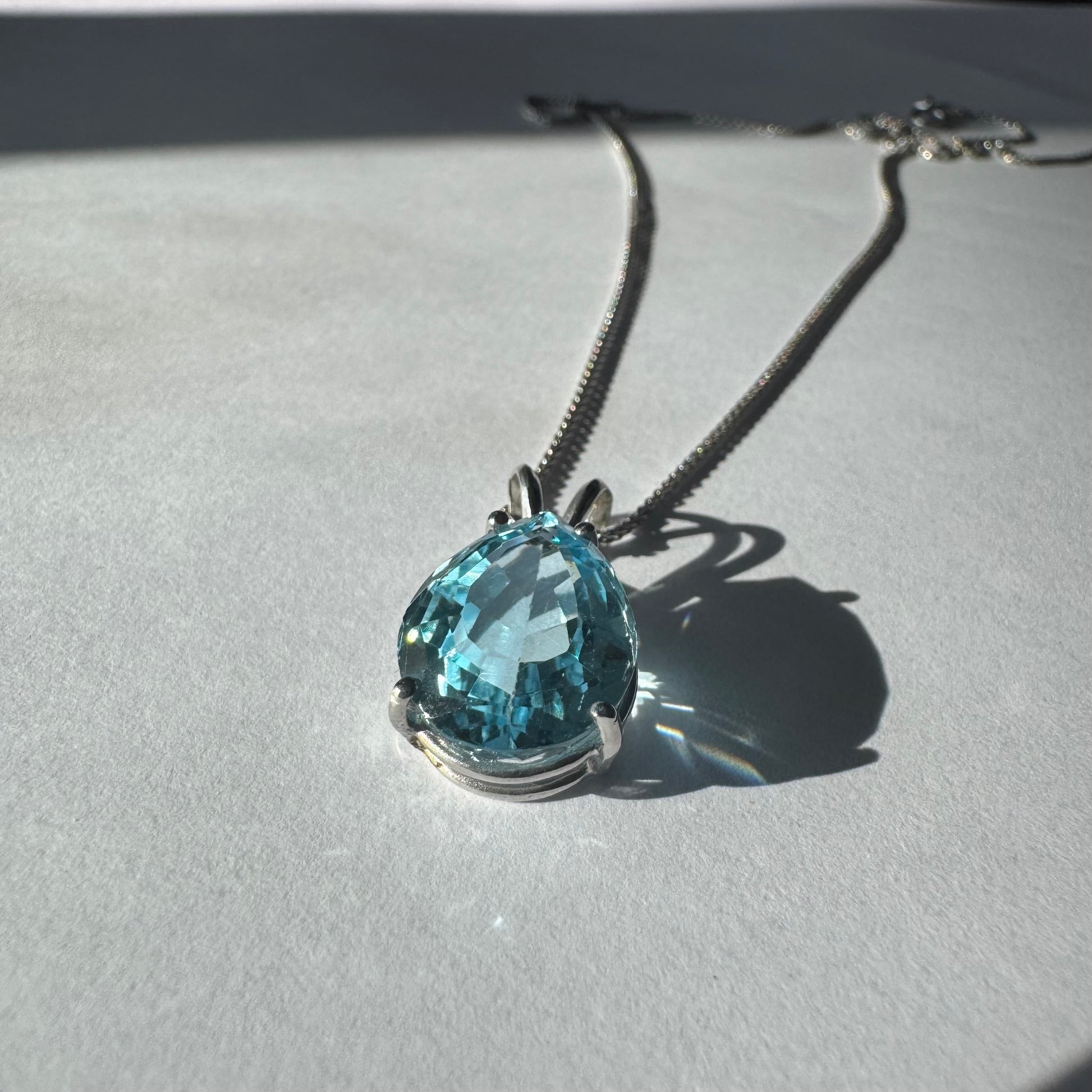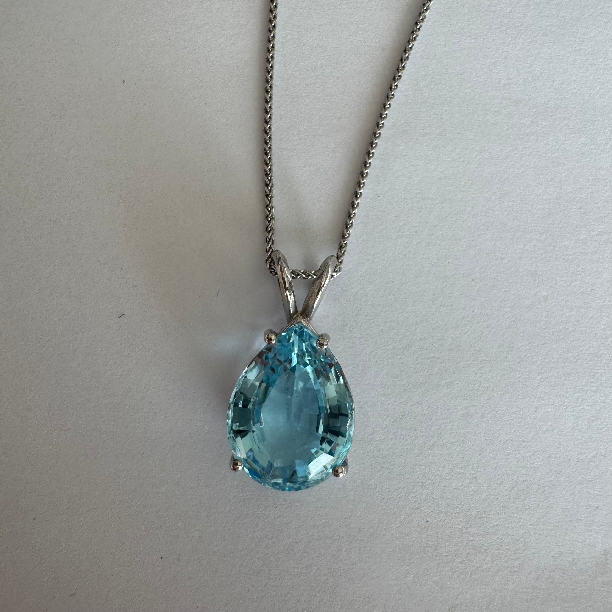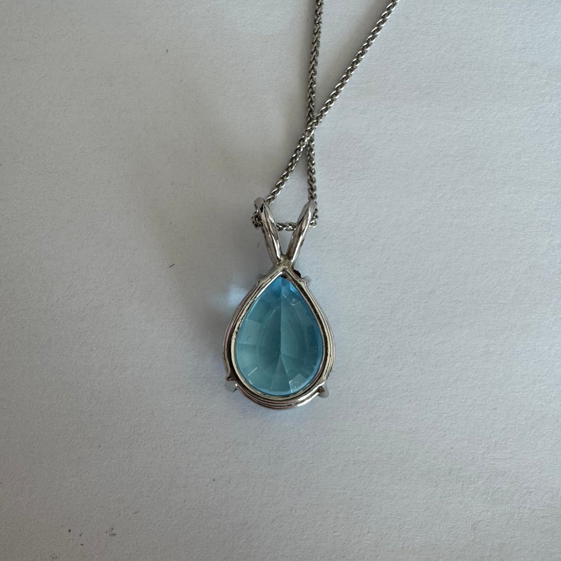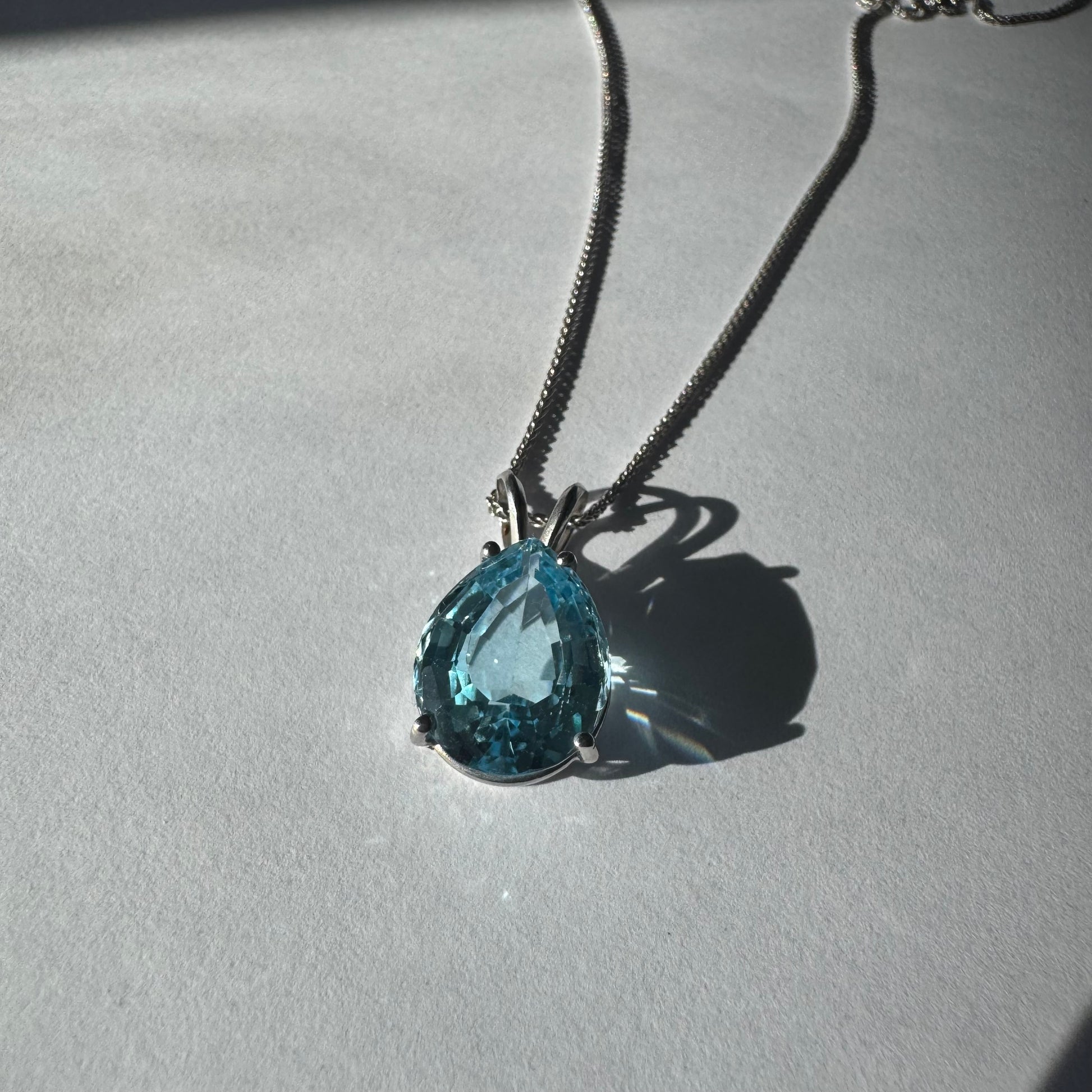 תליון זהב לבן 14 קראט המשובץ אבן טופז כחולה בחיתוך טיפה.
