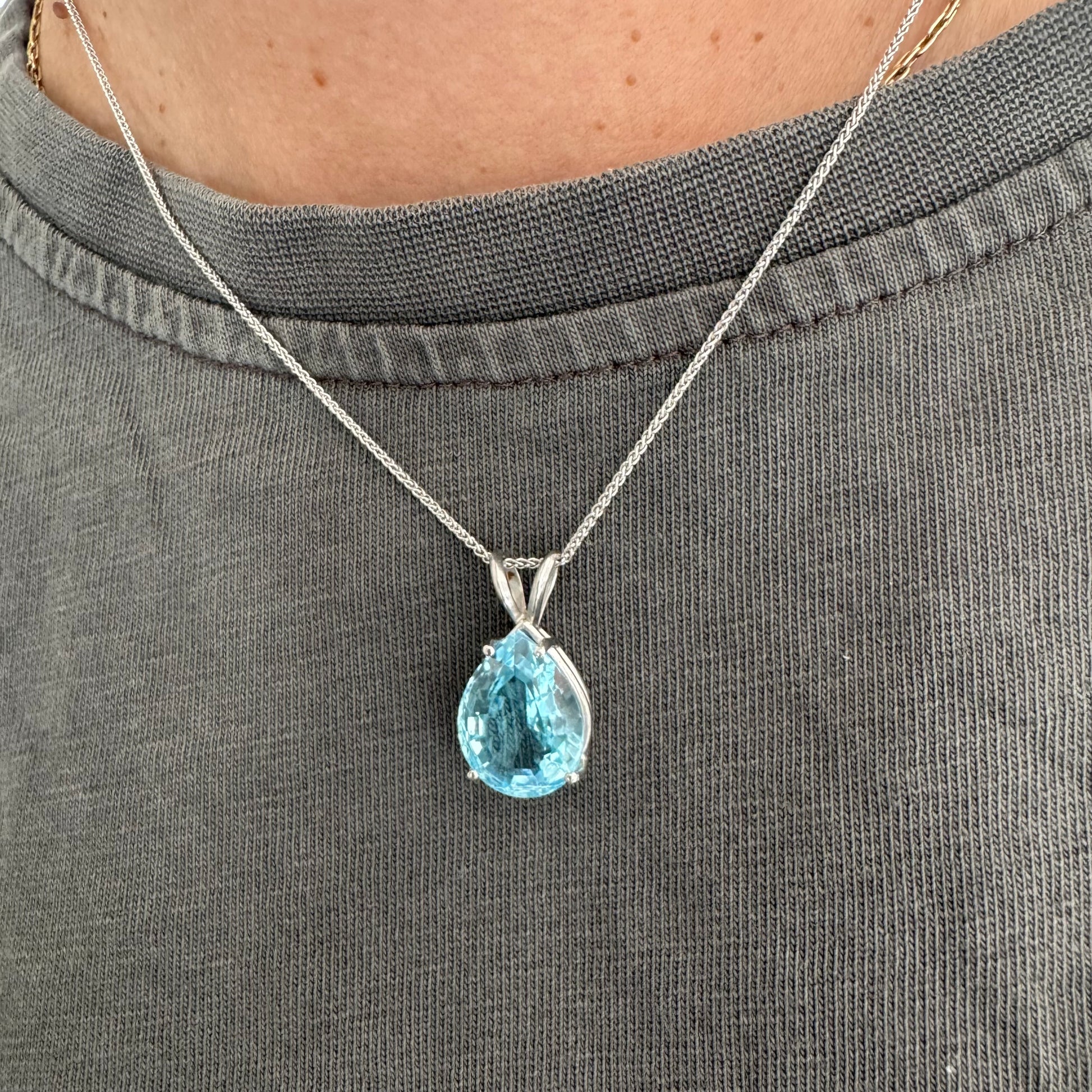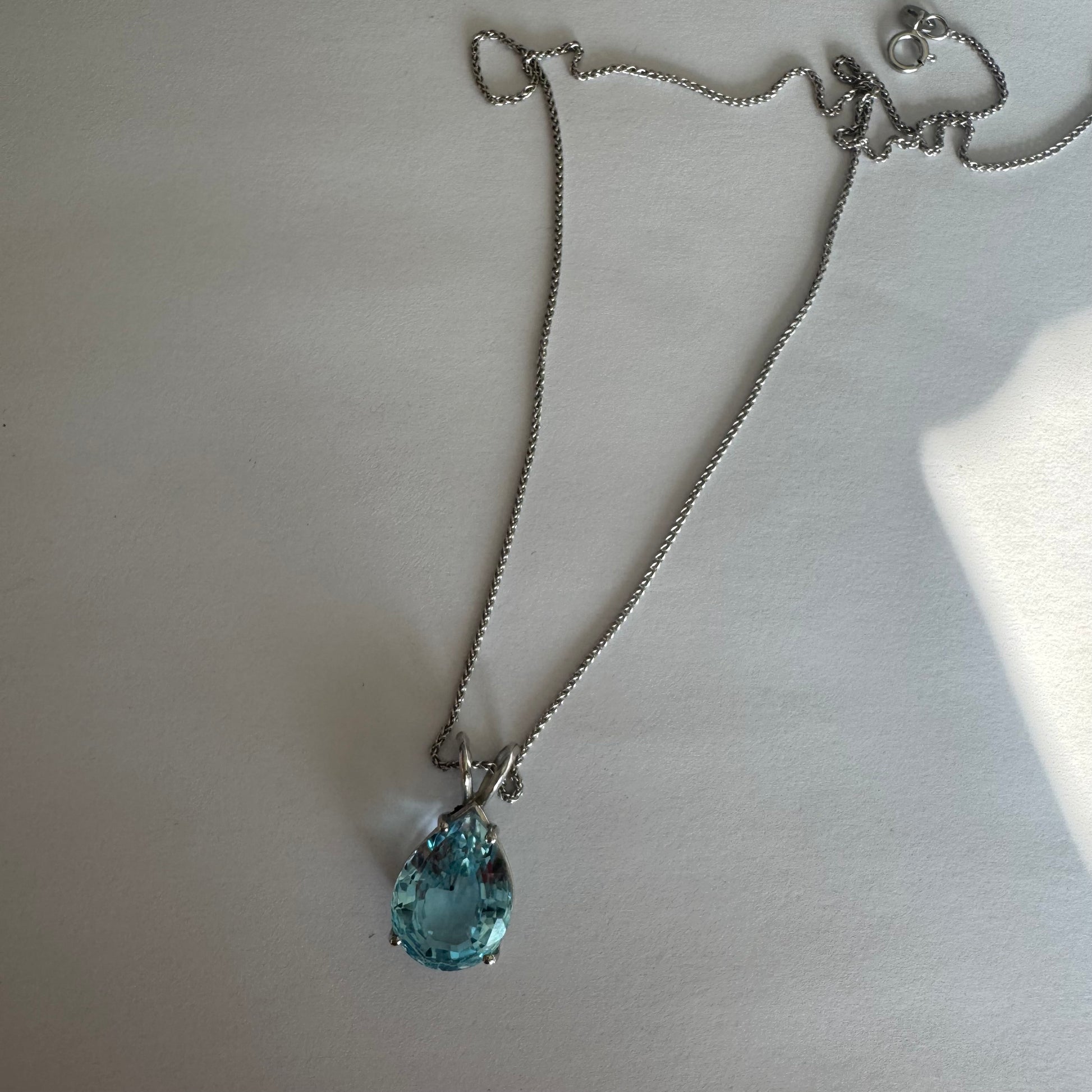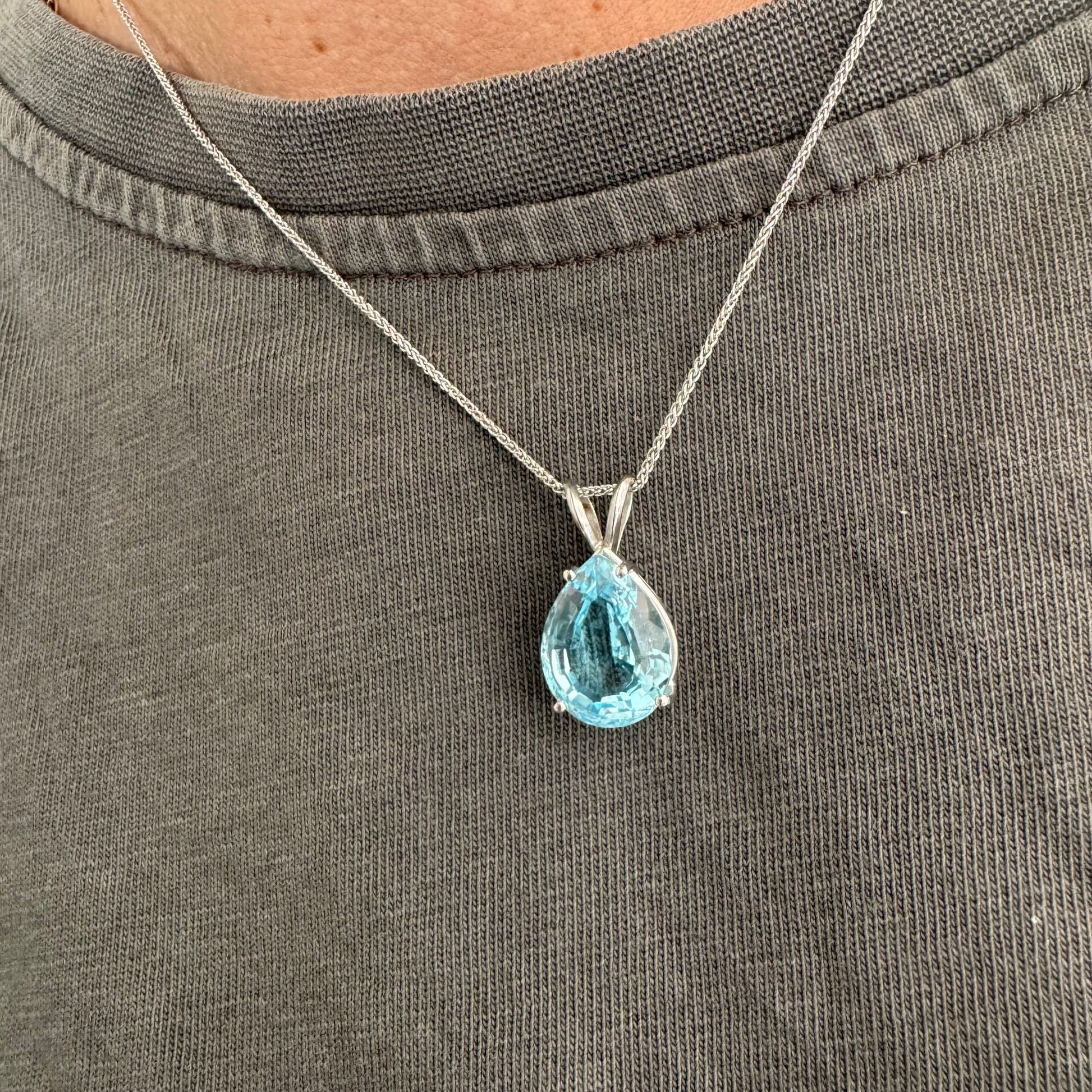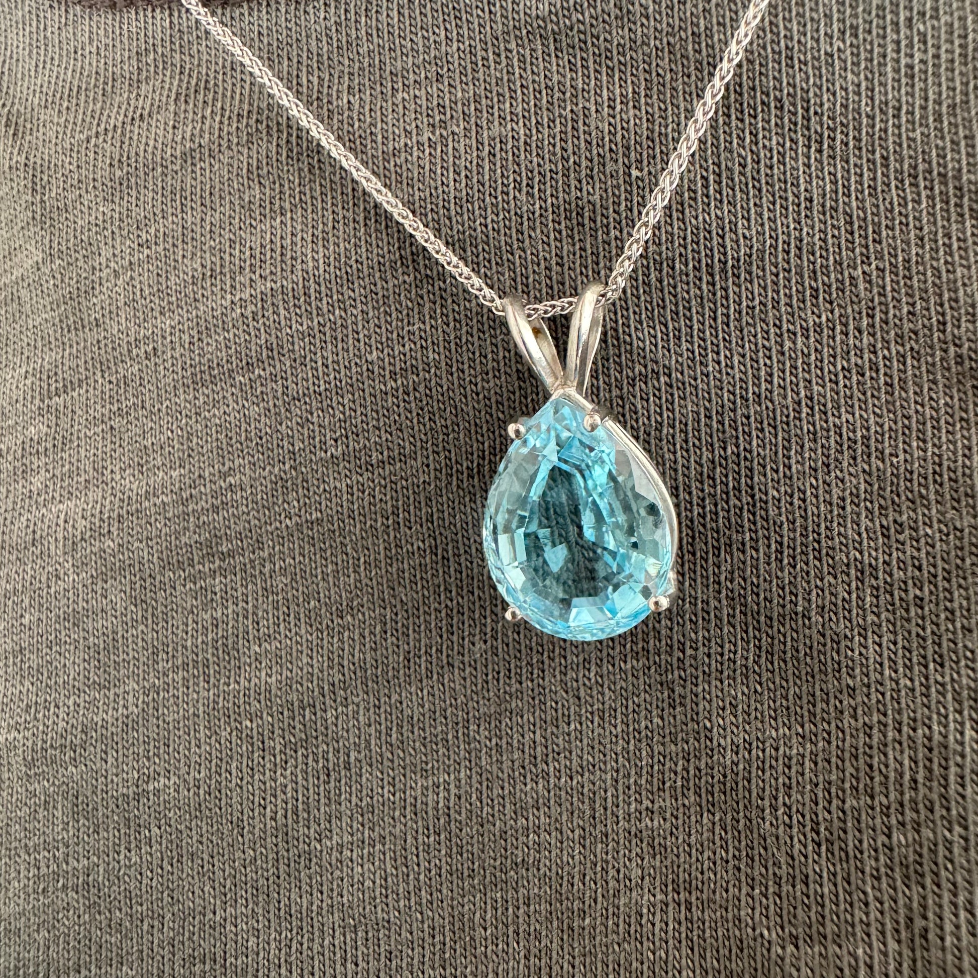 תליון זהב לבן 14 קראט המשובץ אבן טופז כחולה בחיתוך טיפה.